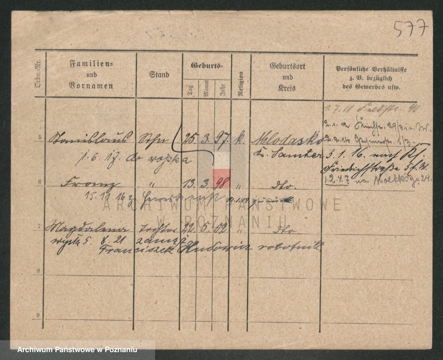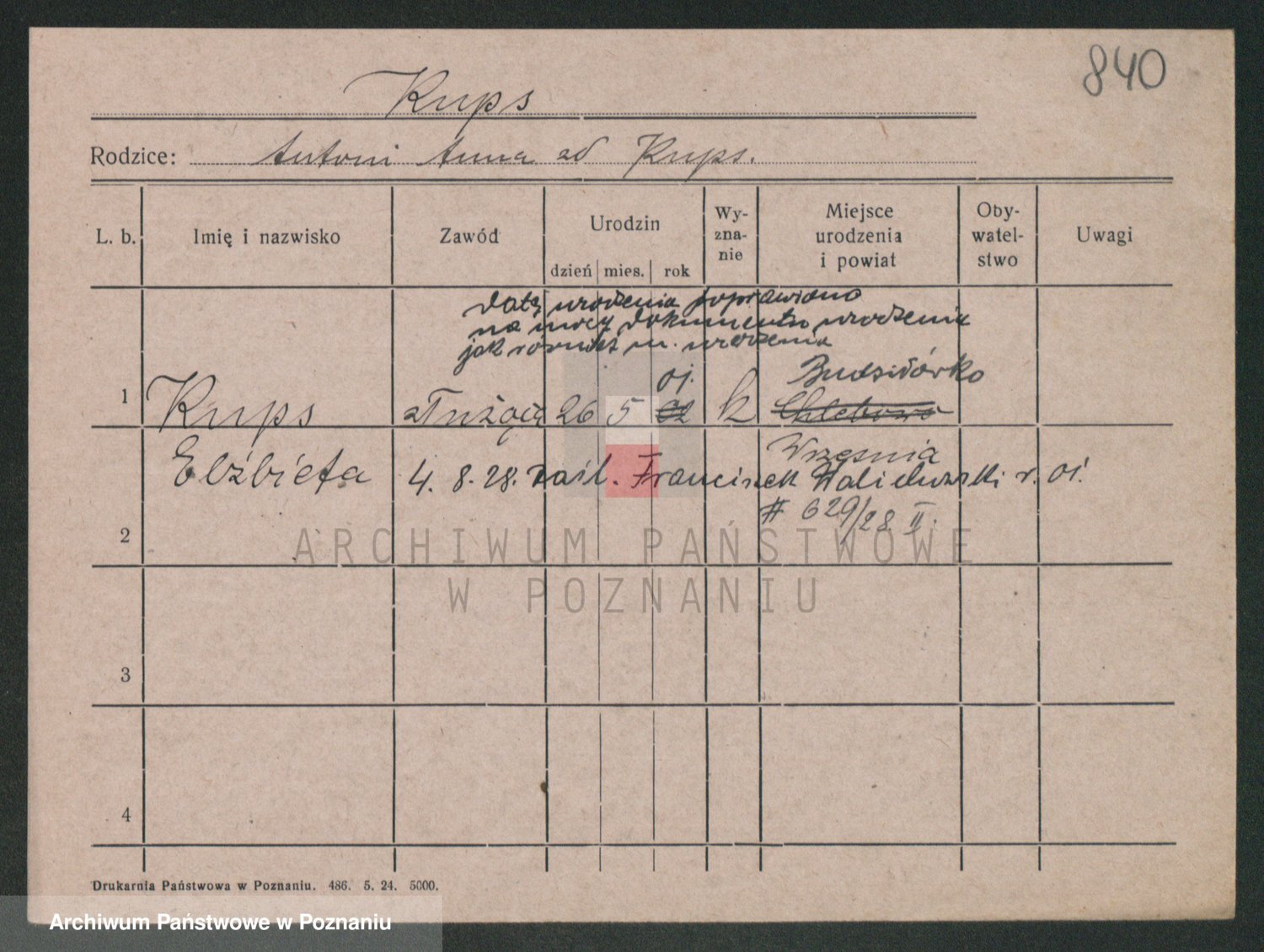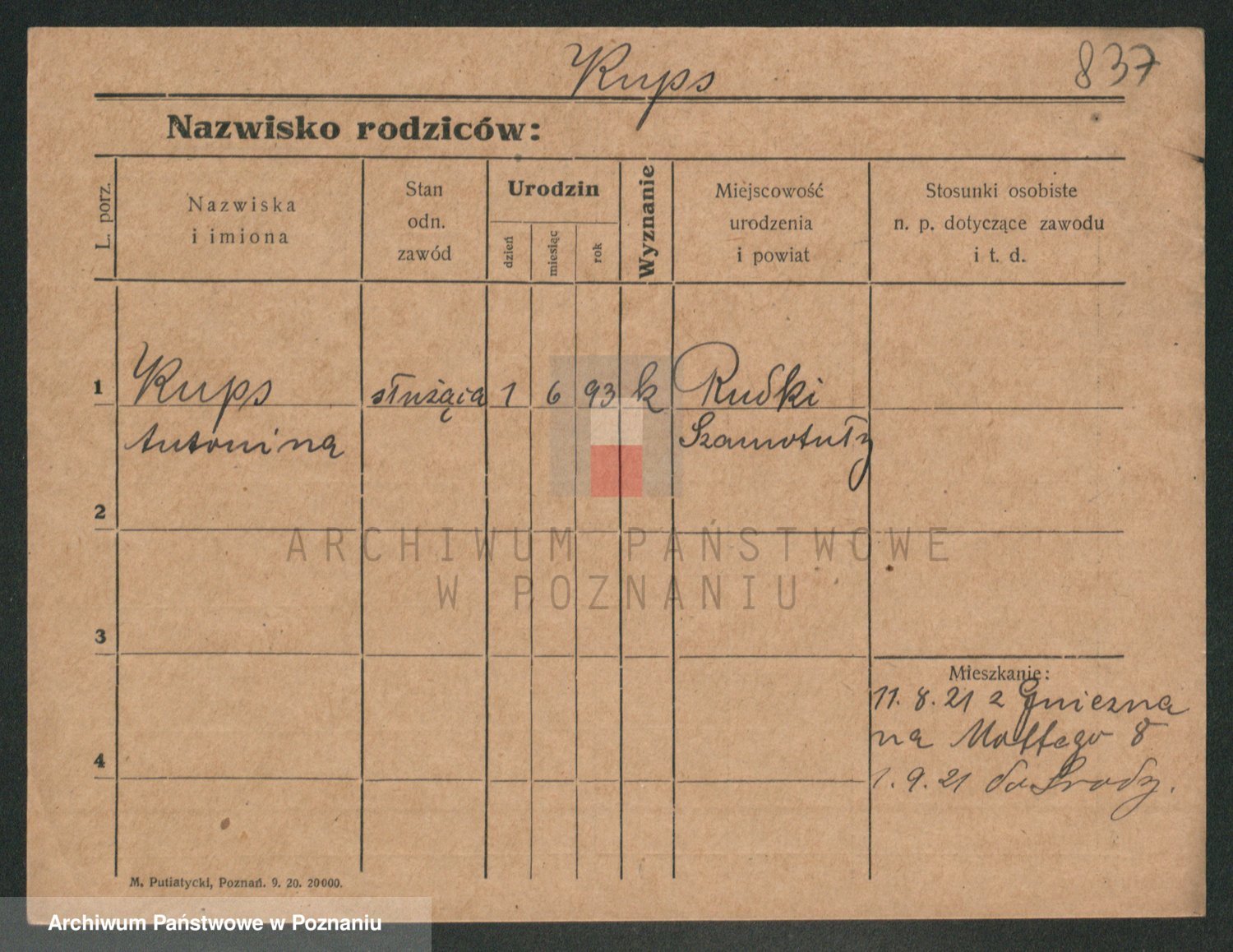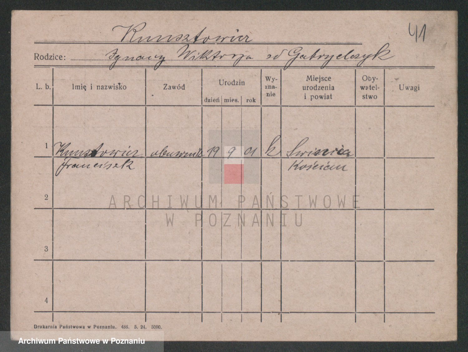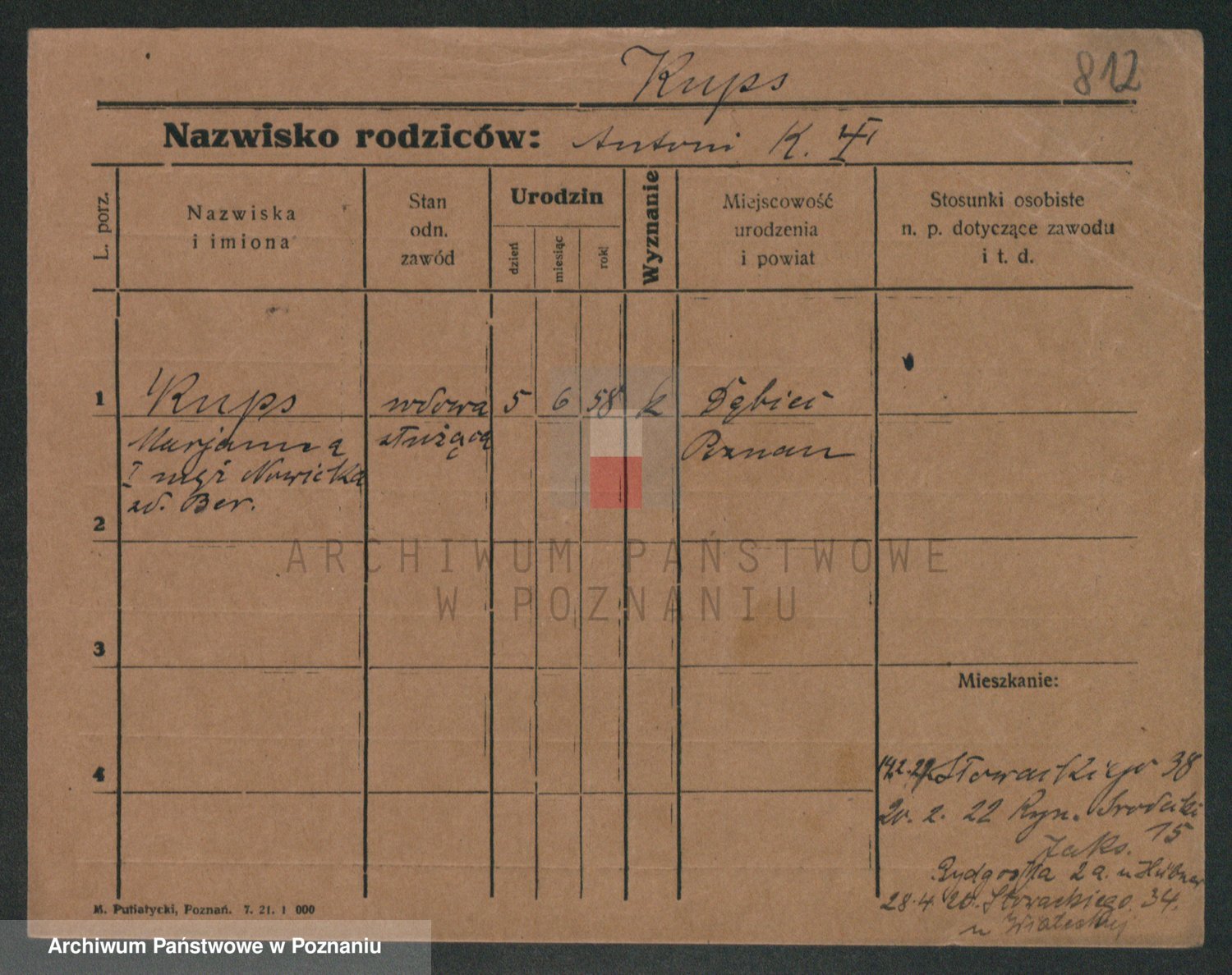 Podgląd karty osobowej dostępny jest po kliknięciu na nazwisko lub ikonkę karty. Można dokonywać powiększenia (ikony na górze) lub przechodzić między kolejnymi skanami (strzałki po bokach).