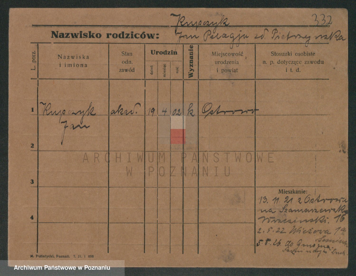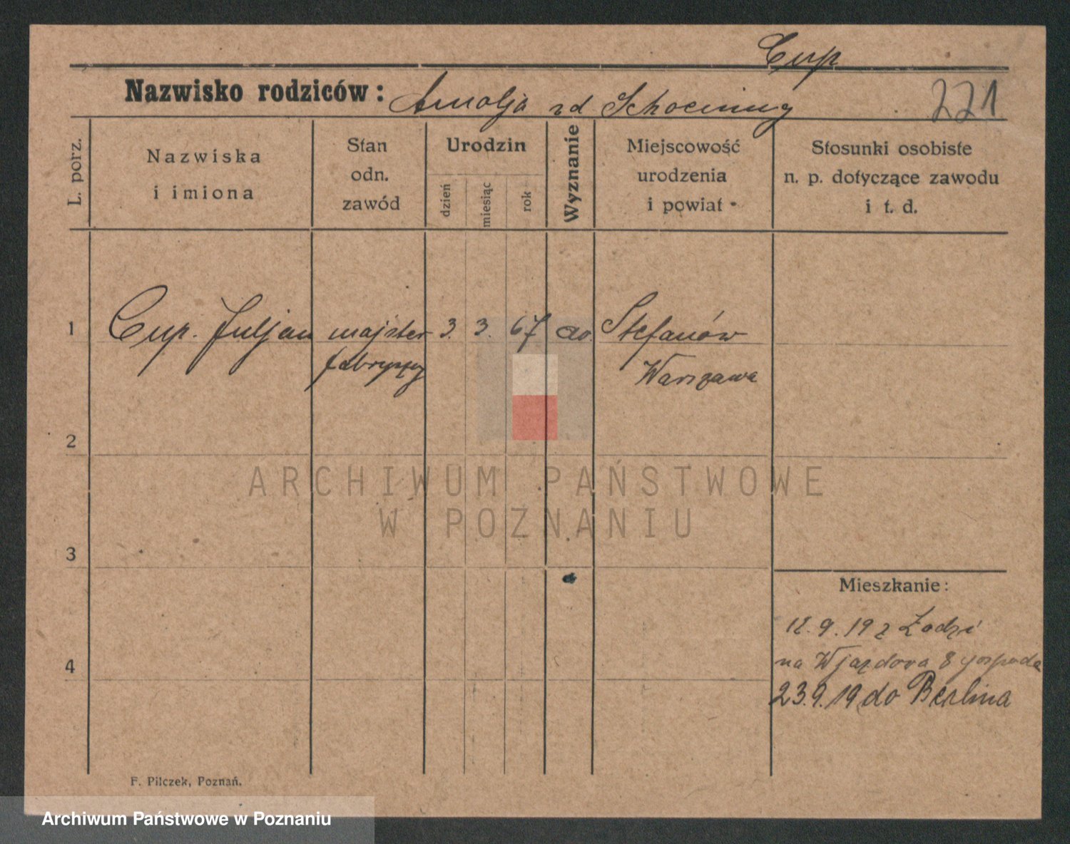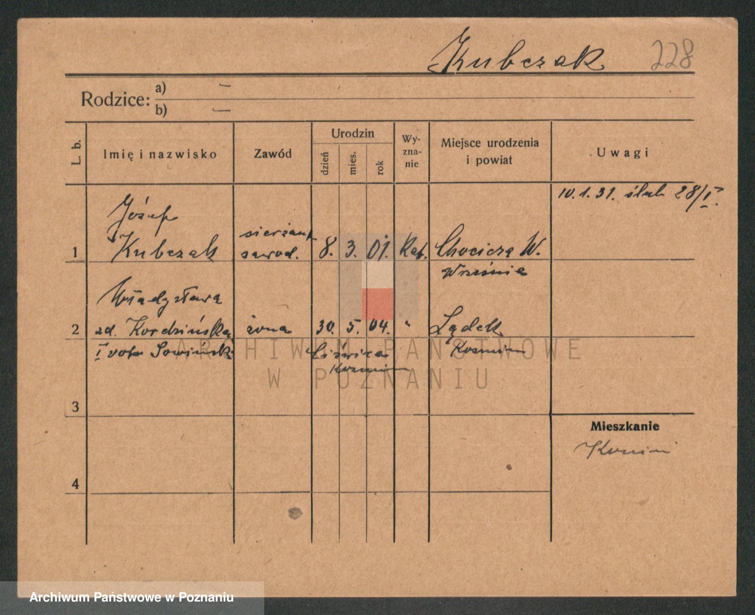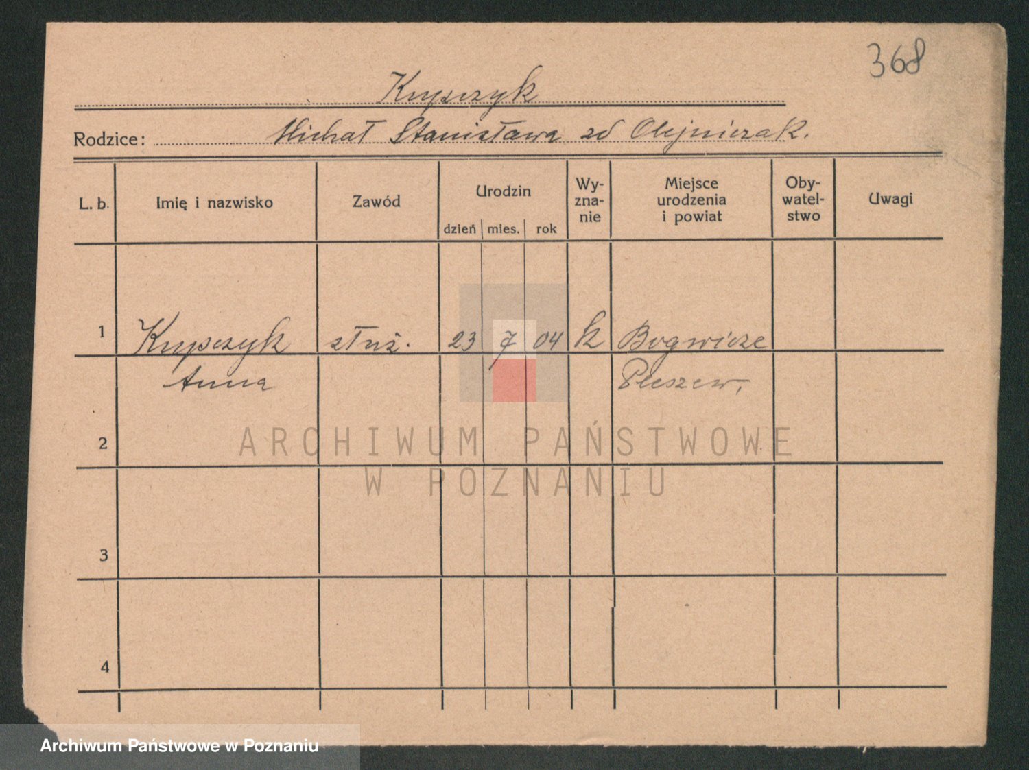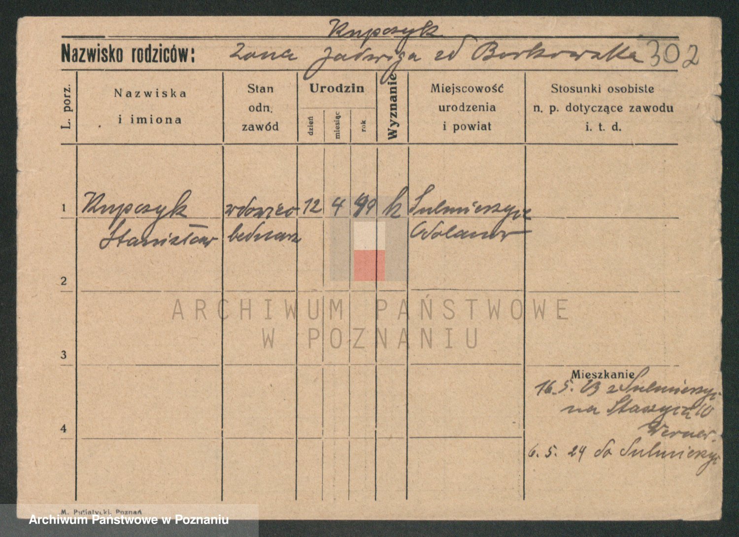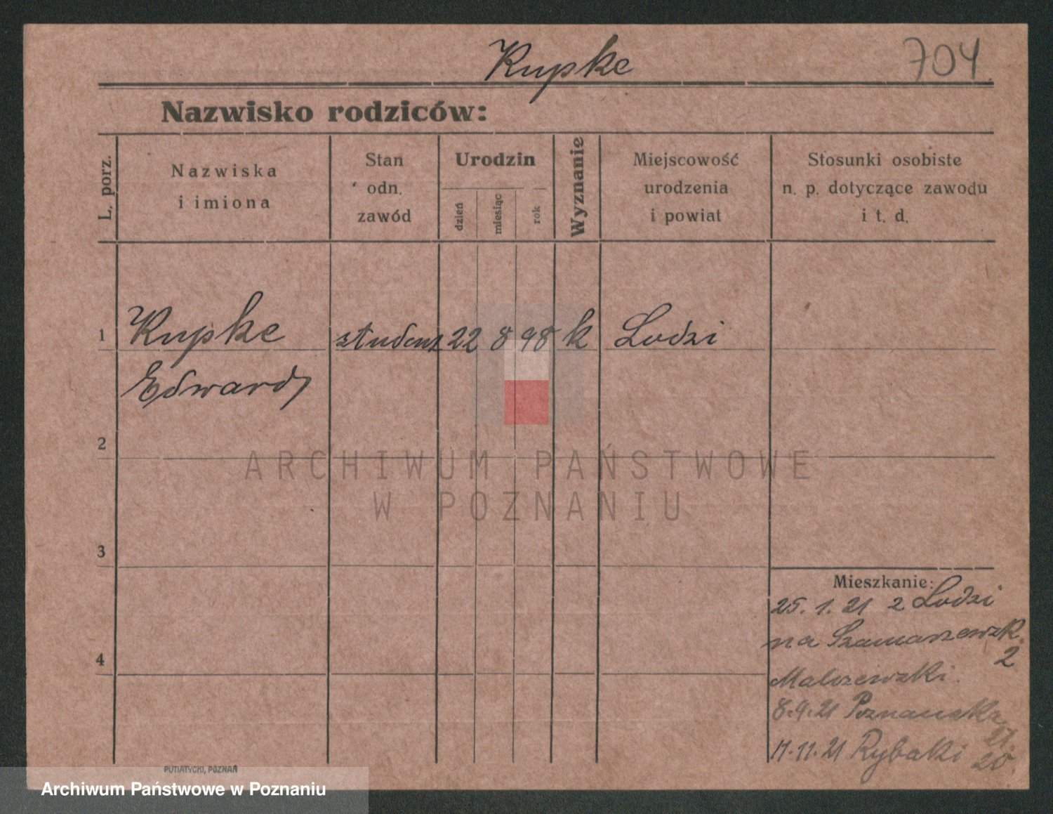 Podgląd karty osobowej dostępny jest po kliknięciu na nazwisko lub ikonkę karty. Można dokonywać powiększenia (ikony na górze) lub przechodzić między kolejnymi skanami (strzałki po bokach).