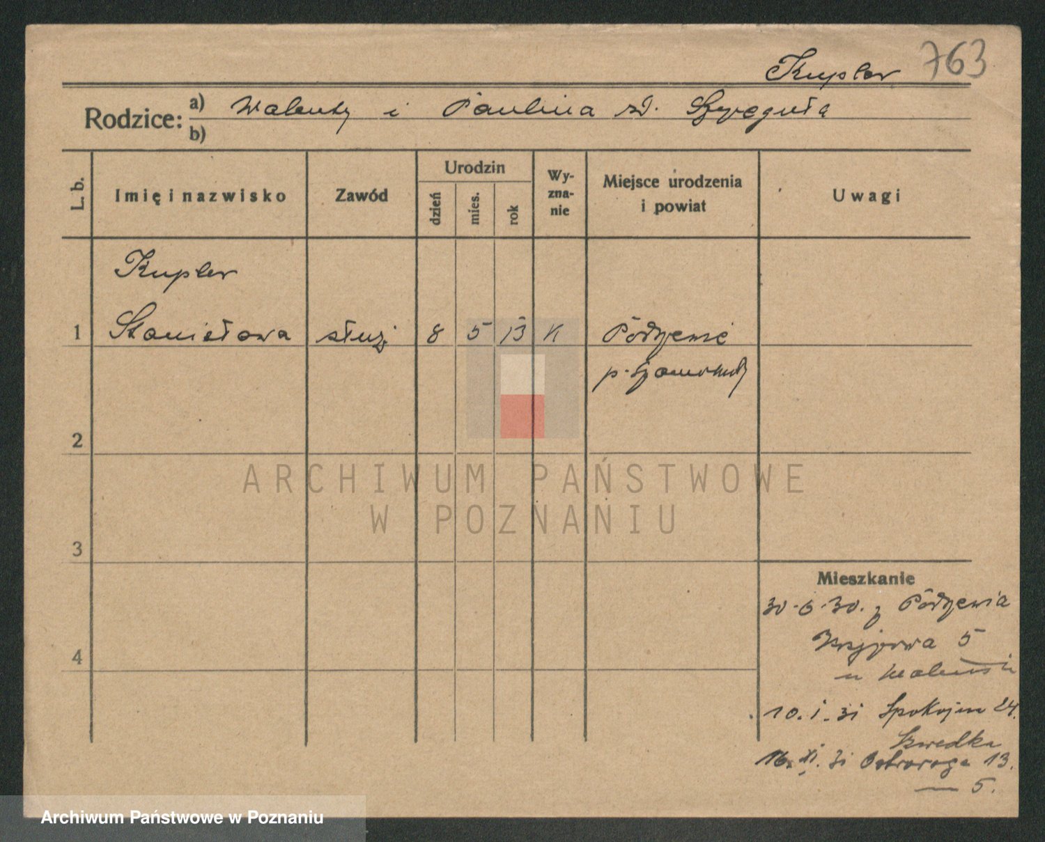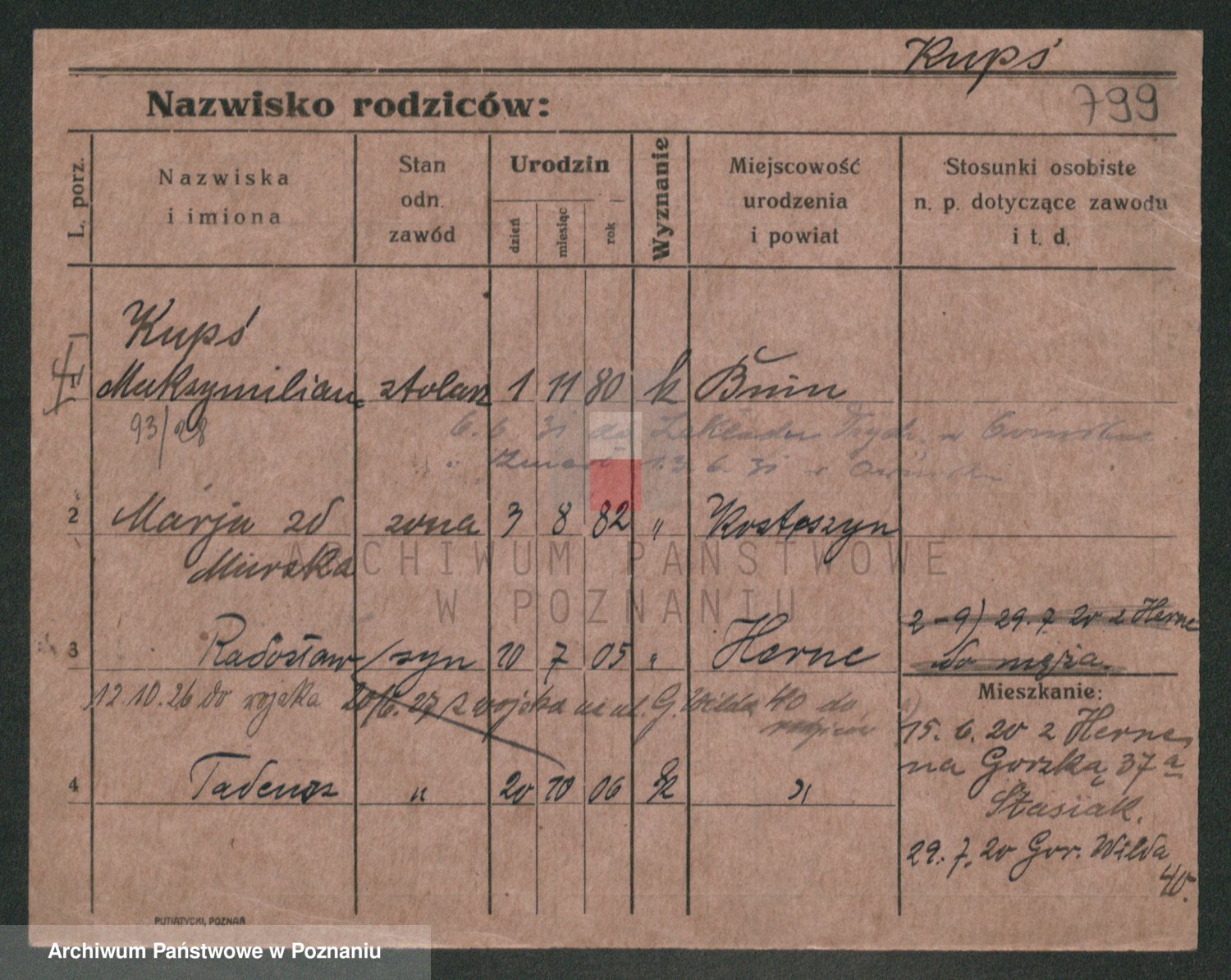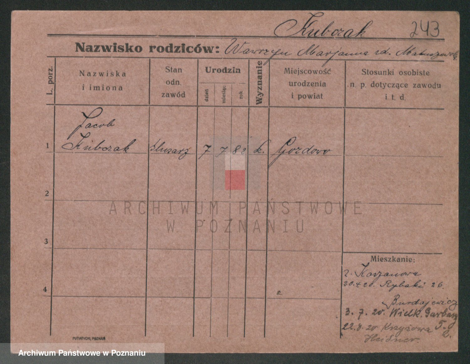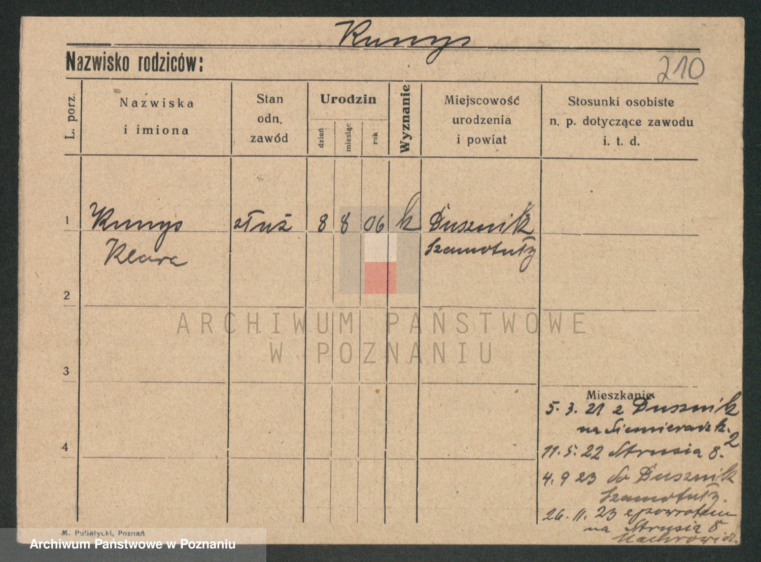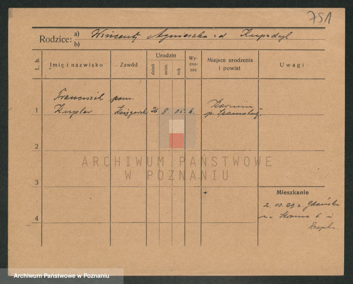 Podgląd karty osobowej dostępny jest po kliknięciu na nazwisko lub ikonkę karty. Można dokonywać powiększenia (ikony na górze) lub przechodzić między kolejnymi skanami (strzałki po bokach).