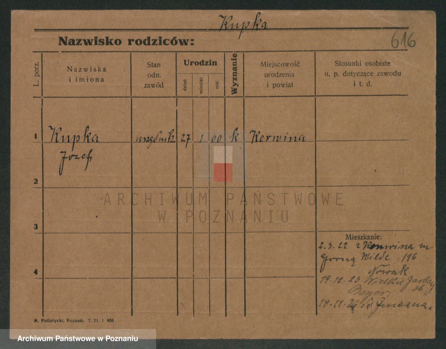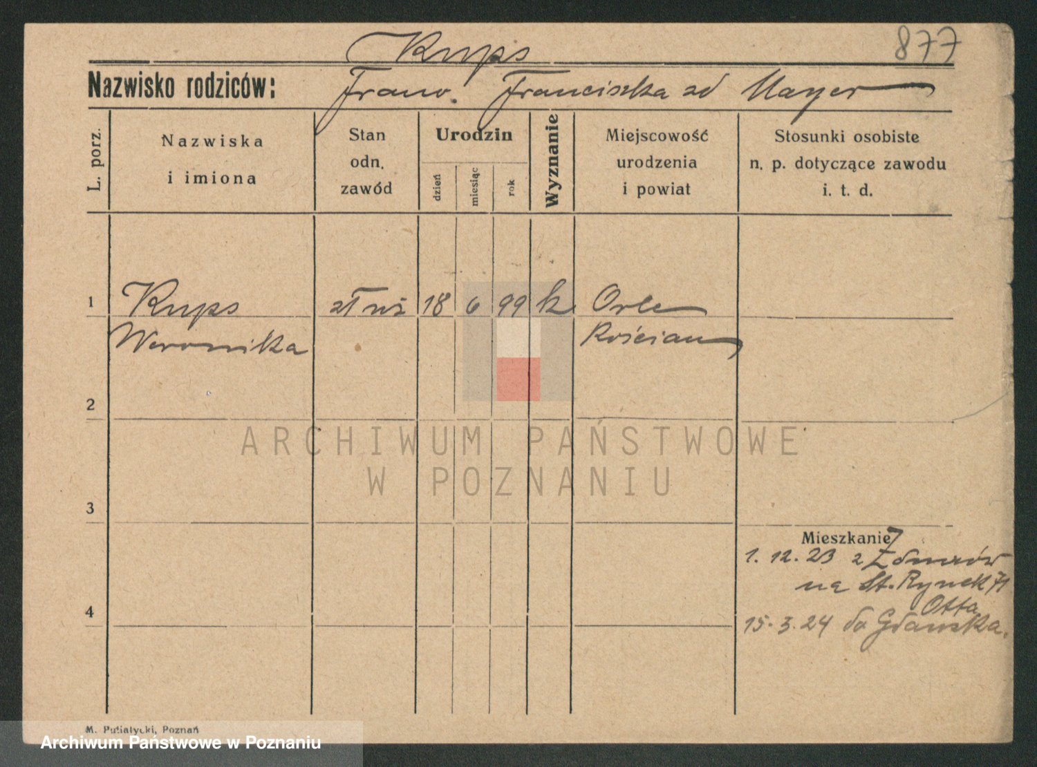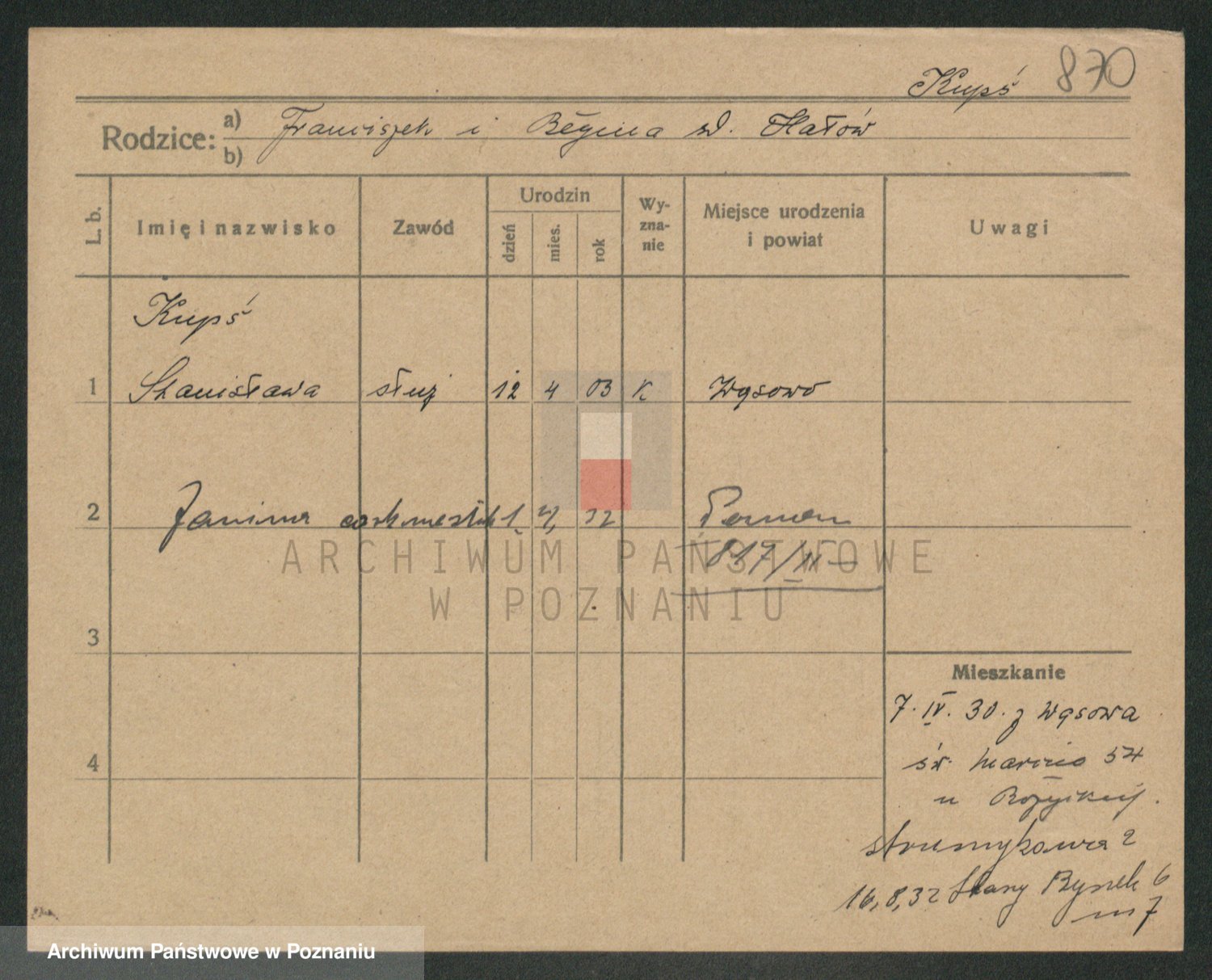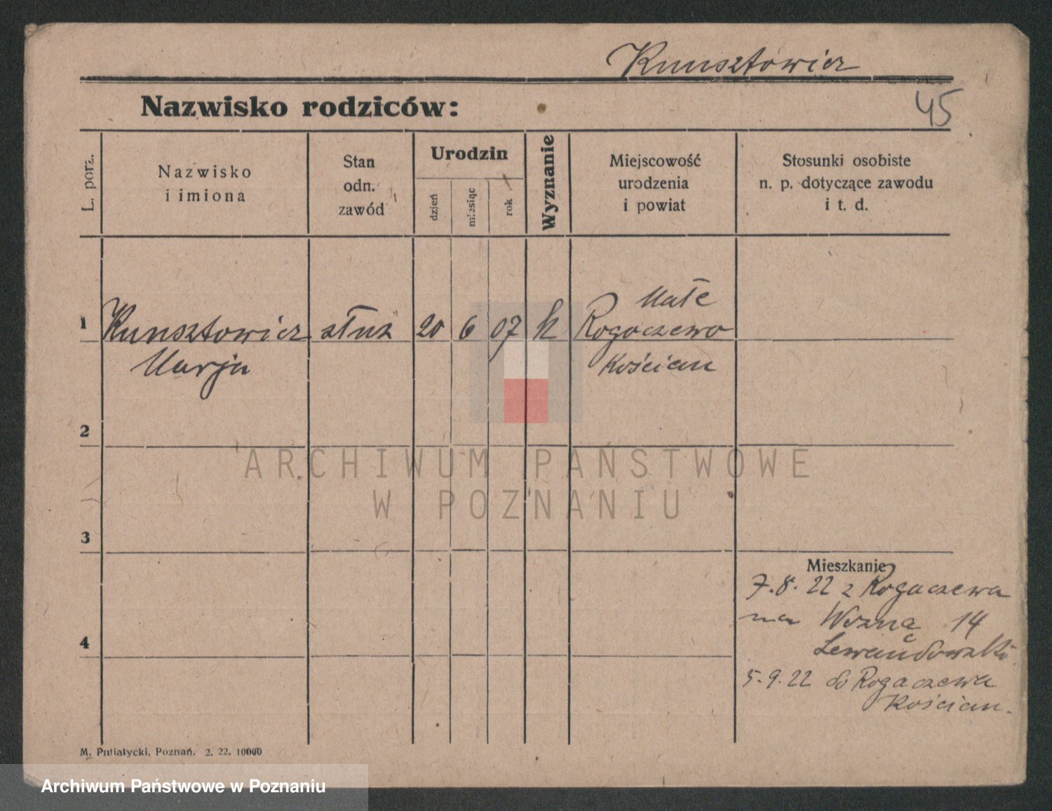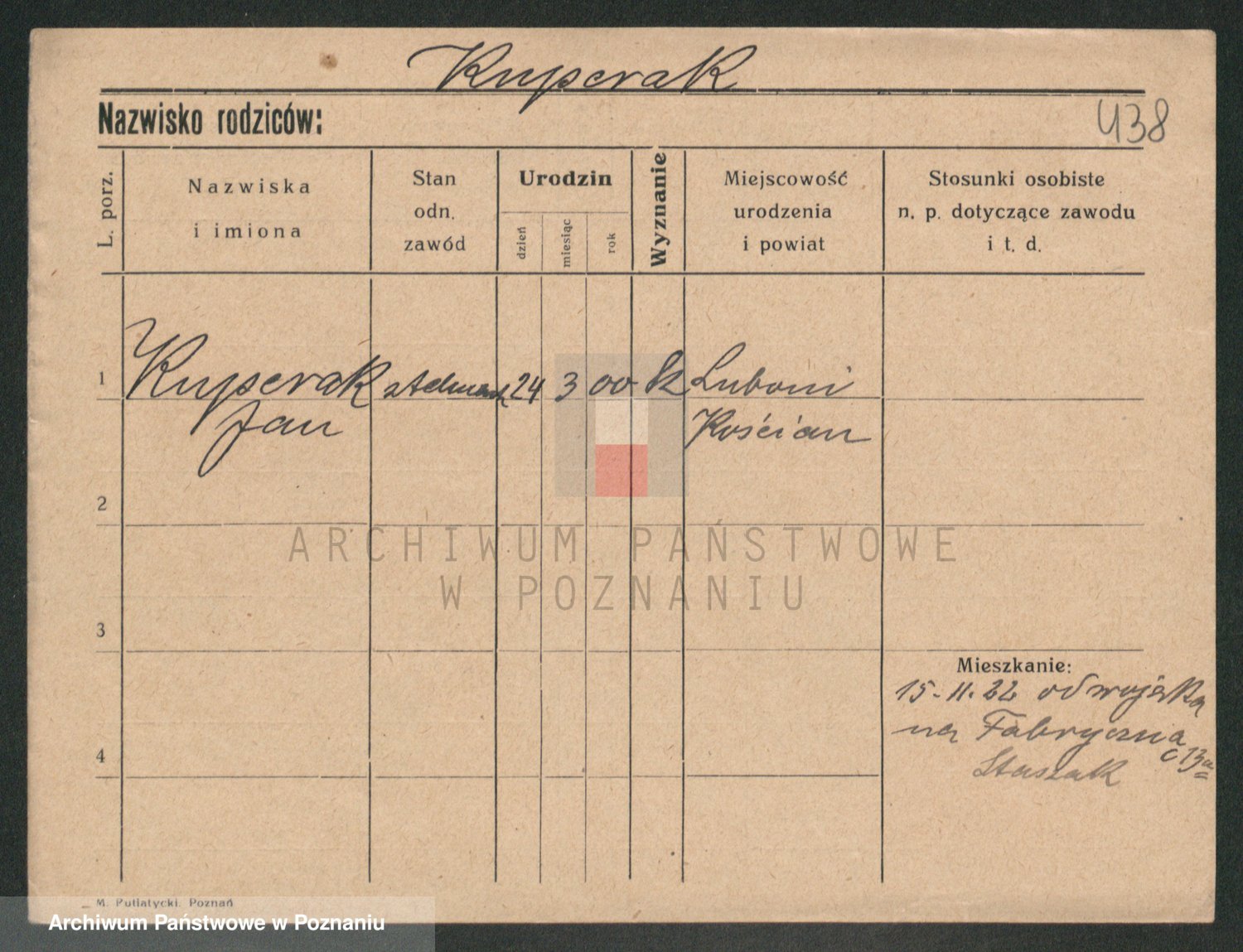 Podgląd karty osobowej dostępny jest po kliknięciu na nazwisko lub ikonkę karty. Można dokonywać powiększenia (ikony na górze) lub przechodzić między kolejnymi skanami (strzałki po bokach).