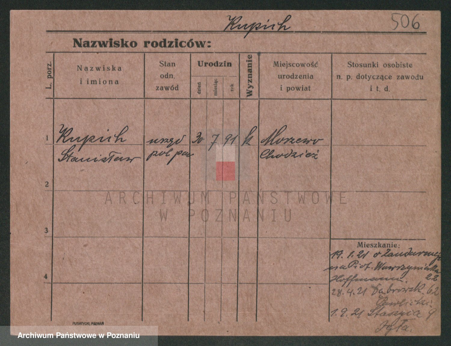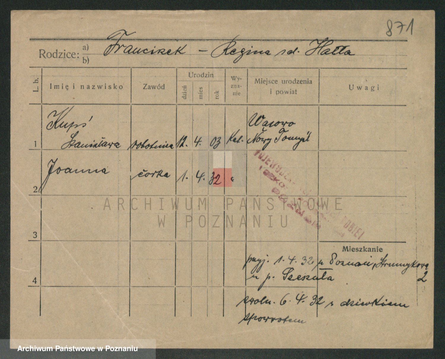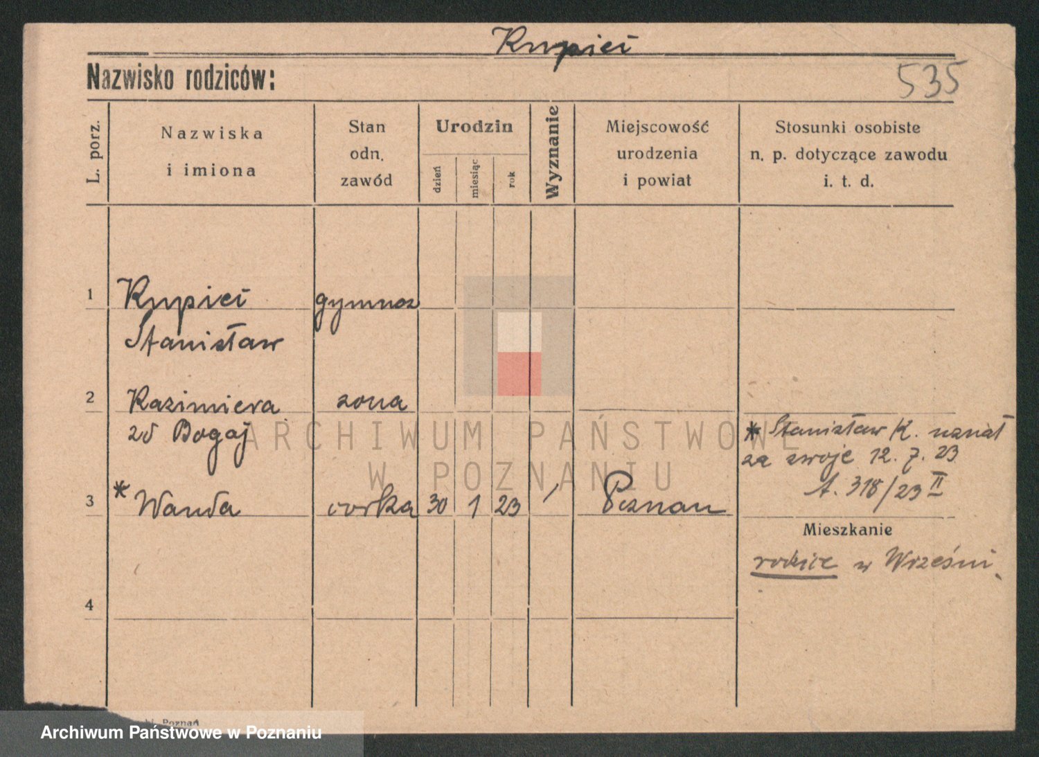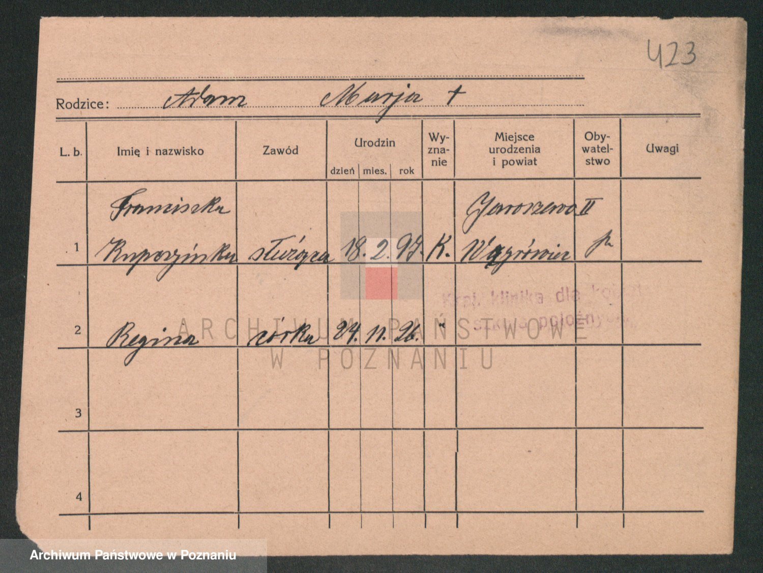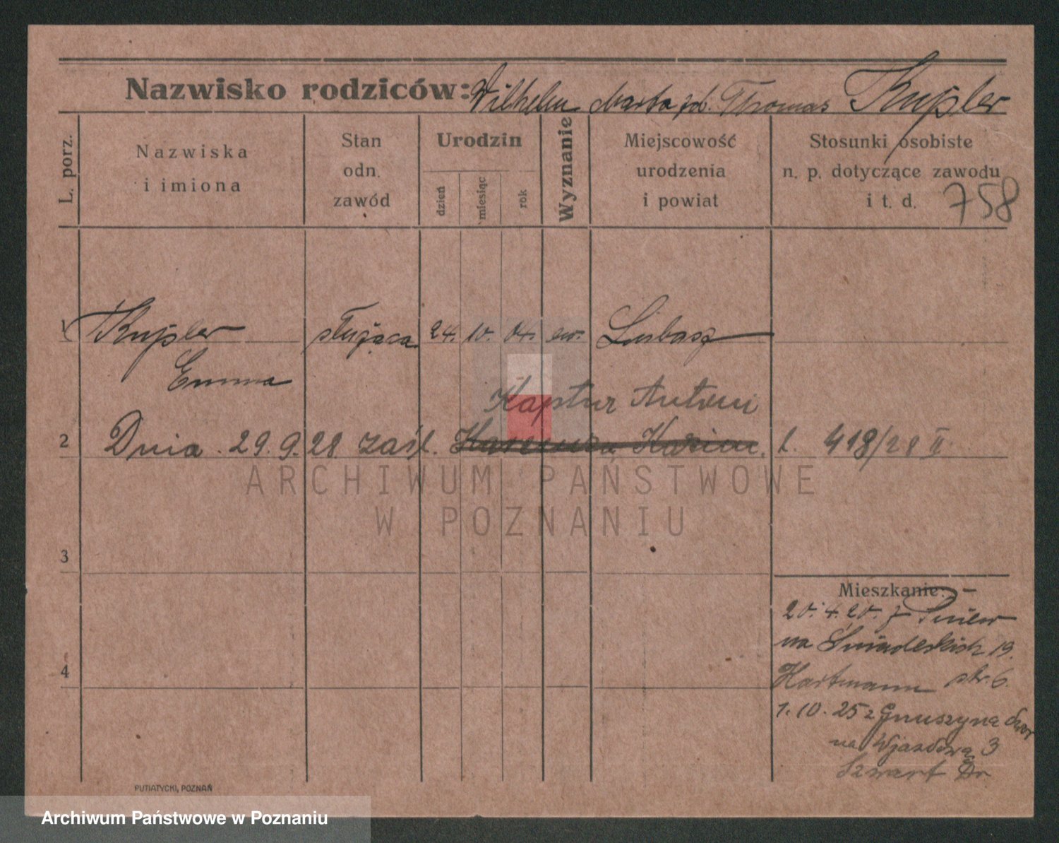 Podgląd karty osobowej dostępny jest po kliknięciu na nazwisko lub ikonkę karty. Można dokonywać powiększenia (ikony na górze) lub przechodzić między kolejnymi skanami (strzałki po bokach).