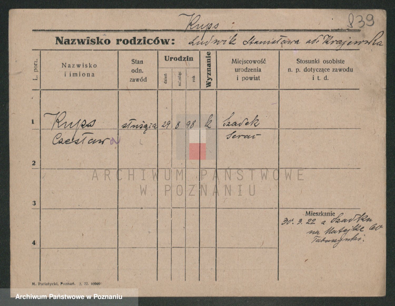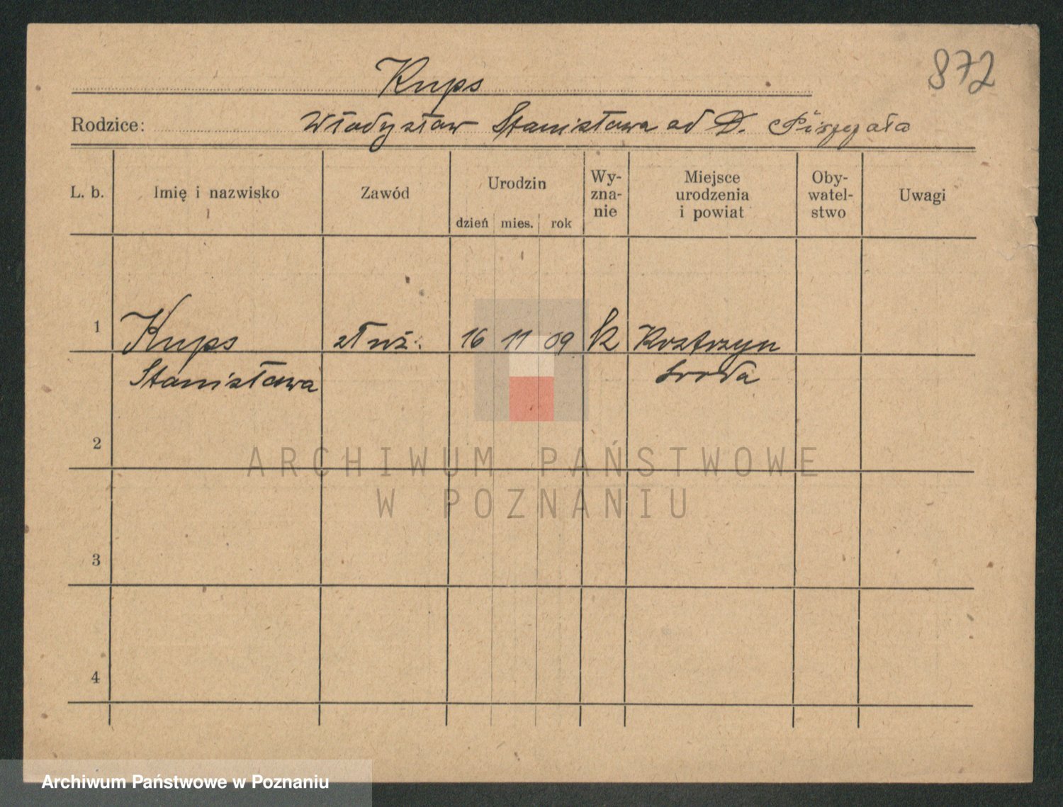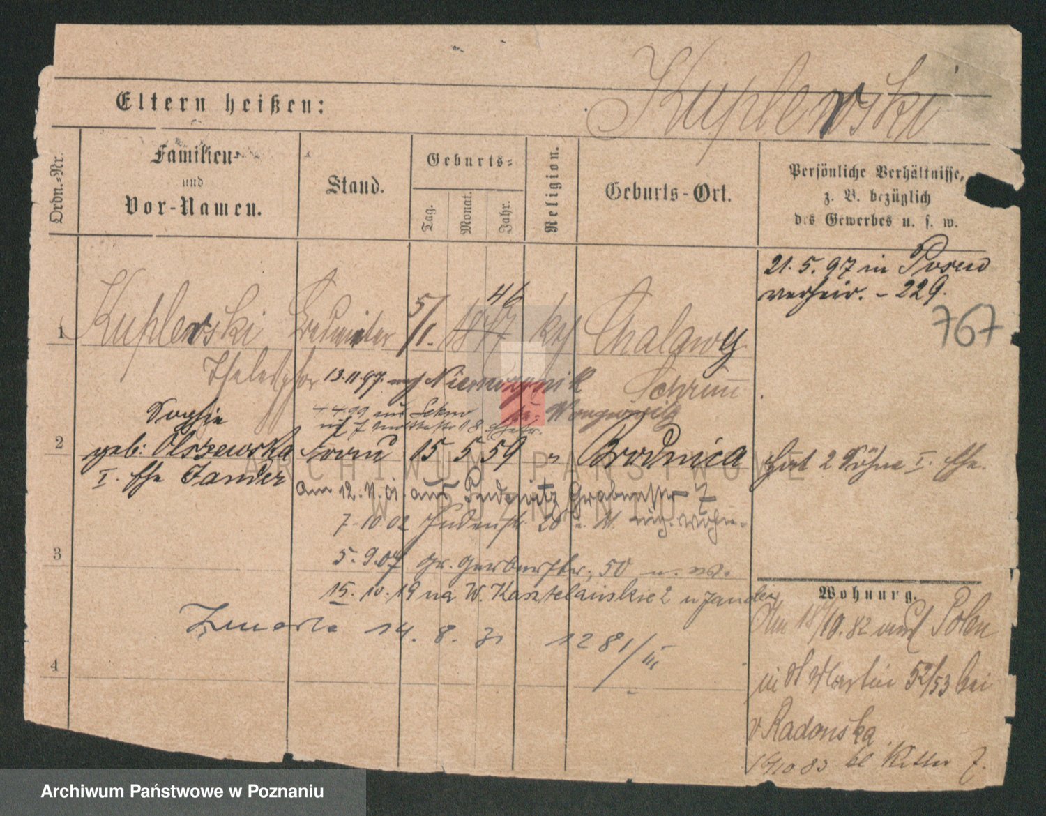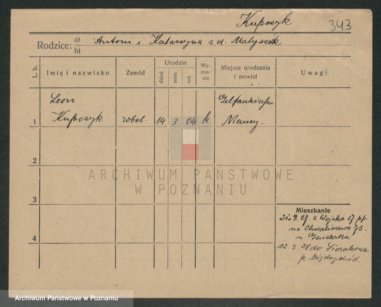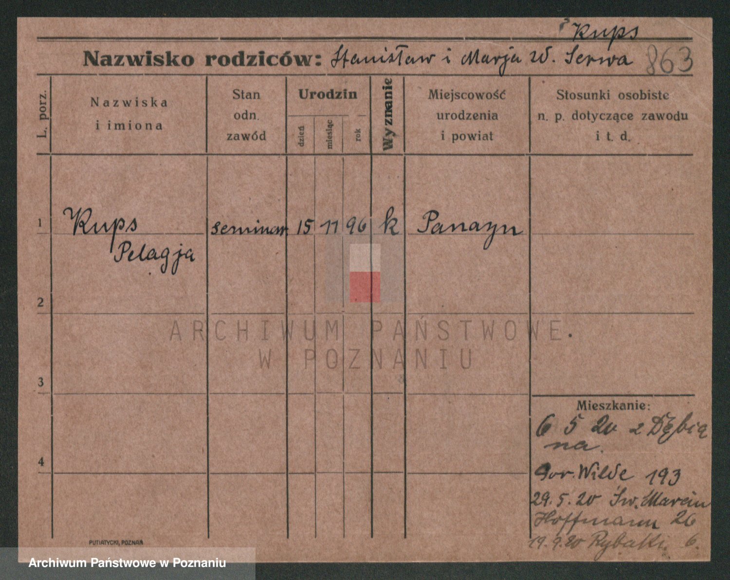 Podgląd karty osobowej dostępny jest po kliknięciu na nazwisko lub ikonkę karty. Można dokonywać powiększenia (ikony na górze) lub przechodzić między kolejnymi skanami (strzałki po bokach).