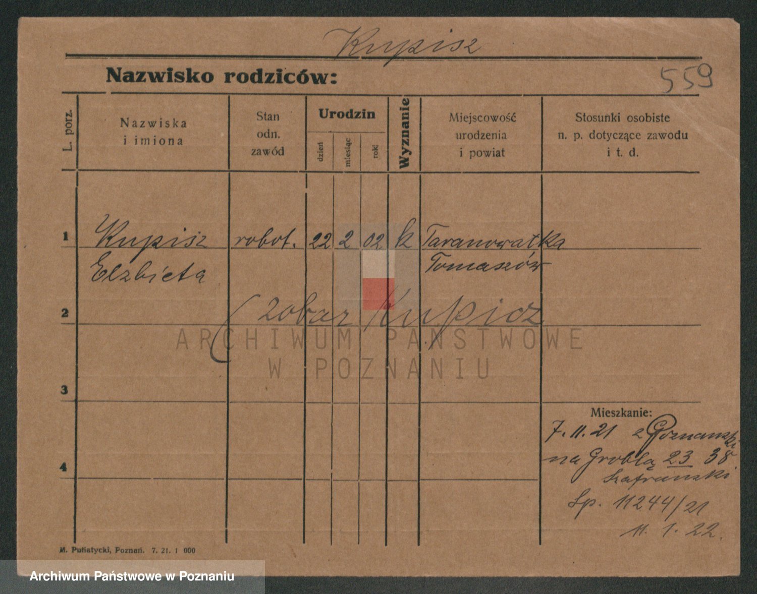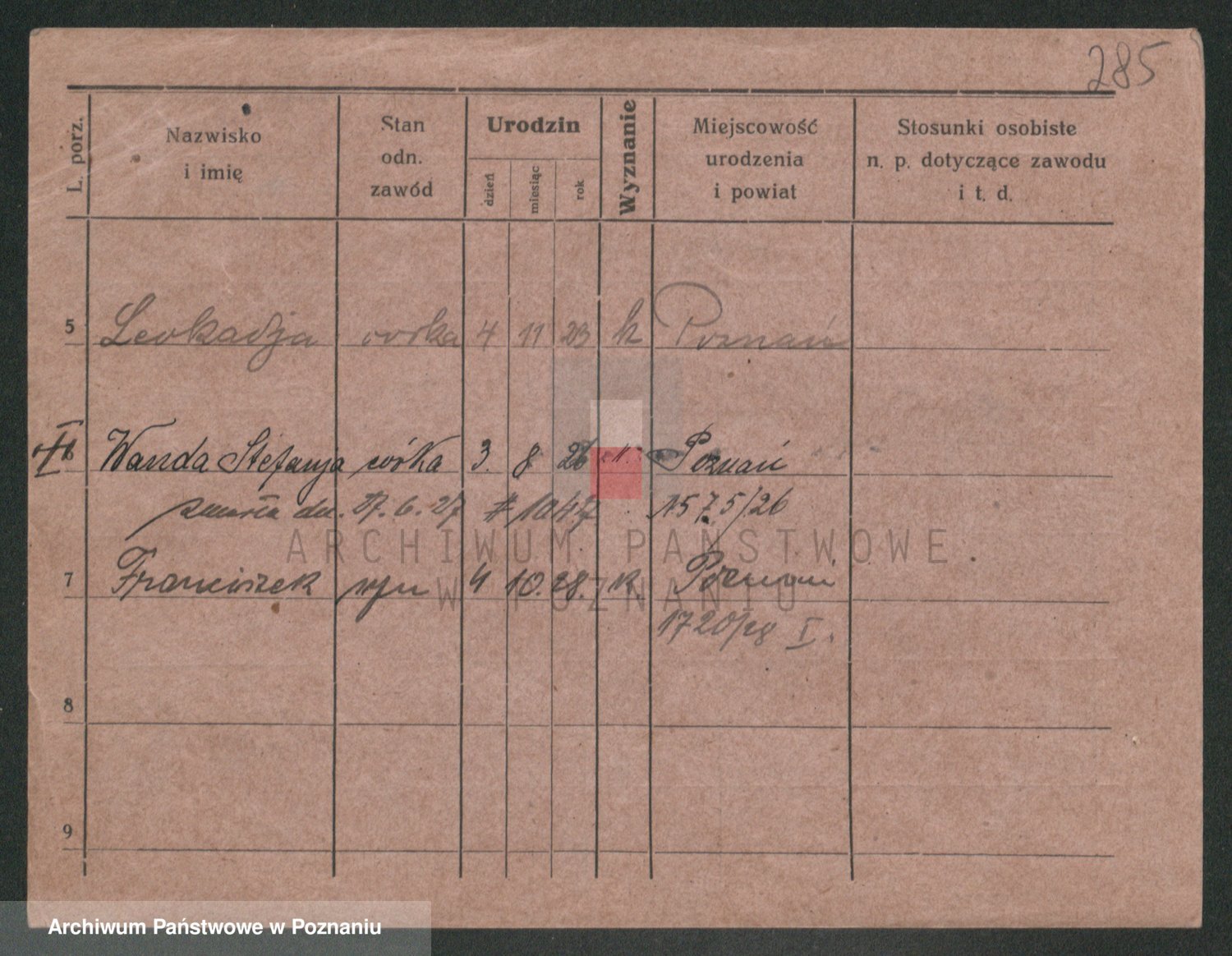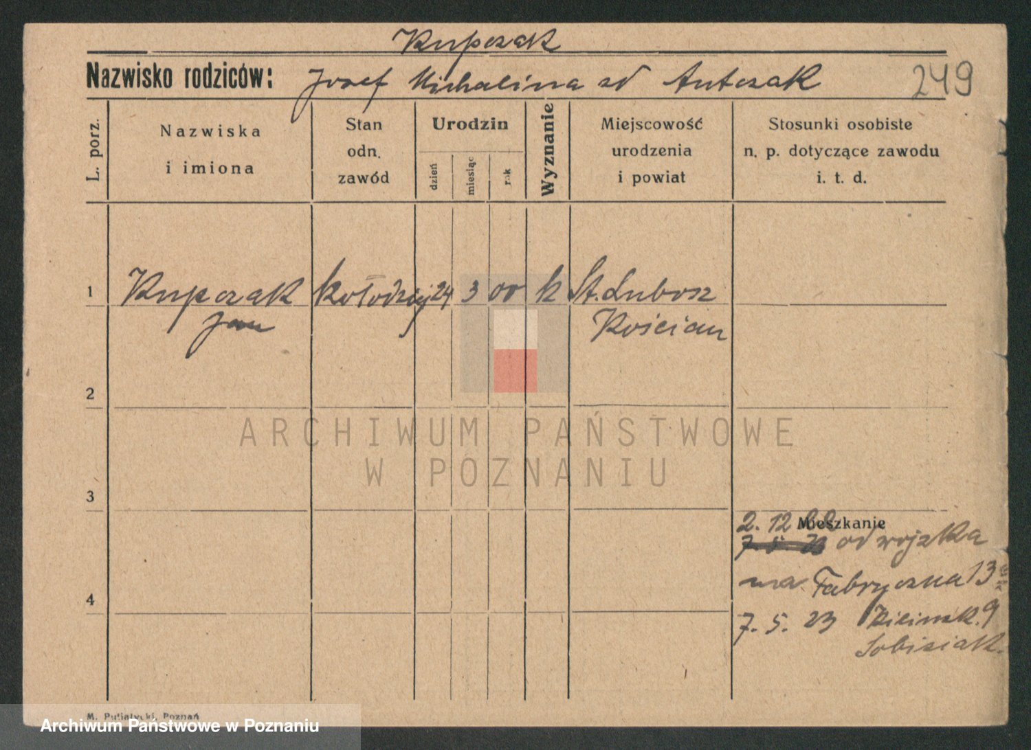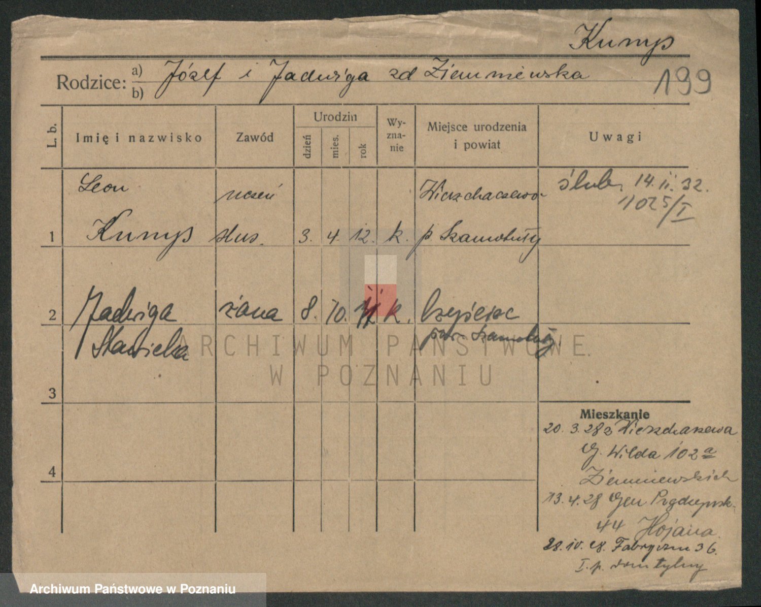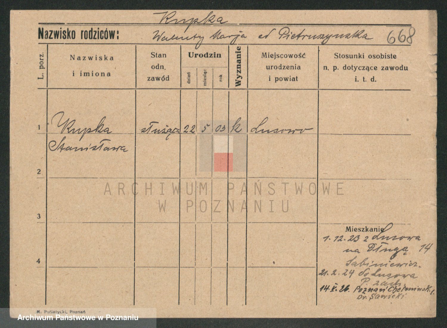 Podgląd karty osobowej dostępny jest po kliknięciu na nazwisko lub ikonkę karty. Można dokonywać powiększenia (ikony na górze) lub przechodzić między kolejnymi skanami (strzałki po bokach).