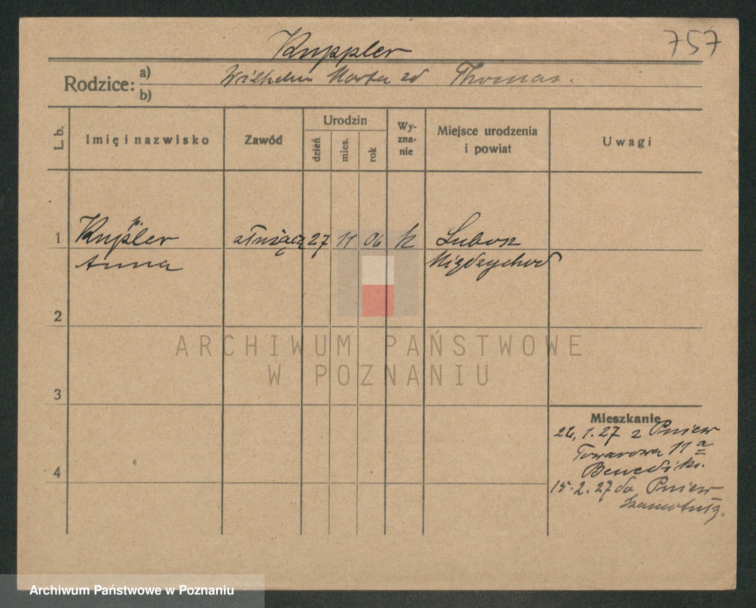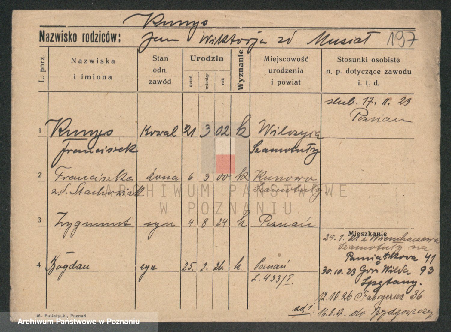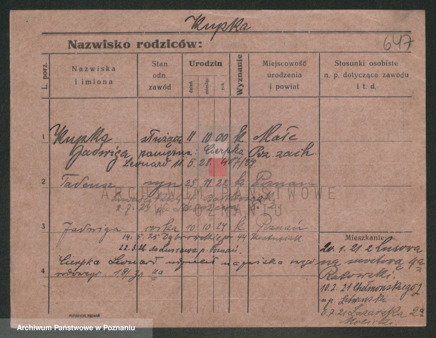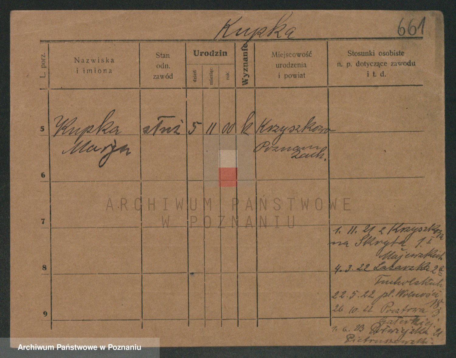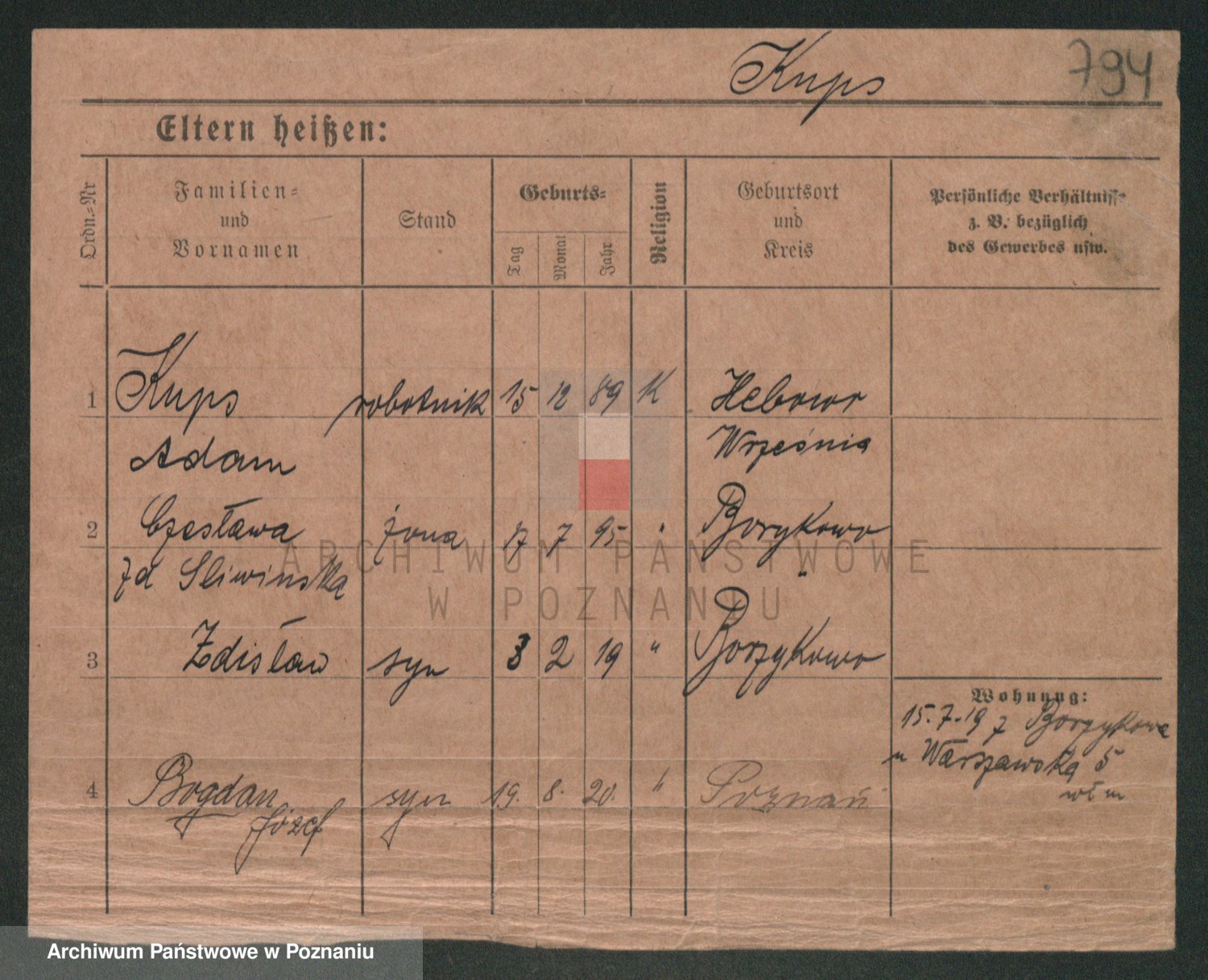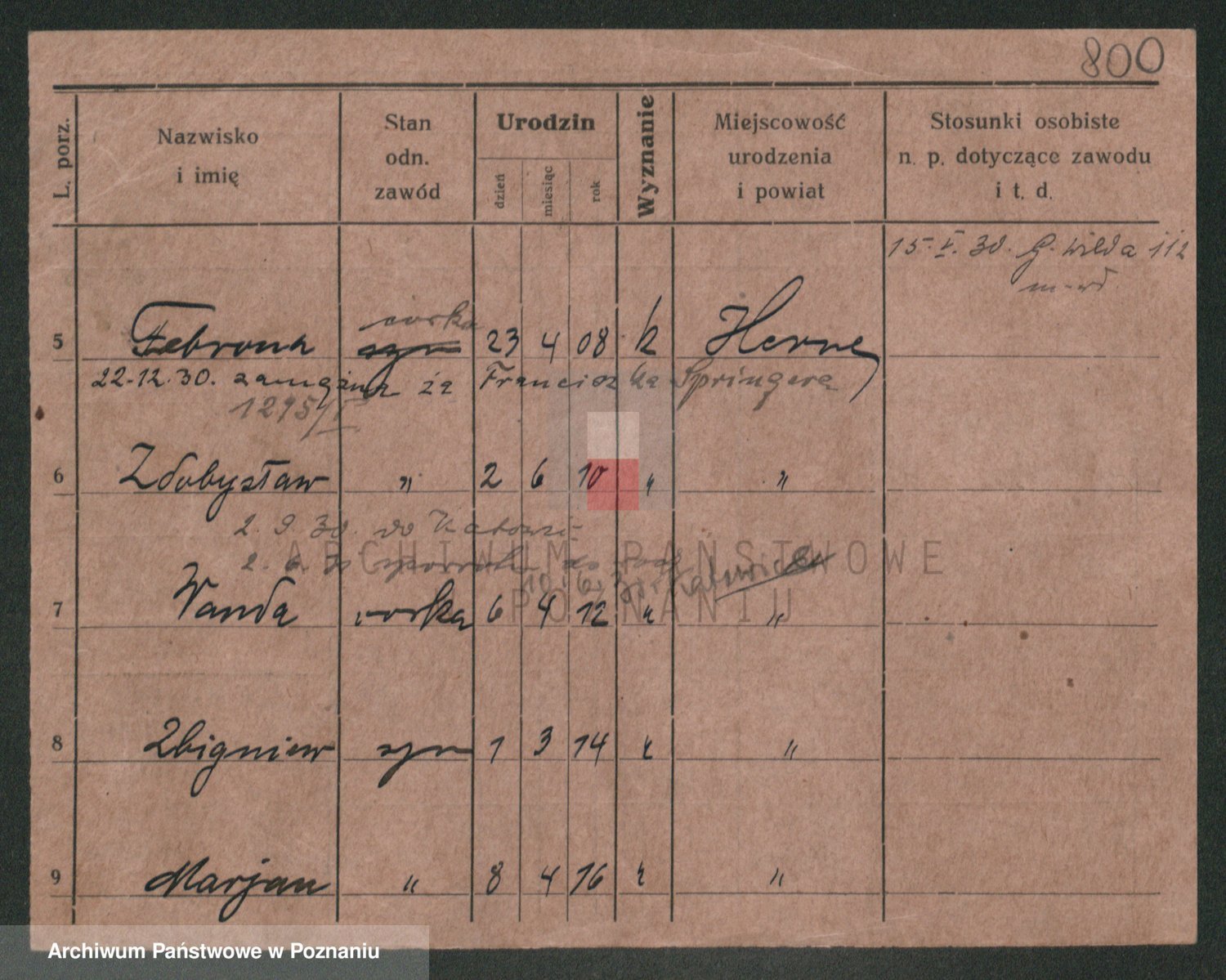 Podgląd karty osobowej dostępny jest po kliknięciu na nazwisko lub ikonkę karty. Można dokonywać powiększenia (ikony na górze) lub przechodzić między kolejnymi skanami (strzałki po bokach).