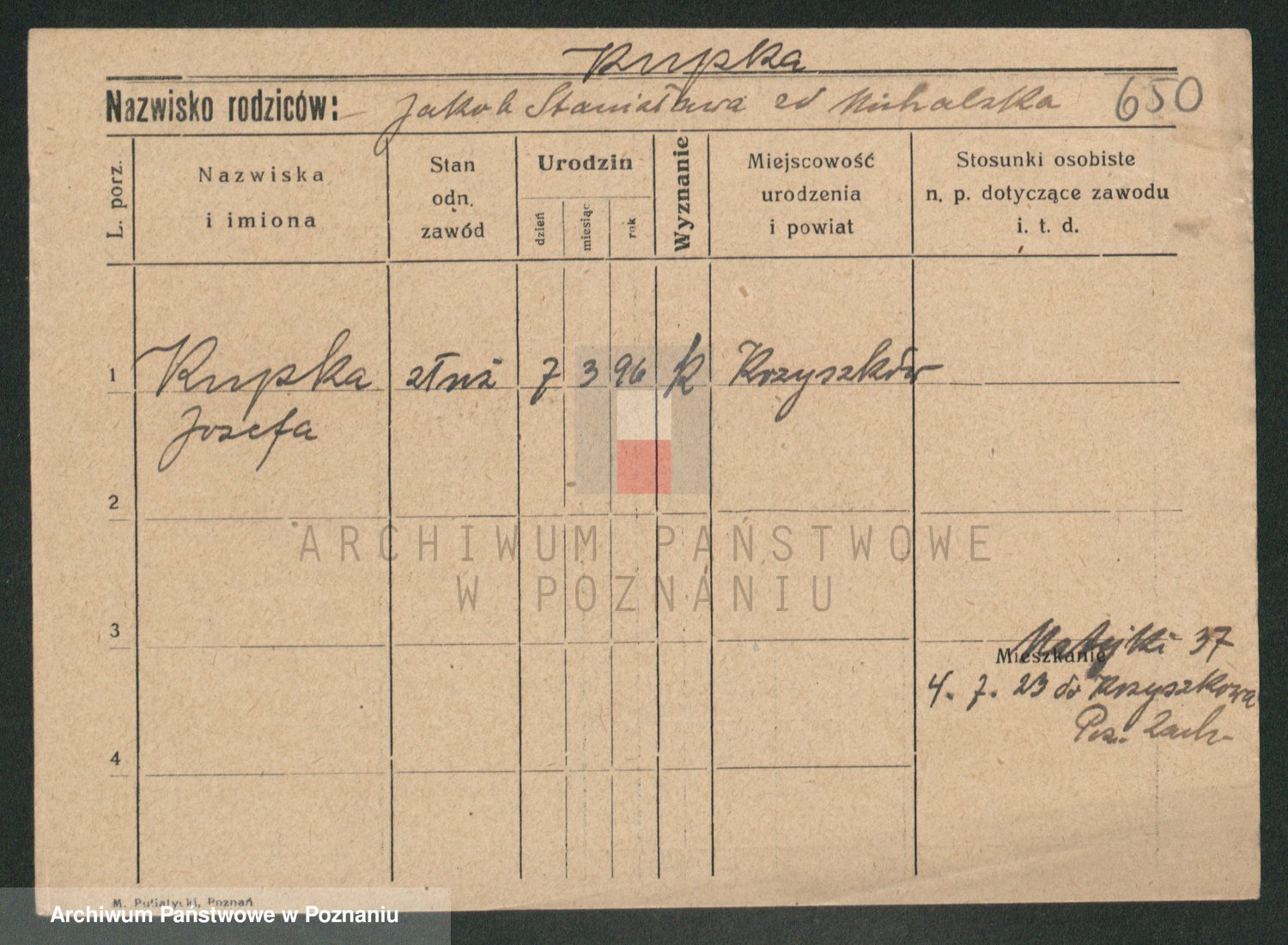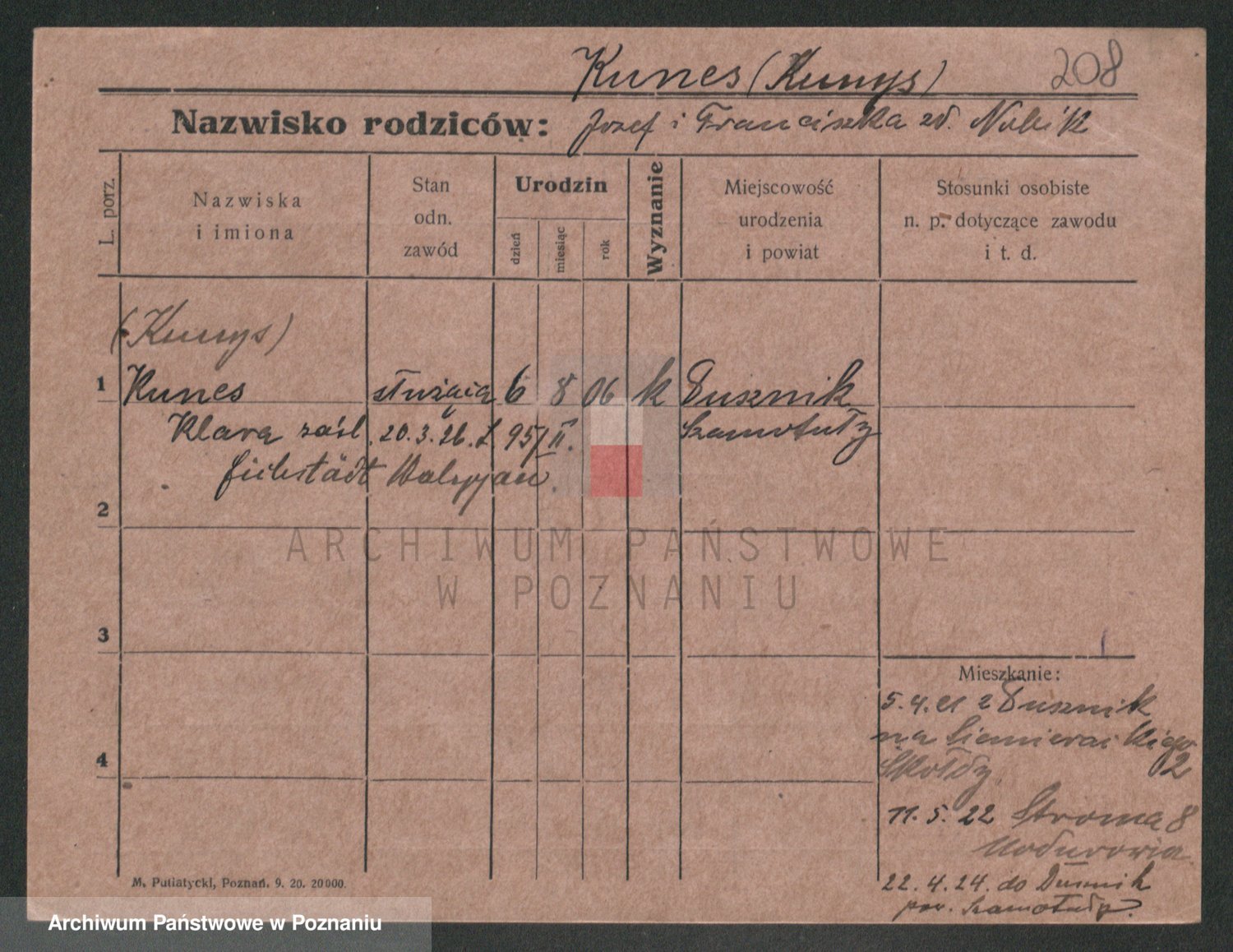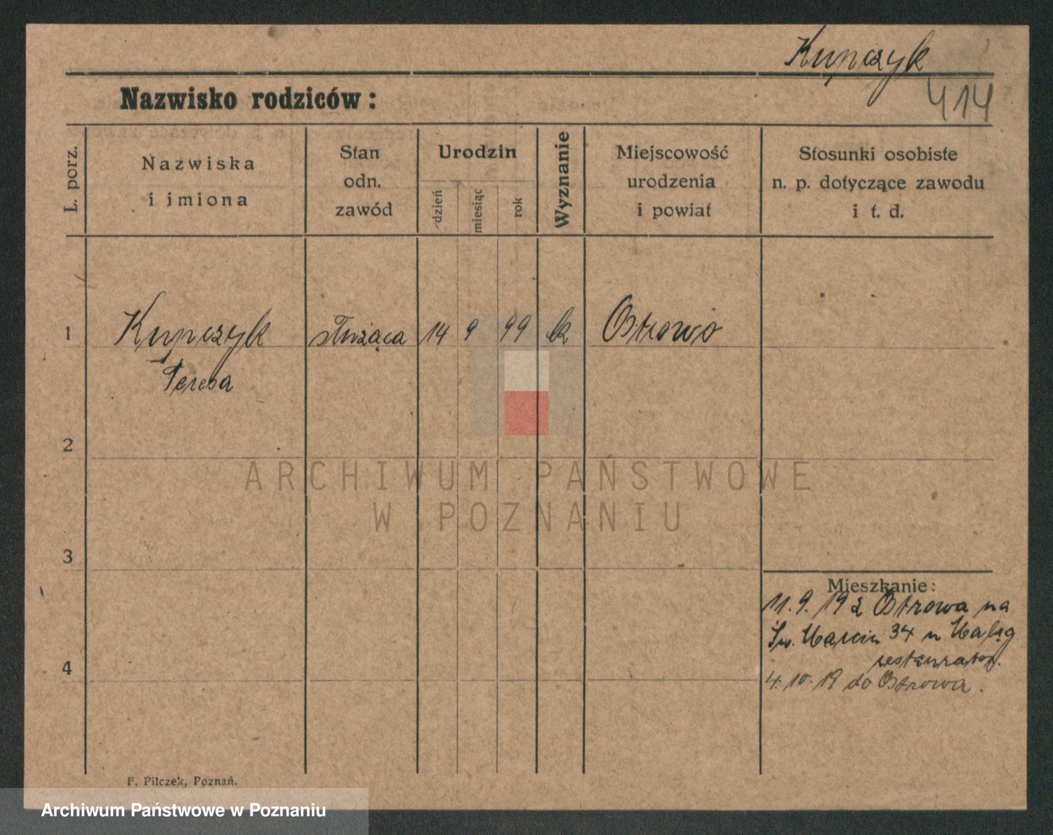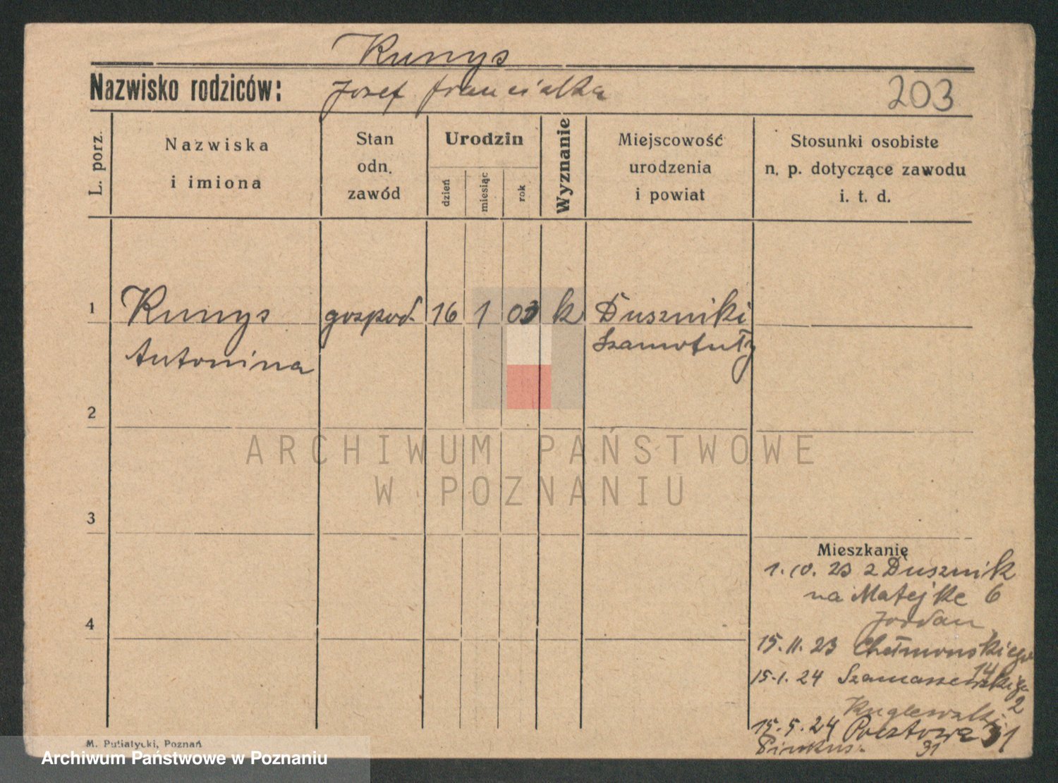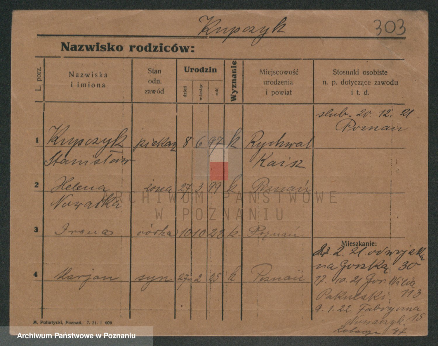 Podgląd karty osobowej dostępny jest po kliknięciu na nazwisko lub ikonkę karty. Można dokonywać powiększenia (ikony na górze) lub przechodzić między kolejnymi skanami (strzałki po bokach).