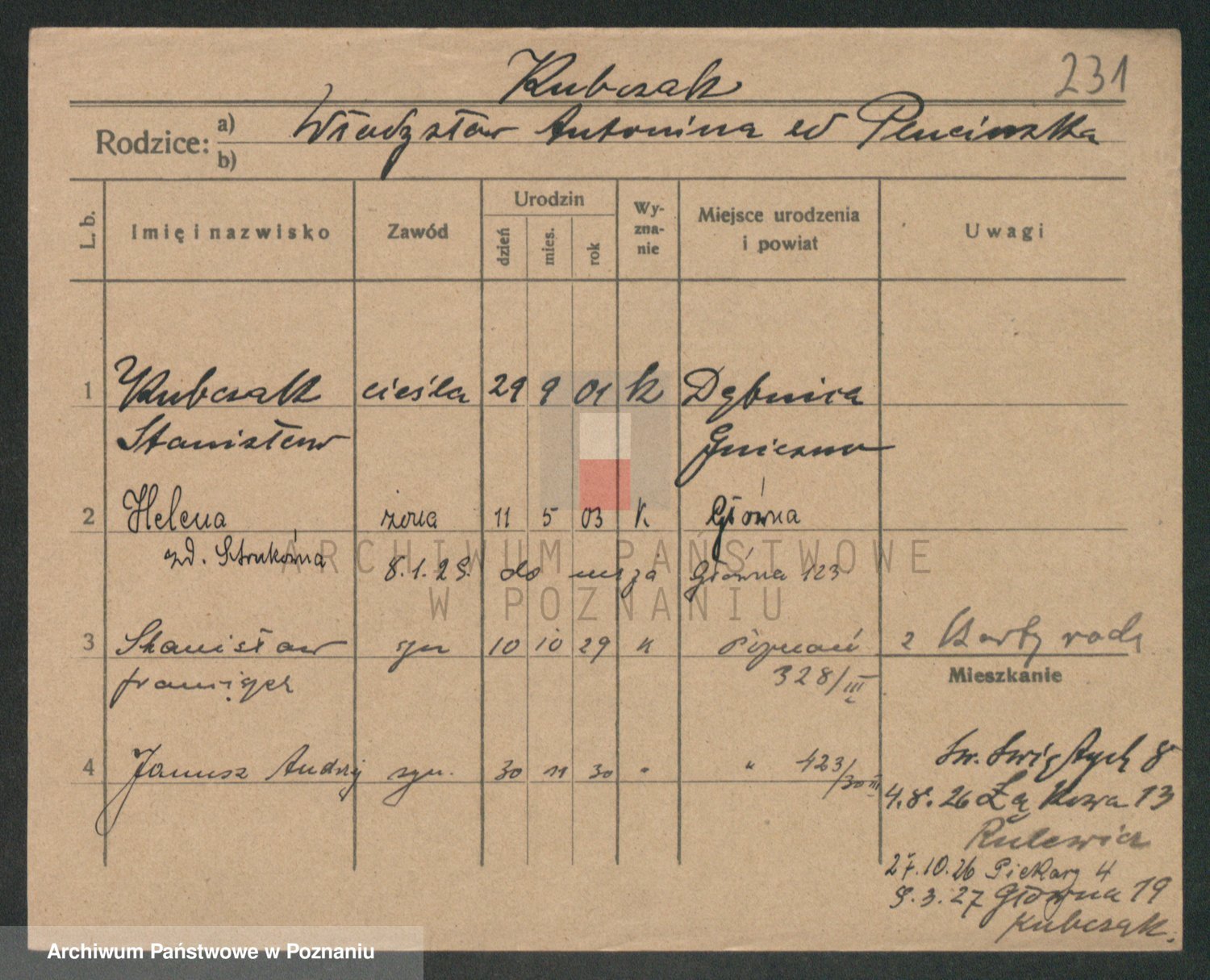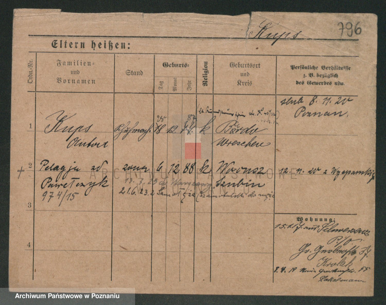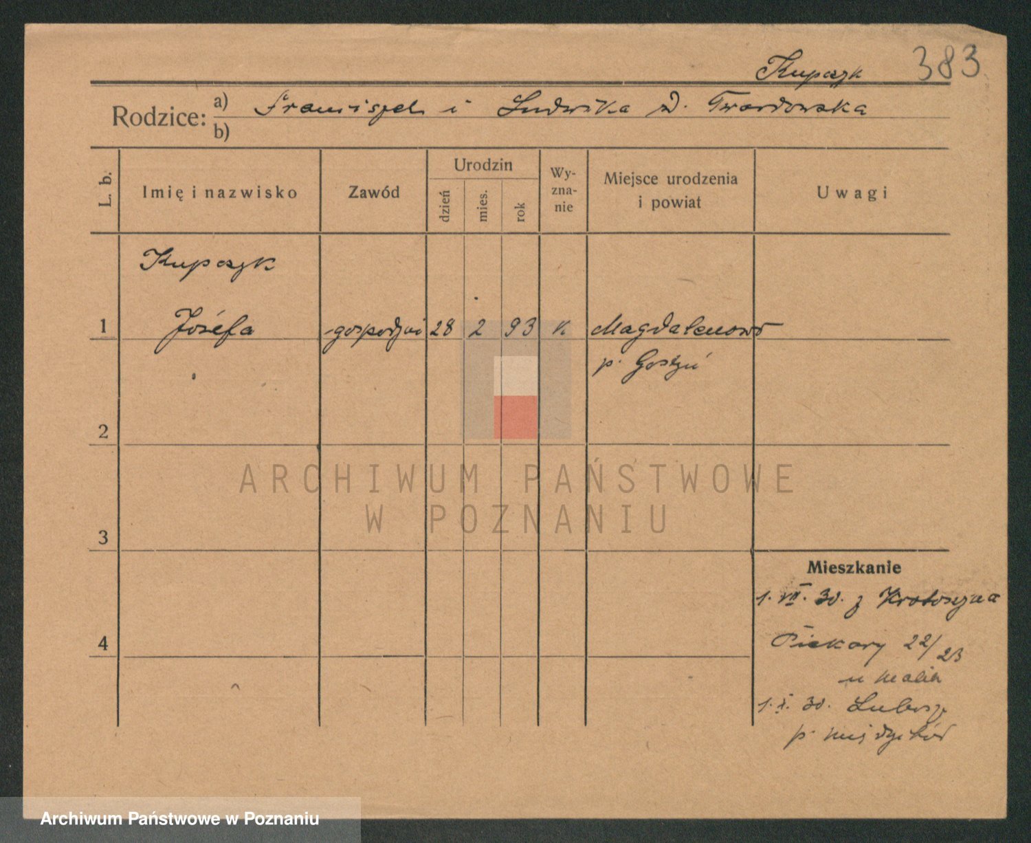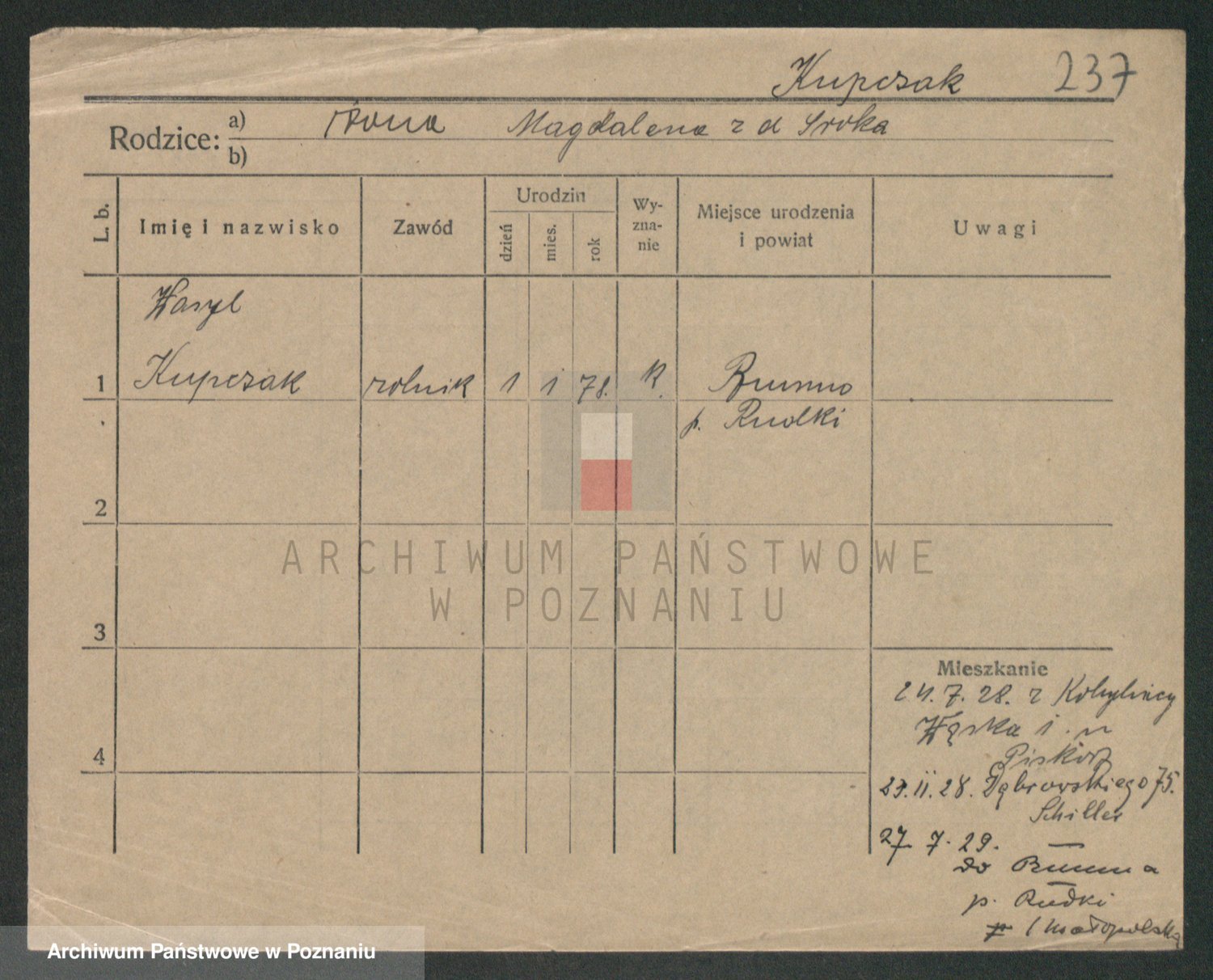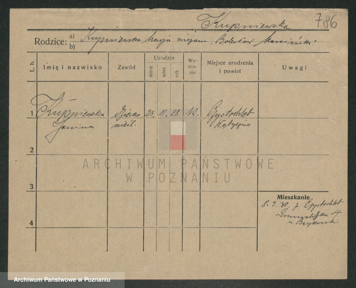 Podgląd karty osobowej dostępny jest po kliknięciu na nazwisko lub ikonkę karty. Można dokonywać powiększenia (ikony na górze) lub przechodzić między kolejnymi skanami (strzałki po bokach).