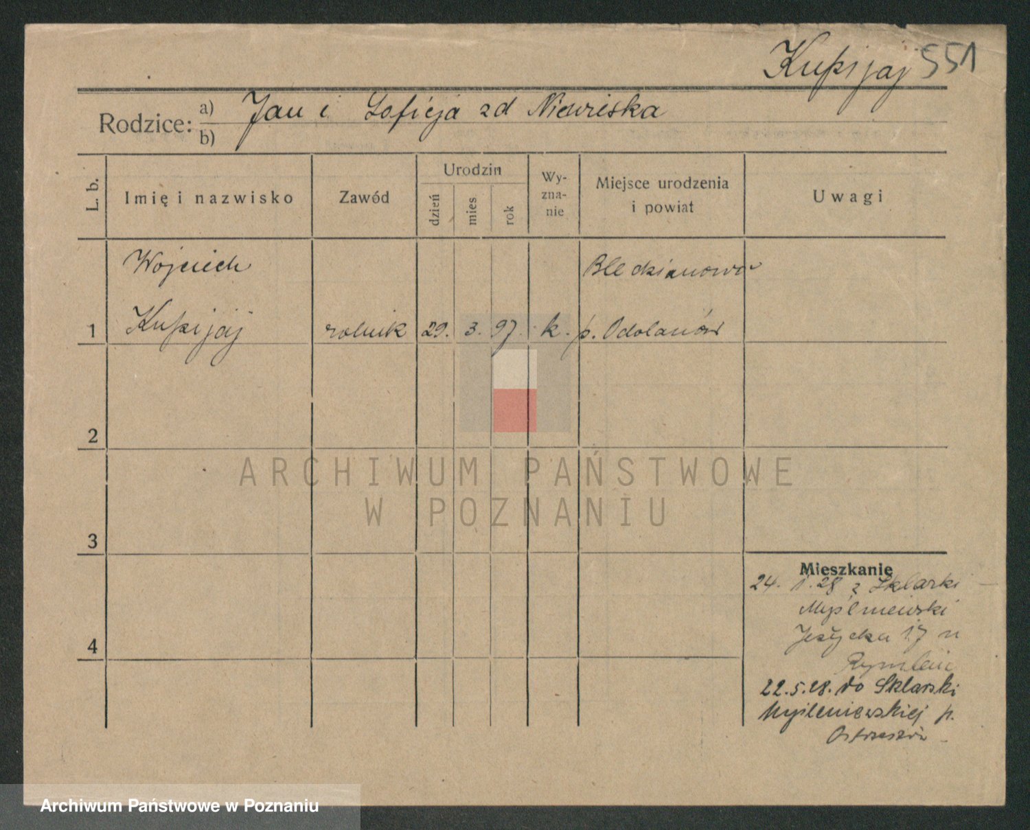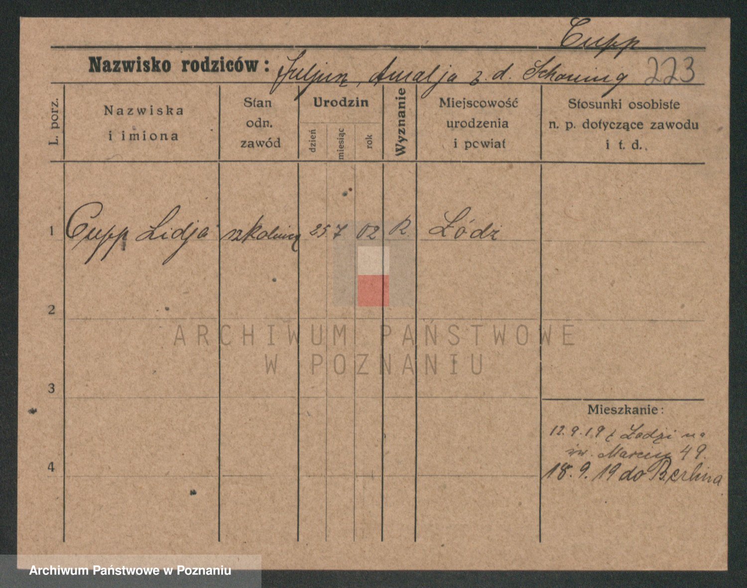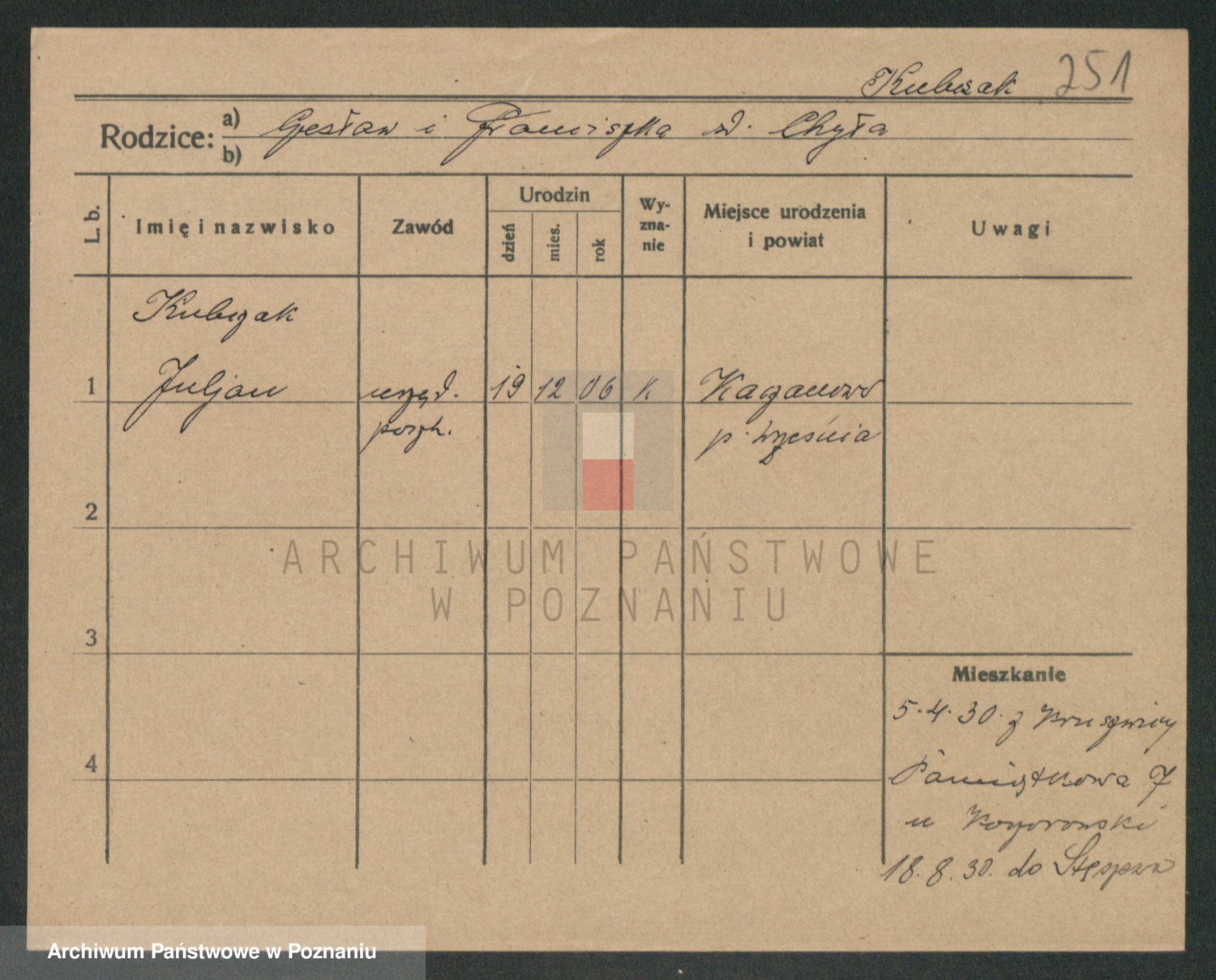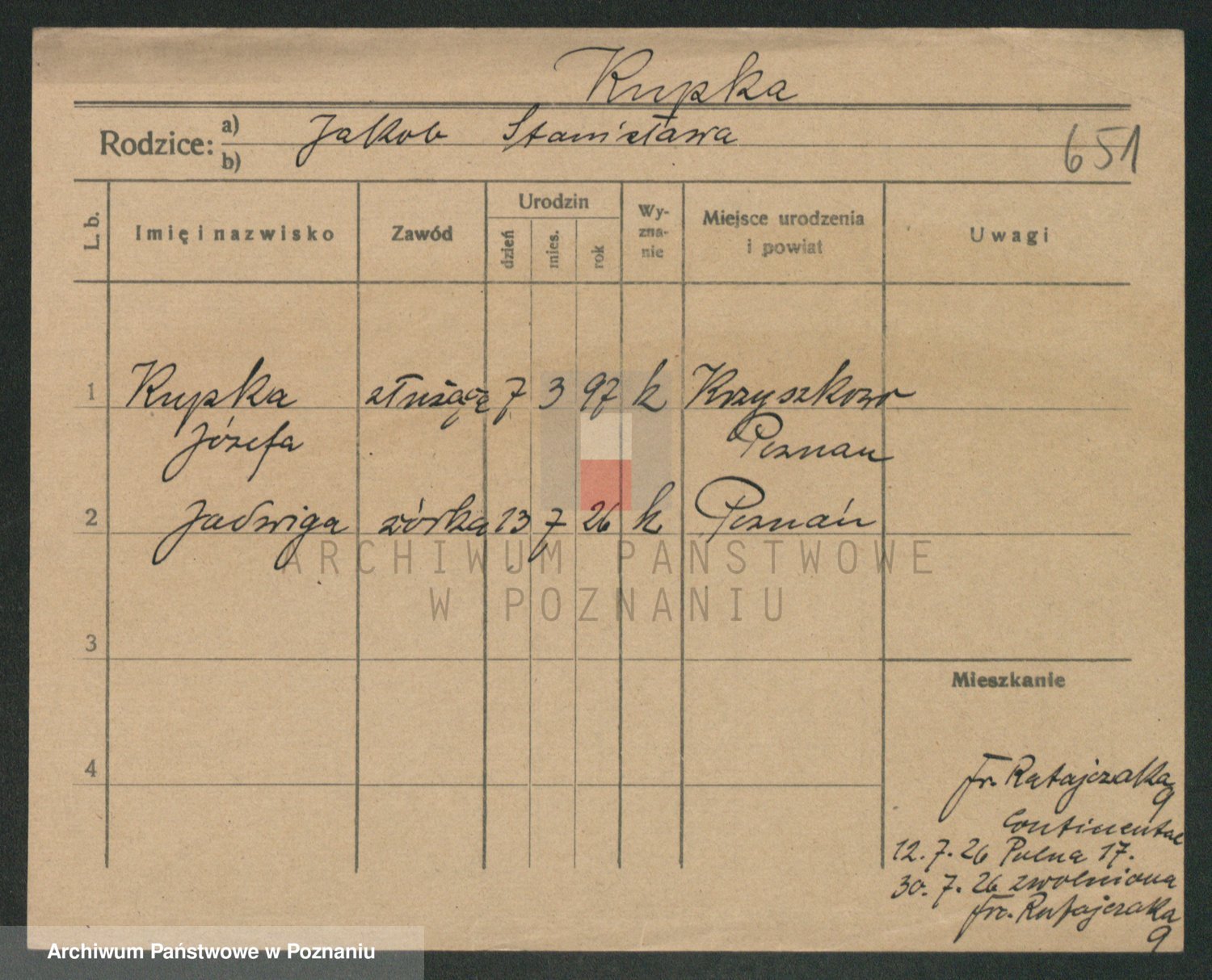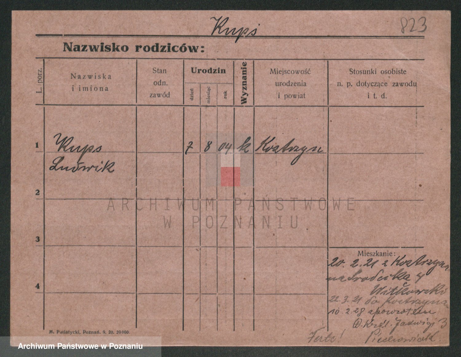 Podgląd karty osobowej dostępny jest po kliknięciu na nazwisko lub ikonkę karty. Można dokonywać powiększenia (ikony na górze) lub przechodzić między kolejnymi skanami (strzałki po bokach).