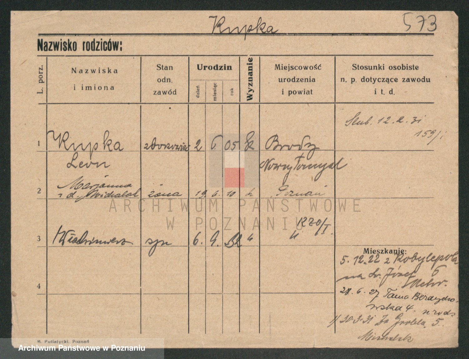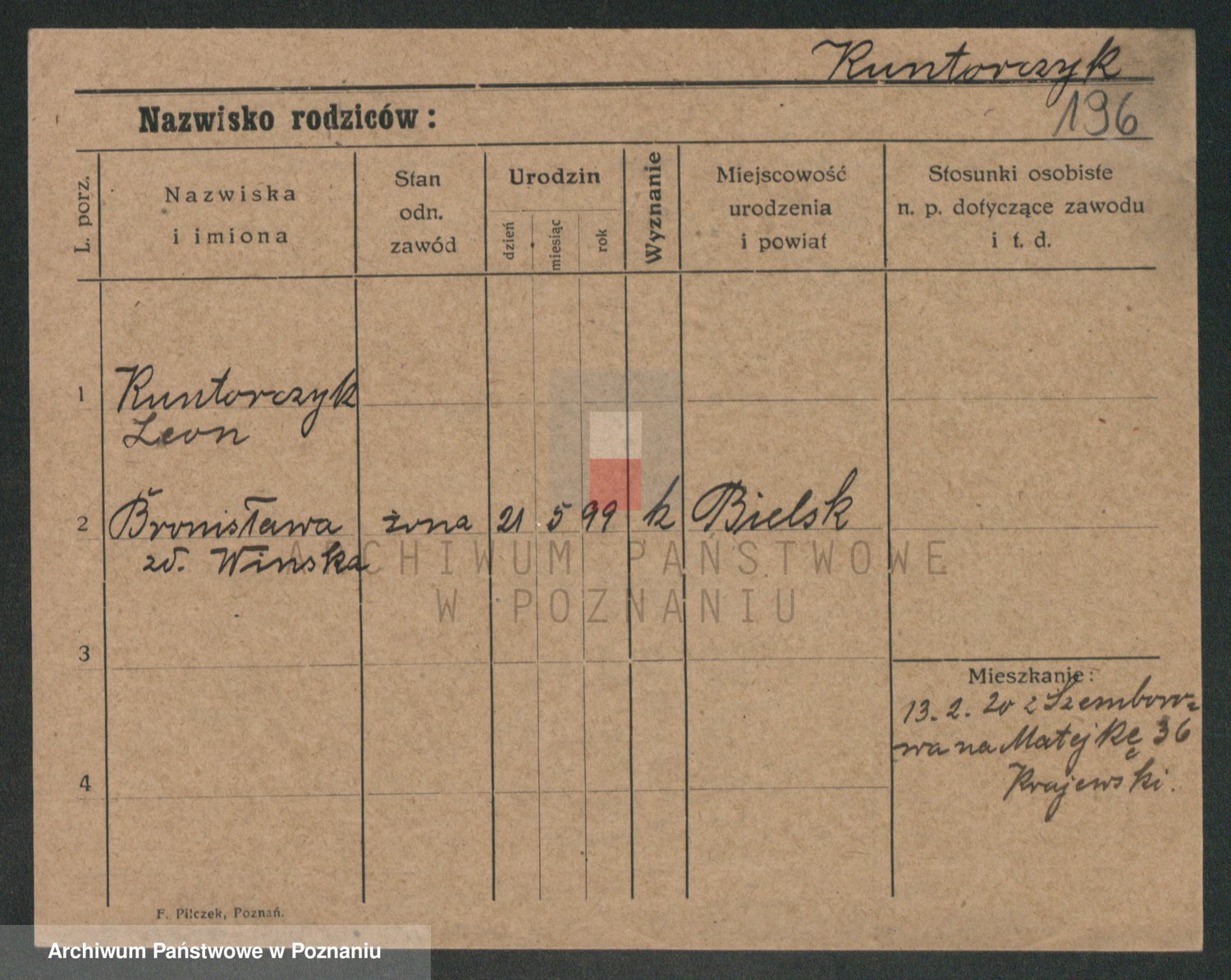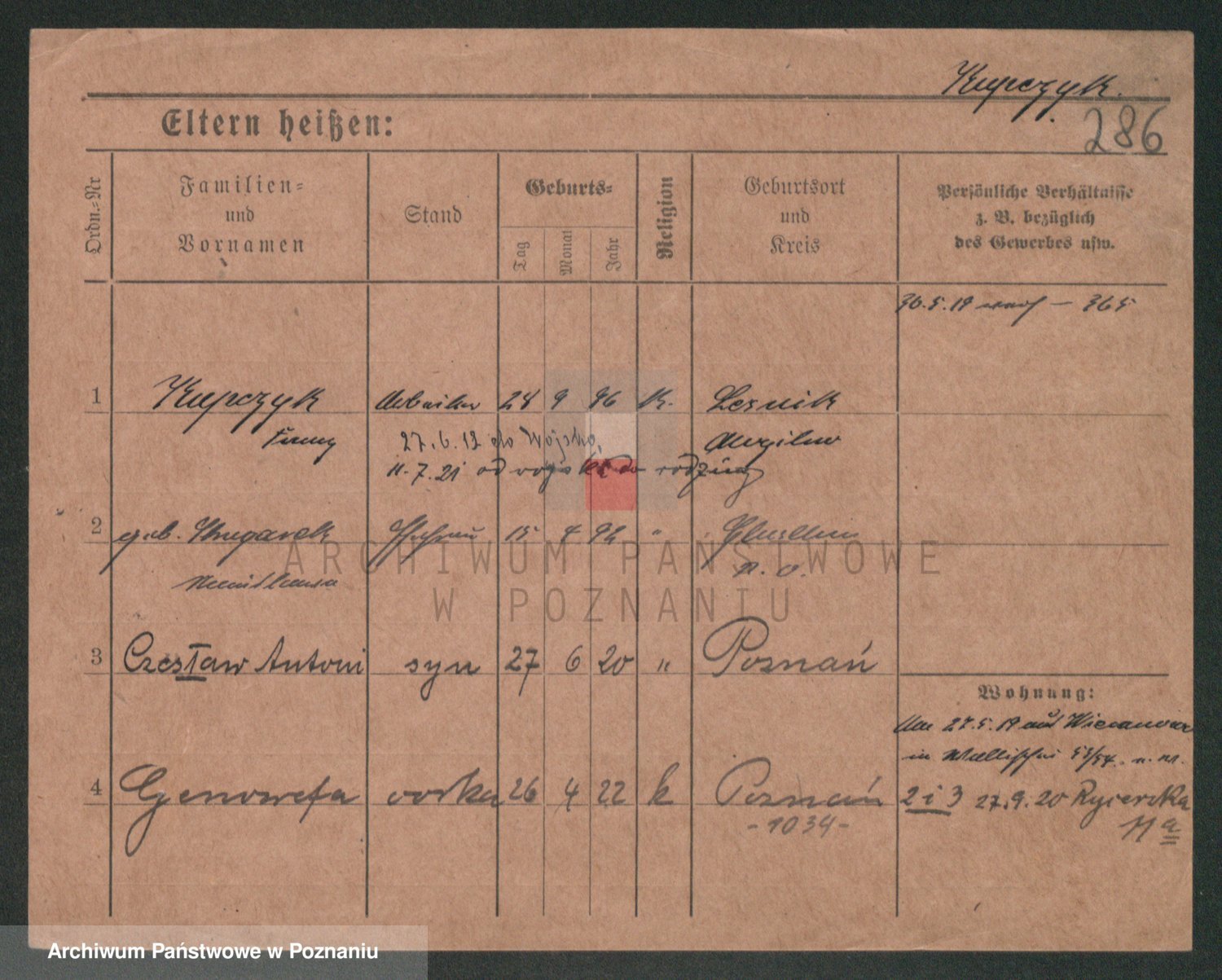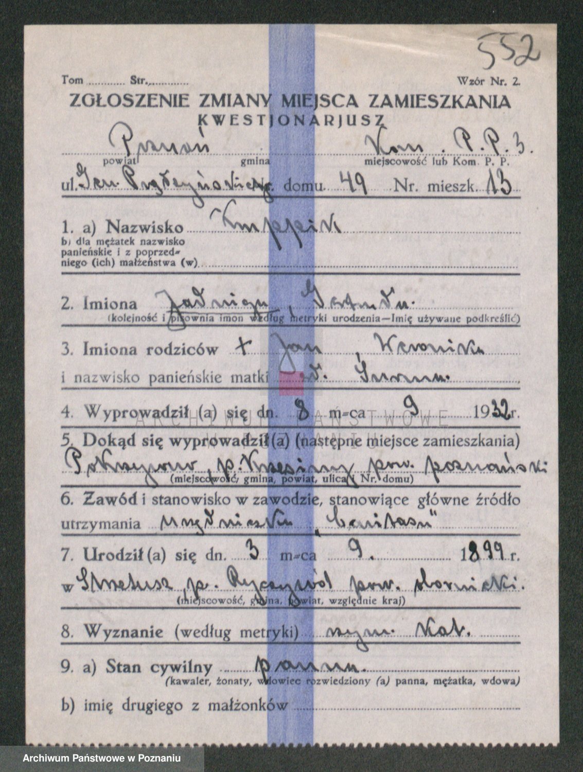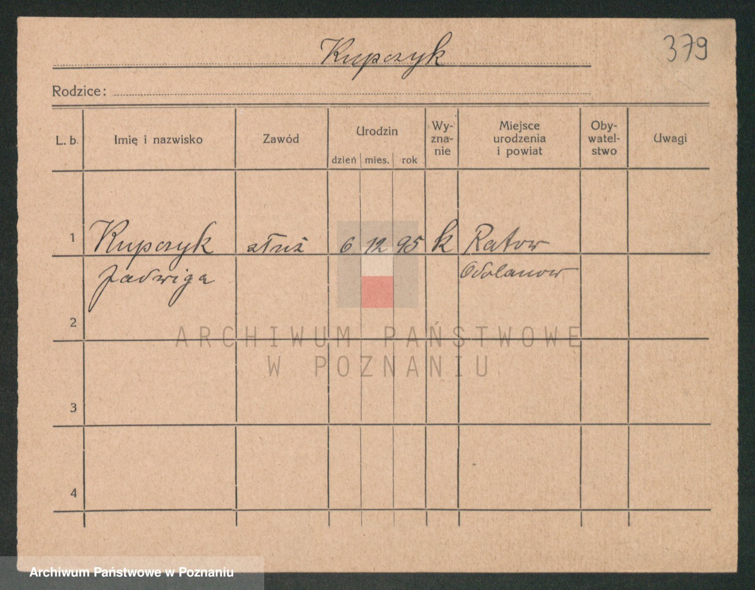 Podgląd karty osobowej dostępny jest po kliknięciu na nazwisko lub ikonkę karty. Można dokonywać powiększenia (ikony na górze) lub przechodzić między kolejnymi skanami (strzałki po bokach).