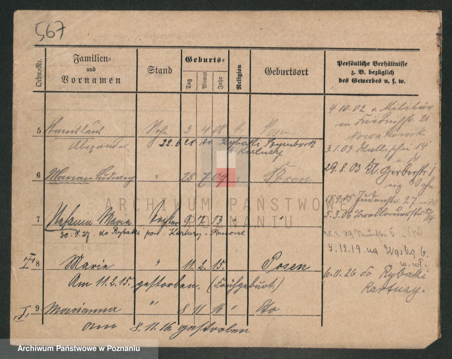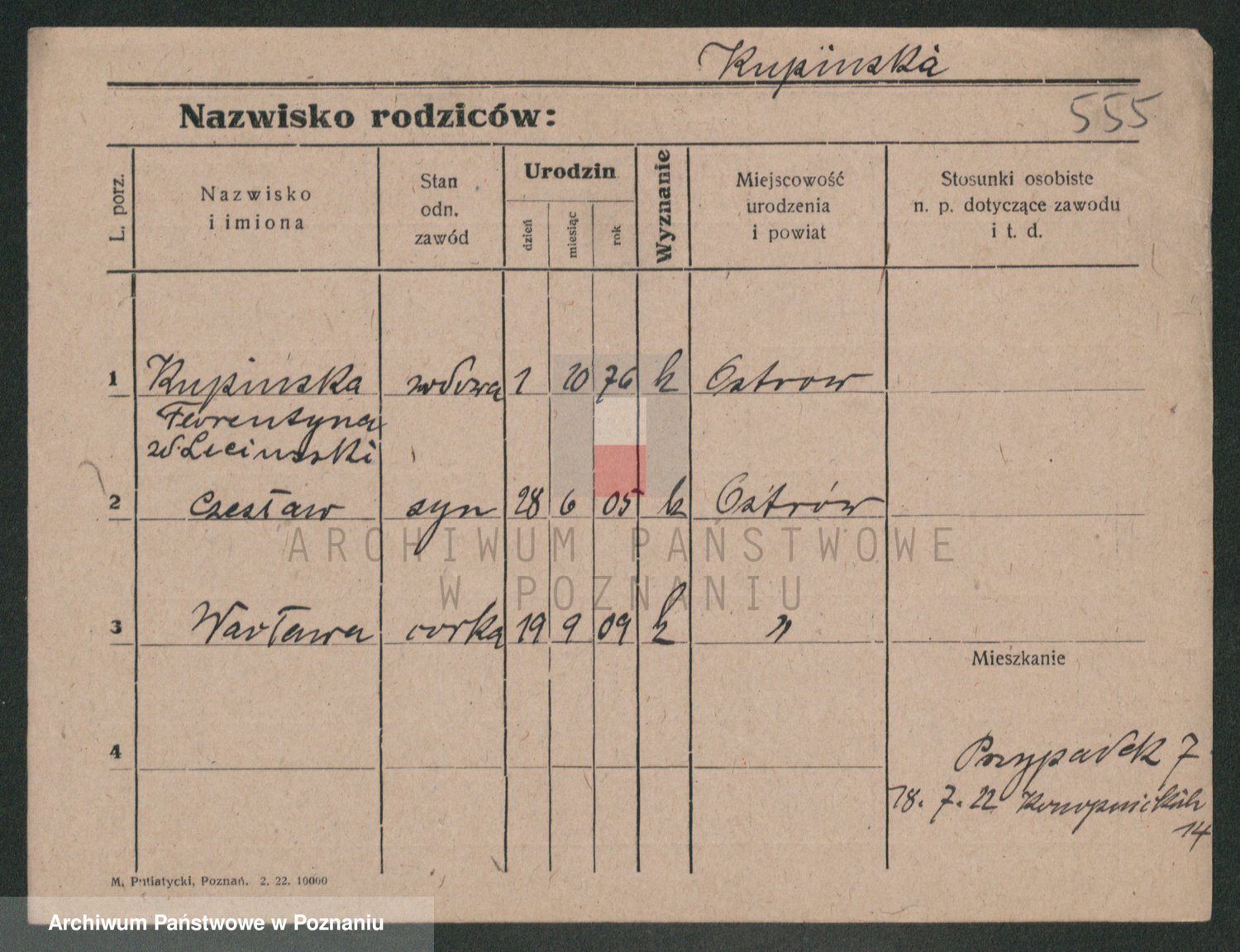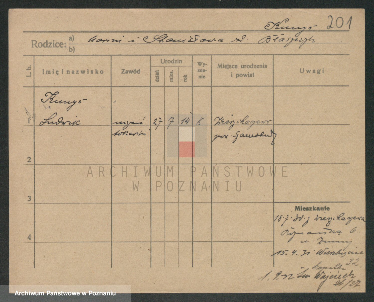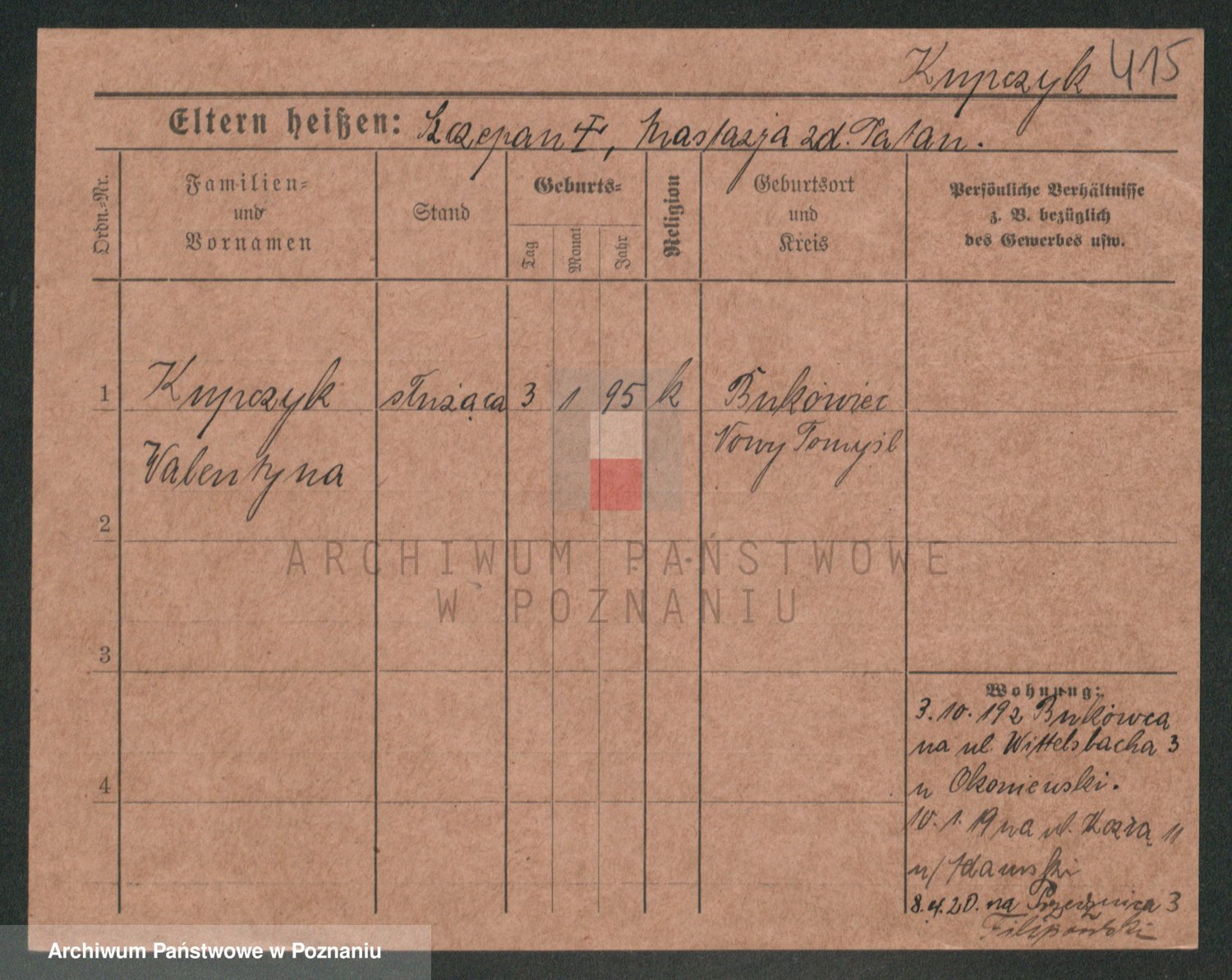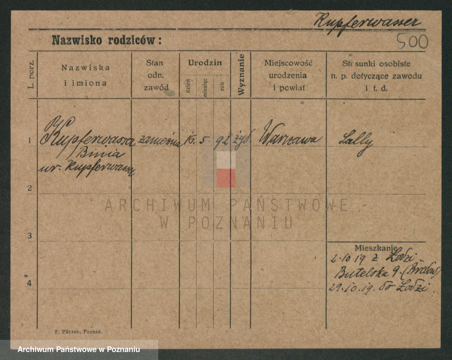 Podgląd karty osobowej dostępny jest po kliknięciu na nazwisko lub ikonkę karty. Można dokonywać powiększenia (ikony na górze) lub przechodzić między kolejnymi skanami (strzałki po bokach).