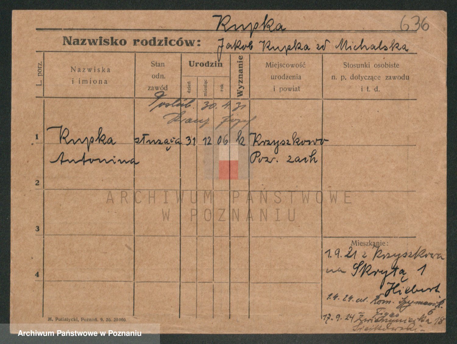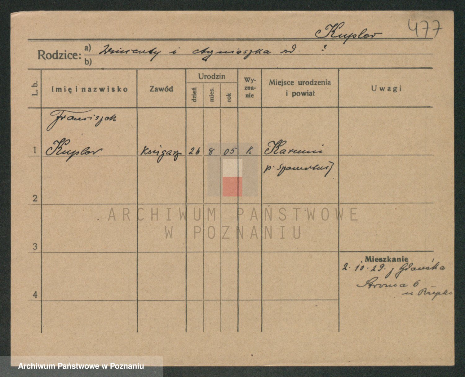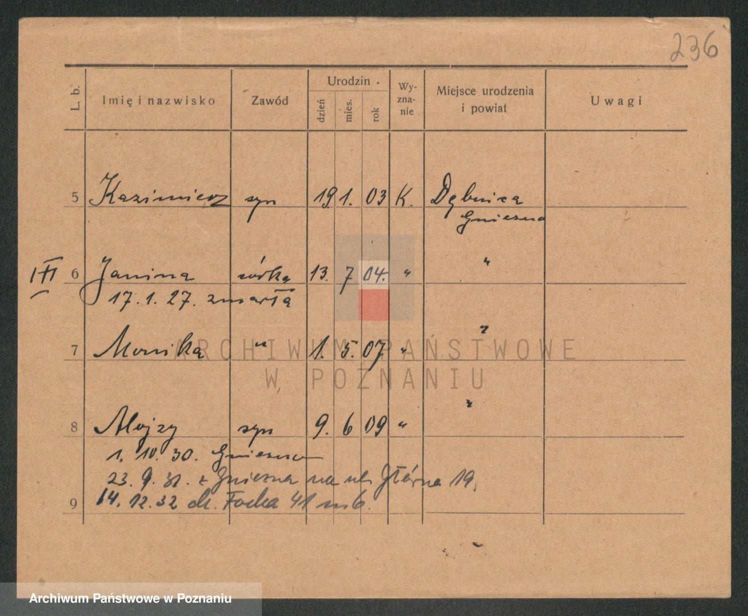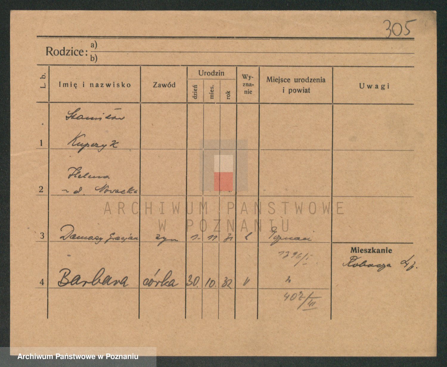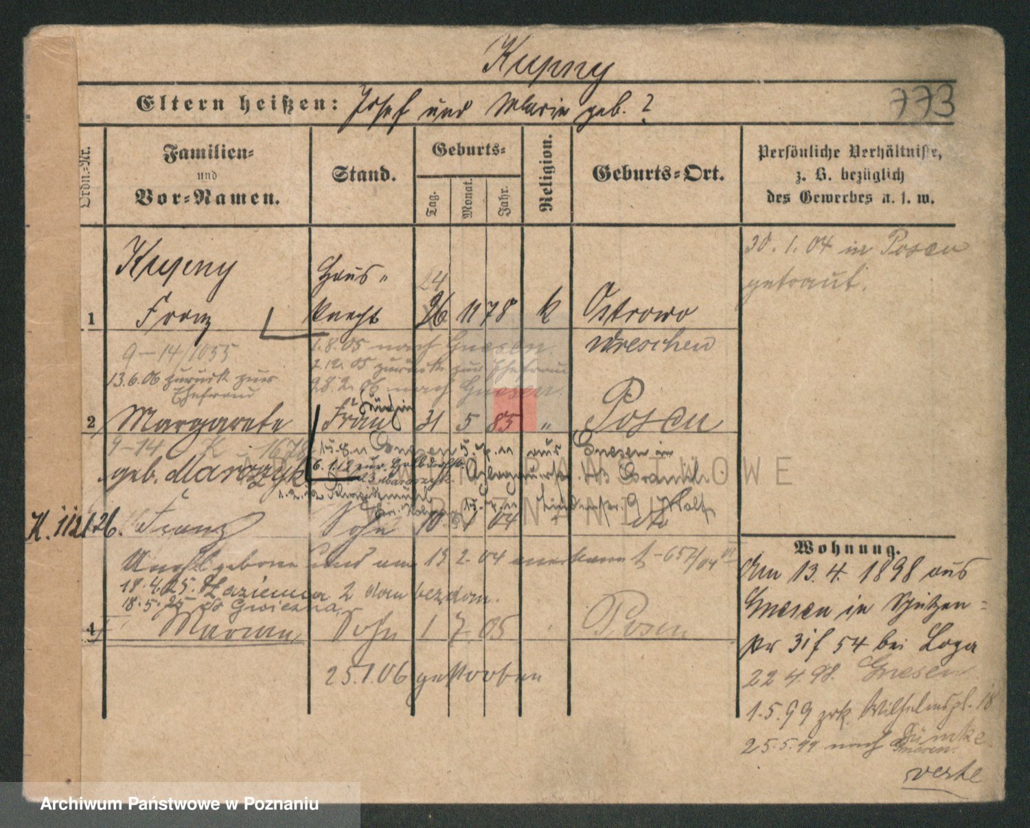 Podgląd karty osobowej dostępny jest po kliknięciu na nazwisko lub ikonkę karty. Można dokonywać powiększenia (ikony na górze) lub przechodzić między kolejnymi skanami (strzałki po bokach).
