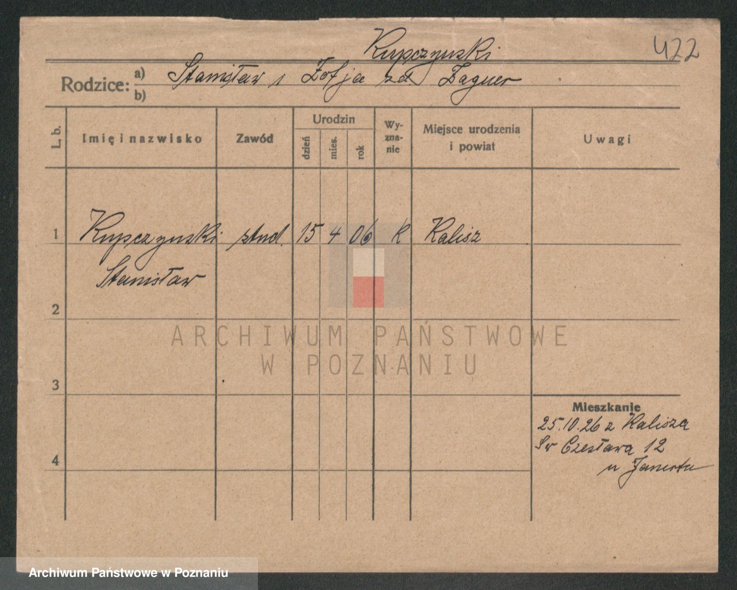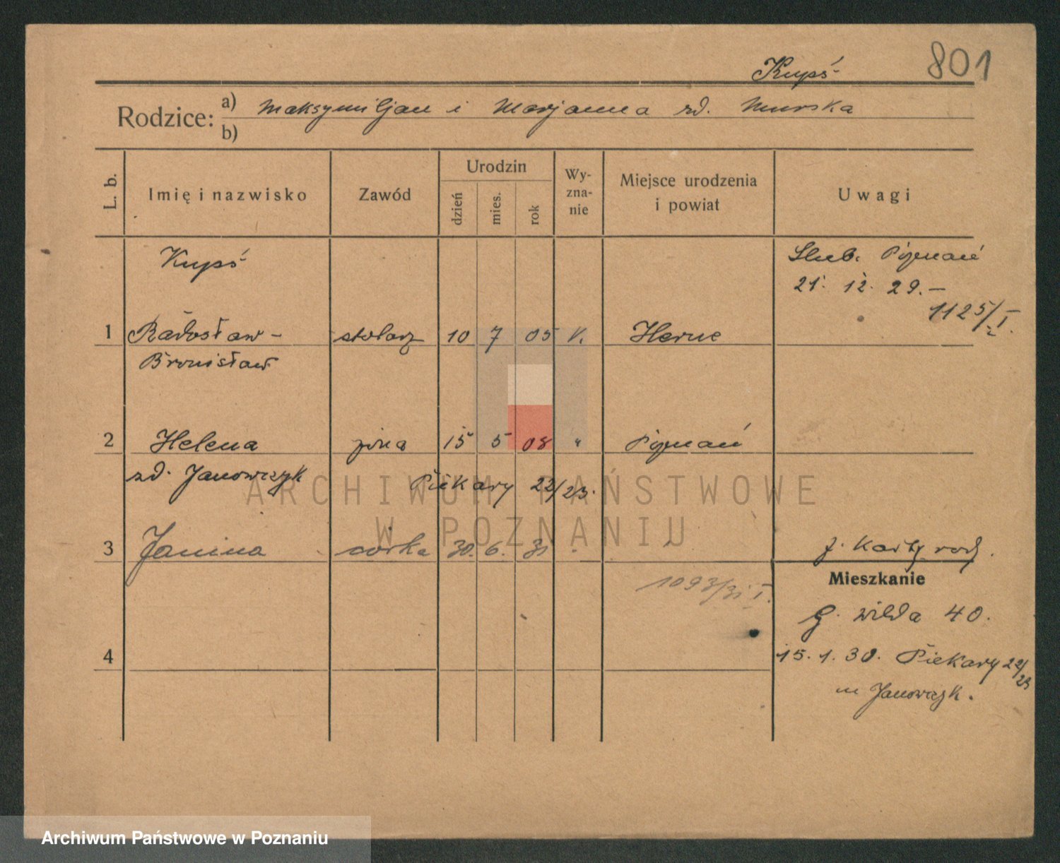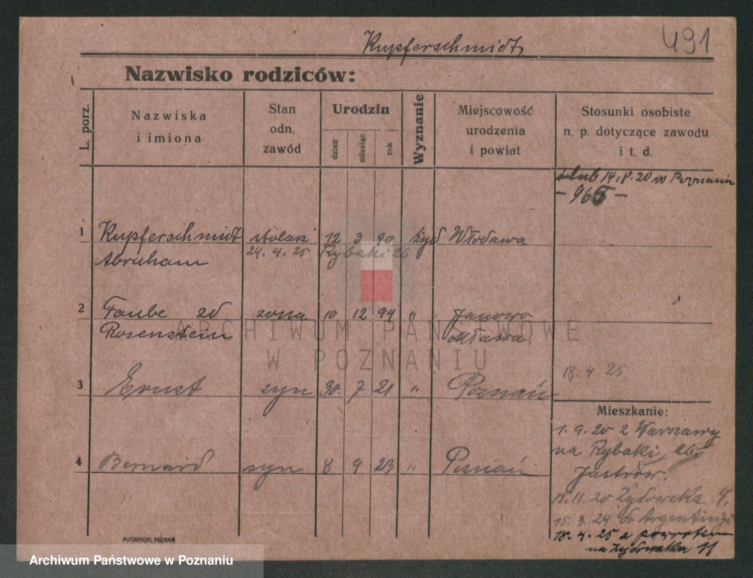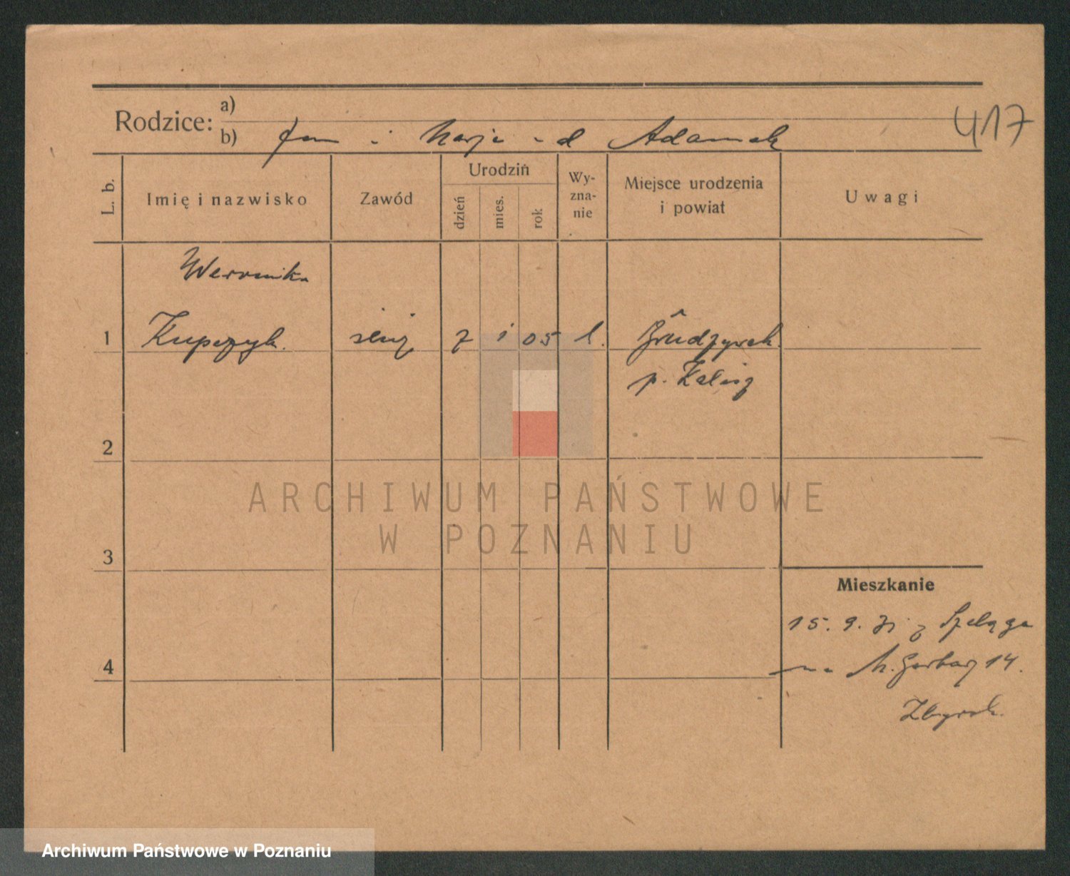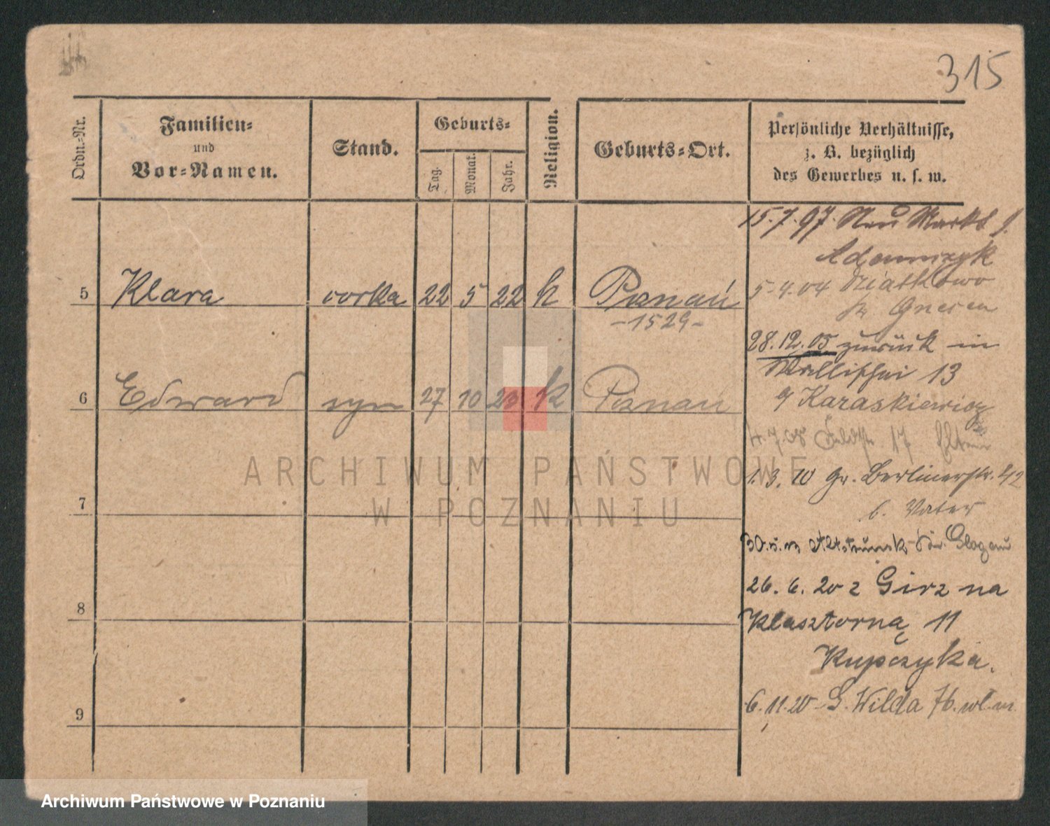Podgląd karty osobowej dostępny jest po kliknięciu na nazwisko lub ikonkę karty. Można dokonywać powiększenia (ikony na górze) lub przechodzić między kolejnymi skanami (strzałki po bokach).