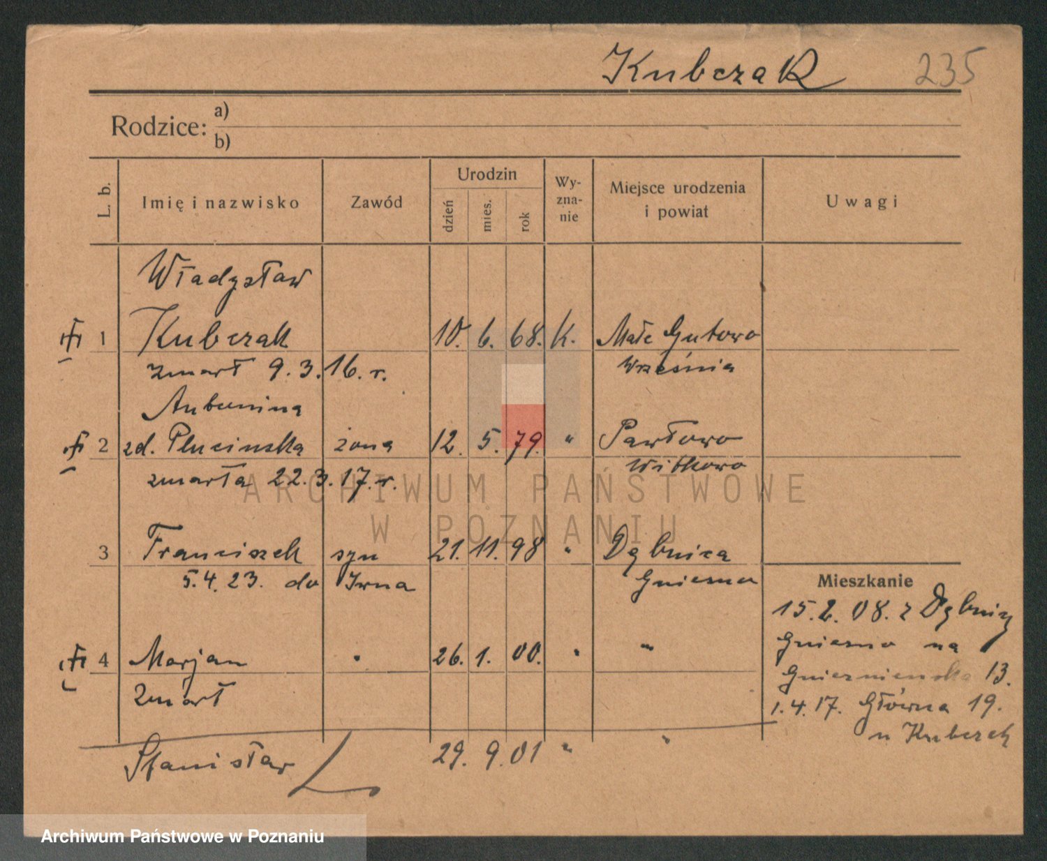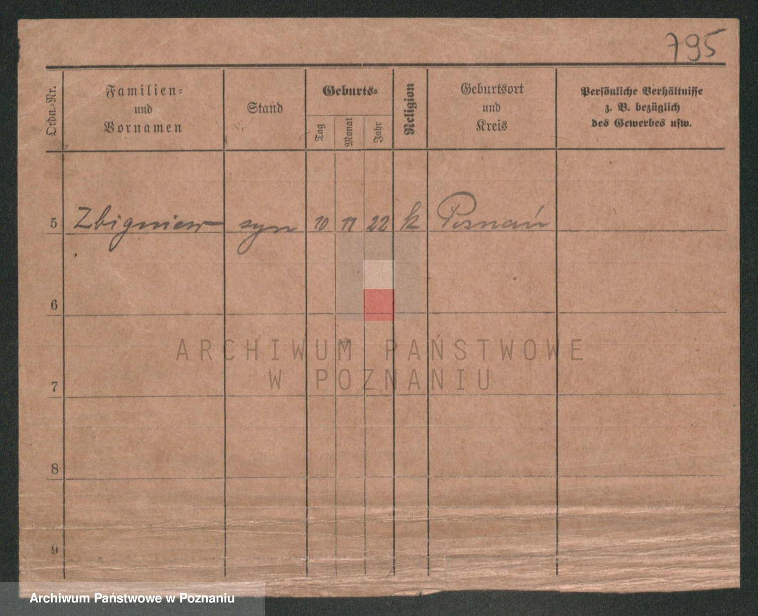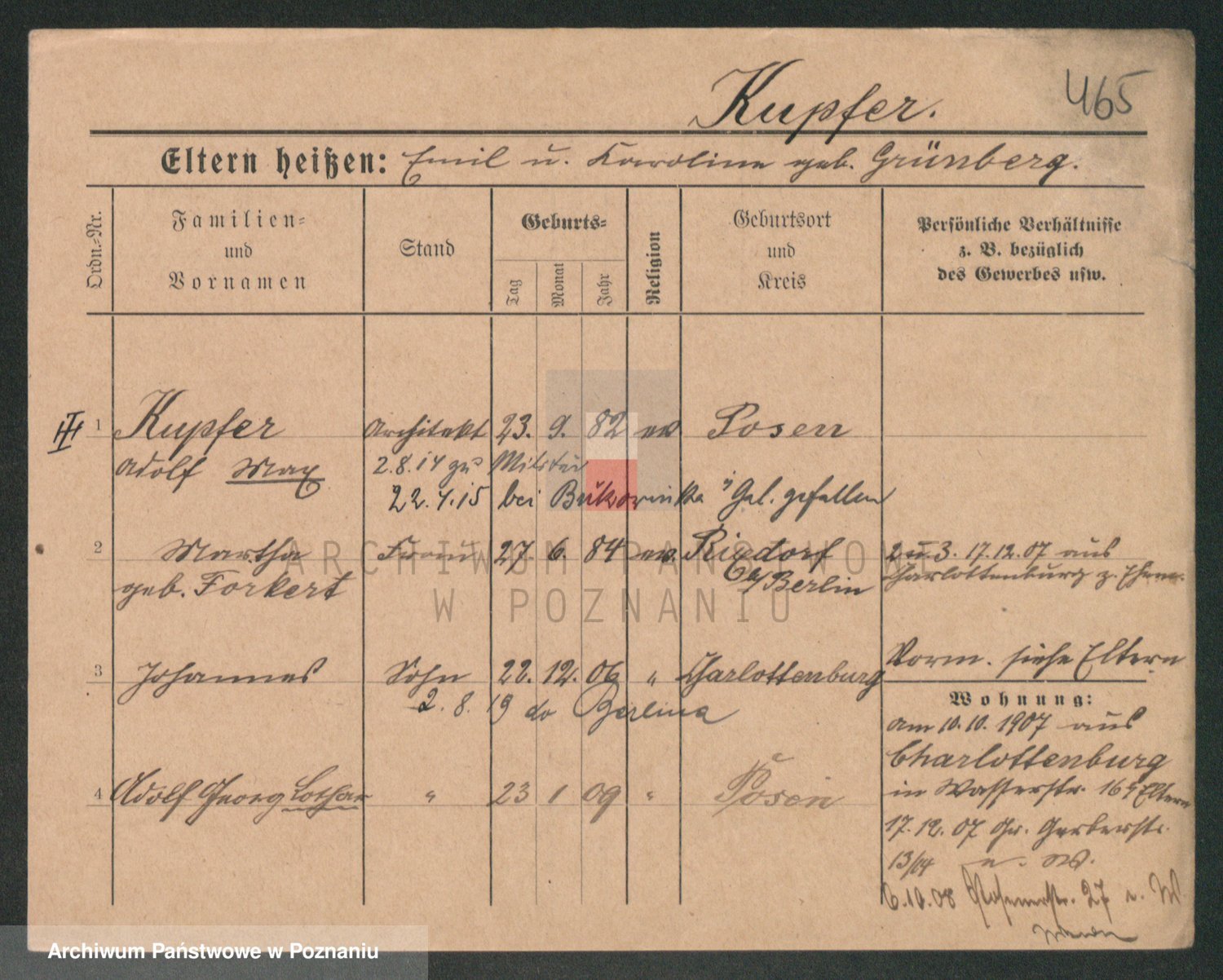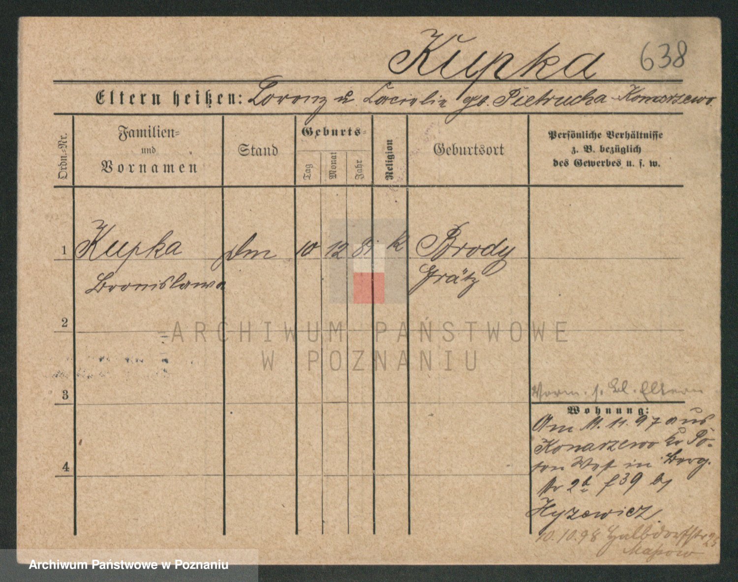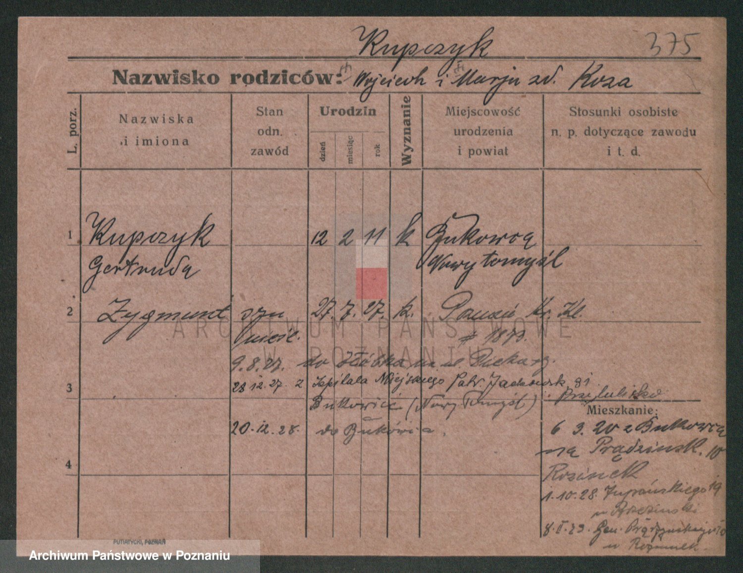Podgląd karty osobowej dostępny jest po kliknięciu na nazwisko lub ikonkę karty. Można dokonywać powiększenia (ikony na górze) lub przechodzić między kolejnymi skanami (strzałki po bokach).
