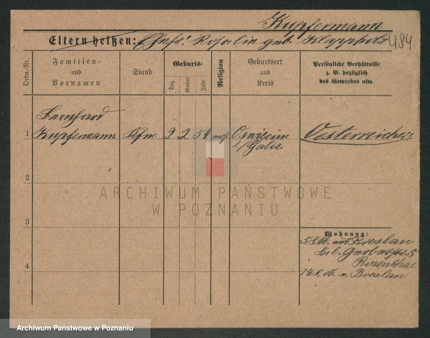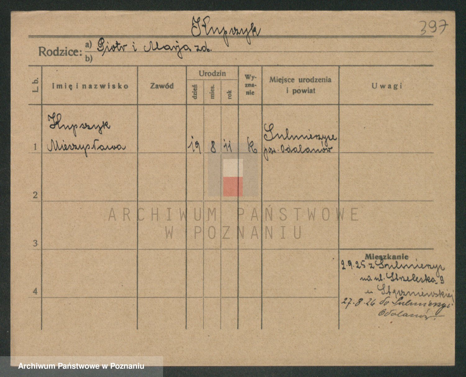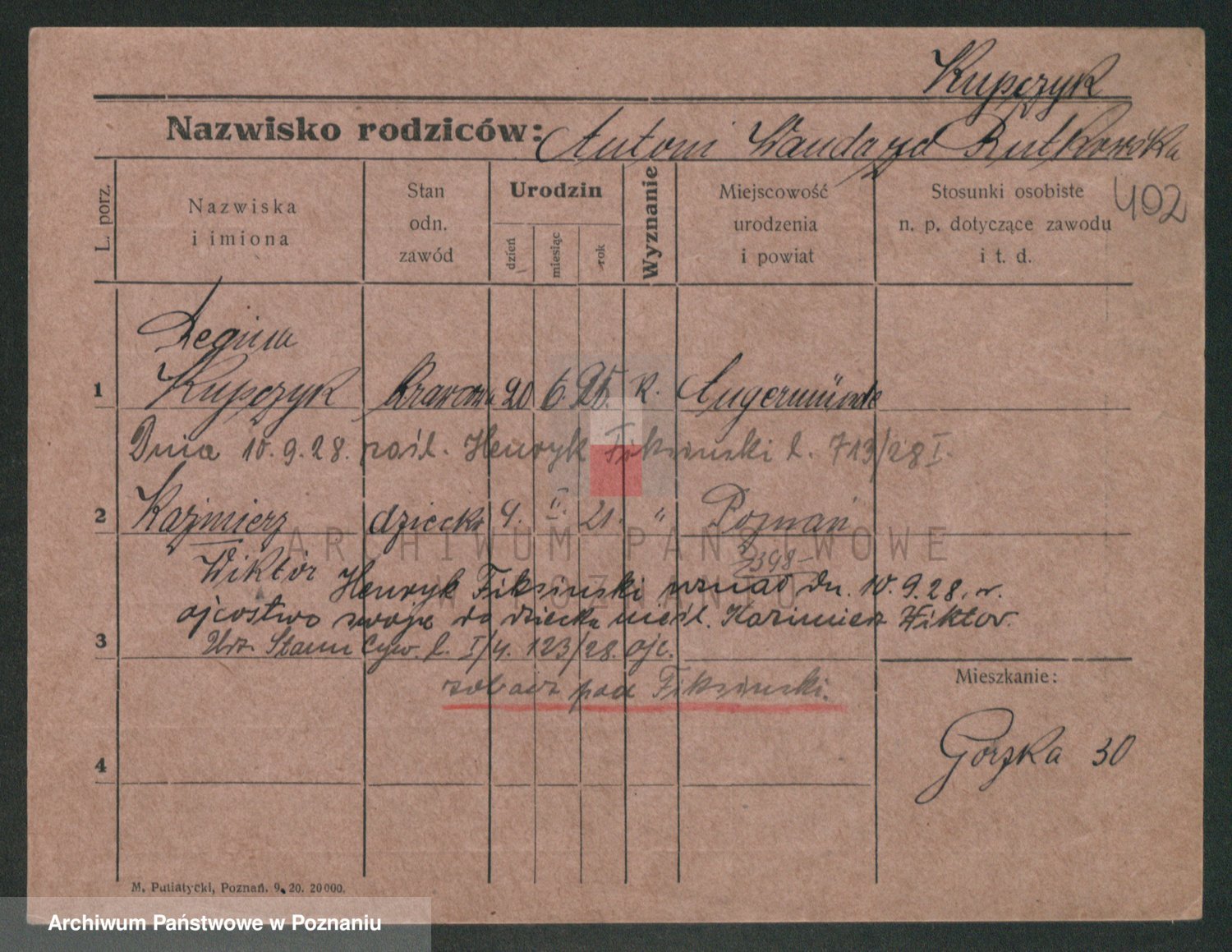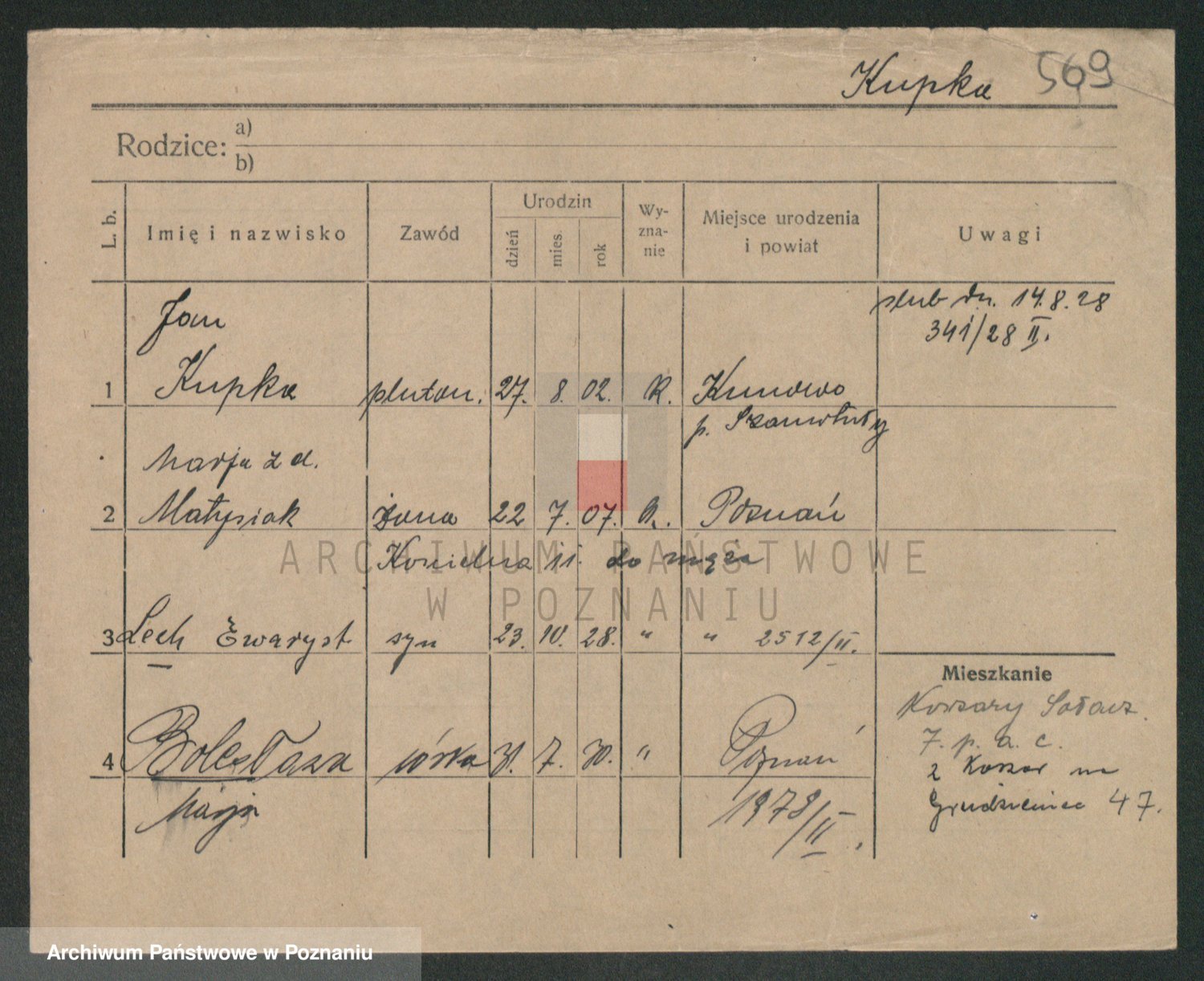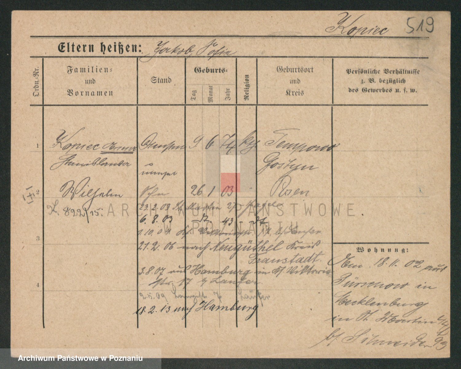 Podgląd karty osobowej dostępny jest po kliknięciu na nazwisko lub ikonkę karty. Można dokonywać powiększenia (ikony na górze) lub przechodzić między kolejnymi skanami (strzałki po bokach).