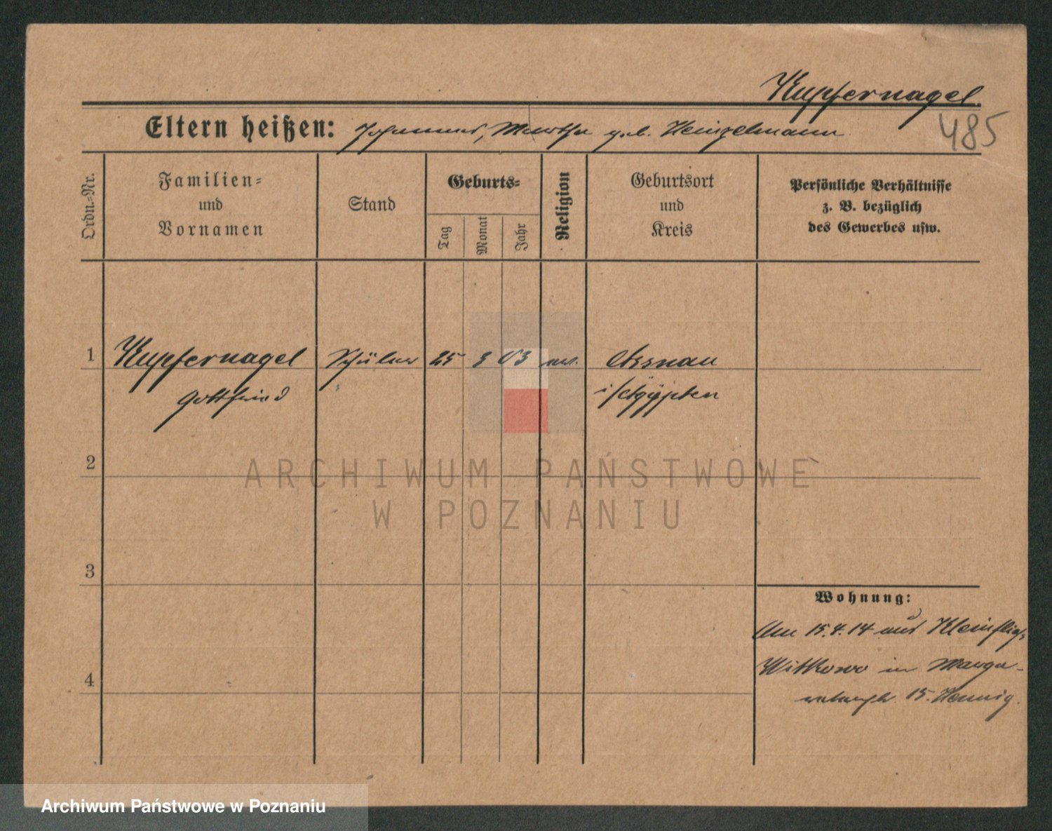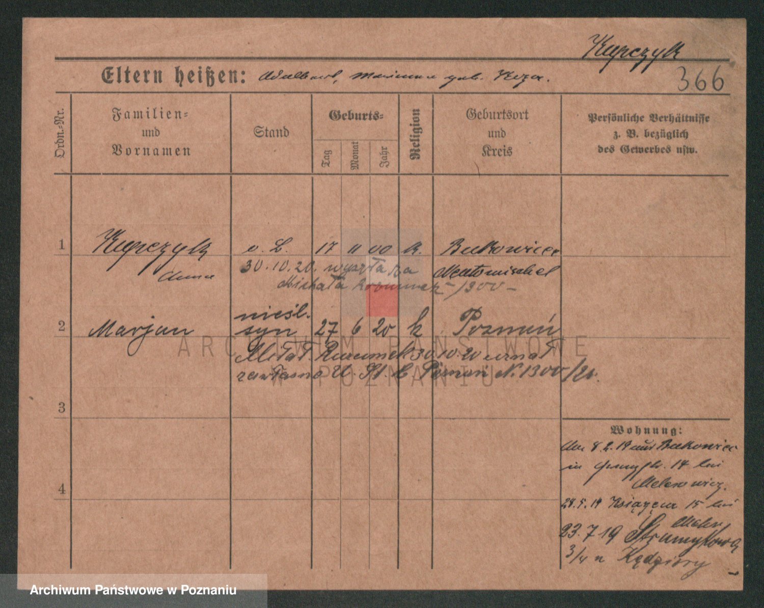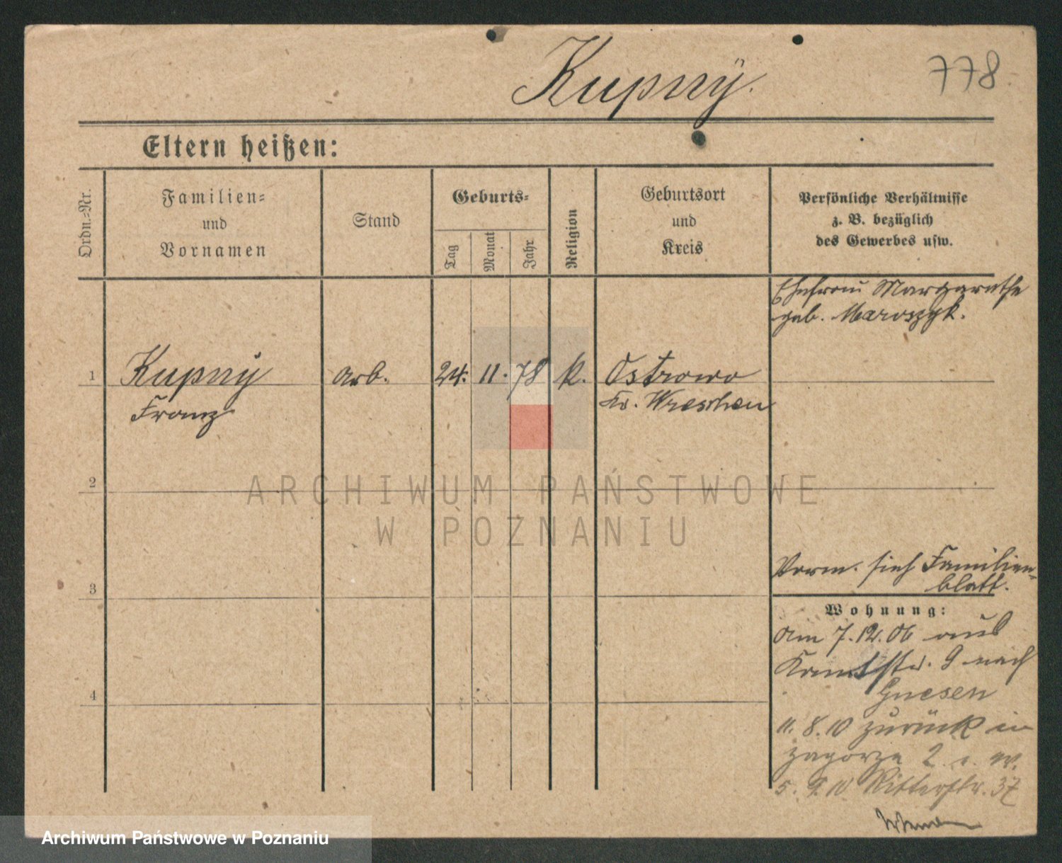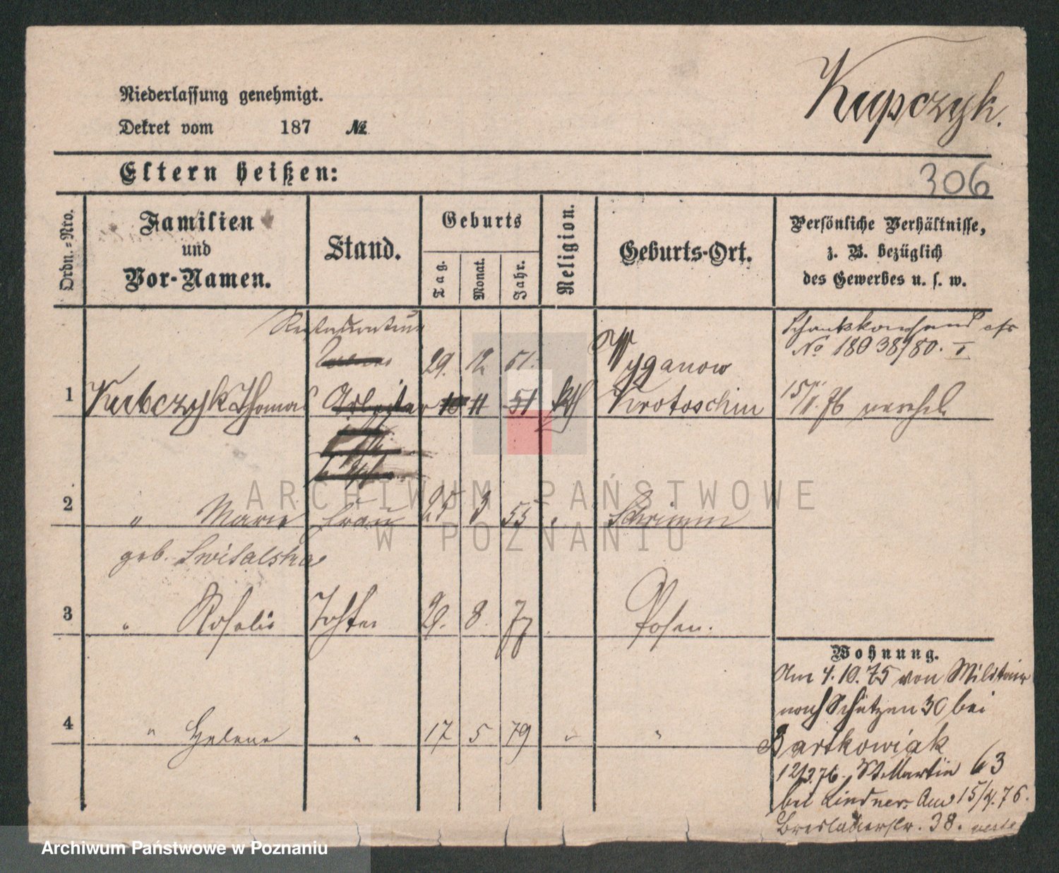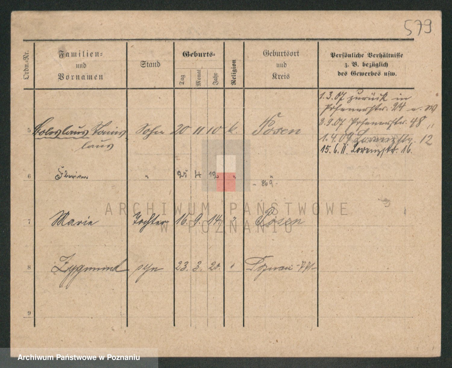 Podgląd karty osobowej dostępny jest po kliknięciu na nazwisko lub ikonkę karty. Można dokonywać powiększenia (ikony na górze) lub przechodzić między kolejnymi skanami (strzałki po bokach).