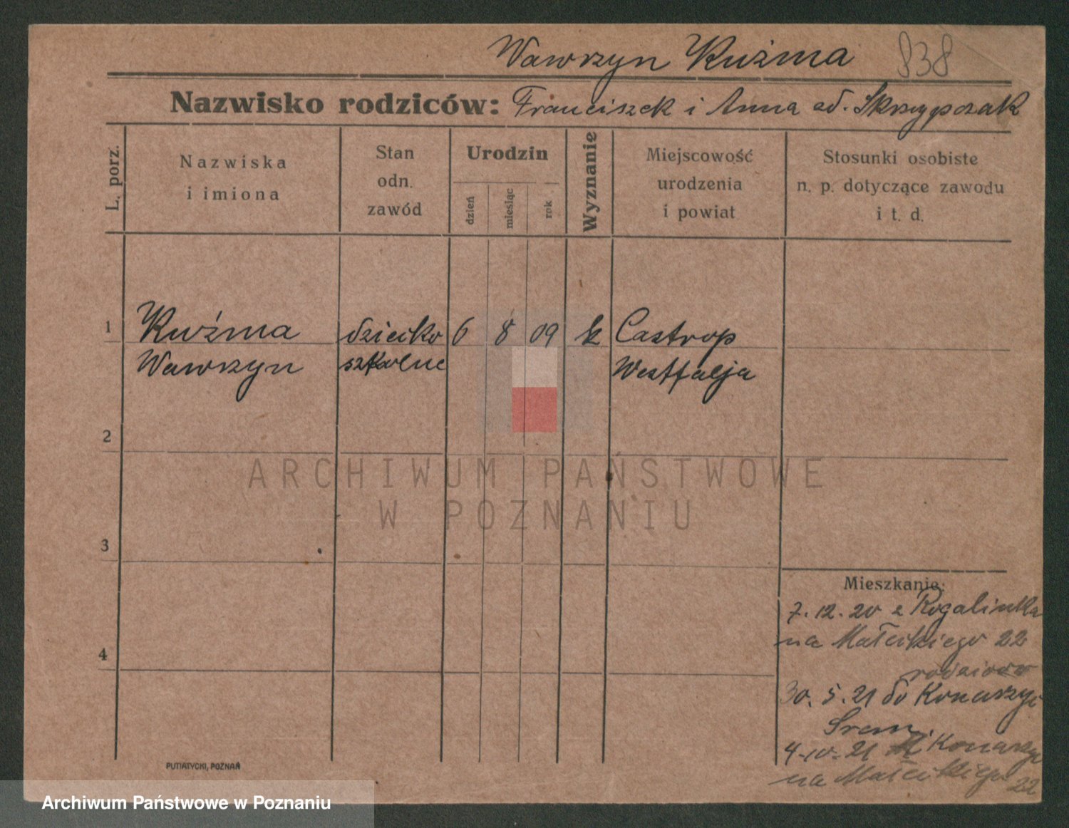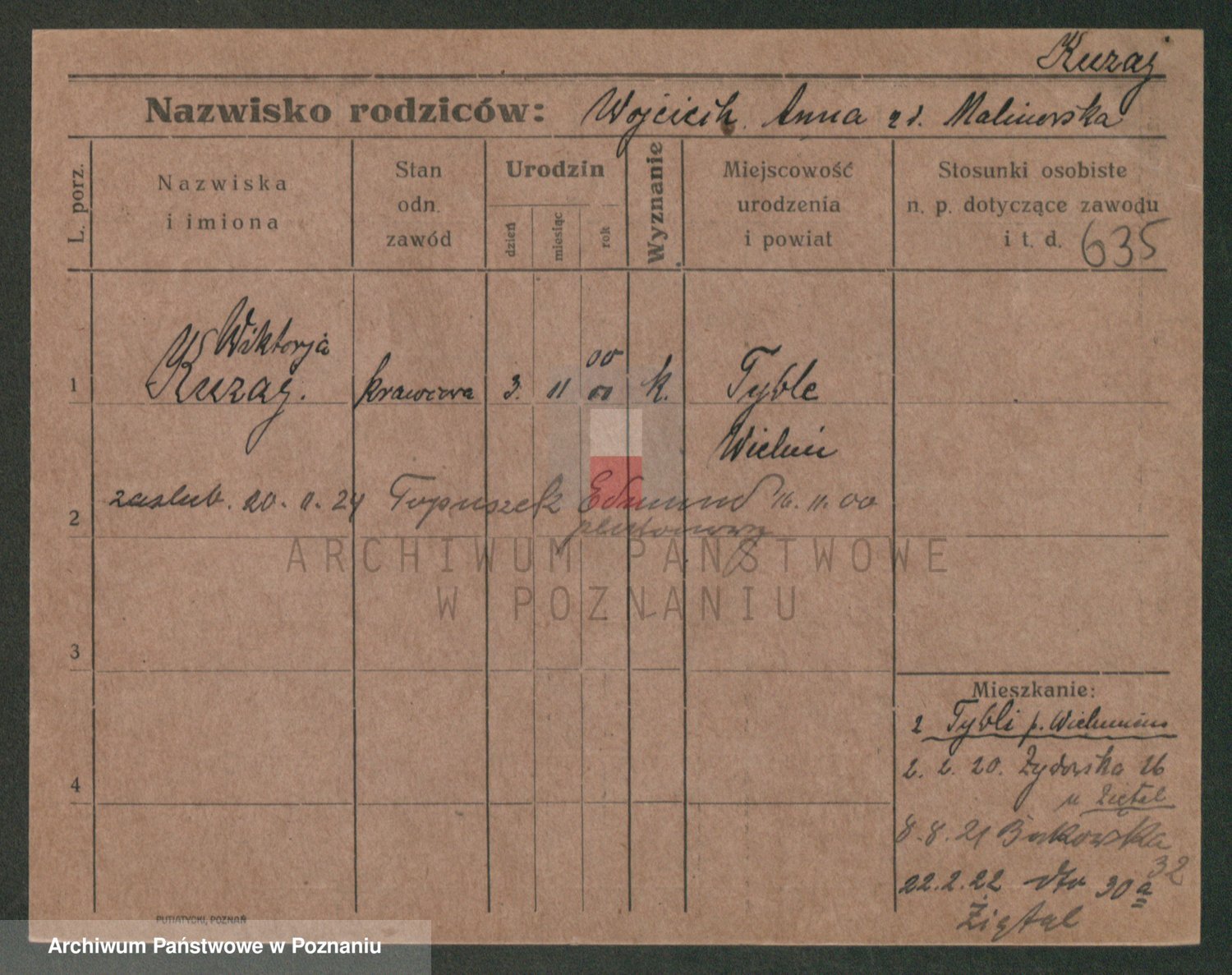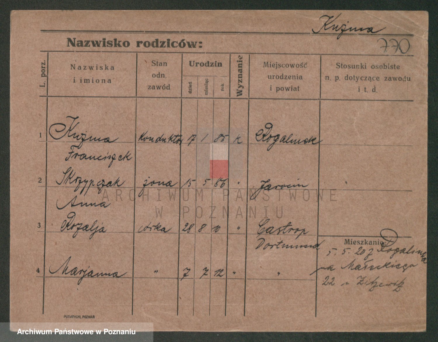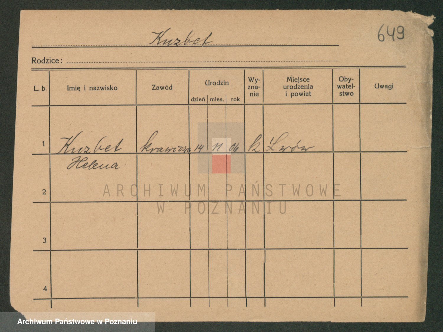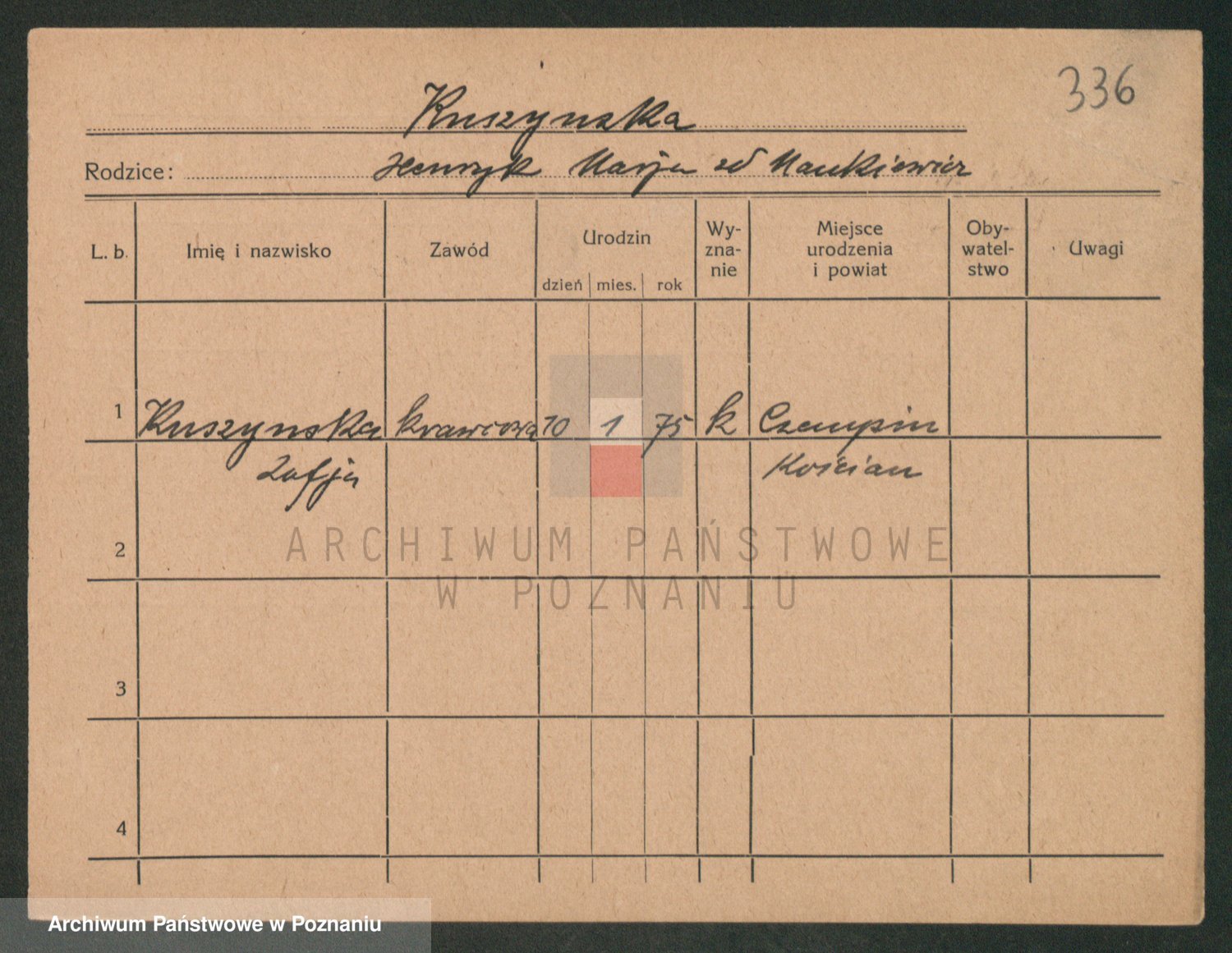Podgląd karty osobowej dostępny jest po kliknięciu na nazwisko lub ikonkę karty. Można dokonywać powiększenia (ikony na górze) lub przechodzić między kolejnymi skanami (strzałki po bokach).