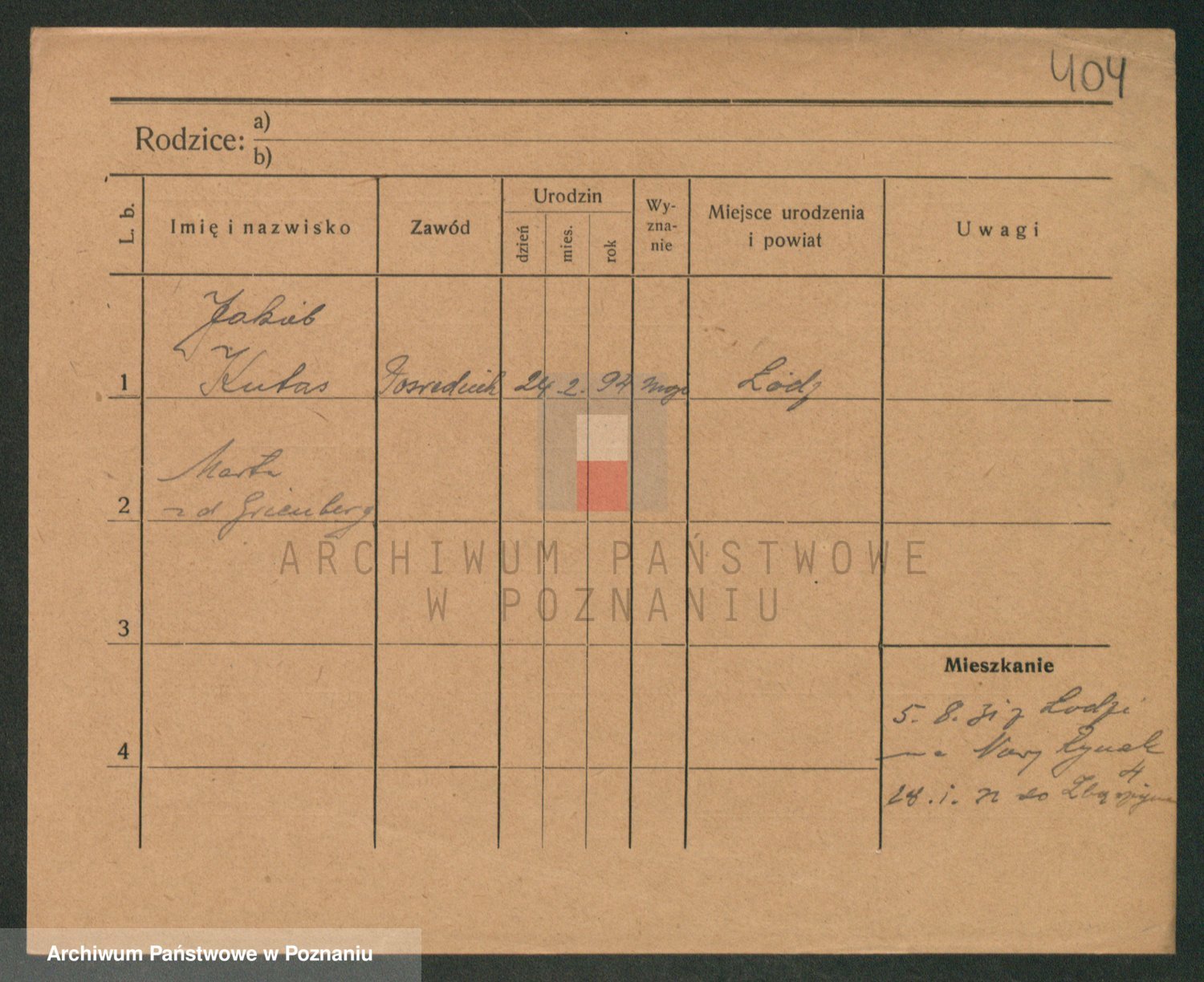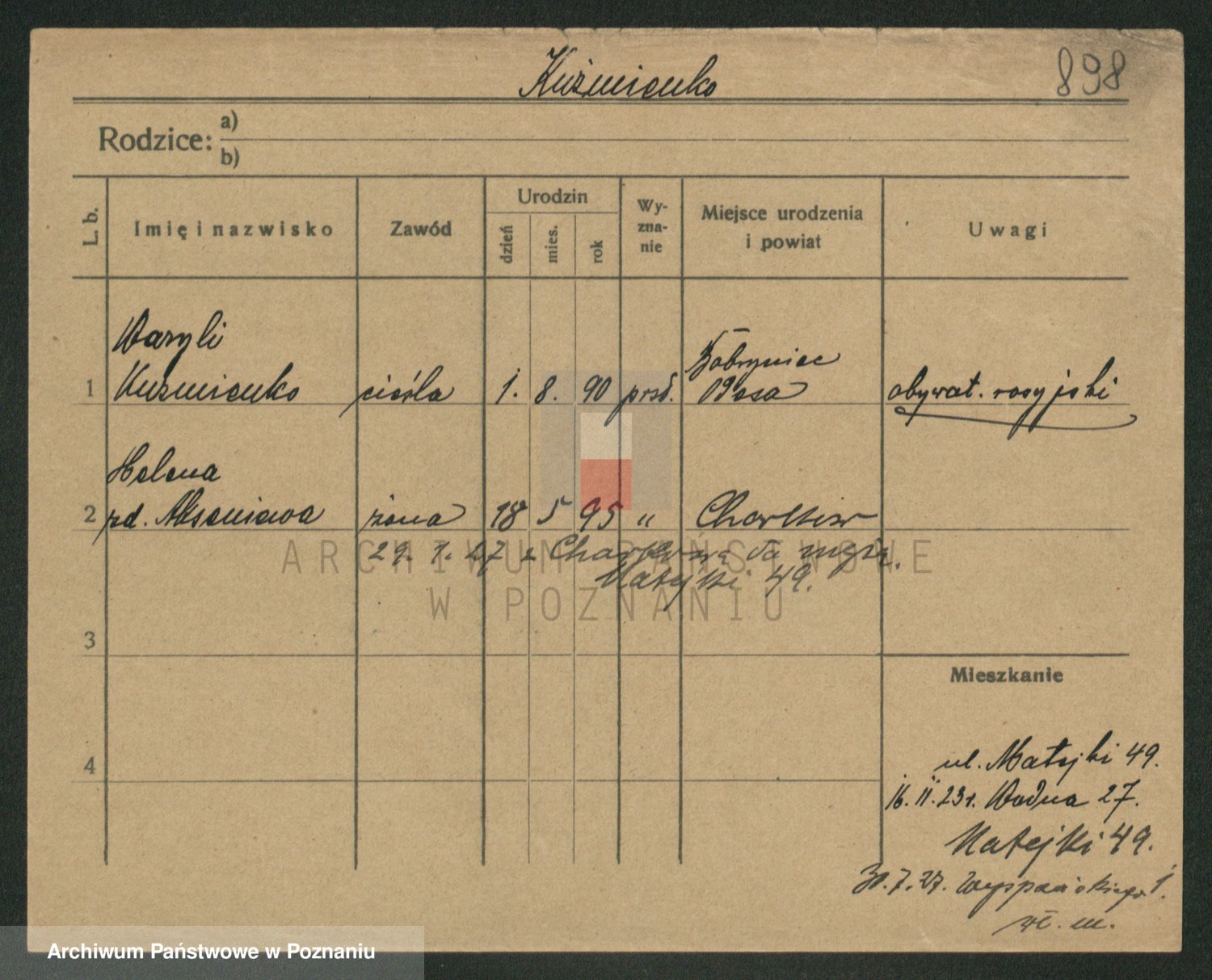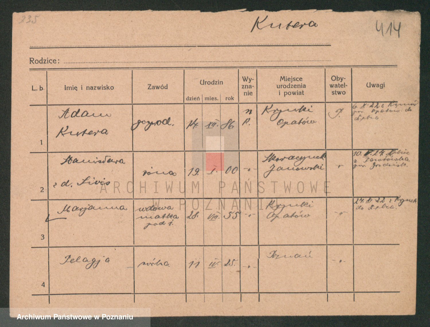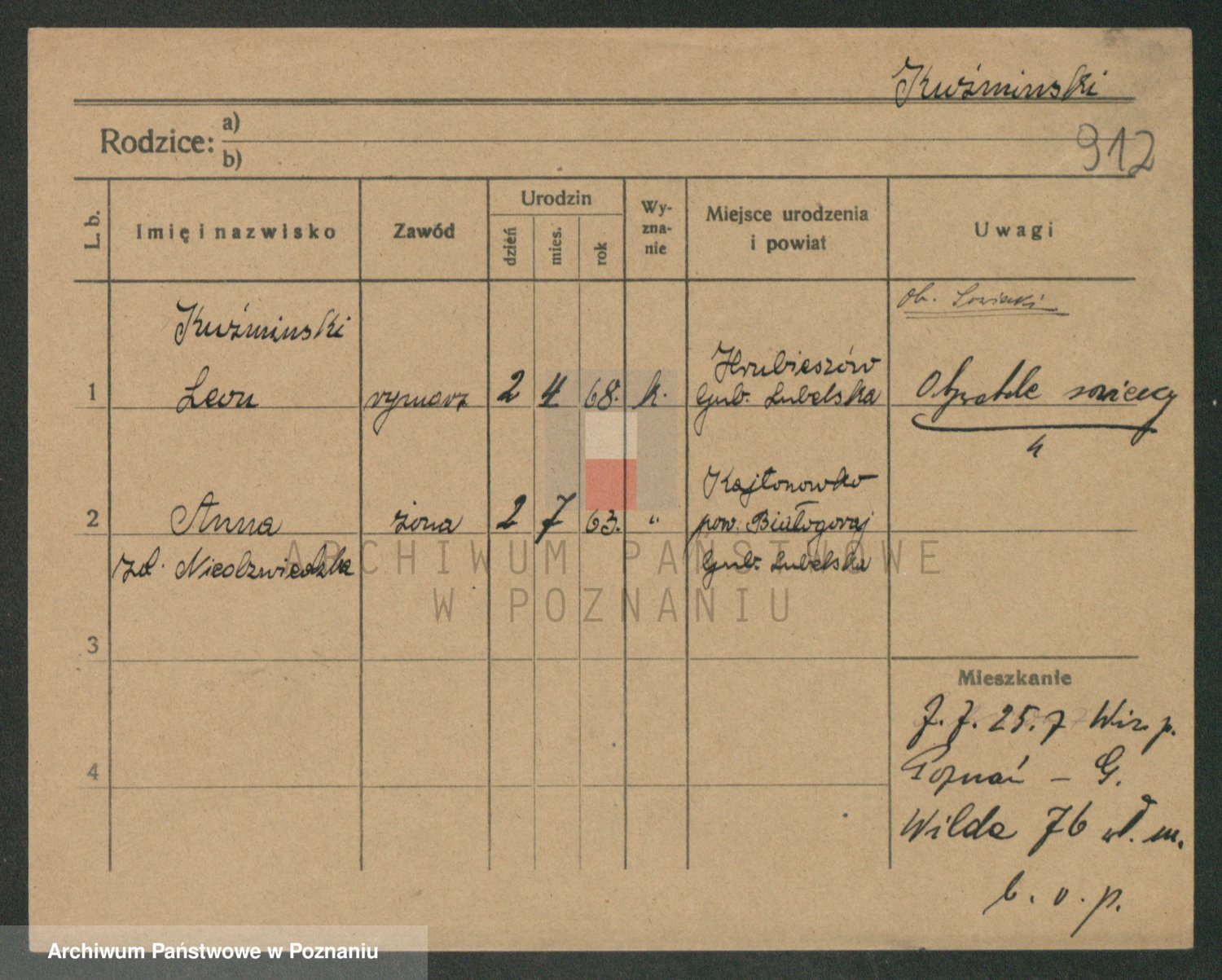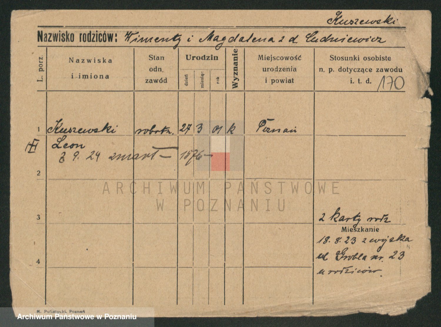 Podgląd karty osobowej dostępny jest po kliknięciu na nazwisko lub ikonkę karty. Można dokonywać powiększenia (ikony na górze) lub przechodzić między kolejnymi skanami (strzałki po bokach).
