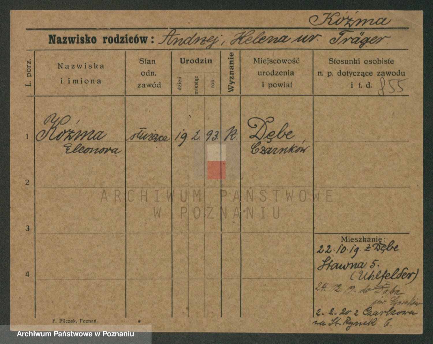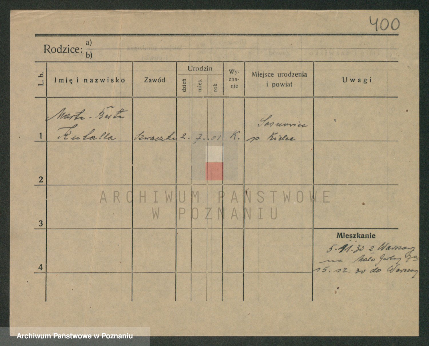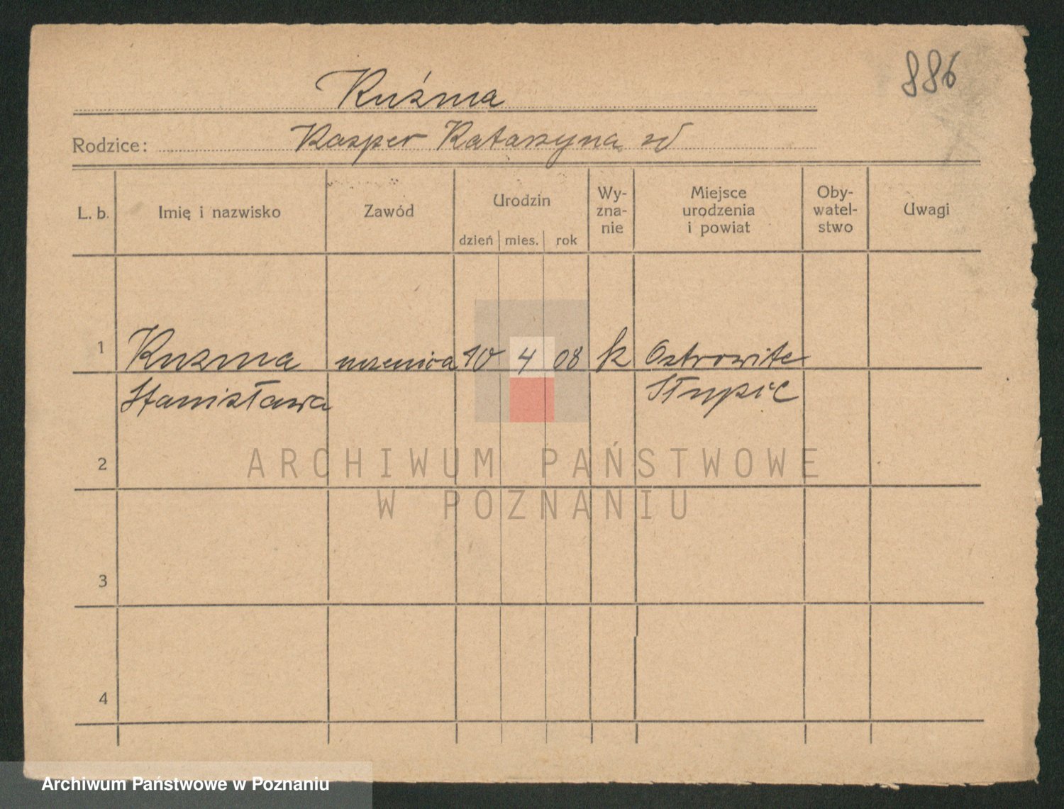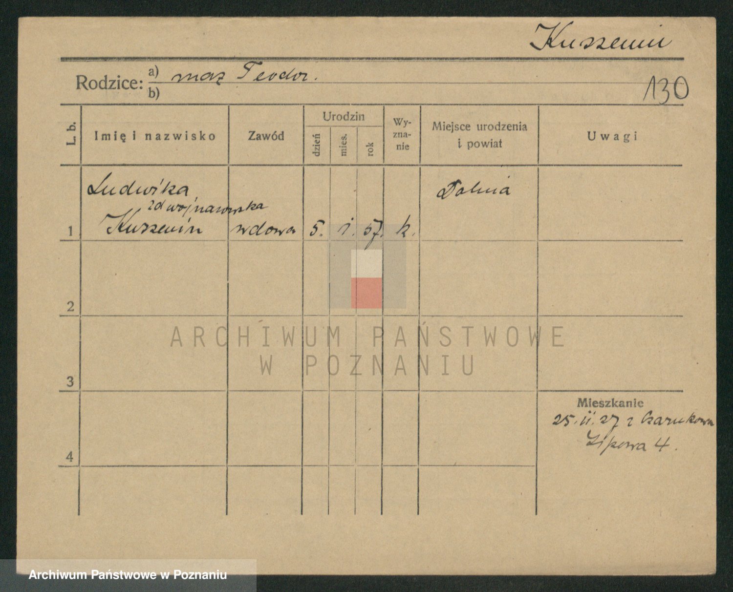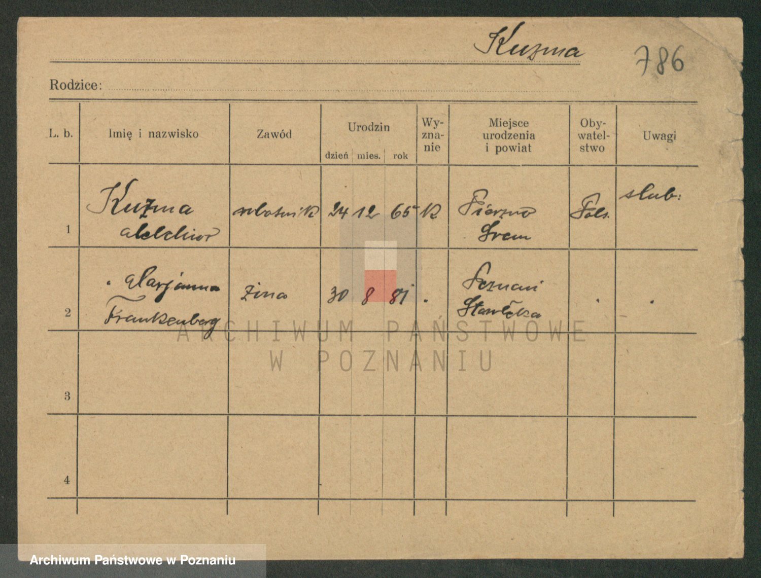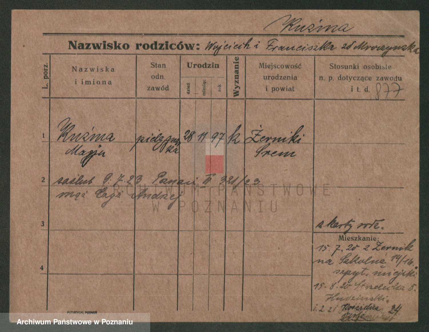 Podgląd karty osobowej dostępny jest po kliknięciu na nazwisko lub ikonkę karty. Można dokonywać powiększenia (ikony na górze) lub przechodzić między kolejnymi skanami (strzałki po bokach).