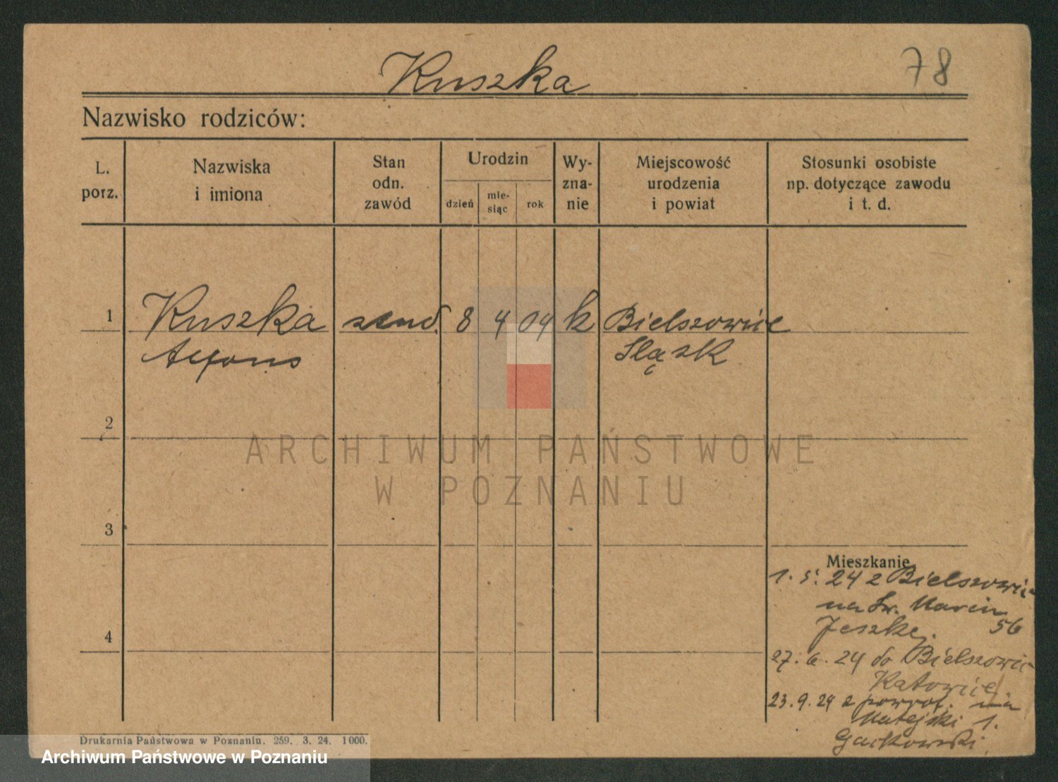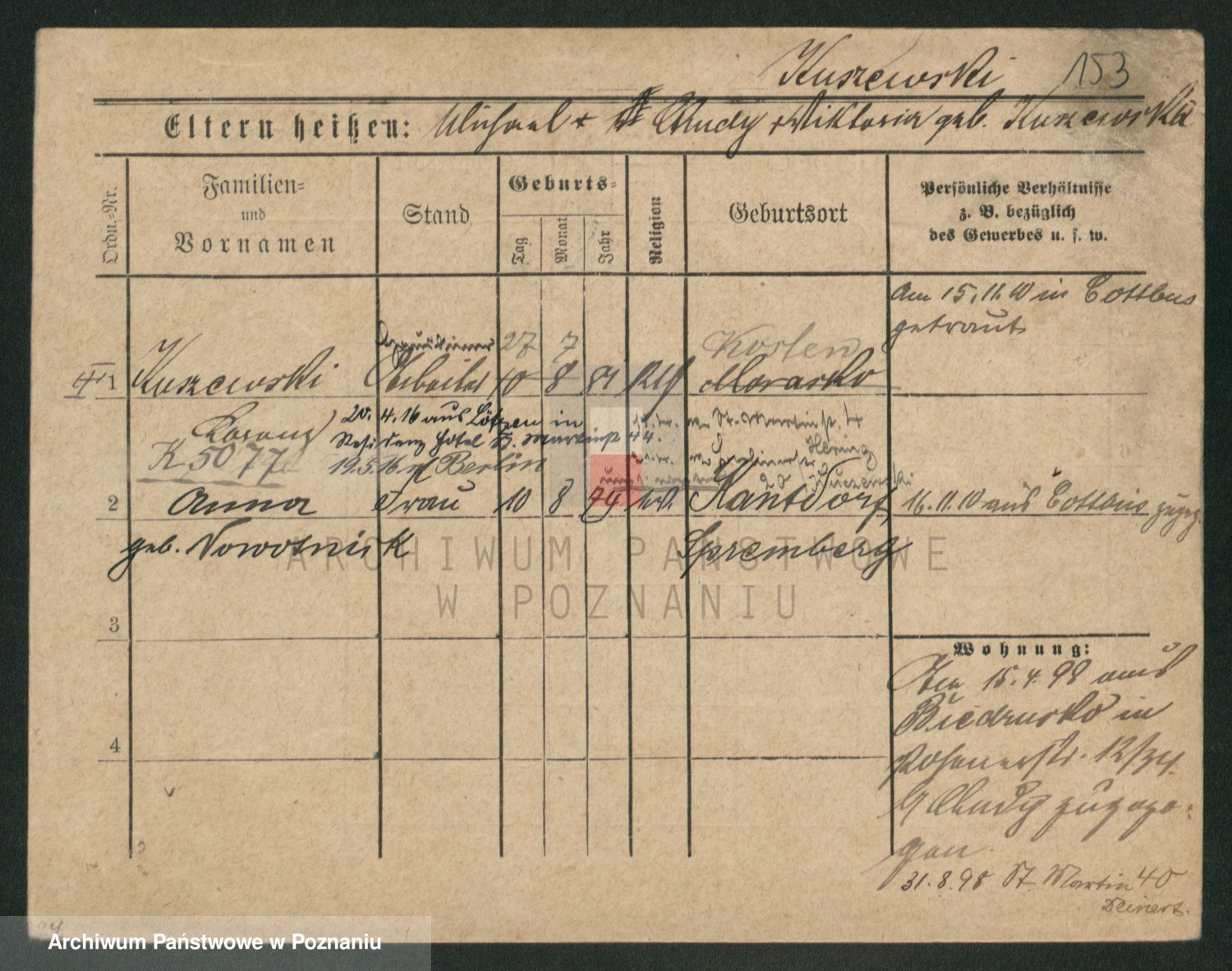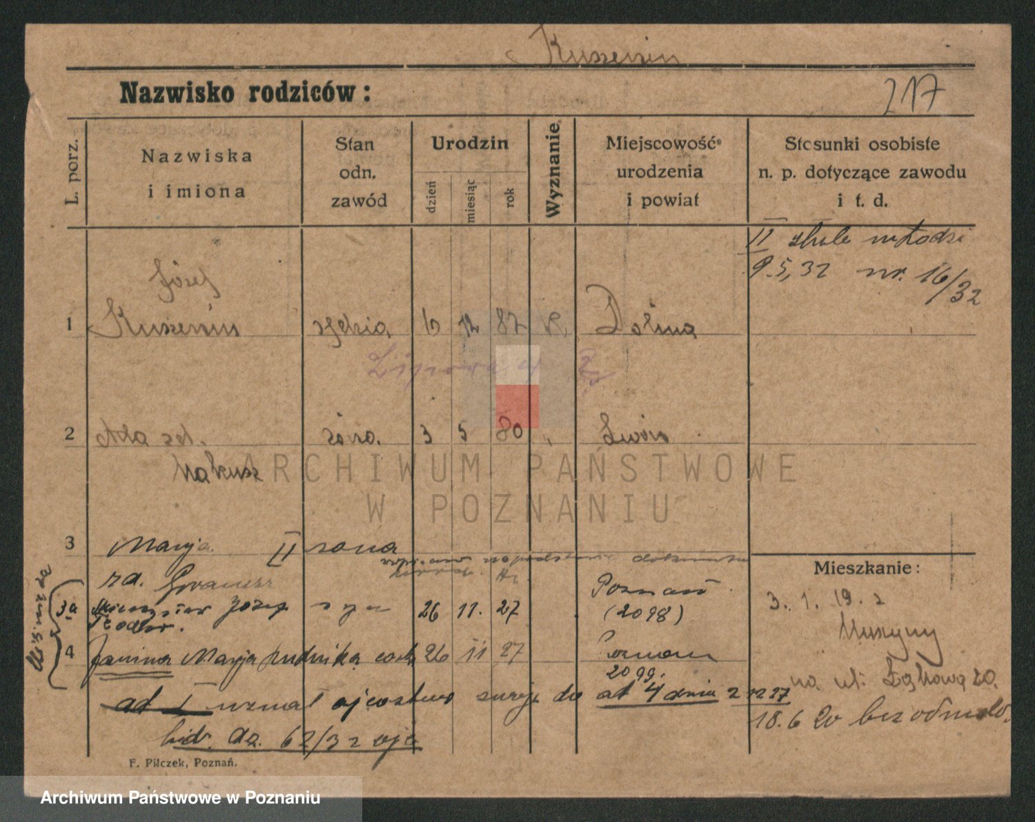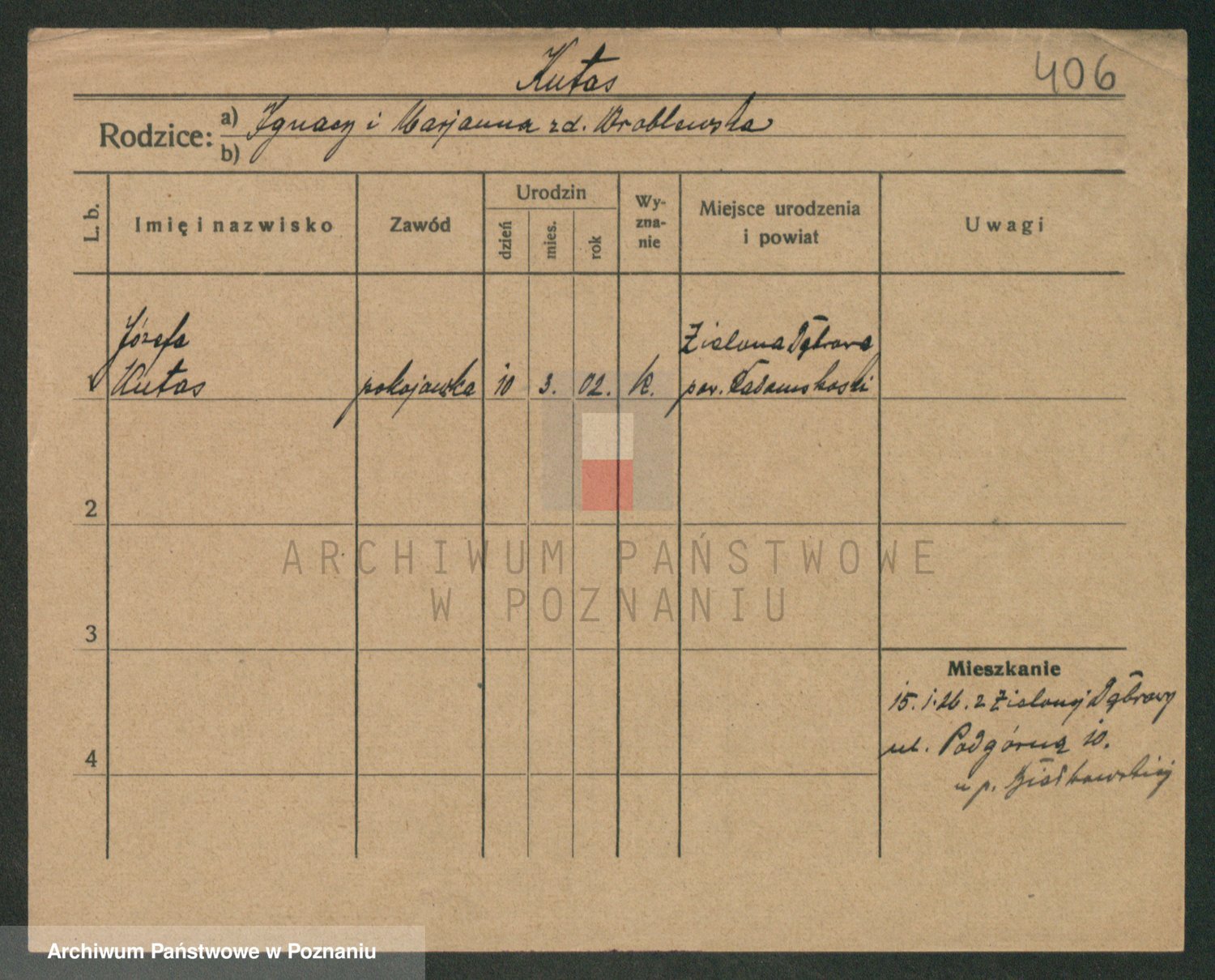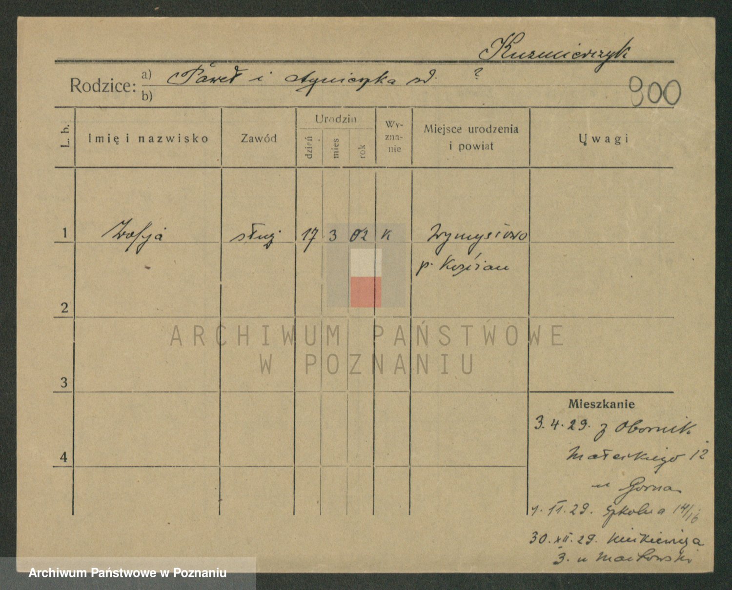 Podgląd karty osobowej dostępny jest po kliknięciu na nazwisko lub ikonkę karty. Można dokonywać powiększenia (ikony na górze) lub przechodzić między kolejnymi skanami (strzałki po bokach).