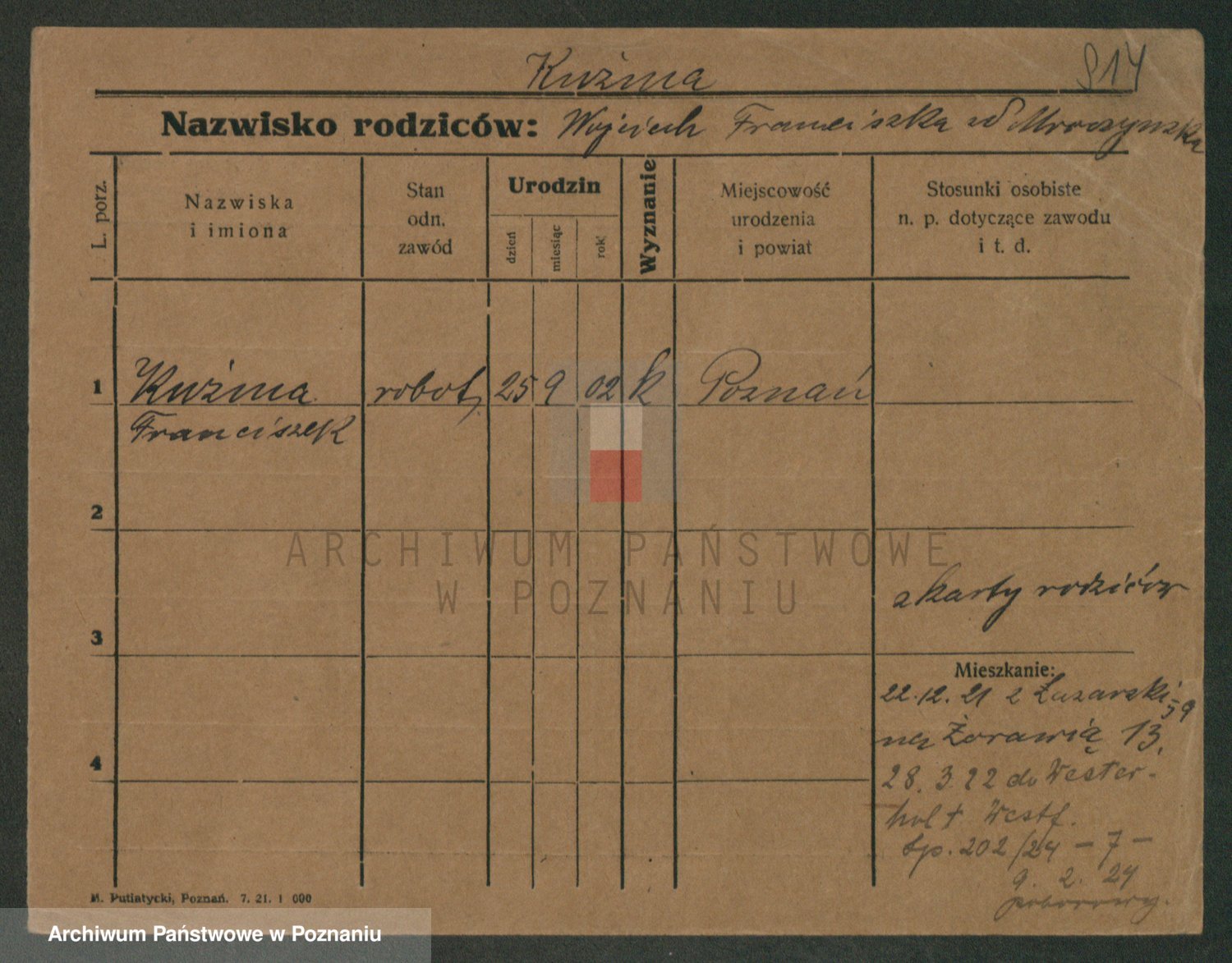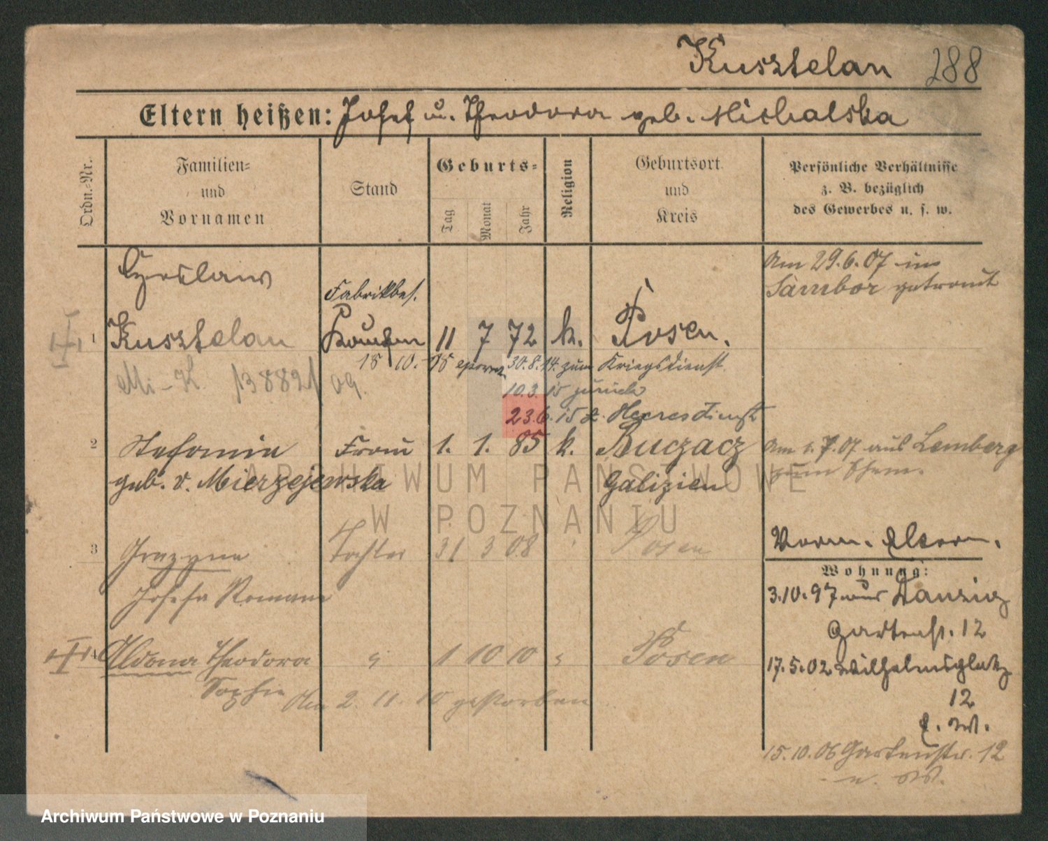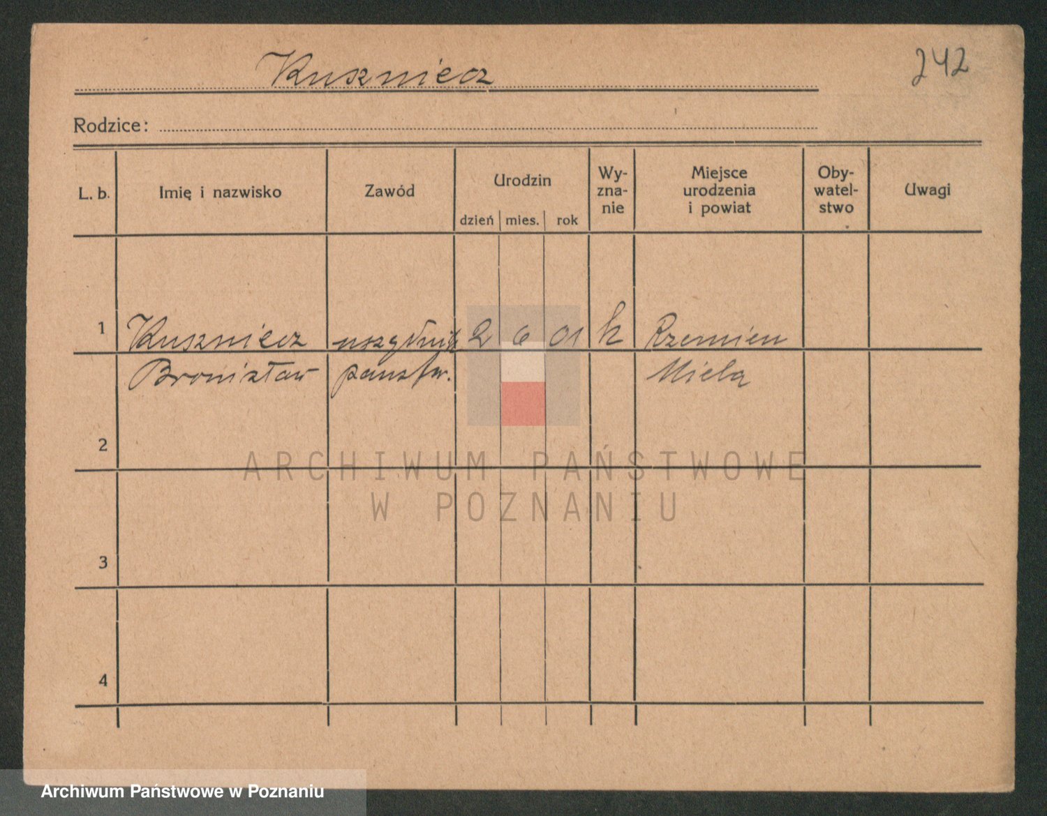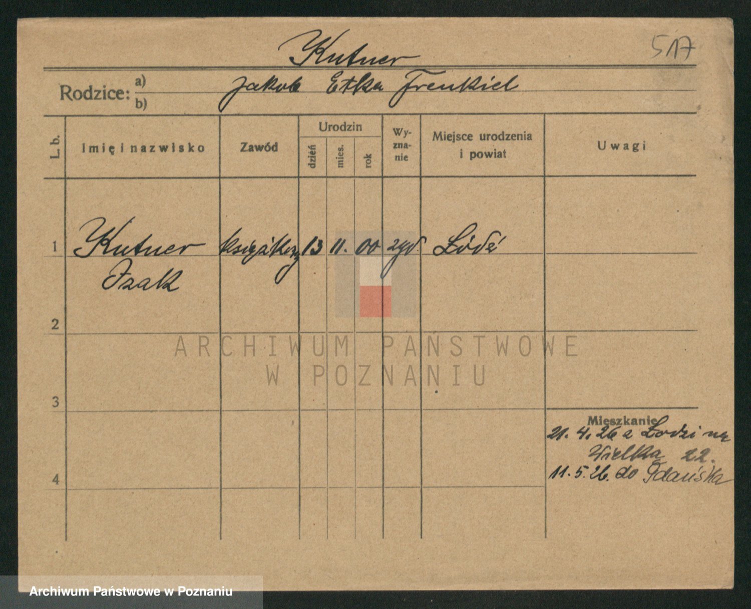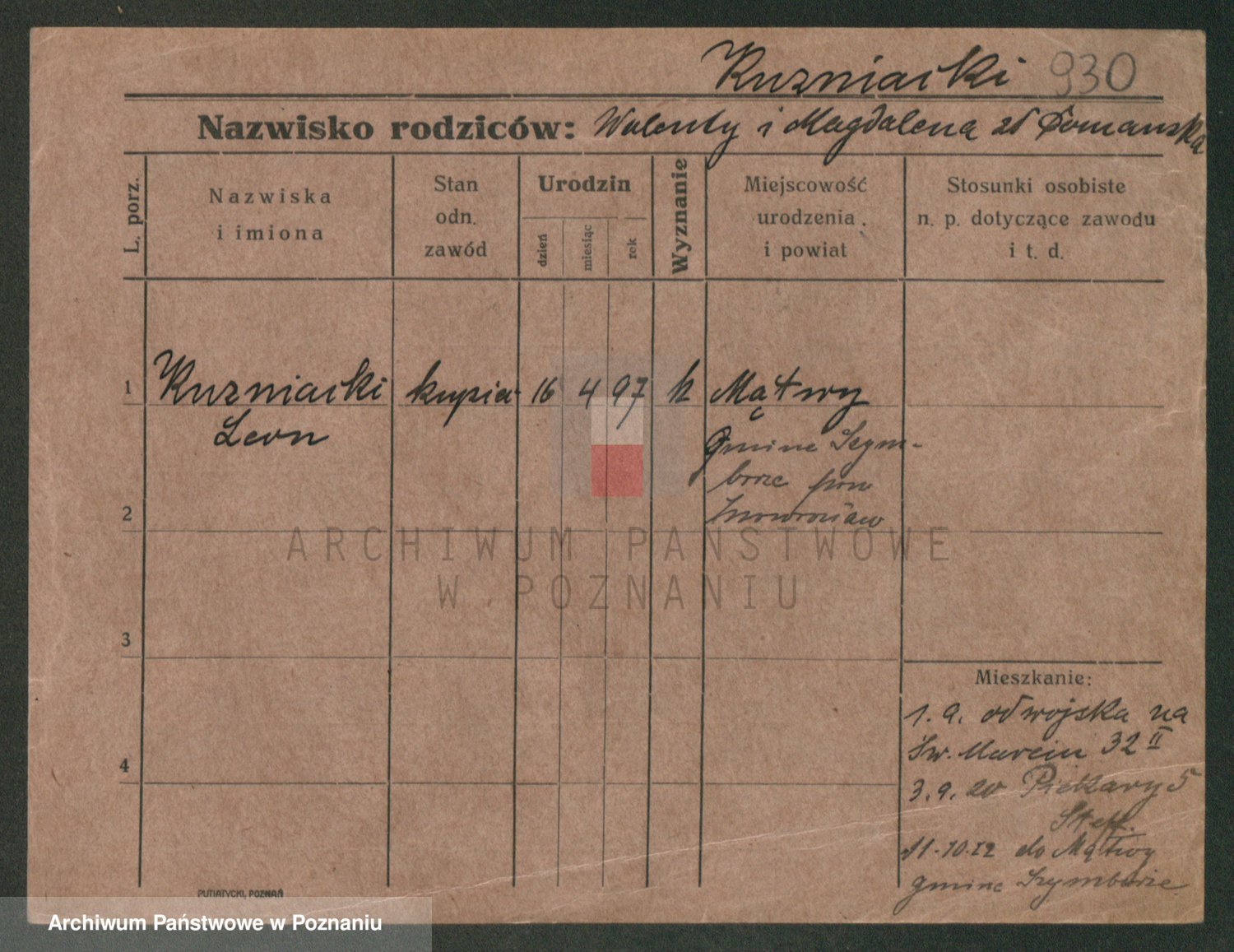 Podgląd karty osobowej dostępny jest po kliknięciu na nazwisko lub ikonkę karty. Można dokonywać powiększenia (ikony na górze) lub przechodzić między kolejnymi skanami (strzałki po bokach).