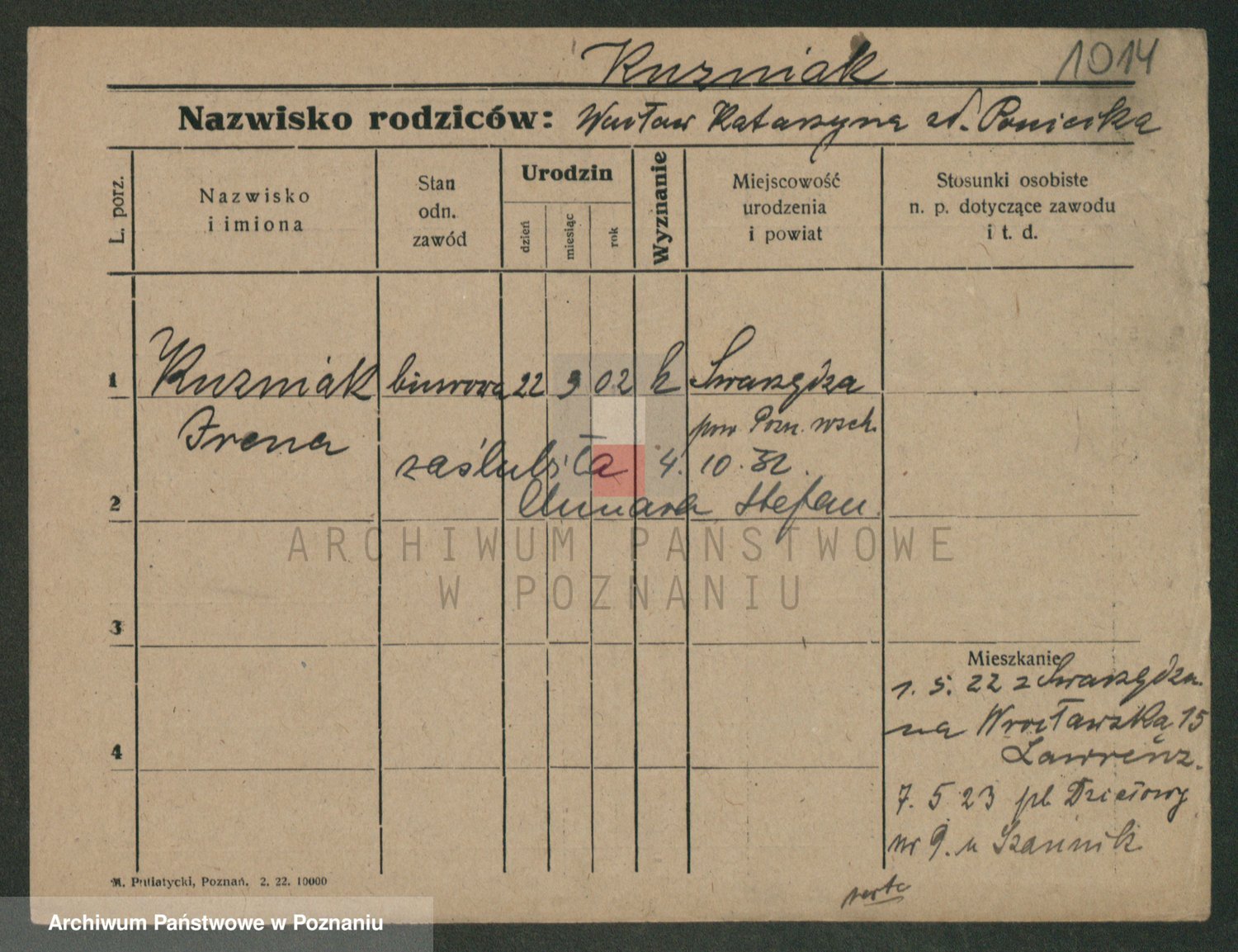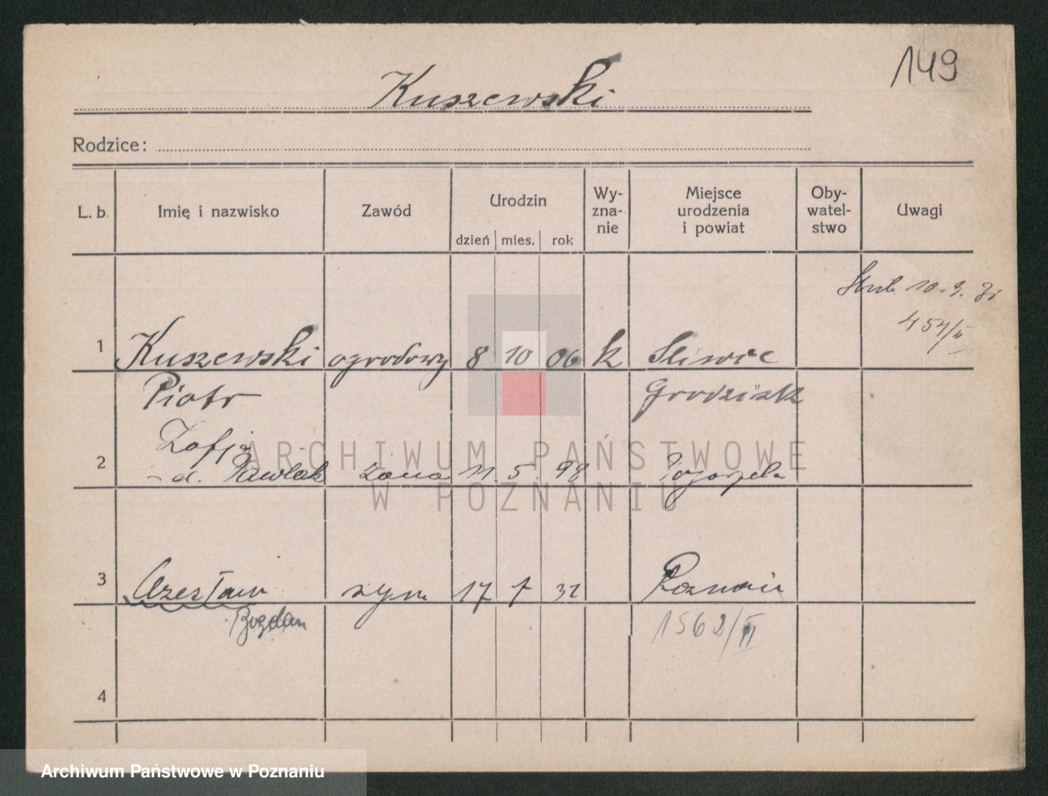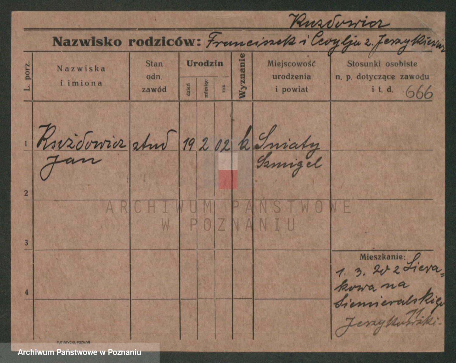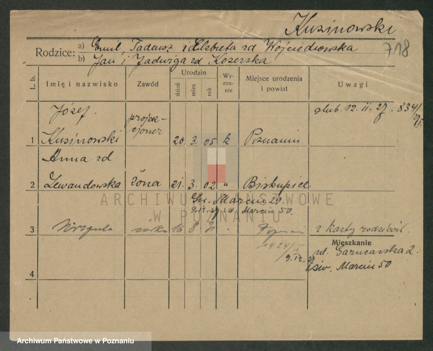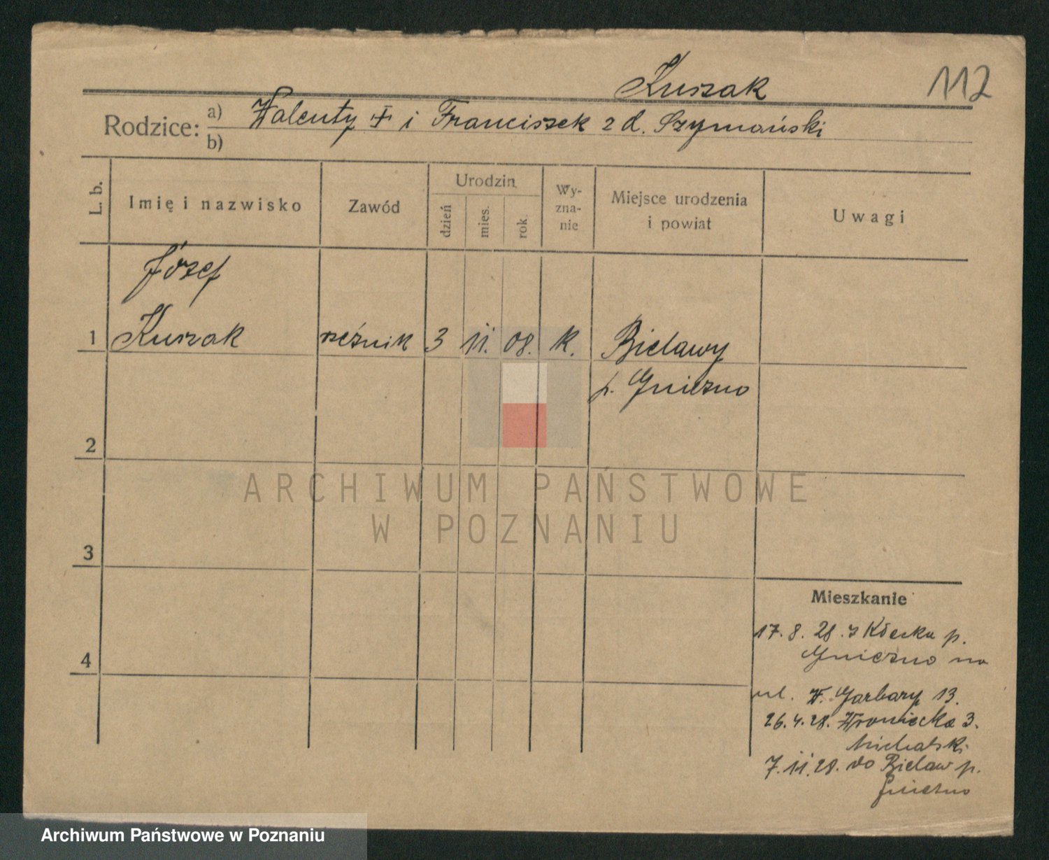 Podgląd karty osobowej dostępny jest po kliknięciu na nazwisko lub ikonkę karty. Można dokonywać powiększenia (ikony na górze) lub przechodzić między kolejnymi skanami (strzałki po bokach).