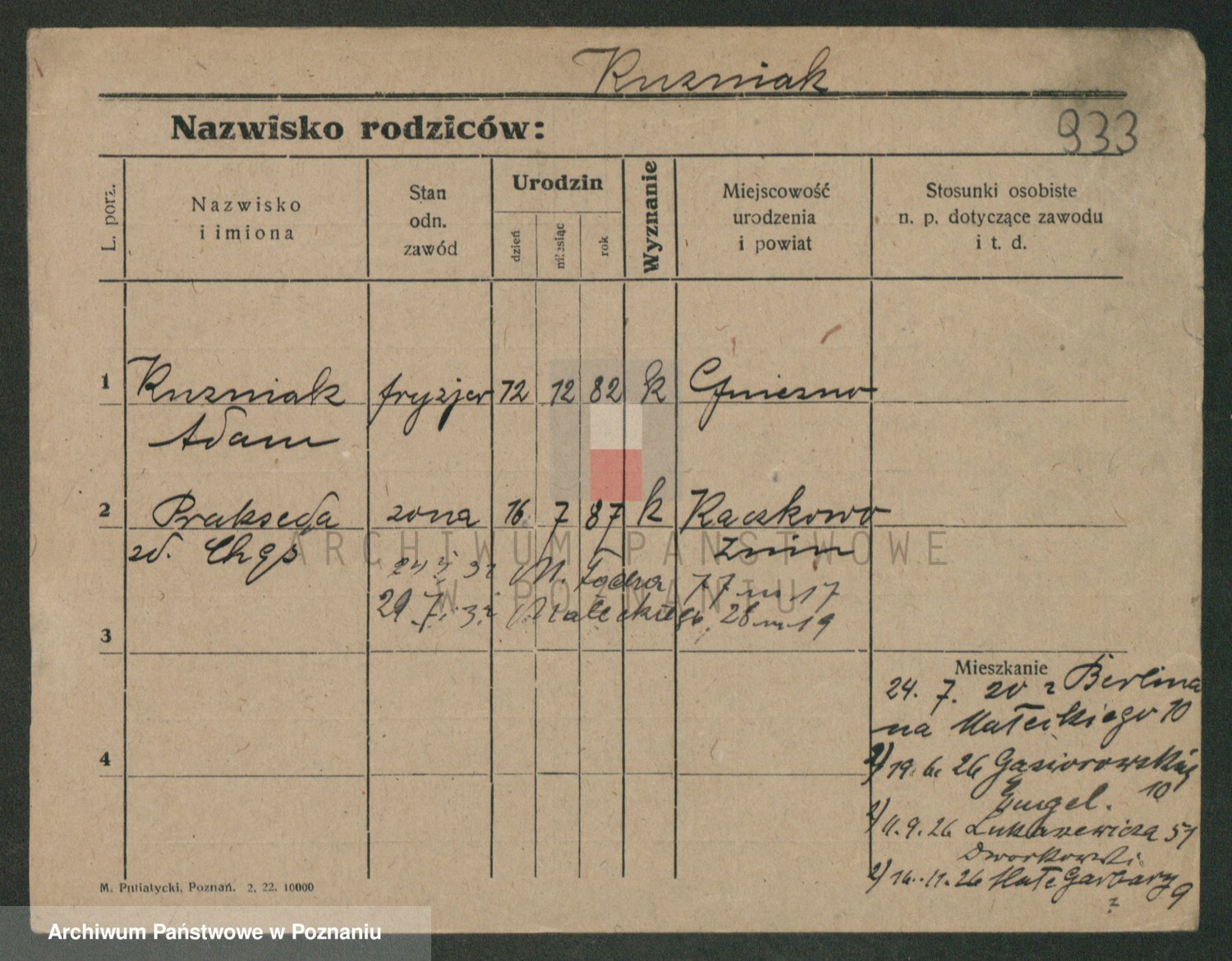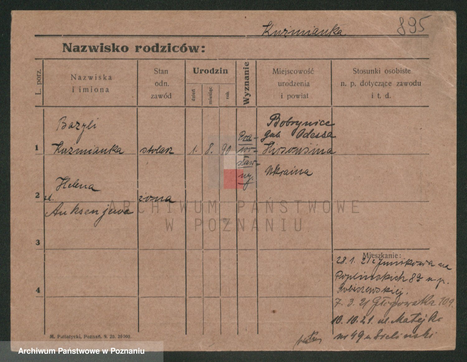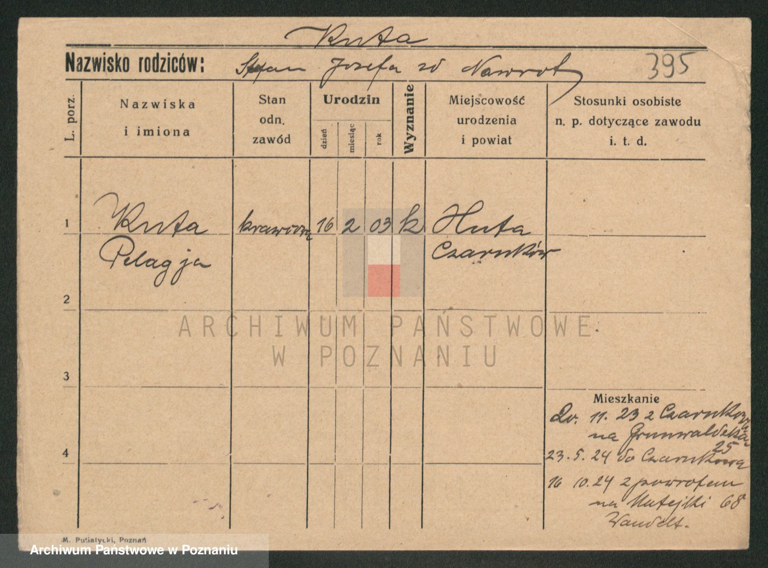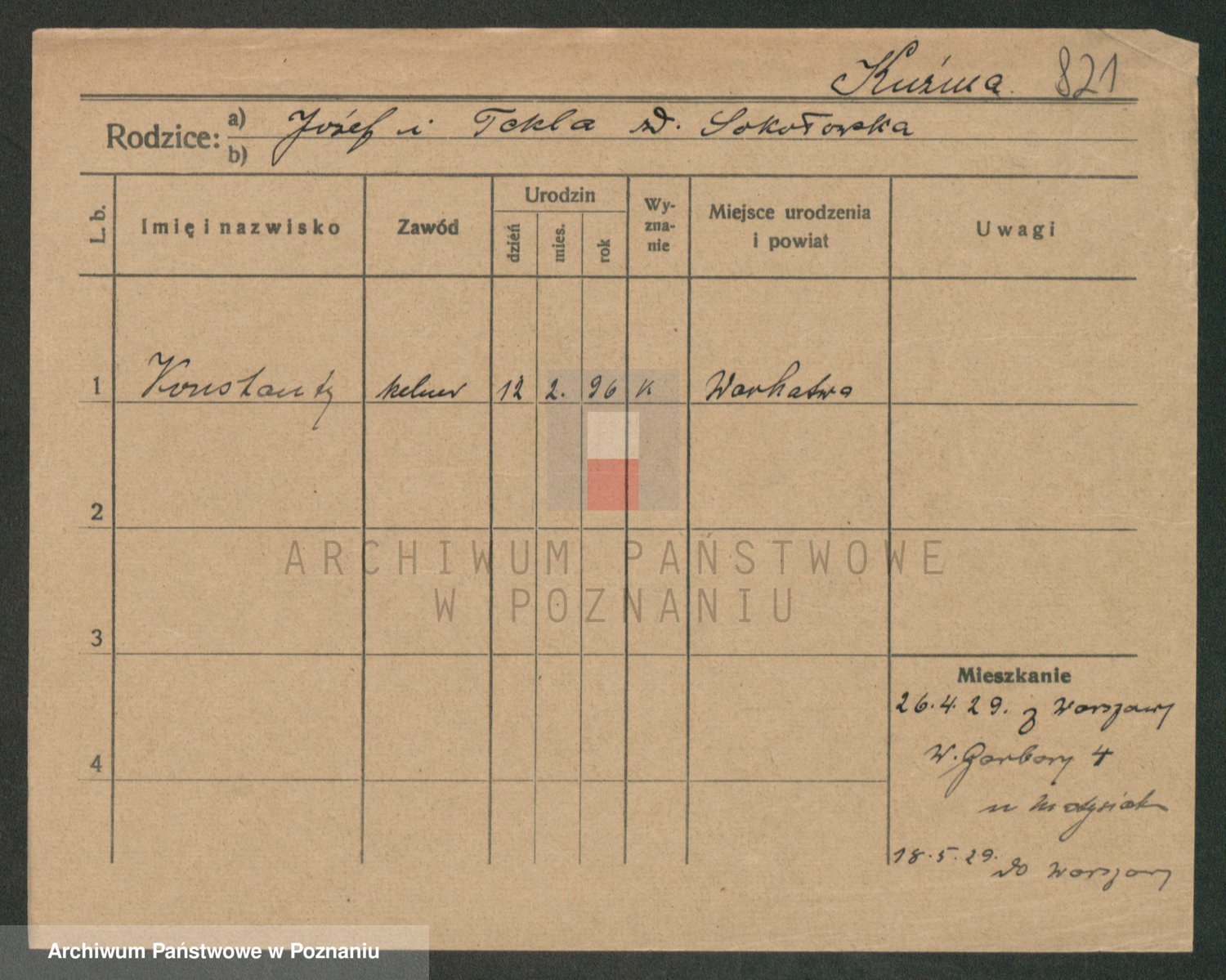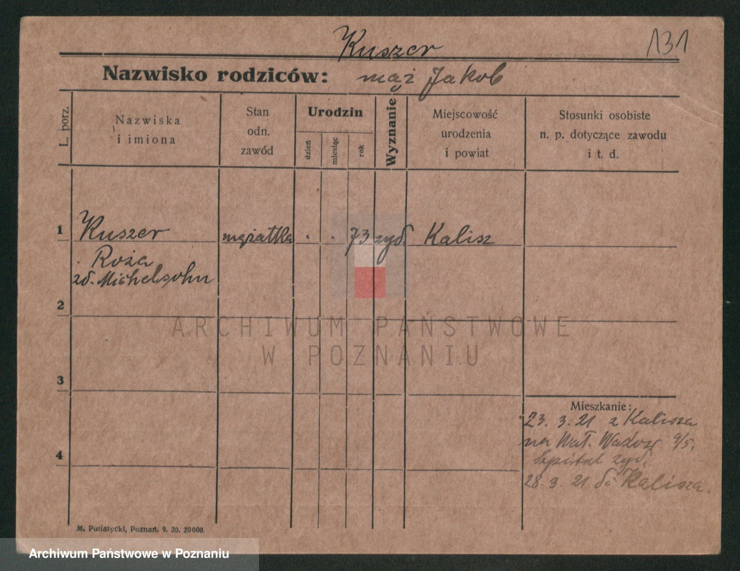Podgląd karty osobowej dostępny jest po kliknięciu na nazwisko lub ikonkę karty. Można dokonywać powiększenia (ikony na górze) lub przechodzić między kolejnymi skanami (strzałki po bokach).