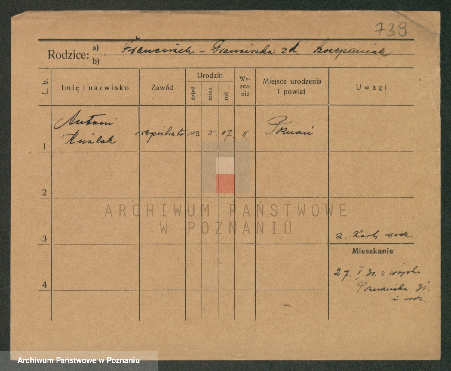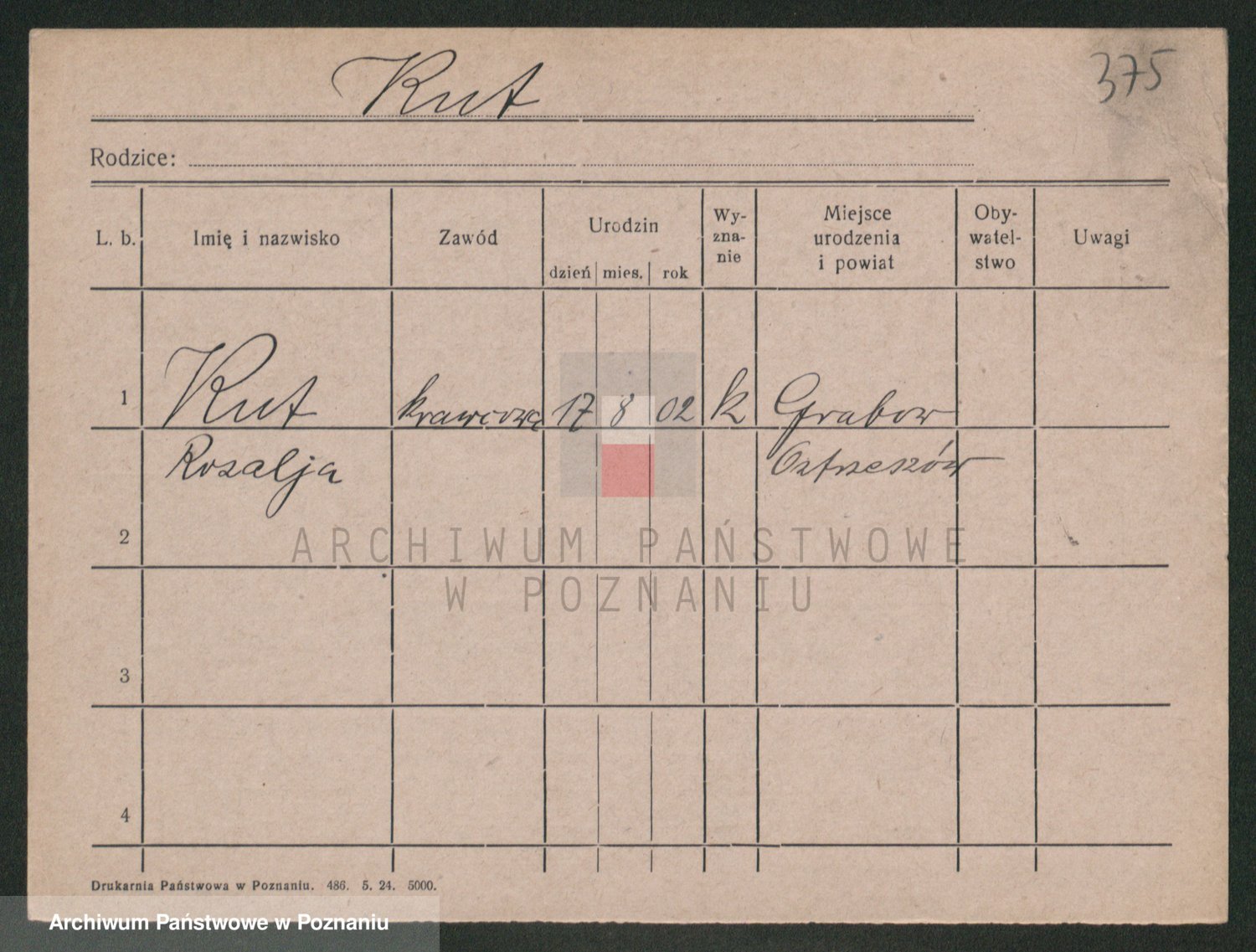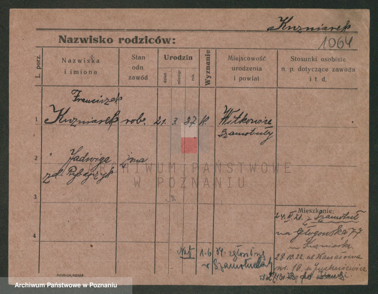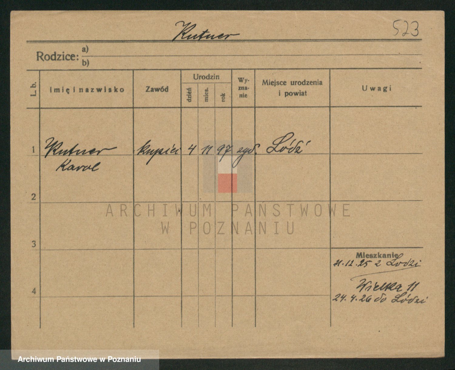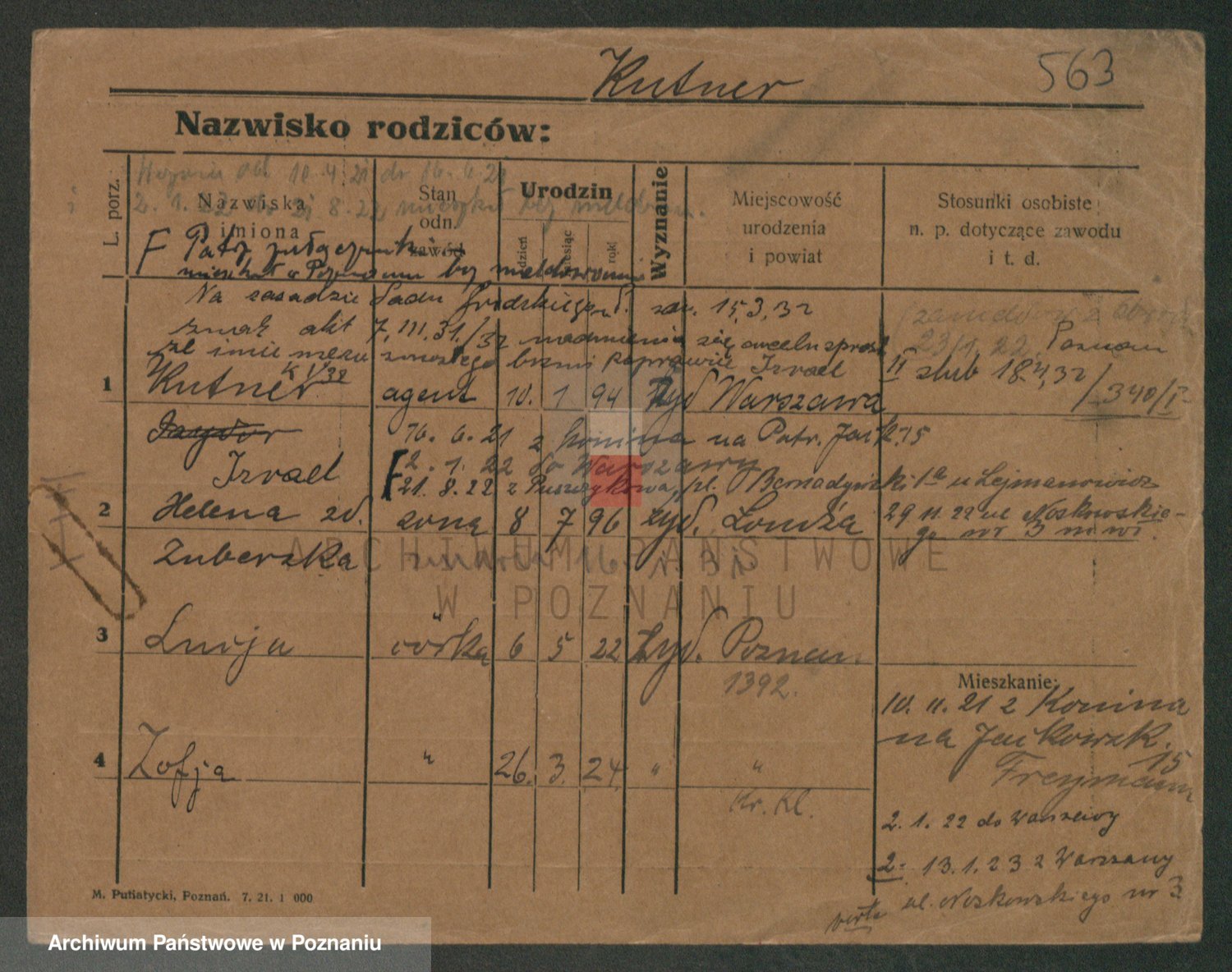 Podgląd karty osobowej dostępny jest po kliknięciu na nazwisko lub ikonkę karty. Można dokonywać powiększenia (ikony na górze) lub przechodzić między kolejnymi skanami (strzałki po bokach).