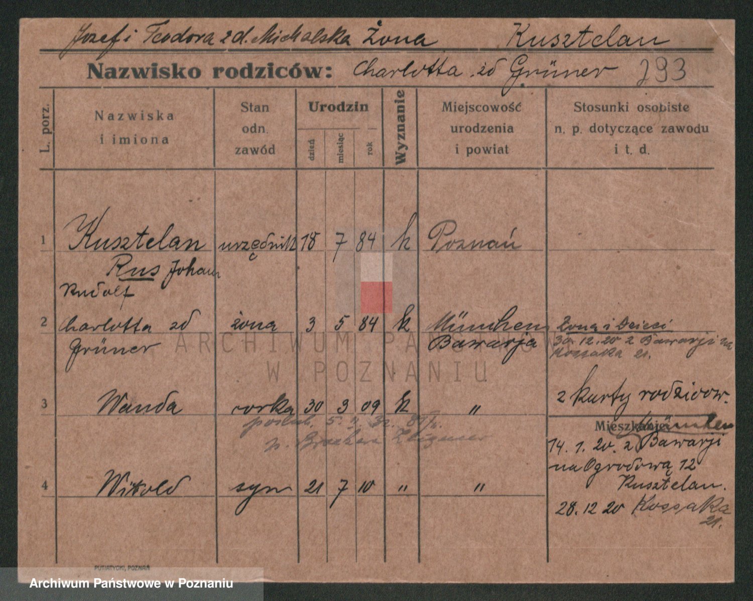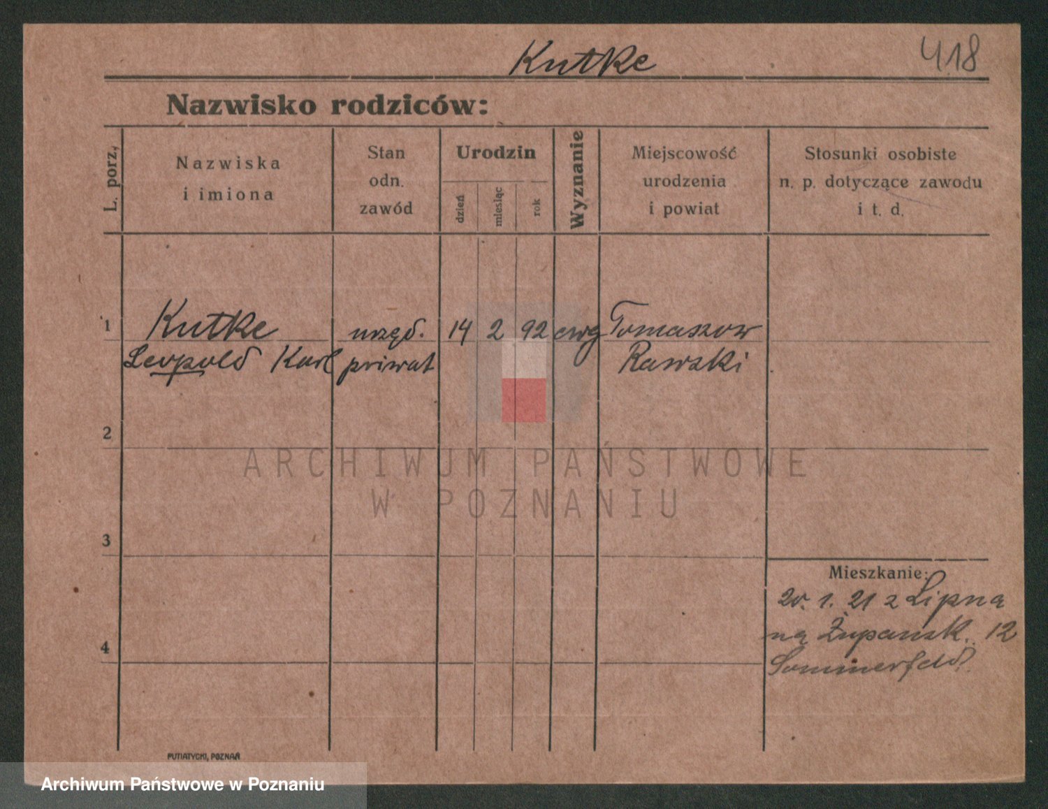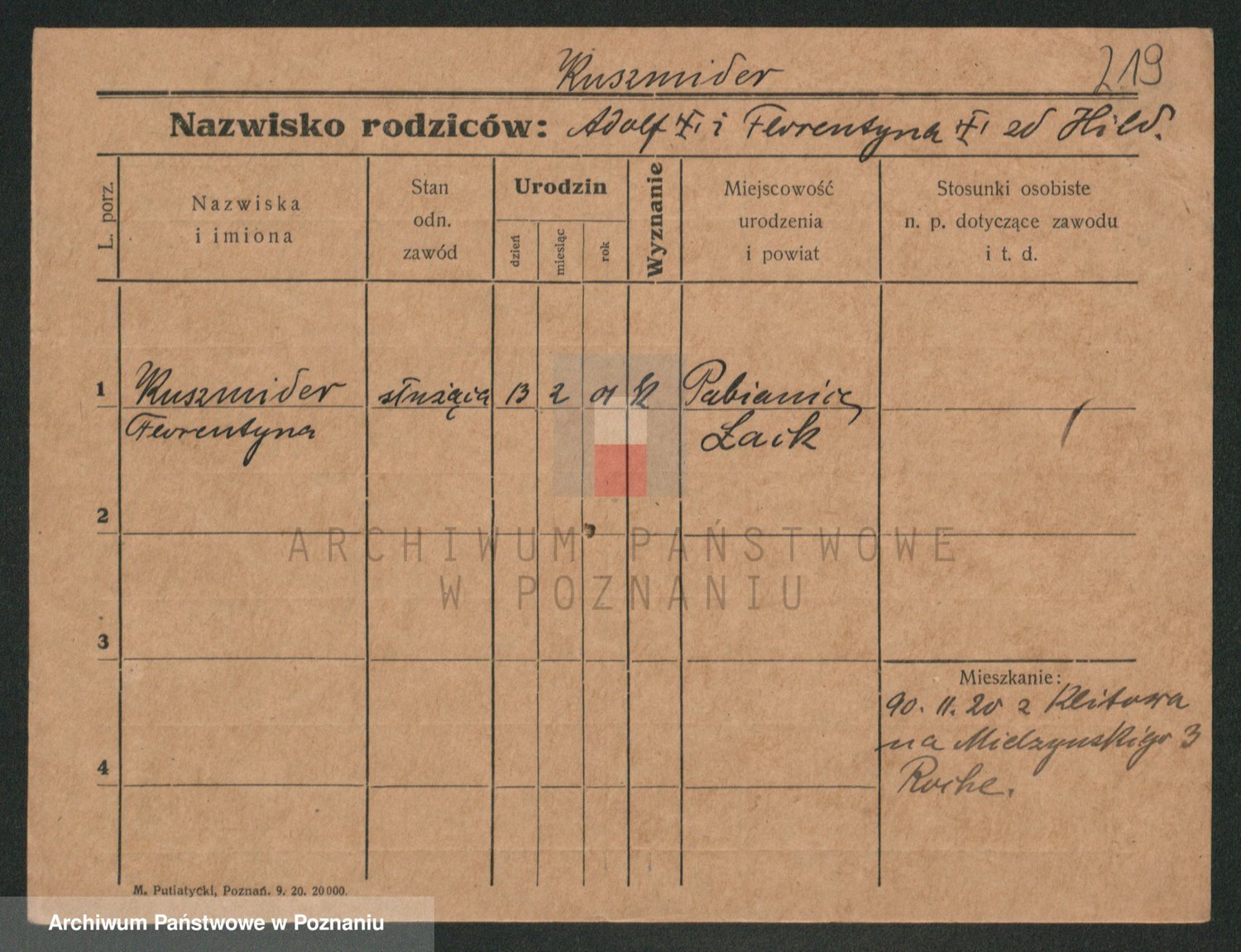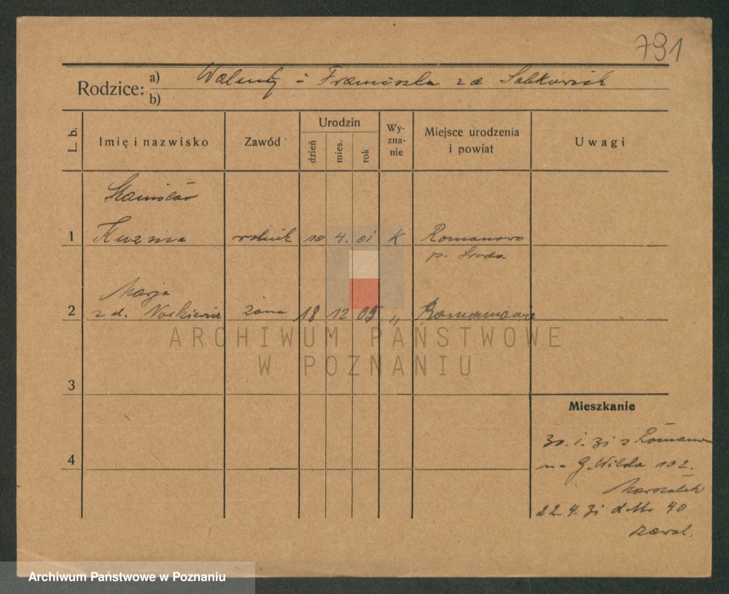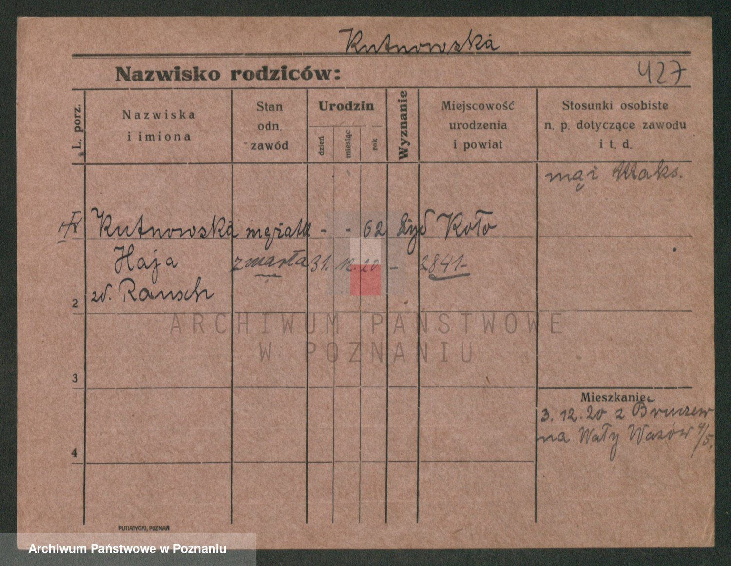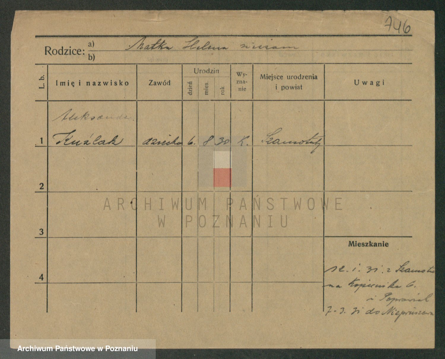 Podgląd karty osobowej dostępny jest po kliknięciu na nazwisko lub ikonkę karty. Można dokonywać powiększenia (ikony na górze) lub przechodzić między kolejnymi skanami (strzałki po bokach).