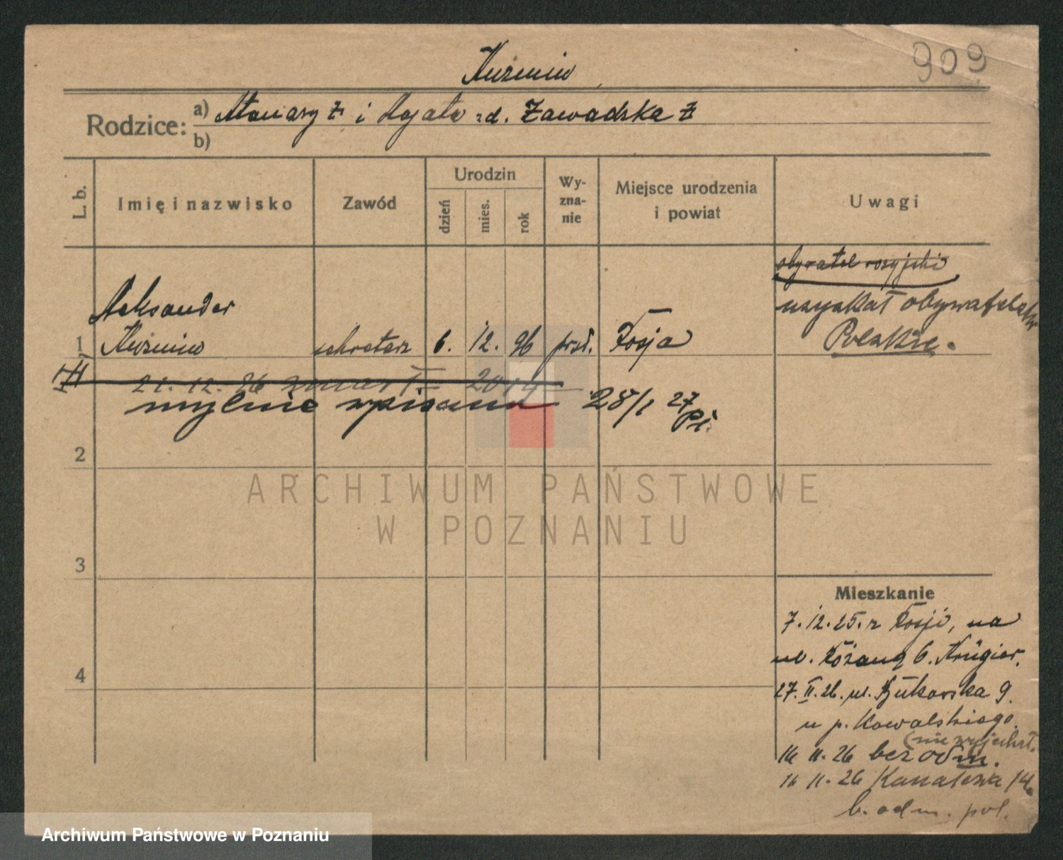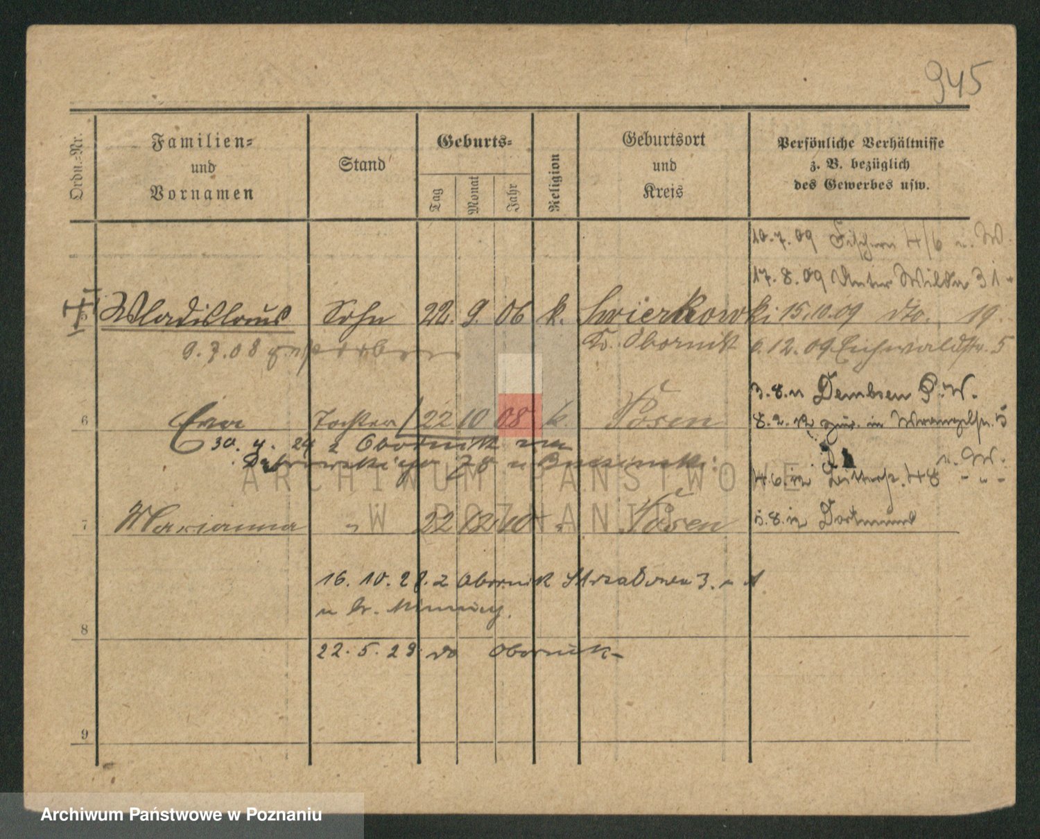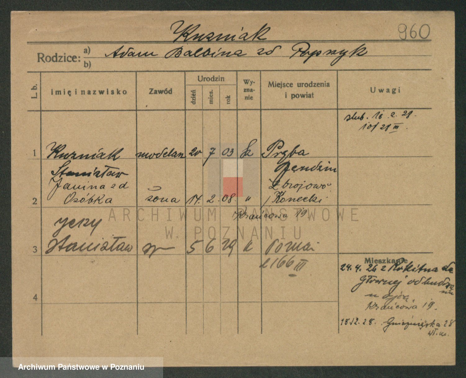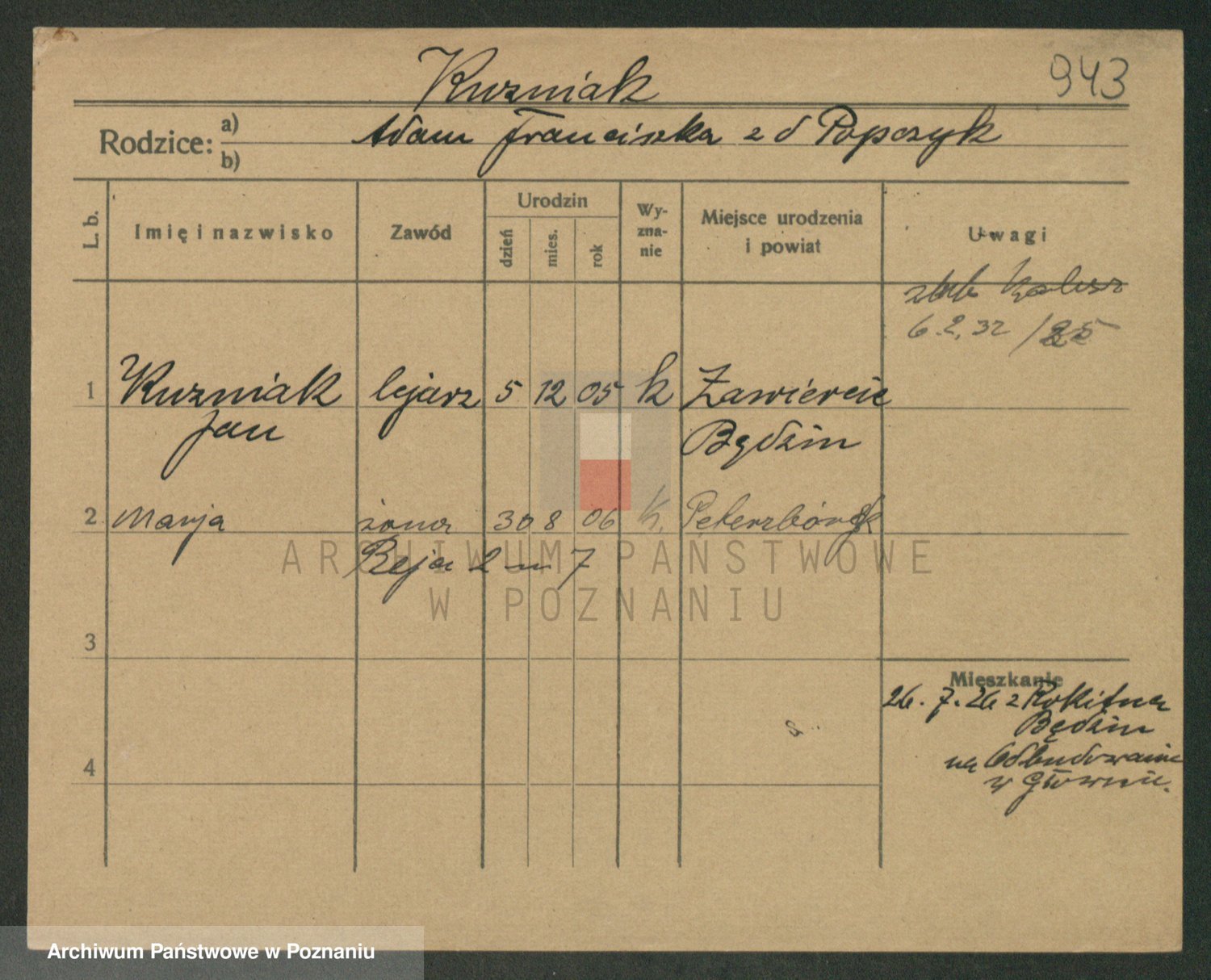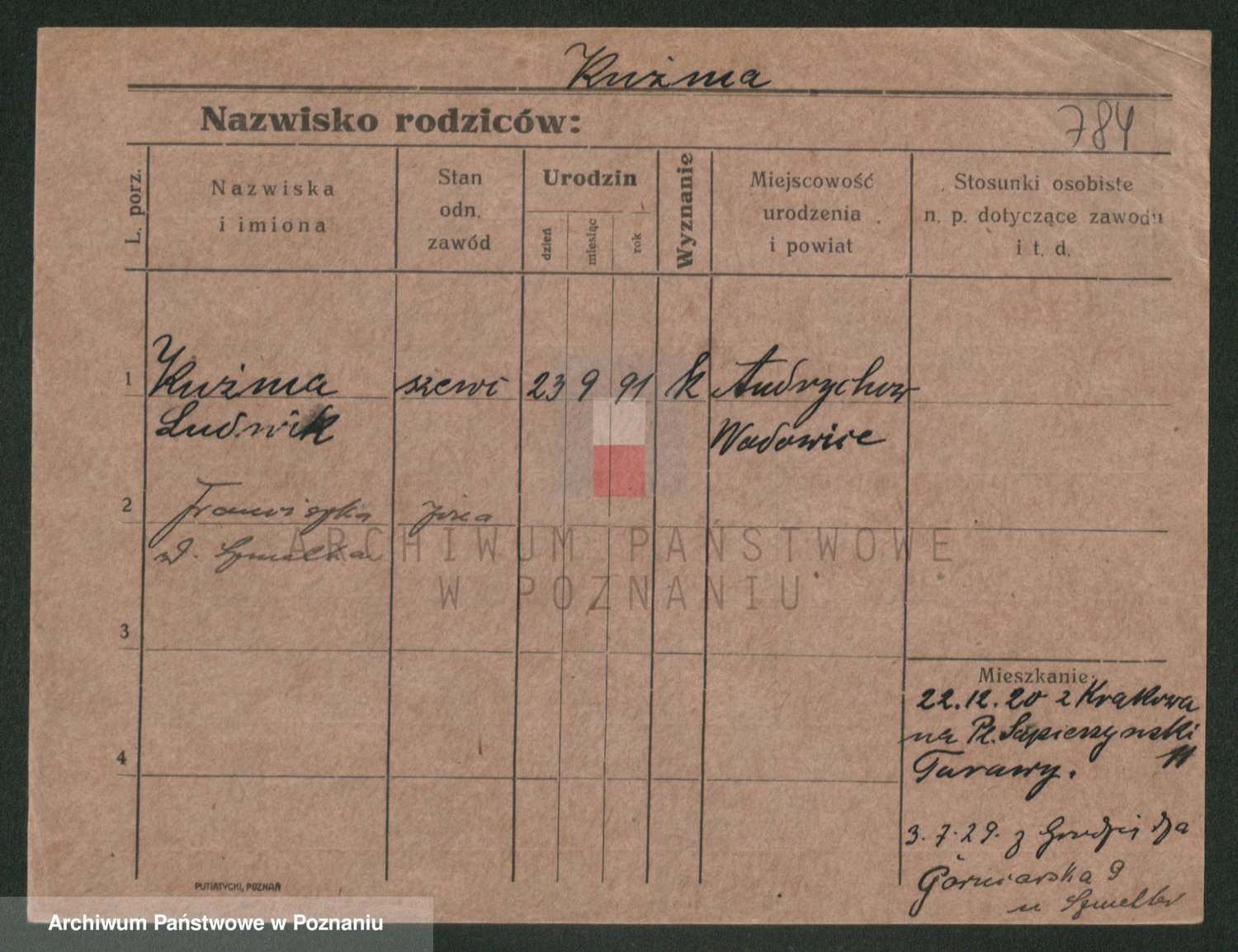 Podgląd karty osobowej dostępny jest po kliknięciu na nazwisko lub ikonkę karty. Można dokonywać powiększenia (ikony na górze) lub przechodzić między kolejnymi skanami (strzałki po bokach).