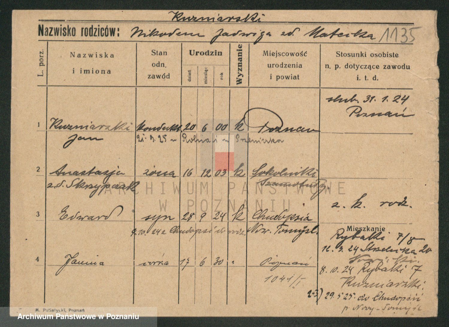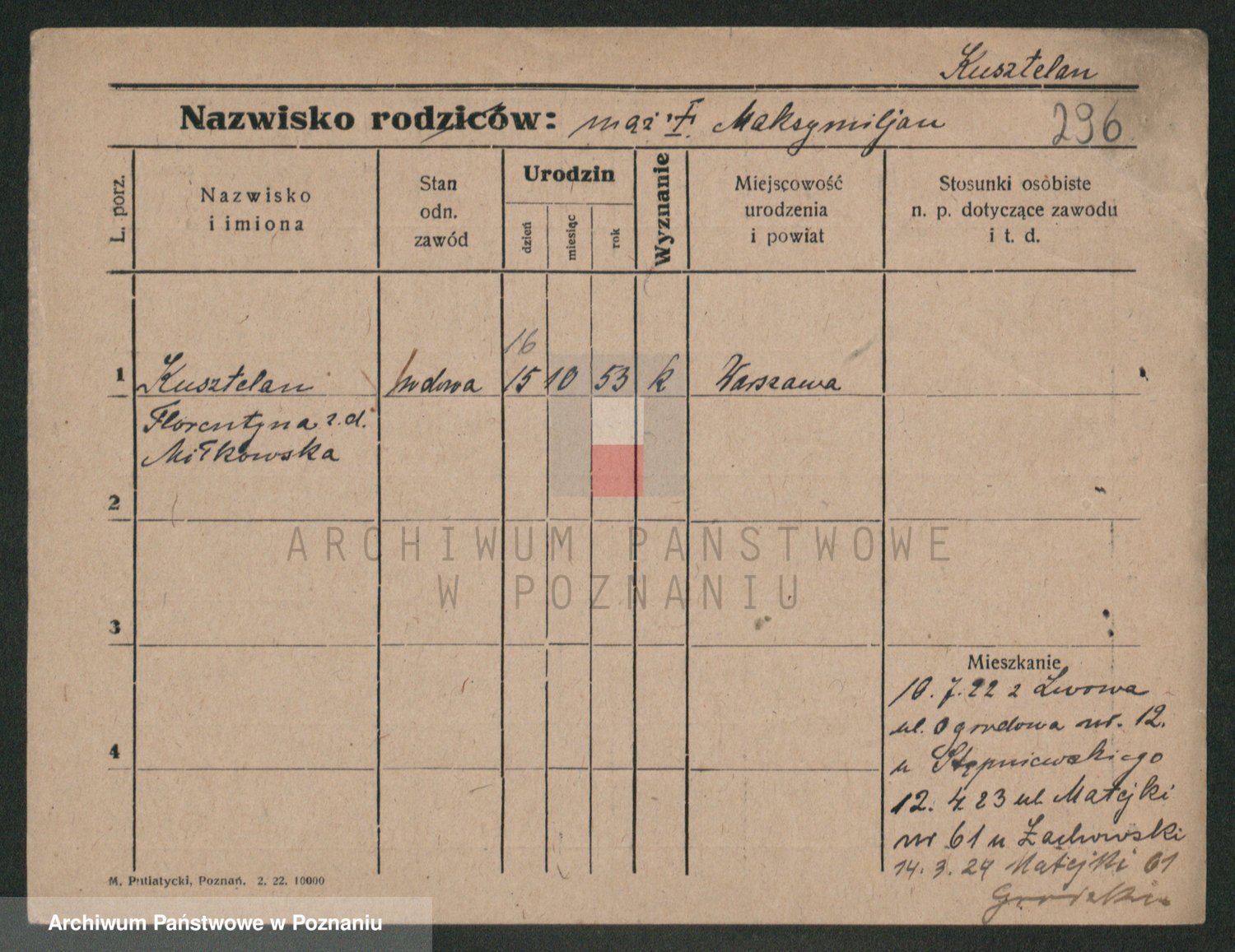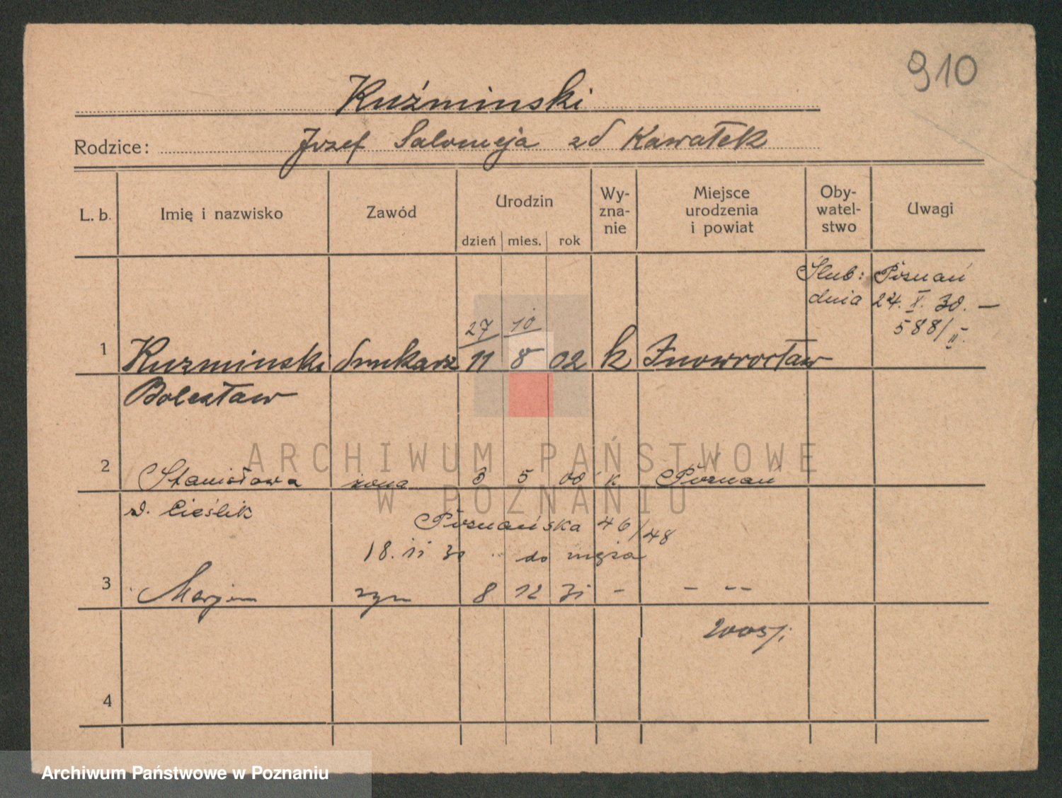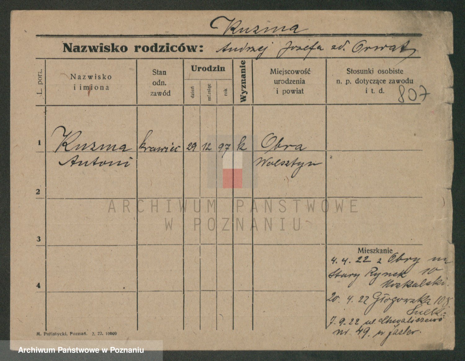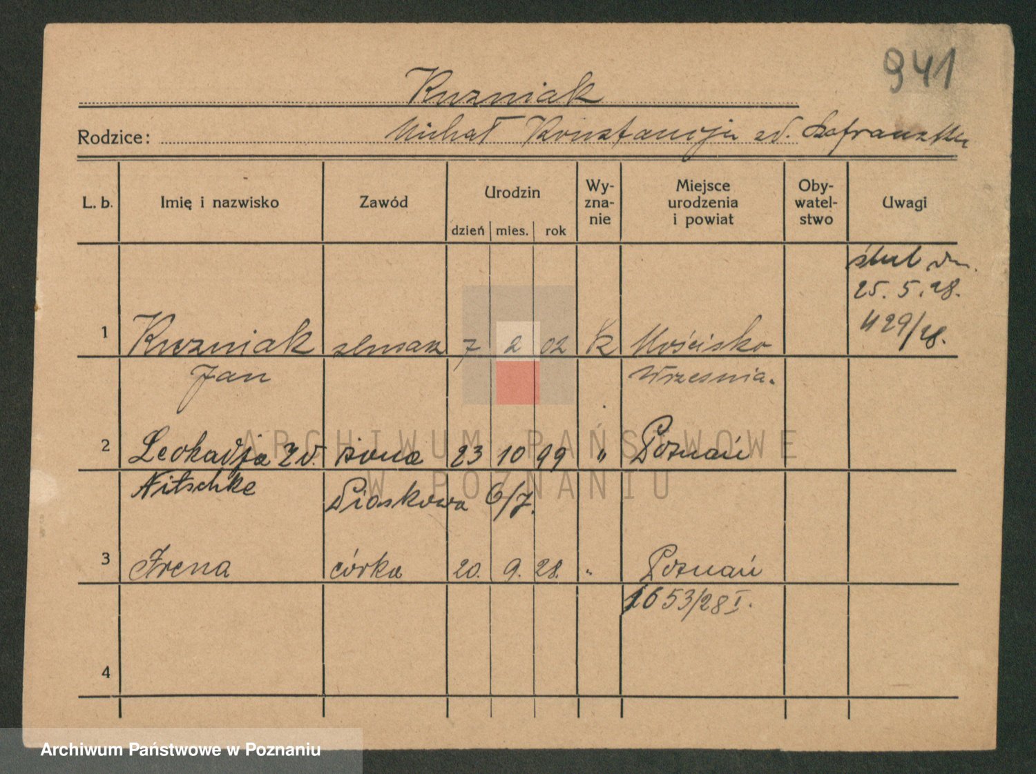 Podgląd karty osobowej dostępny jest po kliknięciu na nazwisko lub ikonkę karty. Można dokonywać powiększenia (ikony na górze) lub przechodzić między kolejnymi skanami (strzałki po bokach).