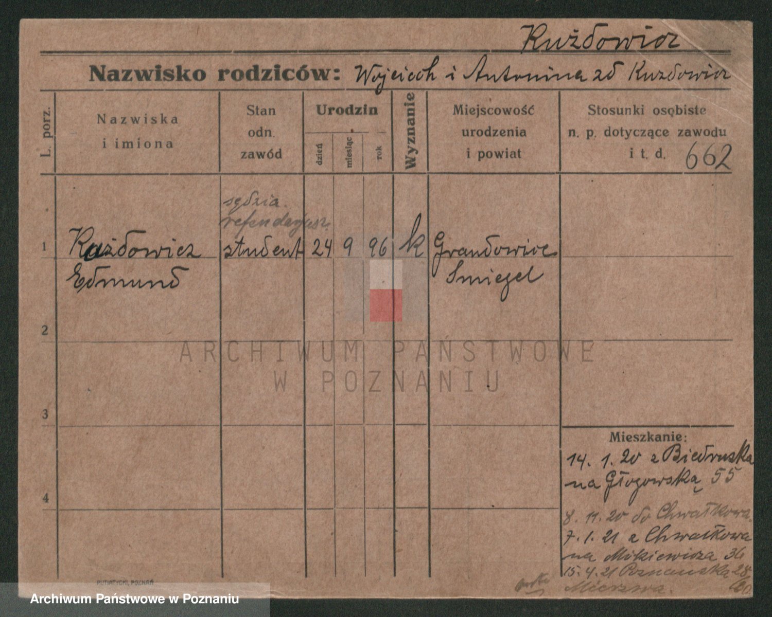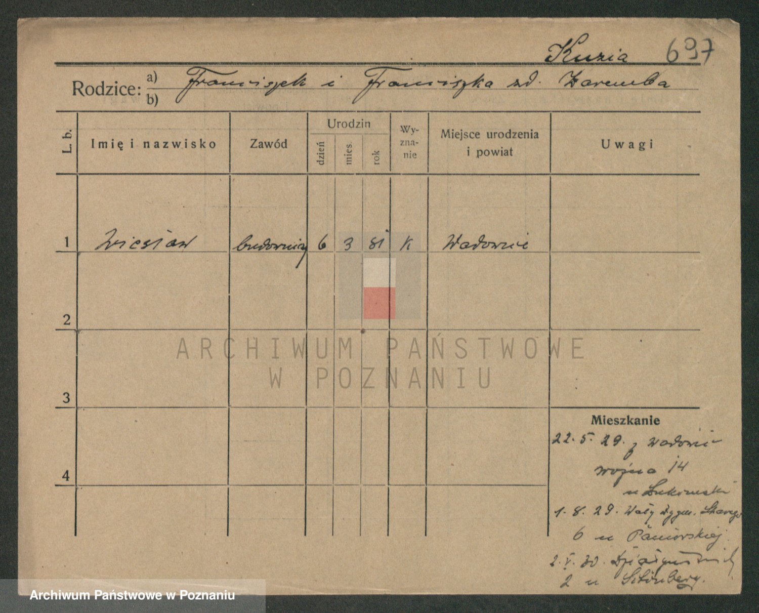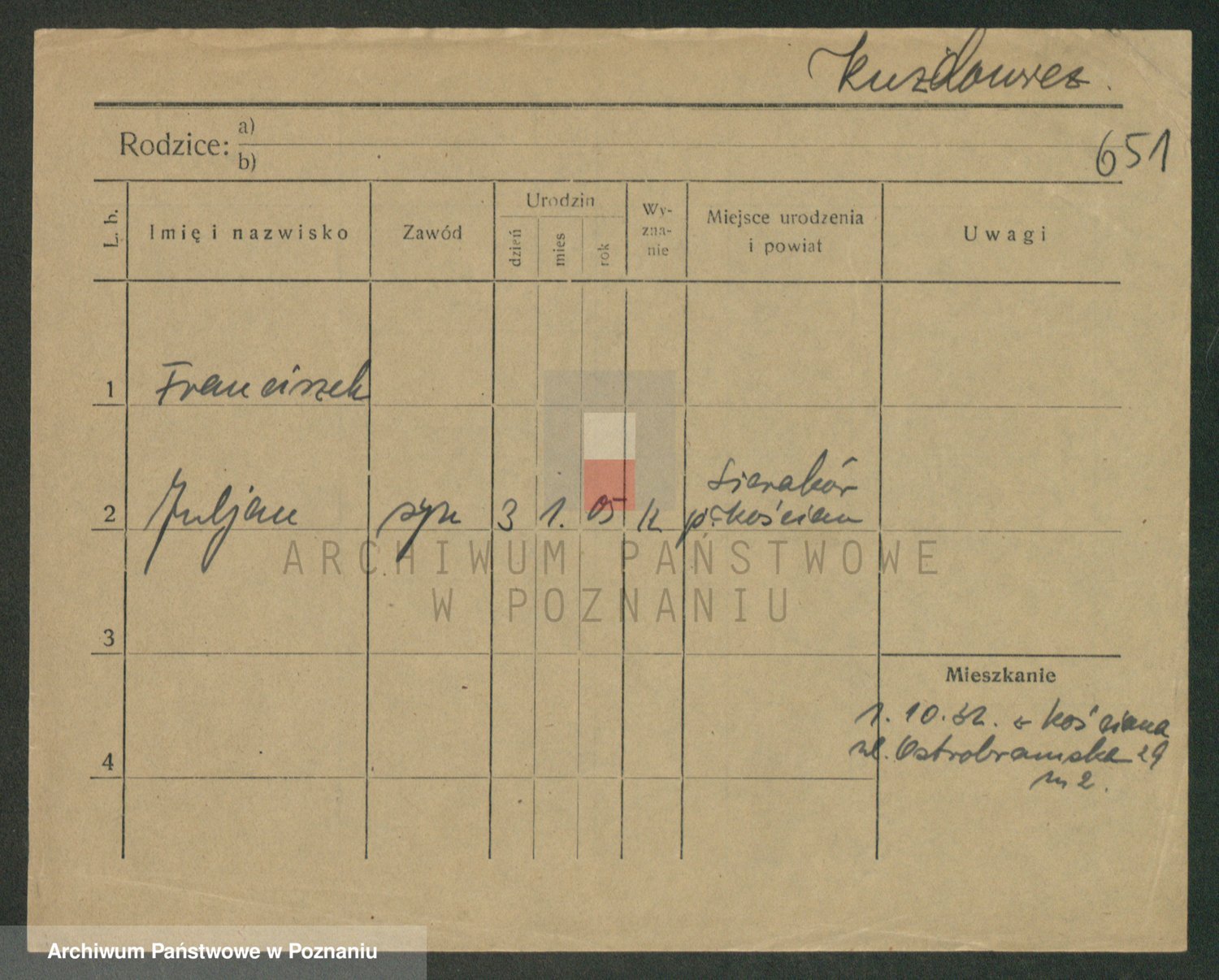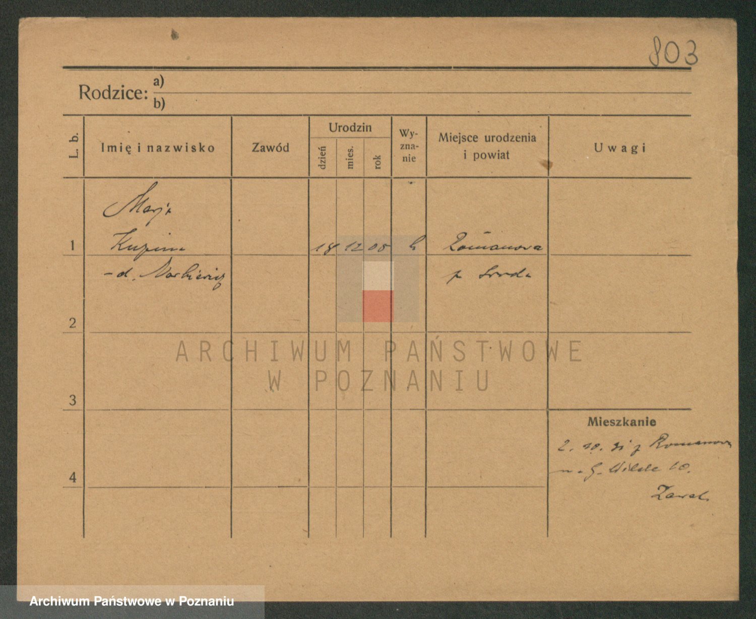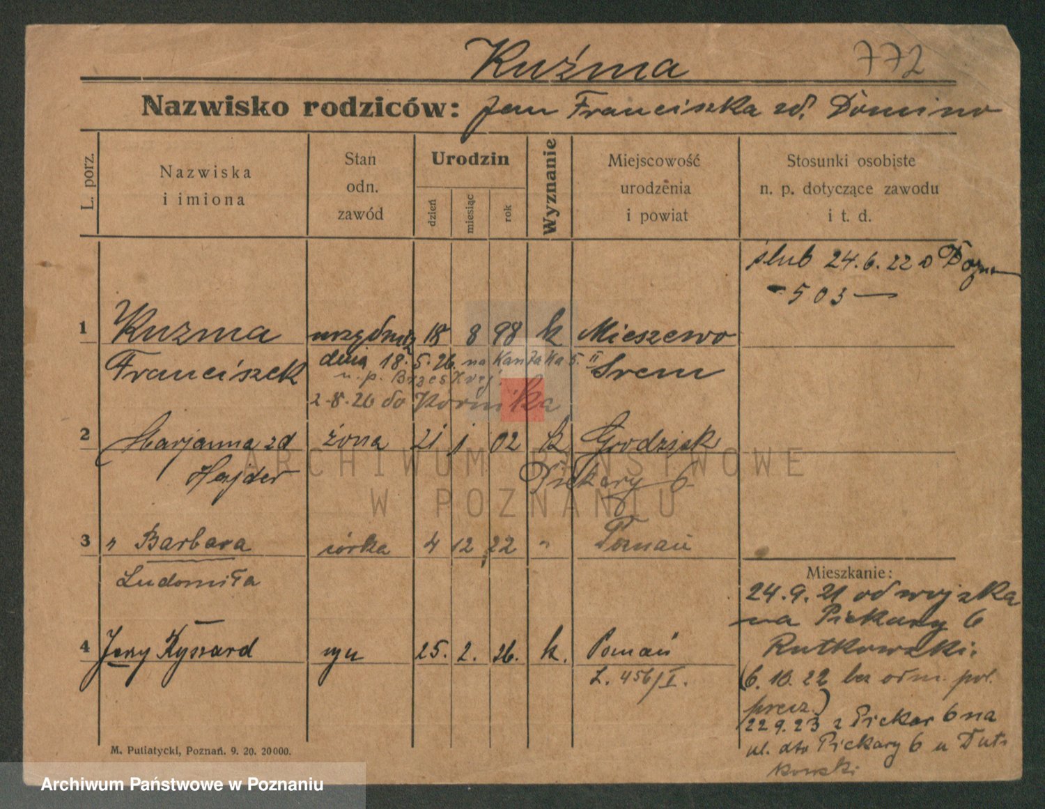Podgląd karty osobowej dostępny jest po kliknięciu na nazwisko lub ikonkę karty. Można dokonywać powiększenia (ikony na górze) lub przechodzić między kolejnymi skanami (strzałki po bokach).