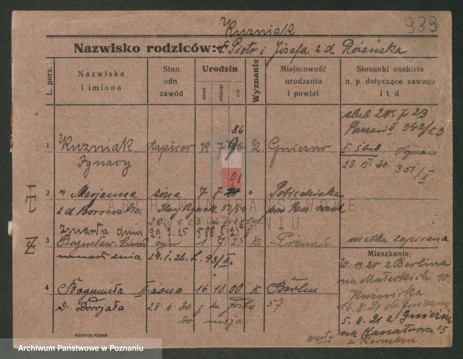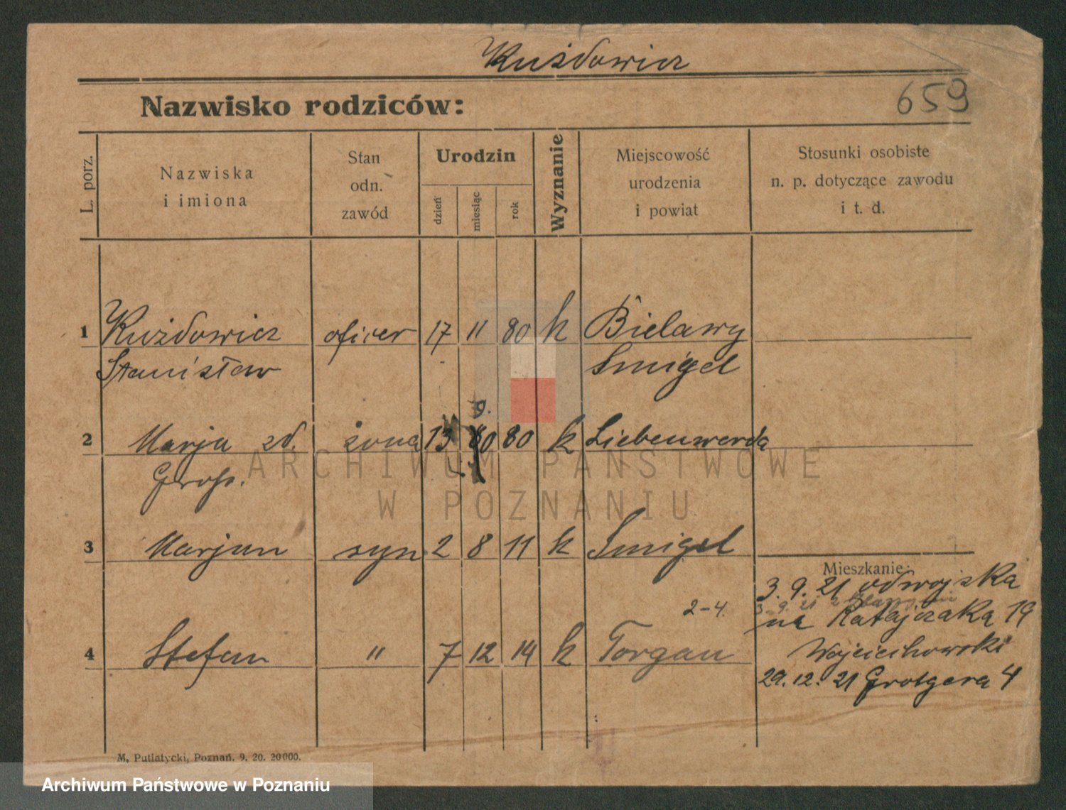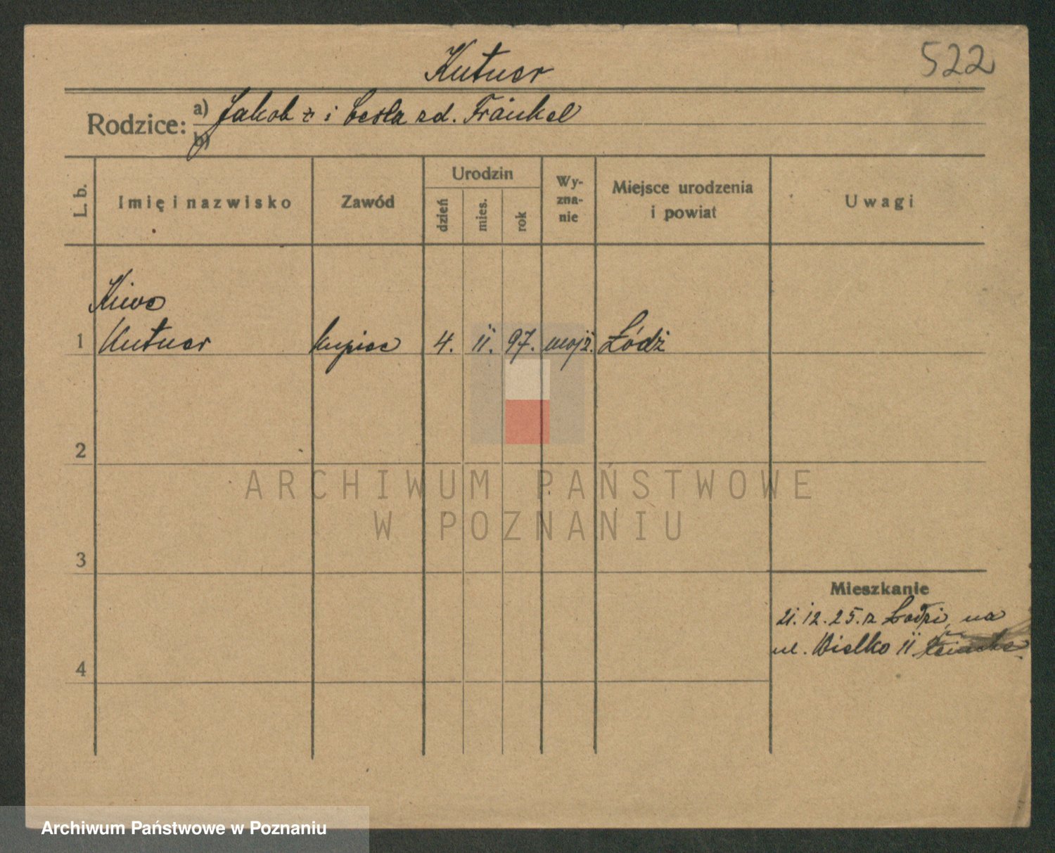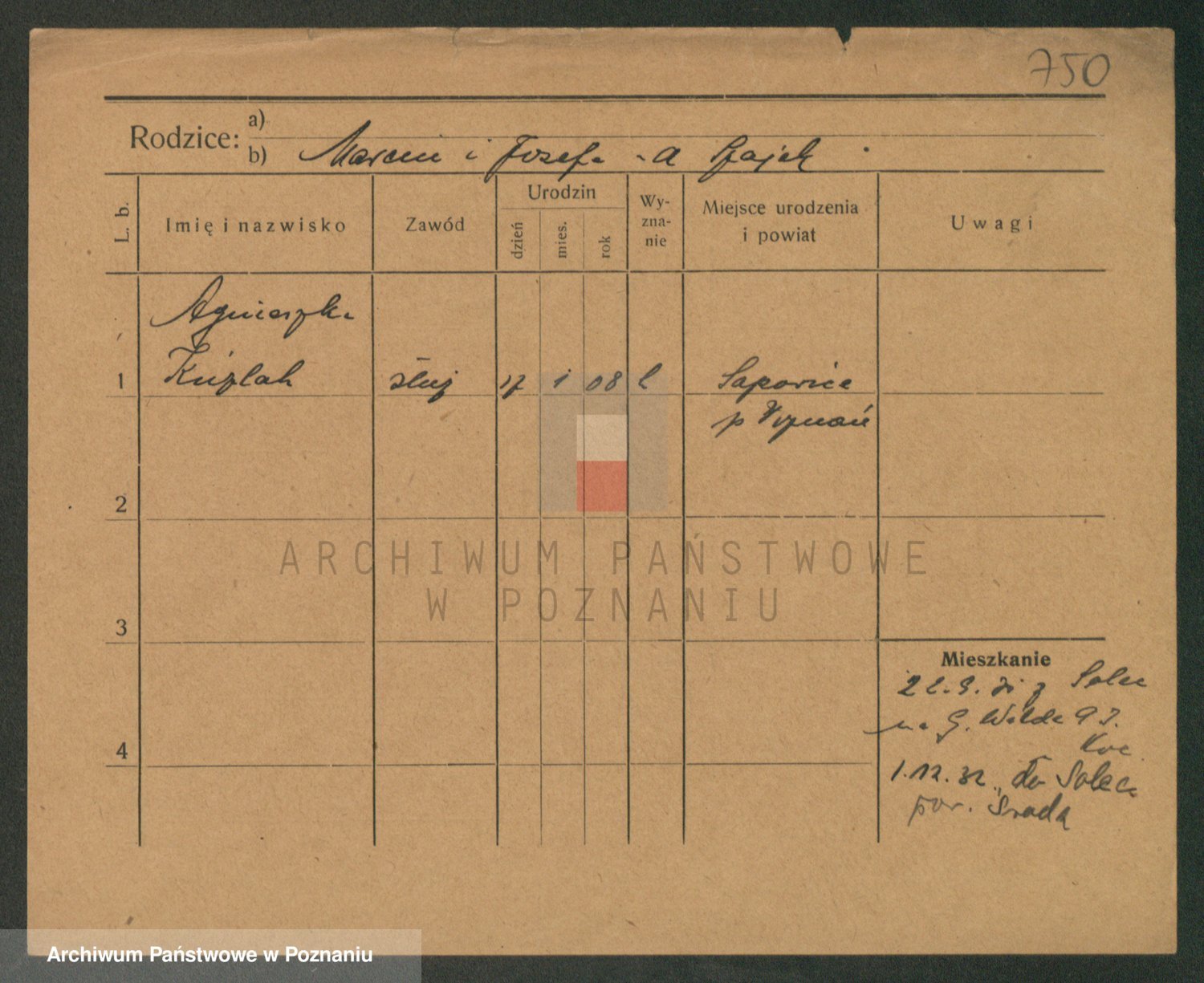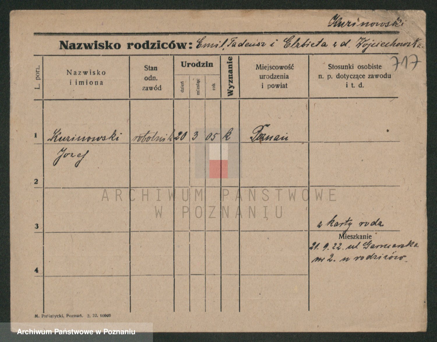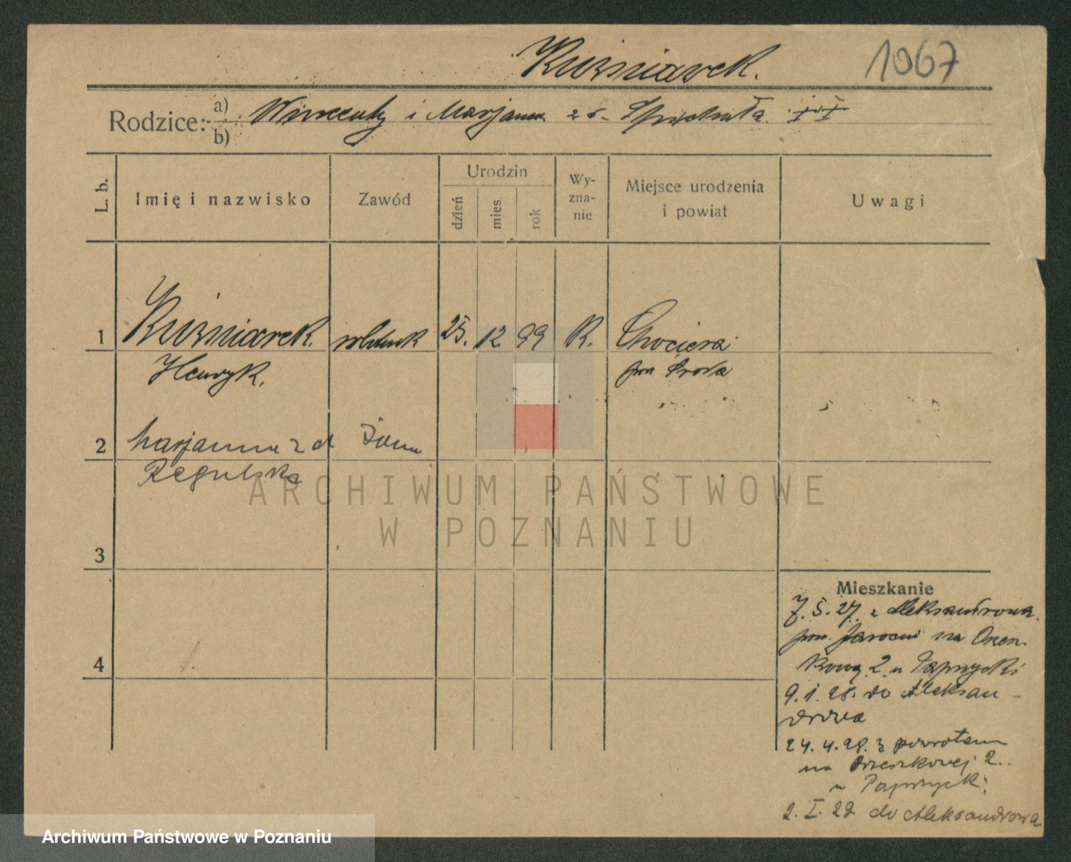 Podgląd karty osobowej dostępny jest po kliknięciu na nazwisko lub ikonkę karty. Można dokonywać powiększenia (ikony na górze) lub przechodzić między kolejnymi skanami (strzałki po bokach).