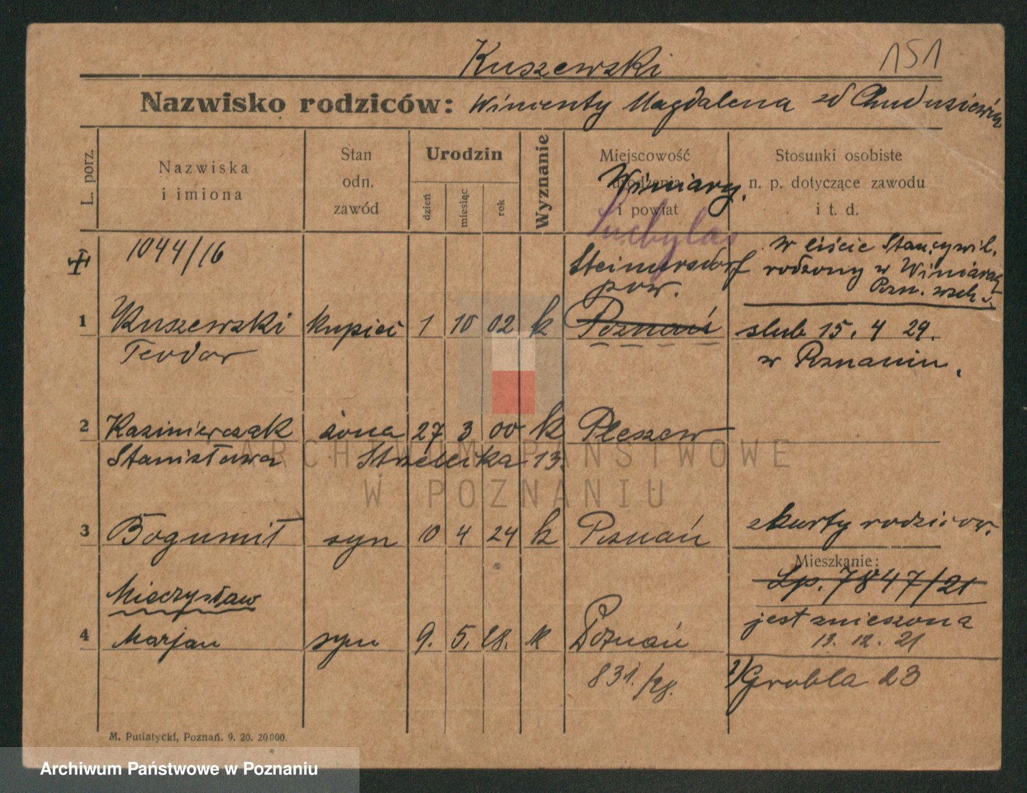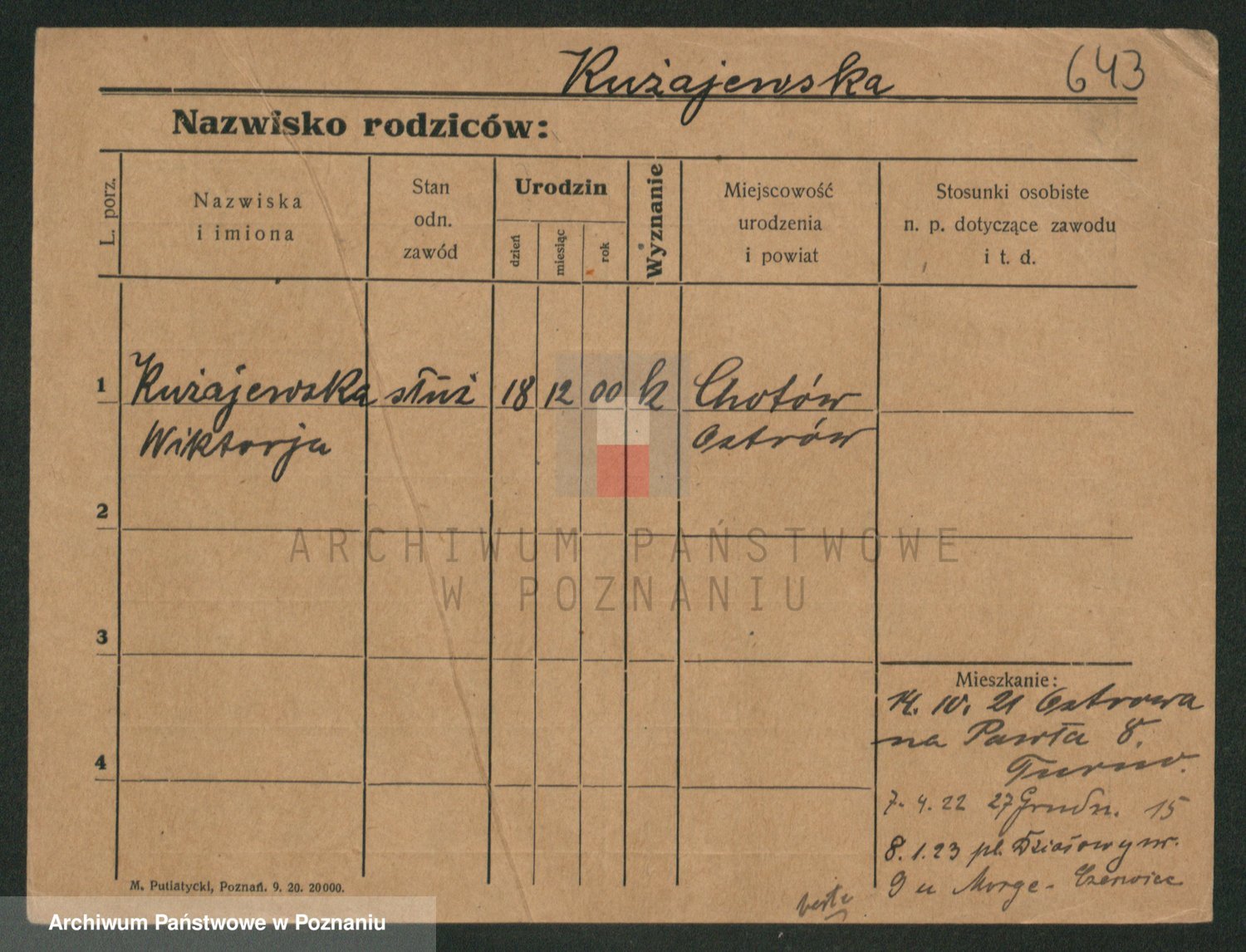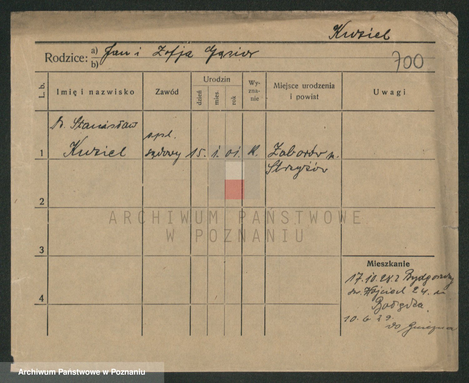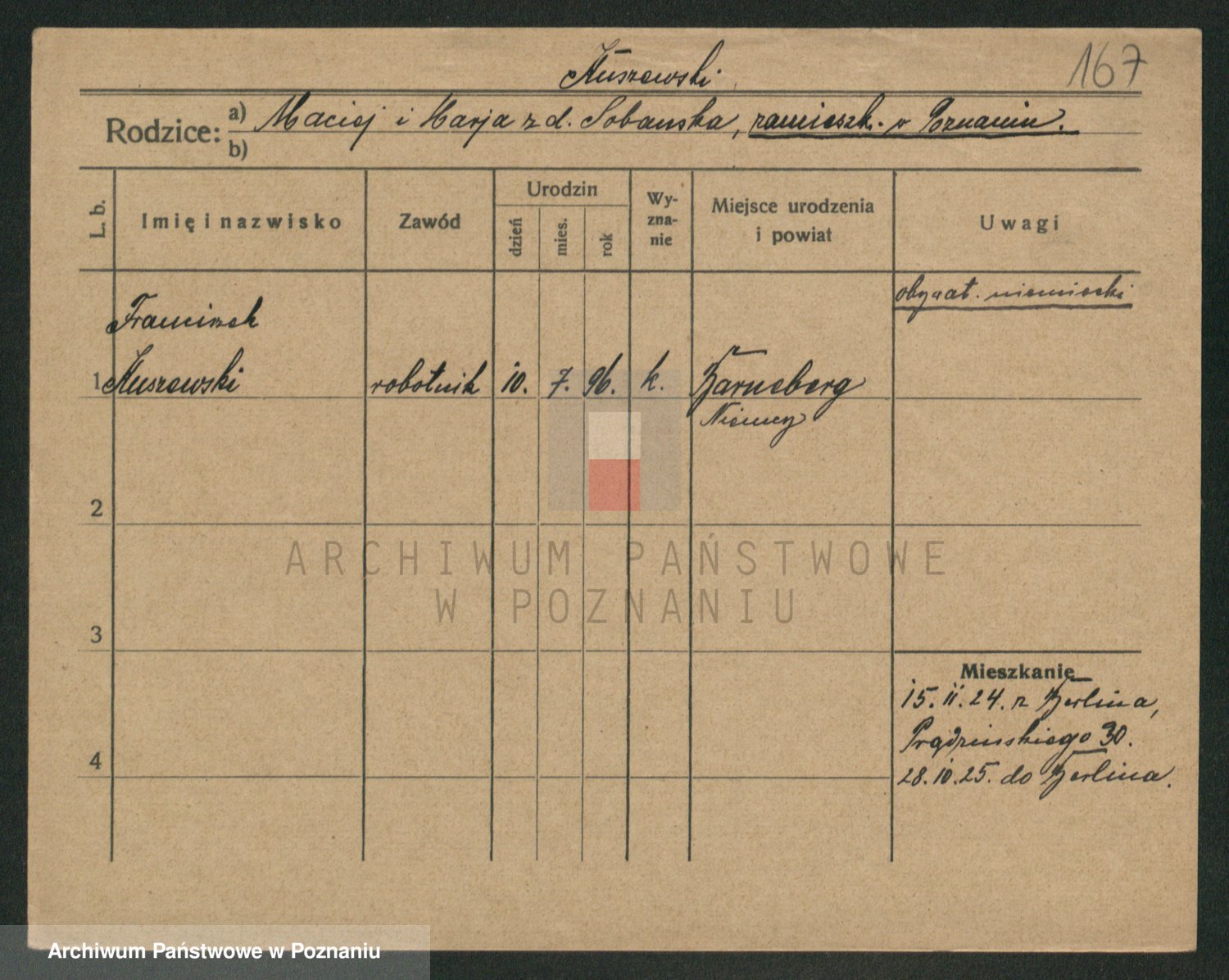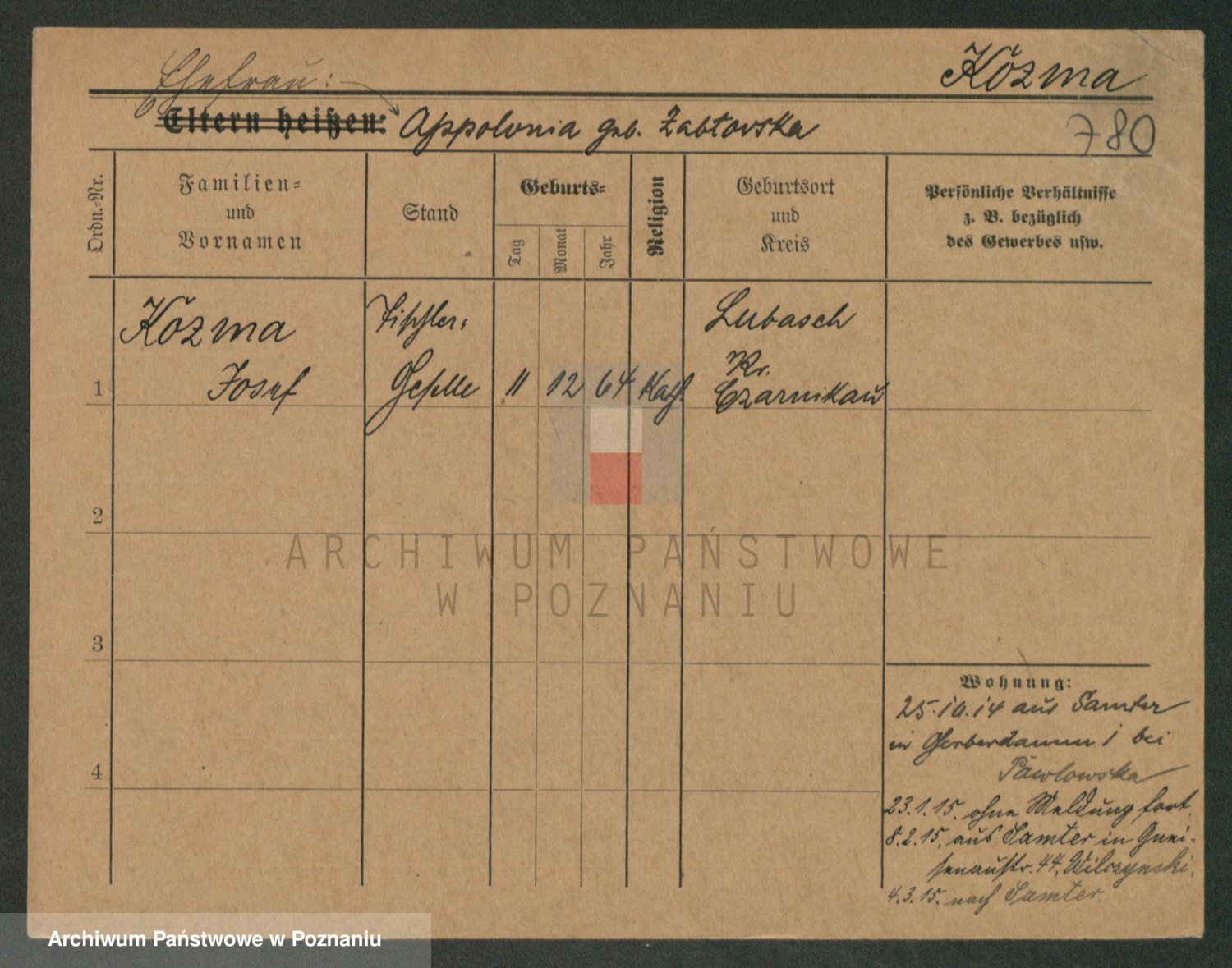 Podgląd karty osobowej dostępny jest po kliknięciu na nazwisko lub ikonkę karty. Można dokonywać powiększenia (ikony na górze) lub przechodzić między kolejnymi skanami (strzałki po bokach).