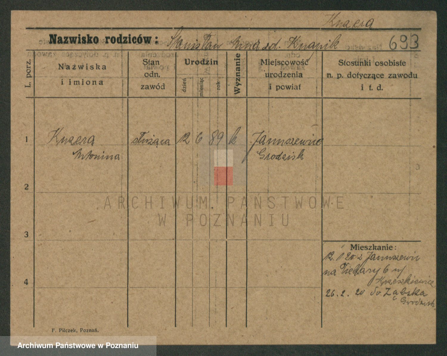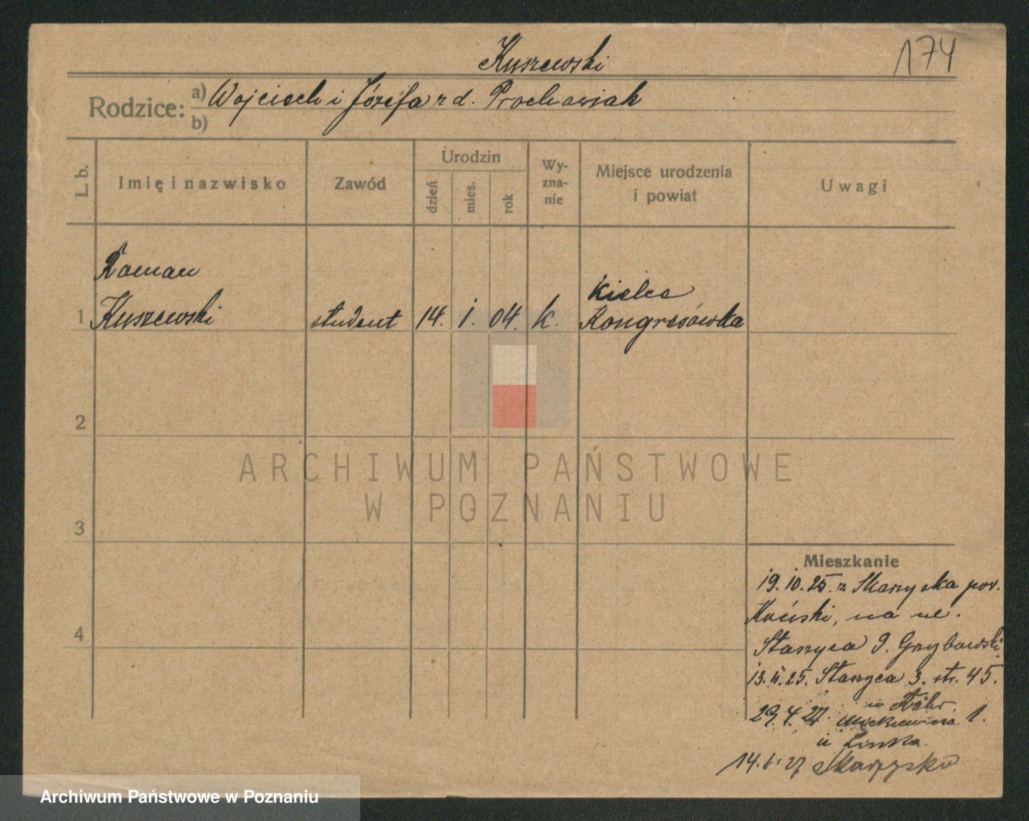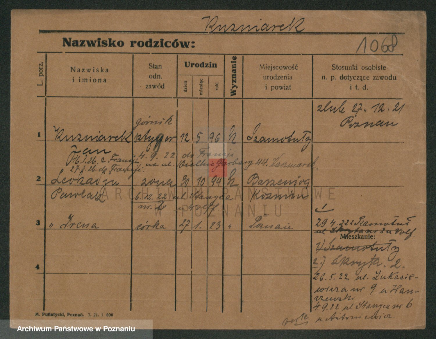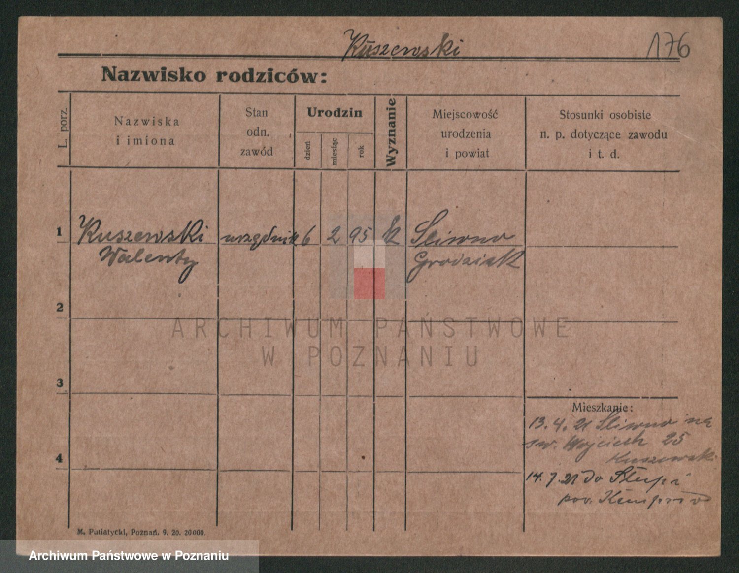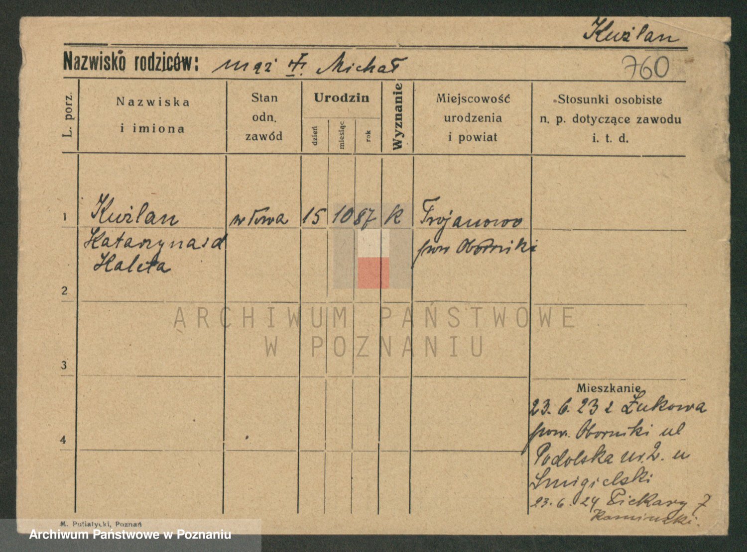 Podgląd karty osobowej dostępny jest po kliknięciu na nazwisko lub ikonkę karty. Można dokonywać powiększenia (ikony na górze) lub przechodzić między kolejnymi skanami (strzałki po bokach).