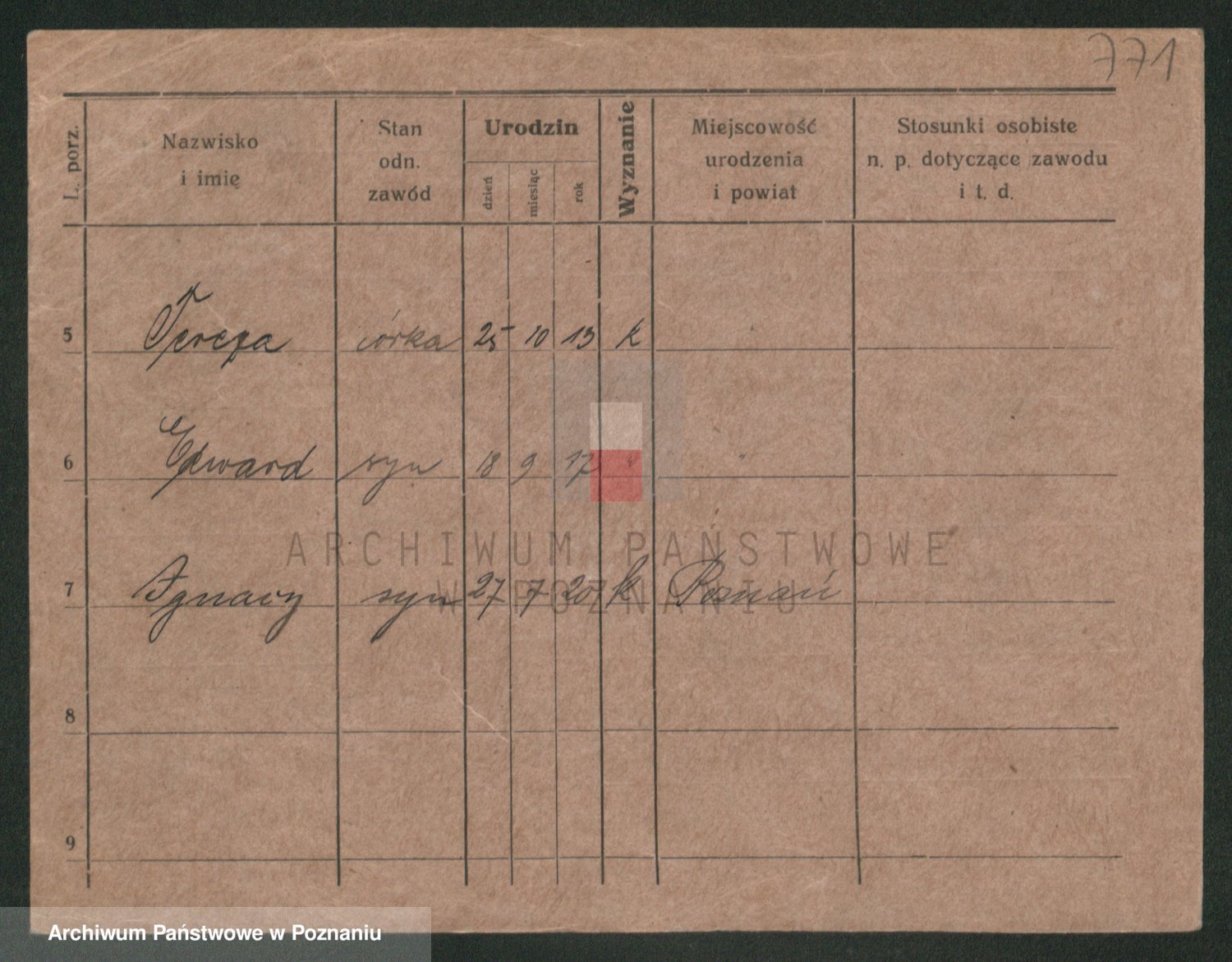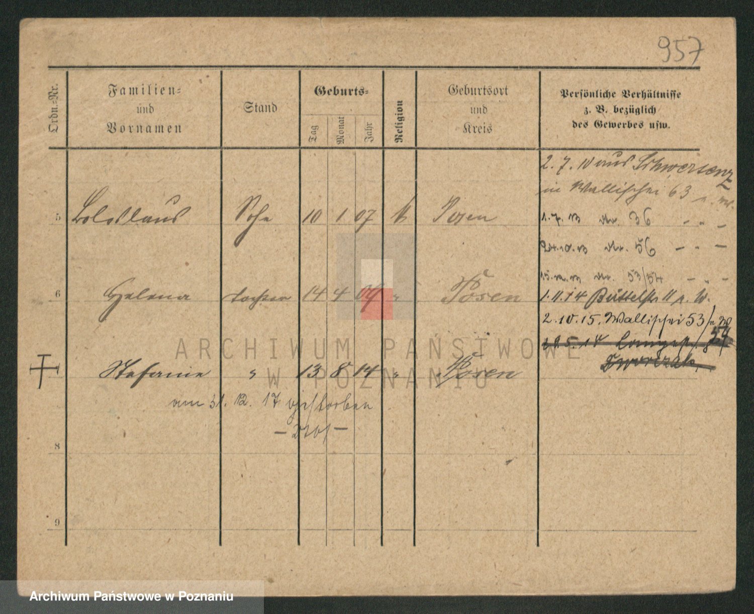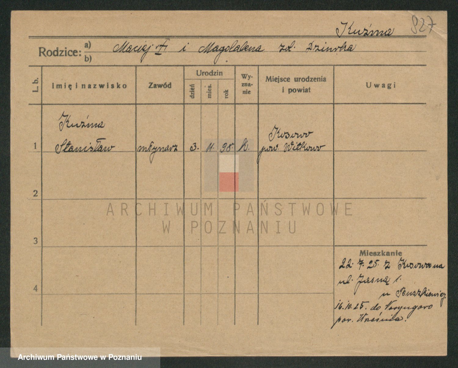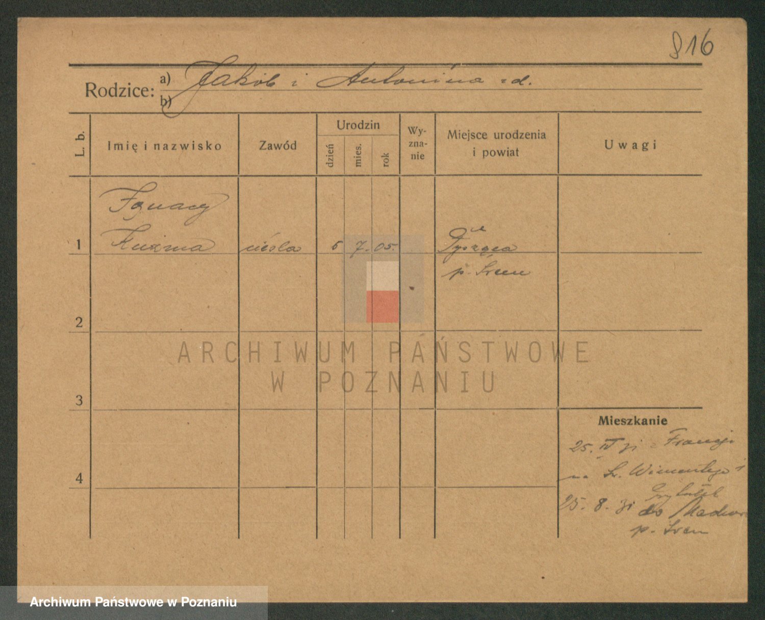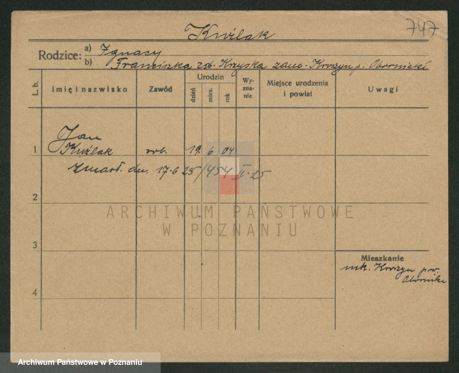 Podgląd karty osobowej dostępny jest po kliknięciu na nazwisko lub ikonkę karty. Można dokonywać powiększenia (ikony na górze) lub przechodzić między kolejnymi skanami (strzałki po bokach).