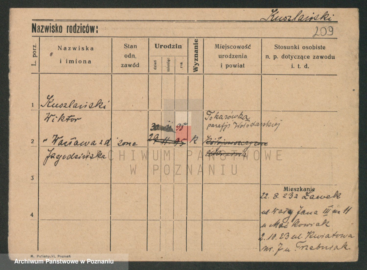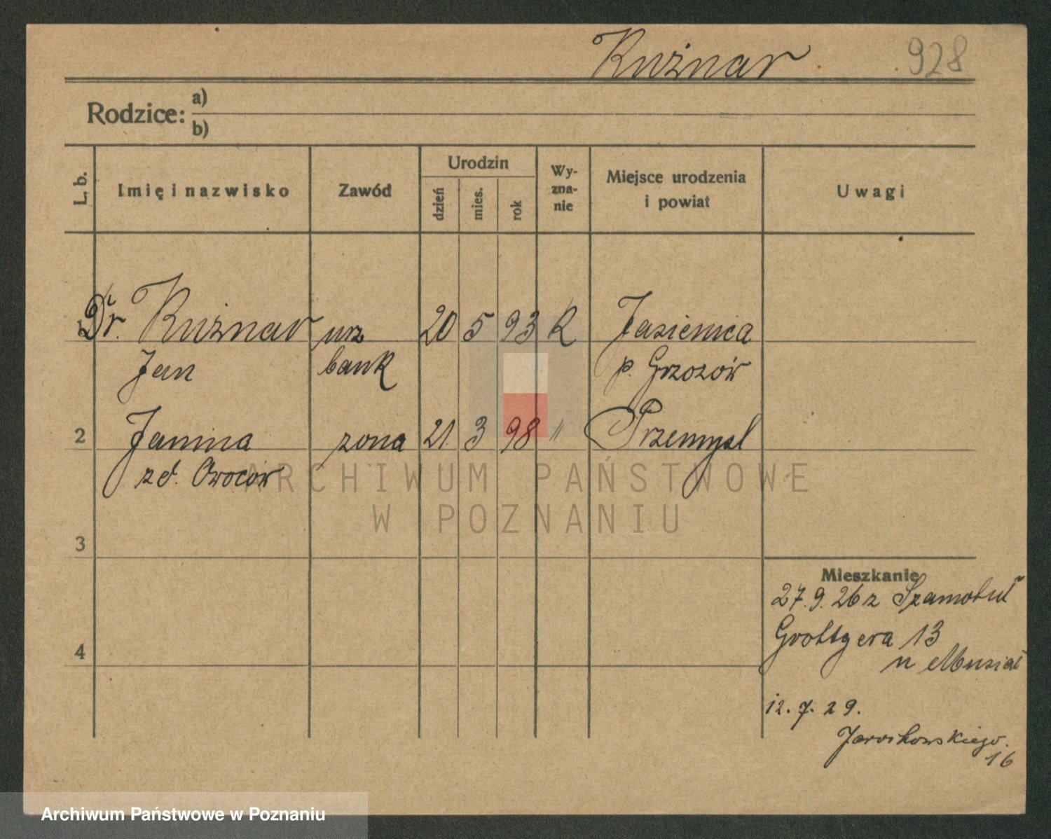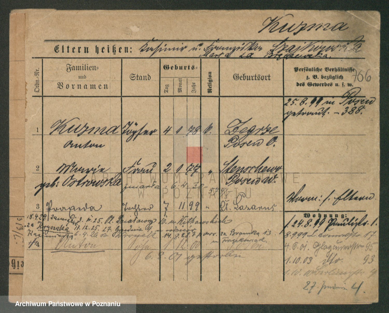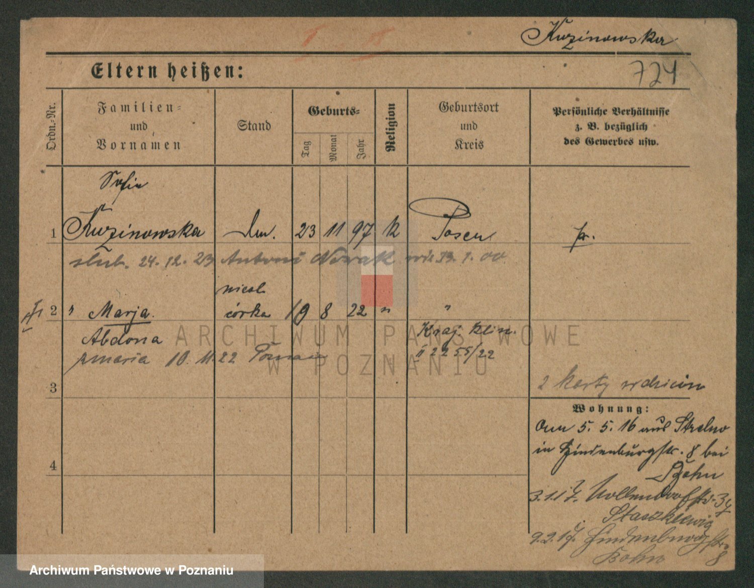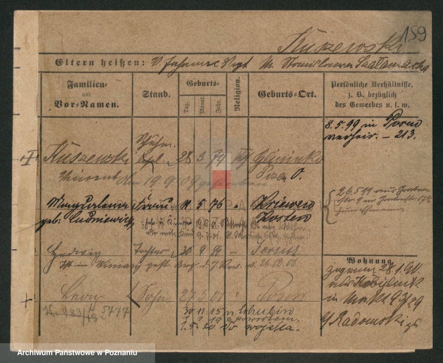 Podgląd karty osobowej dostępny jest po kliknięciu na nazwisko lub ikonkę karty. Można dokonywać powiększenia (ikony na górze) lub przechodzić między kolejnymi skanami (strzałki po bokach).