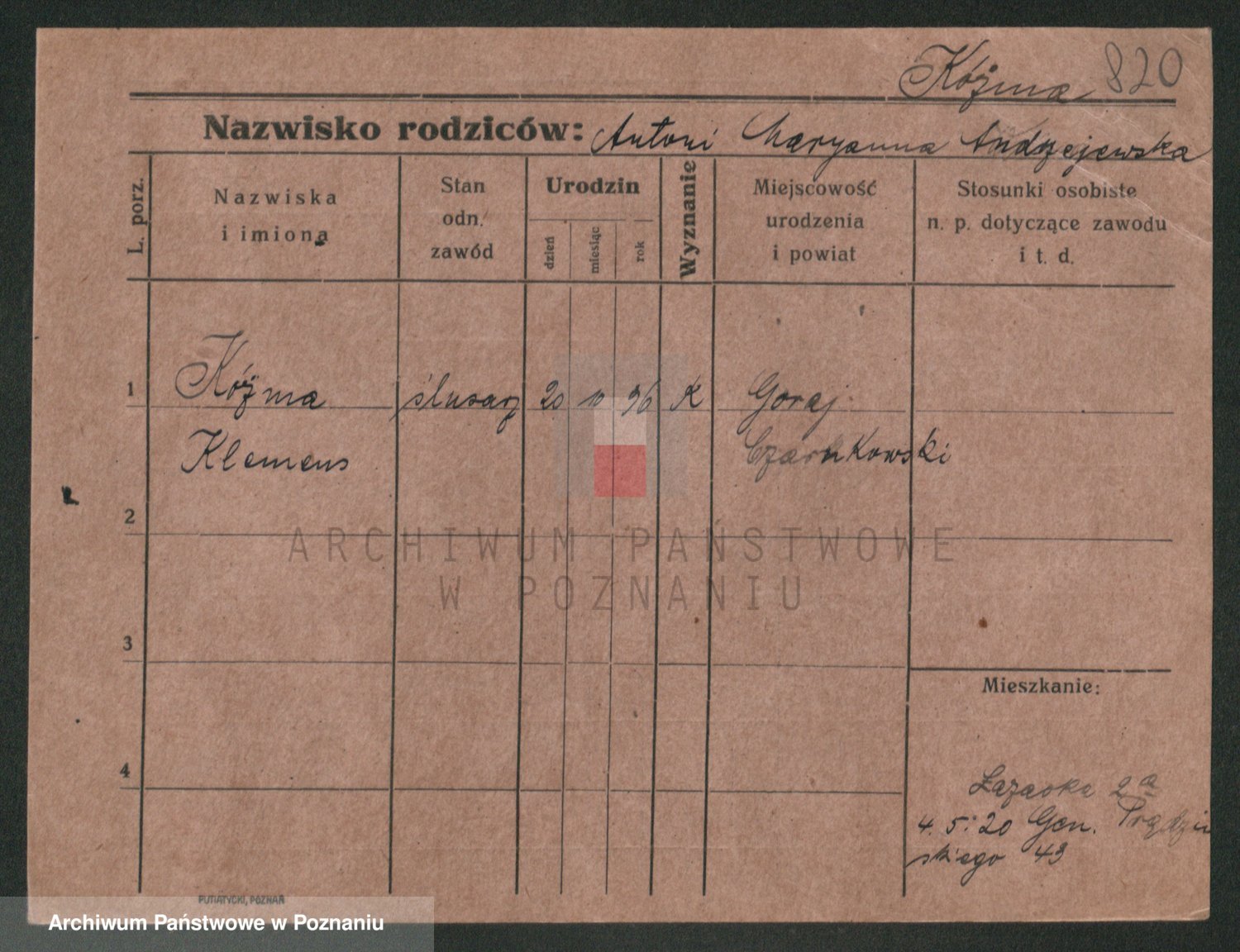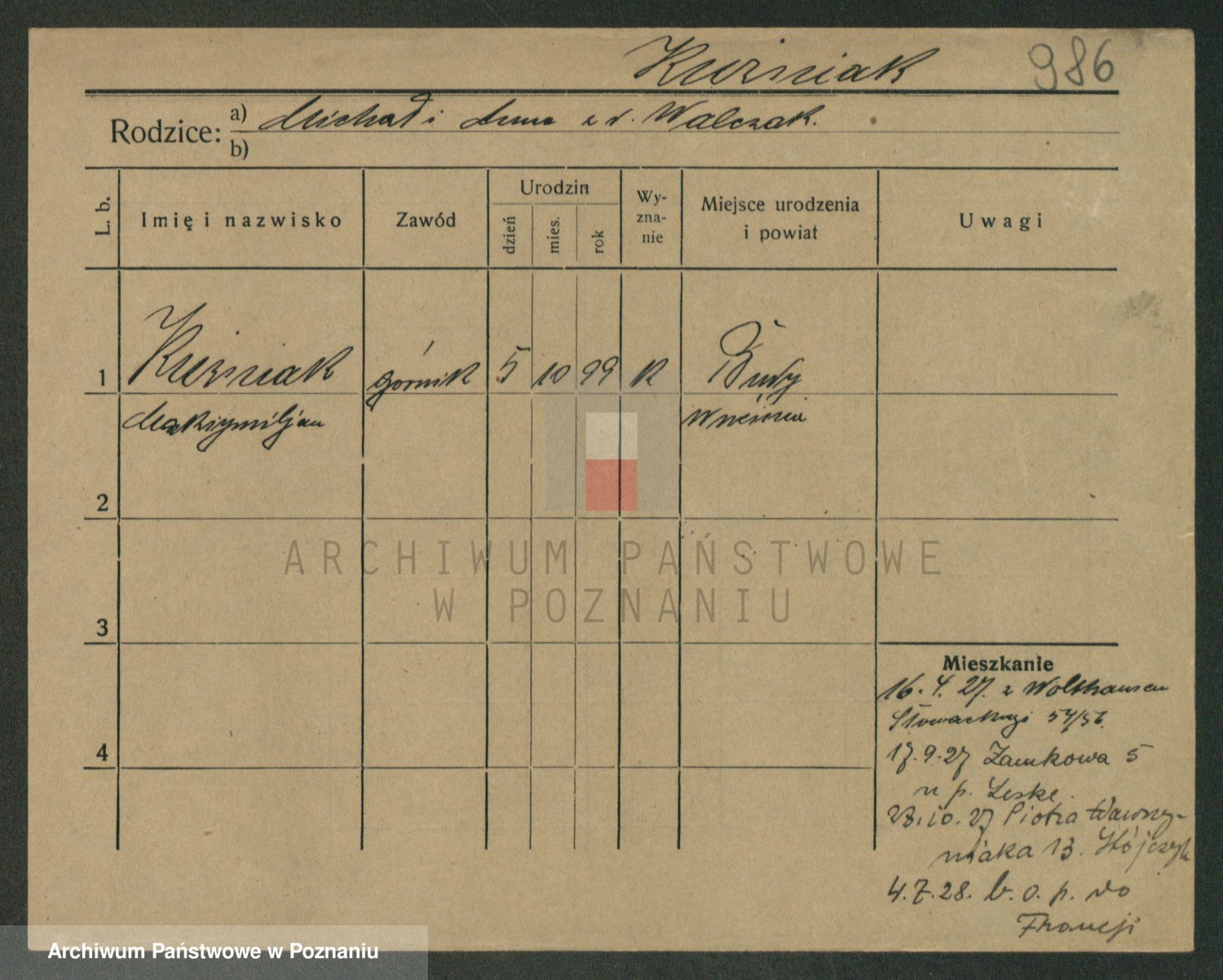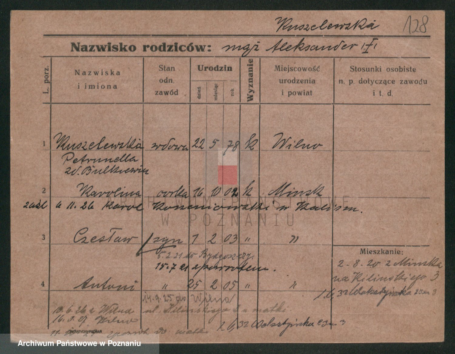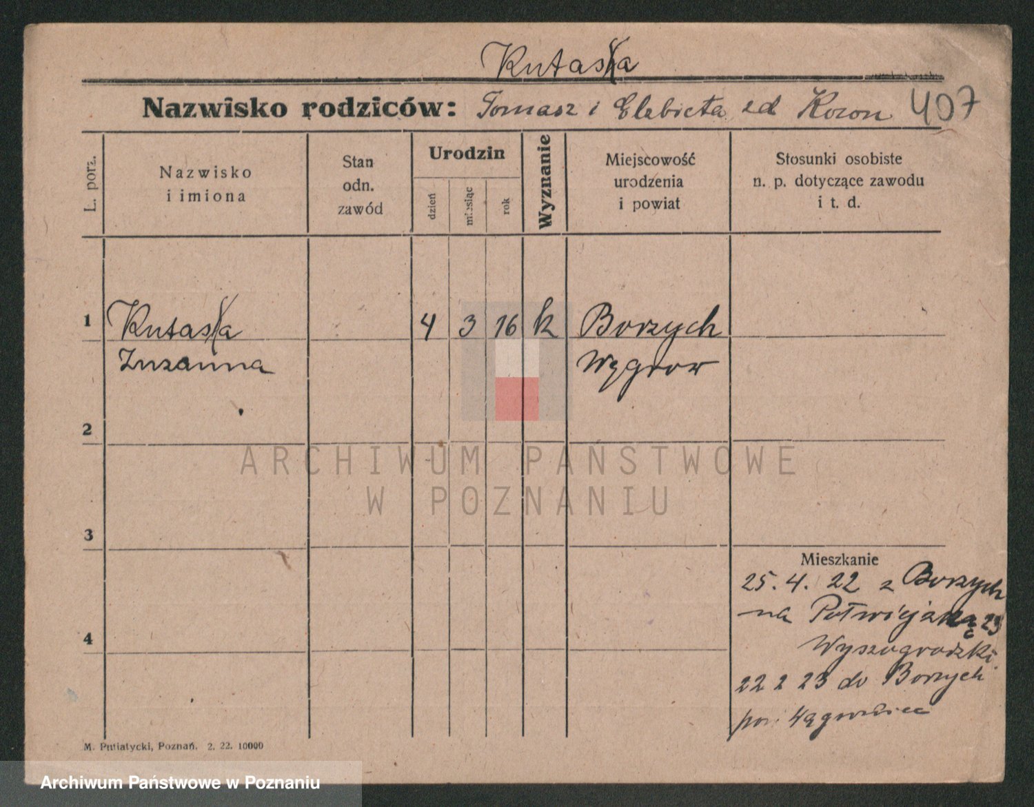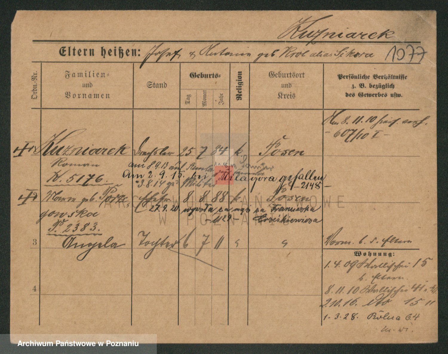 Podgląd karty osobowej dostępny jest po kliknięciu na nazwisko lub ikonkę karty. Można dokonywać powiększenia (ikony na górze) lub przechodzić między kolejnymi skanami (strzałki po bokach).