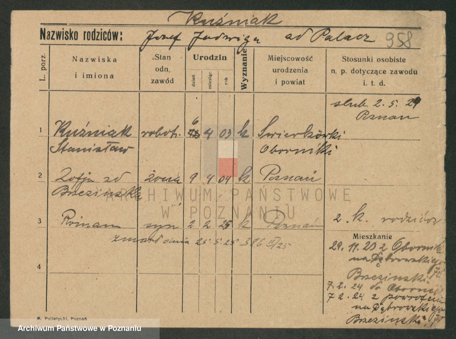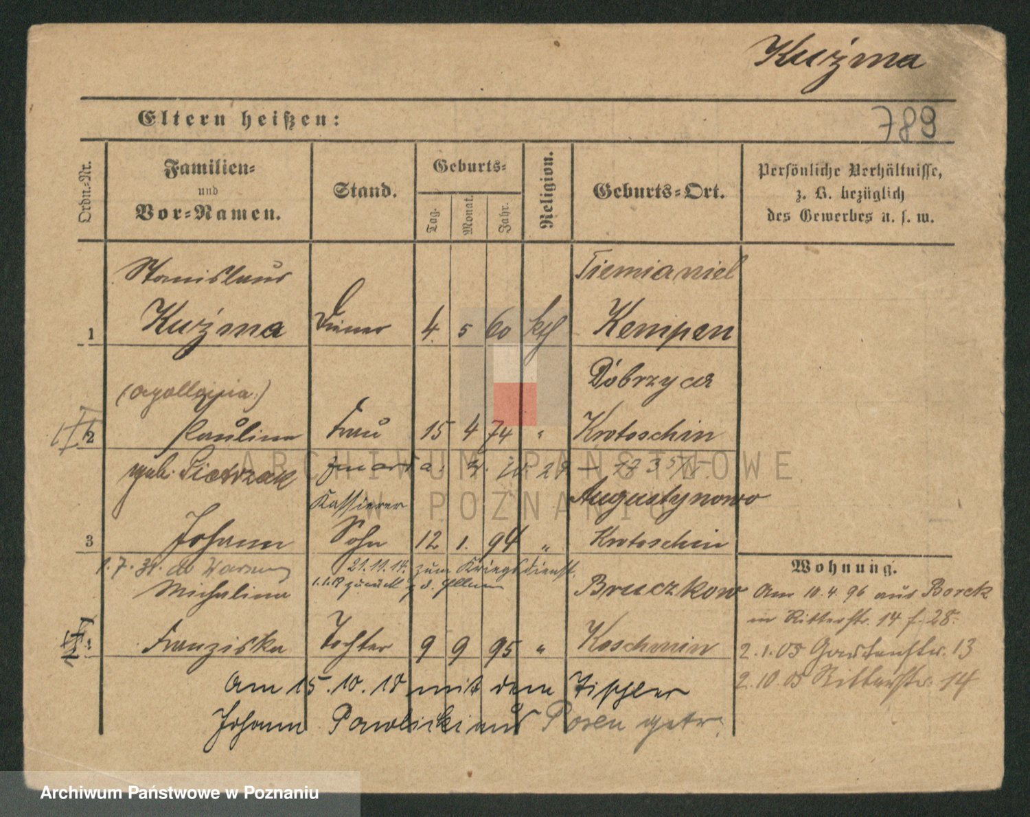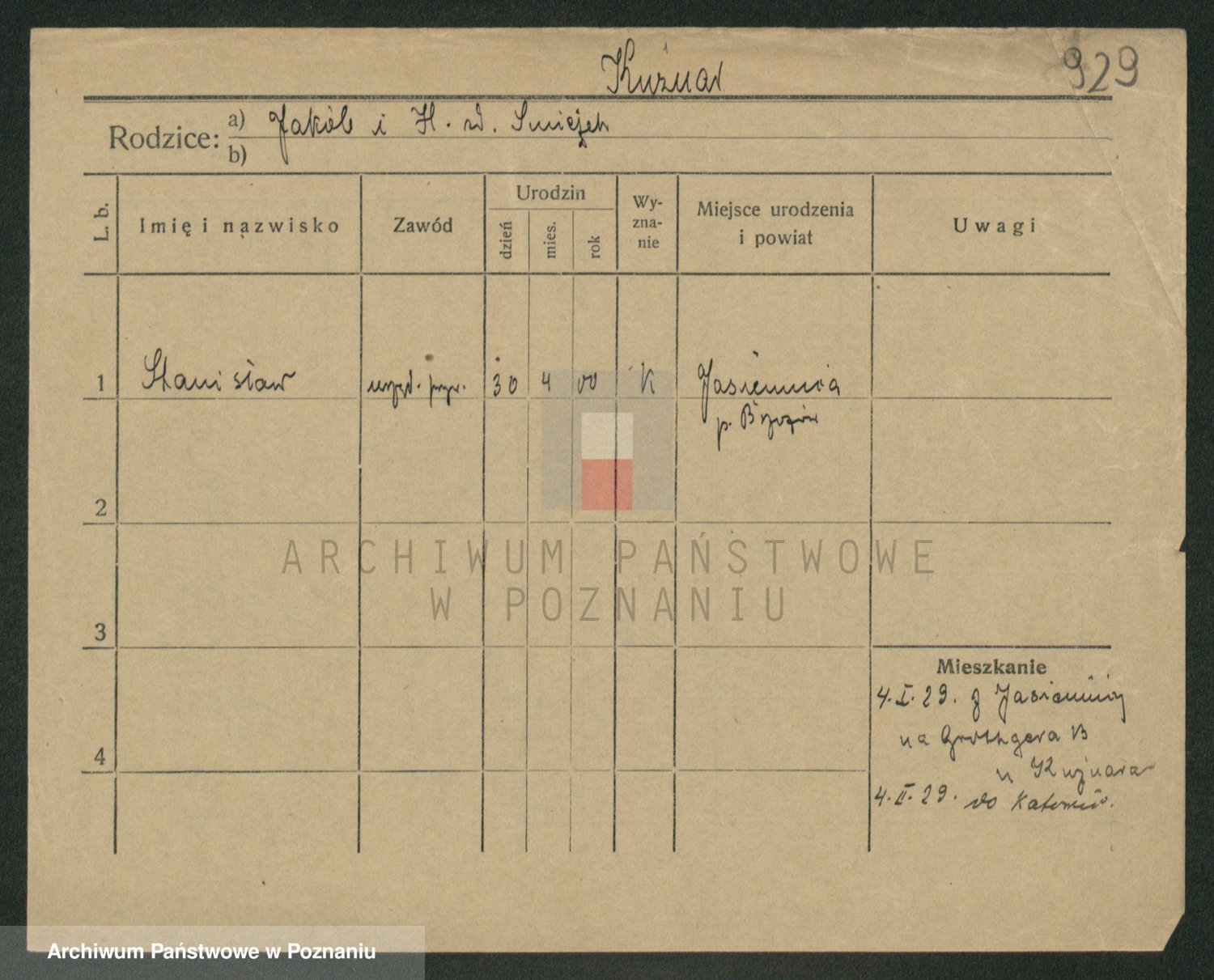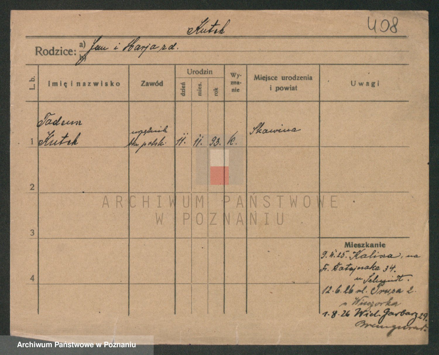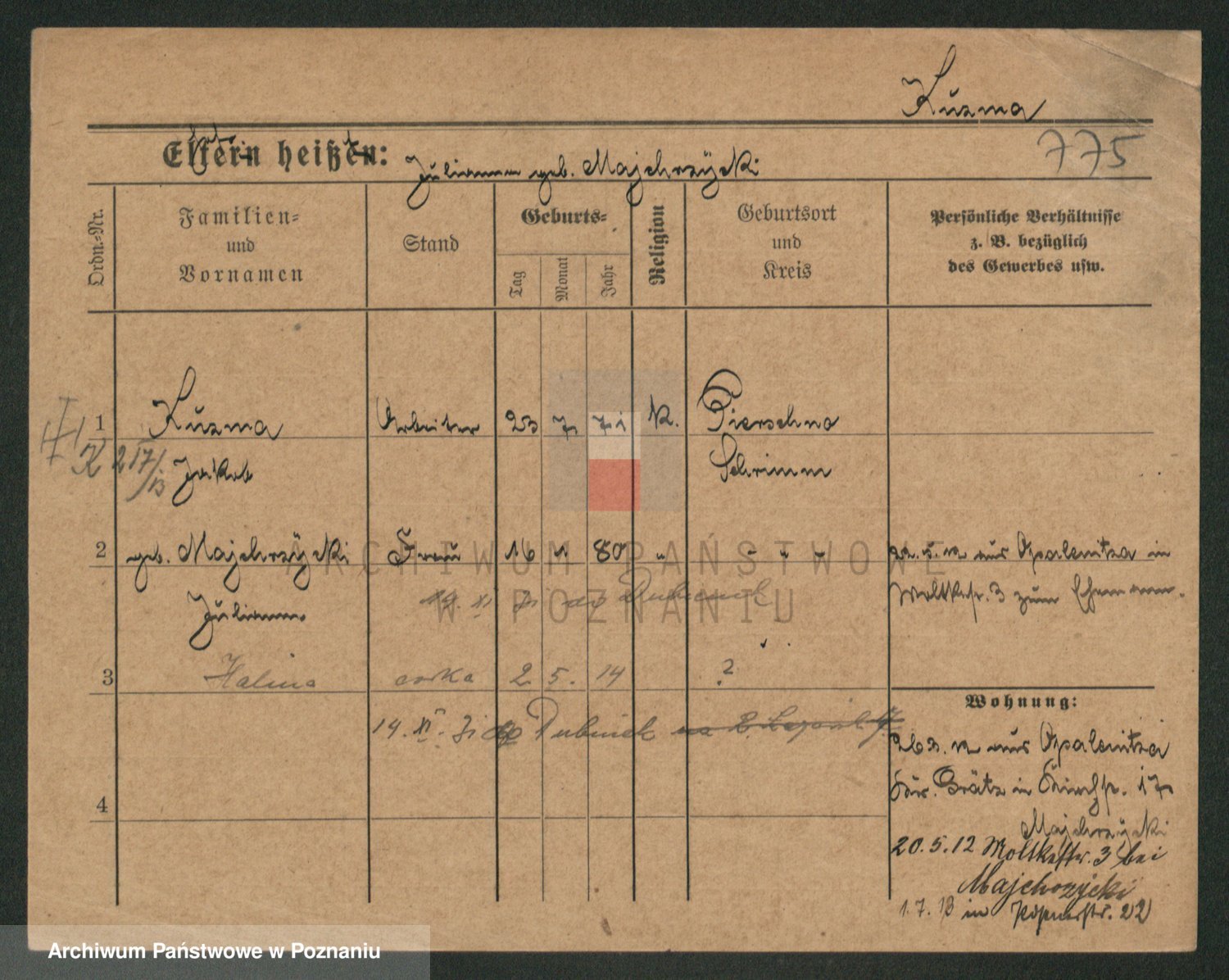 Podgląd karty osobowej dostępny jest po kliknięciu na nazwisko lub ikonkę karty. Można dokonywać powiększenia (ikony na górze) lub przechodzić między kolejnymi skanami (strzałki po bokach).