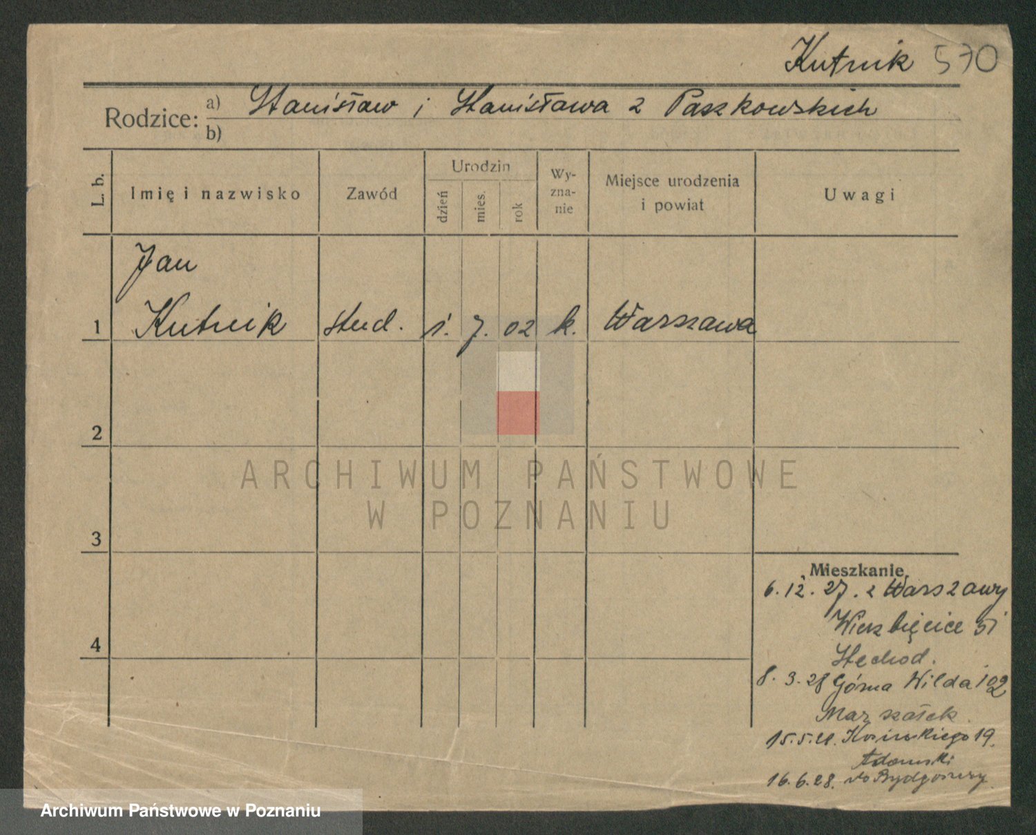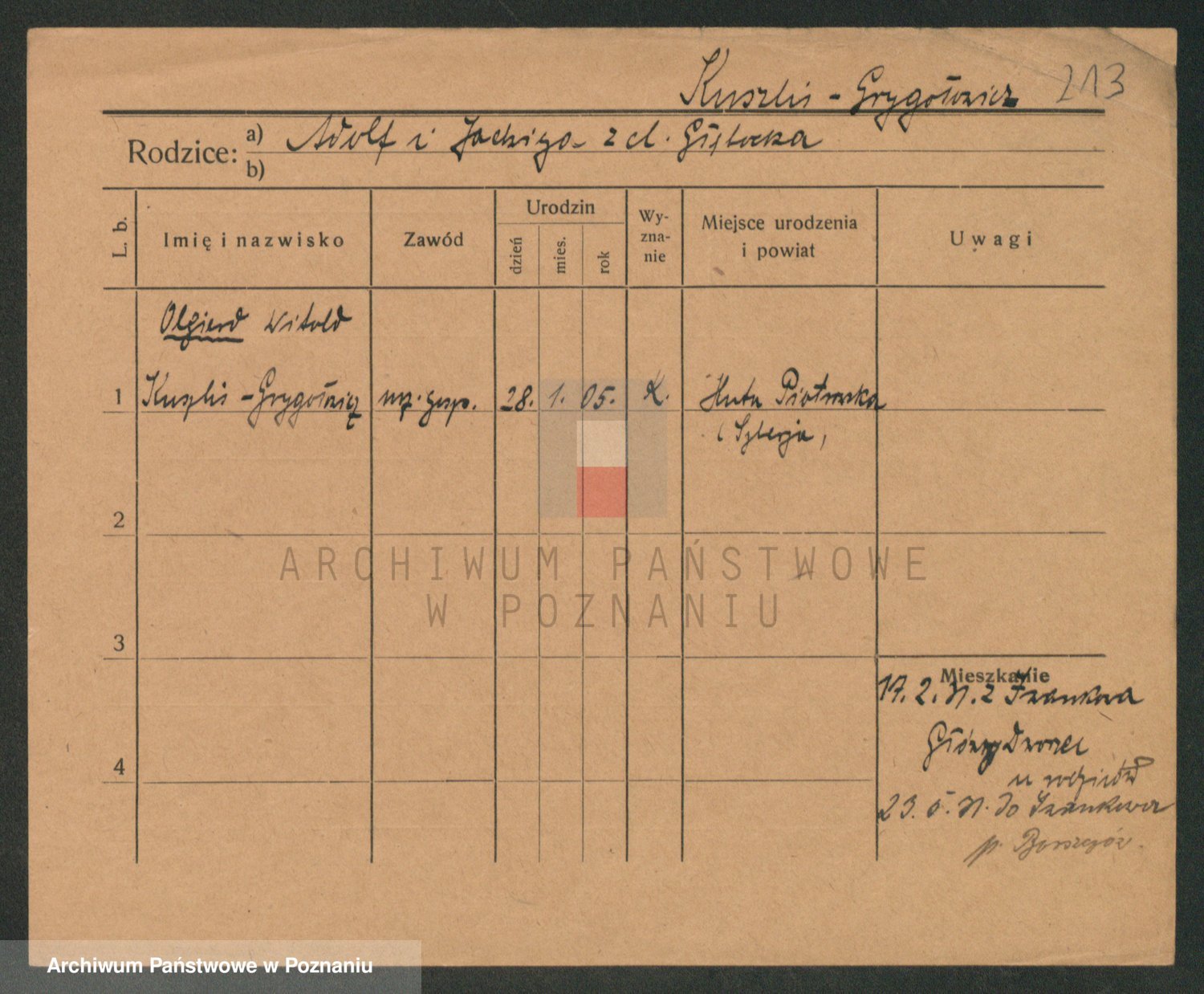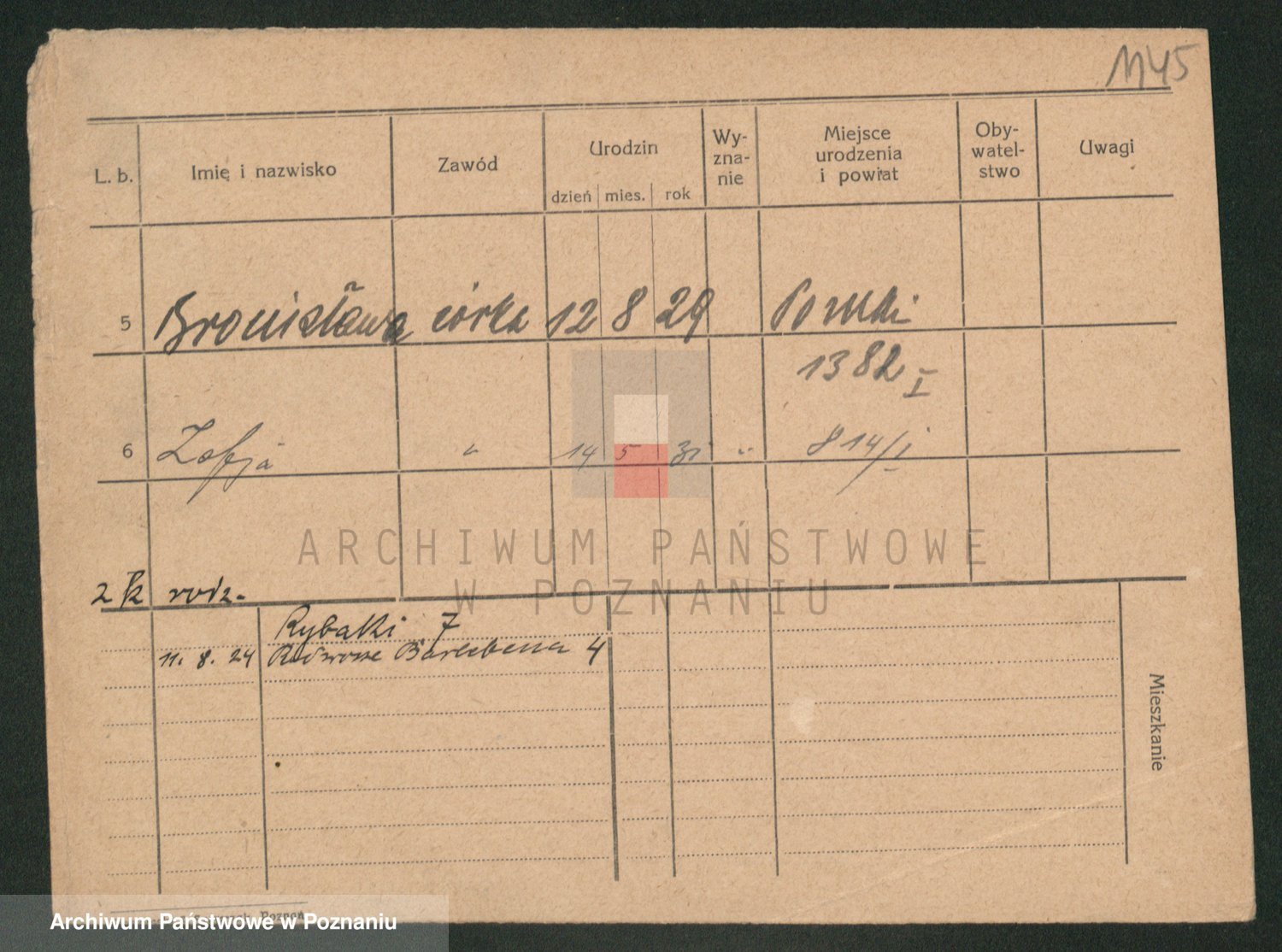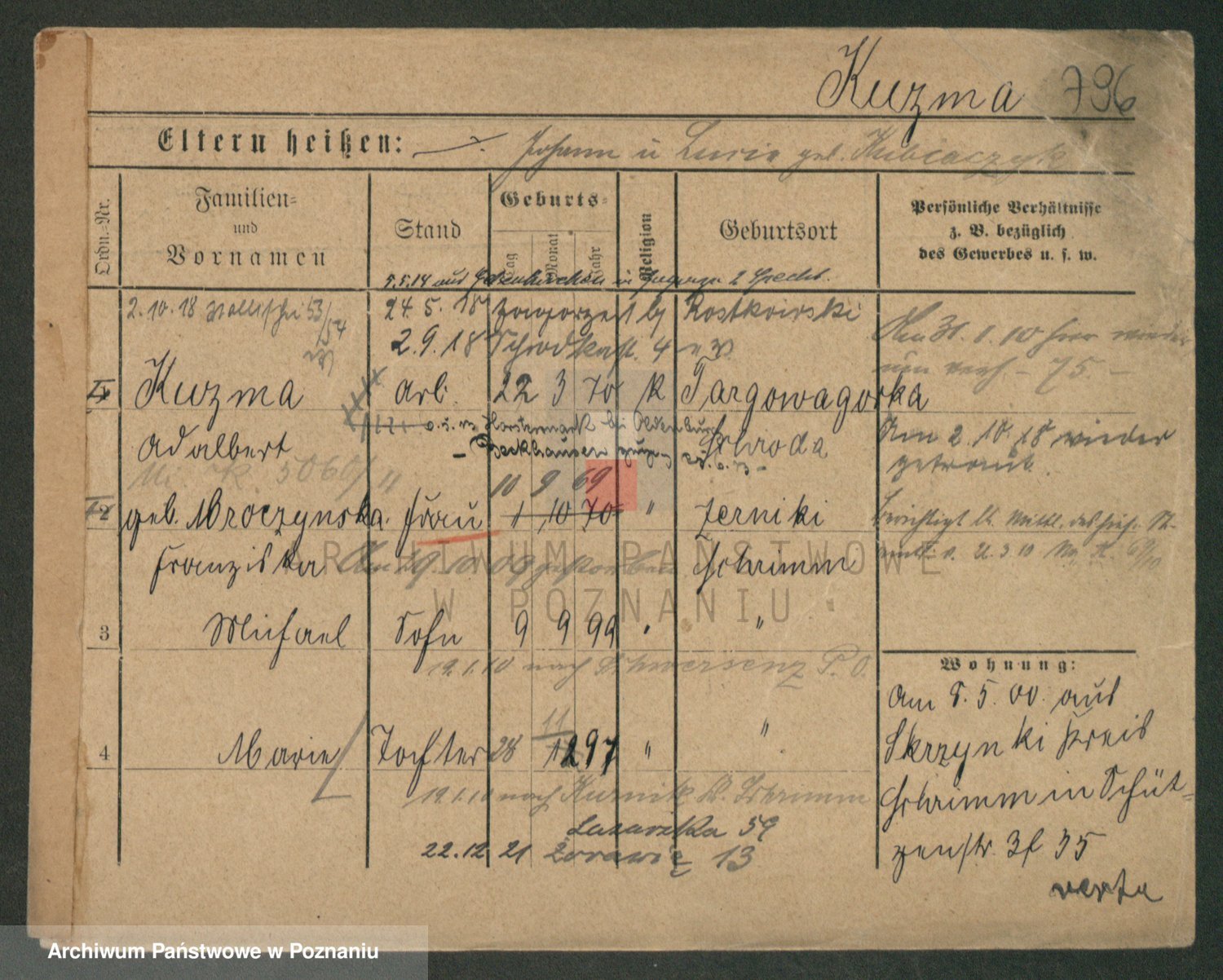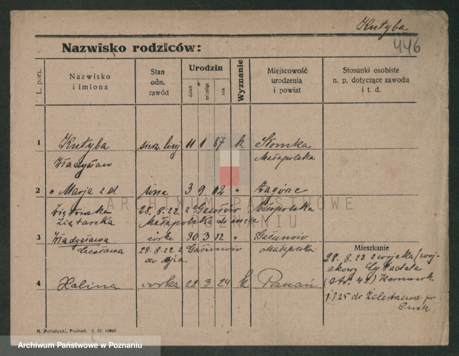 Podgląd karty osobowej dostępny jest po kliknięciu na nazwisko lub ikonkę karty. Można dokonywać powiększenia (ikony na górze) lub przechodzić między kolejnymi skanami (strzałki po bokach).