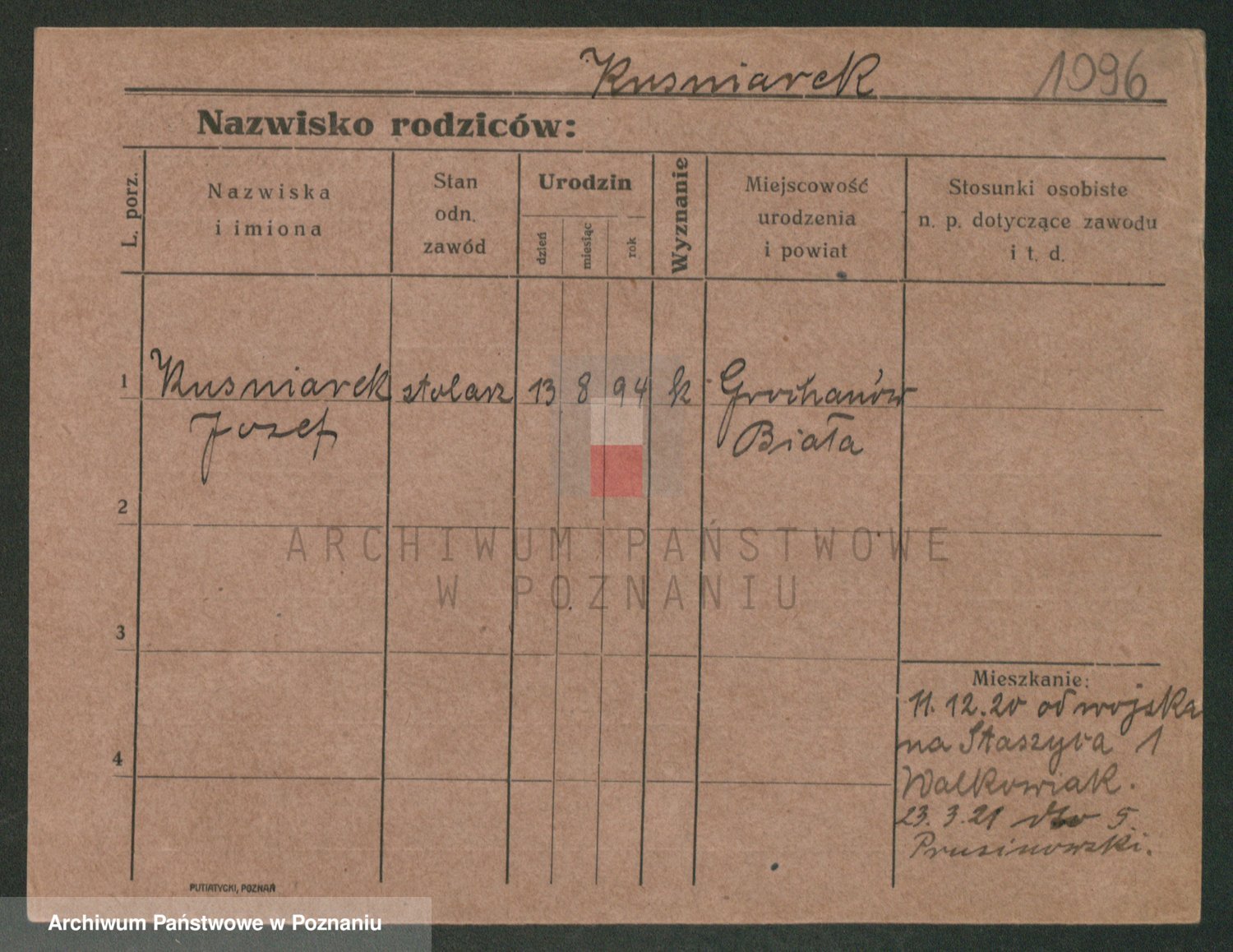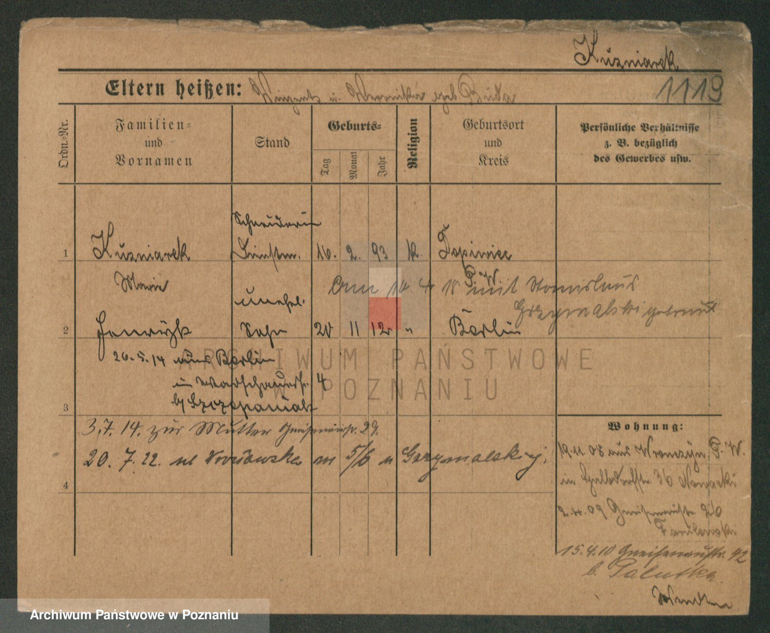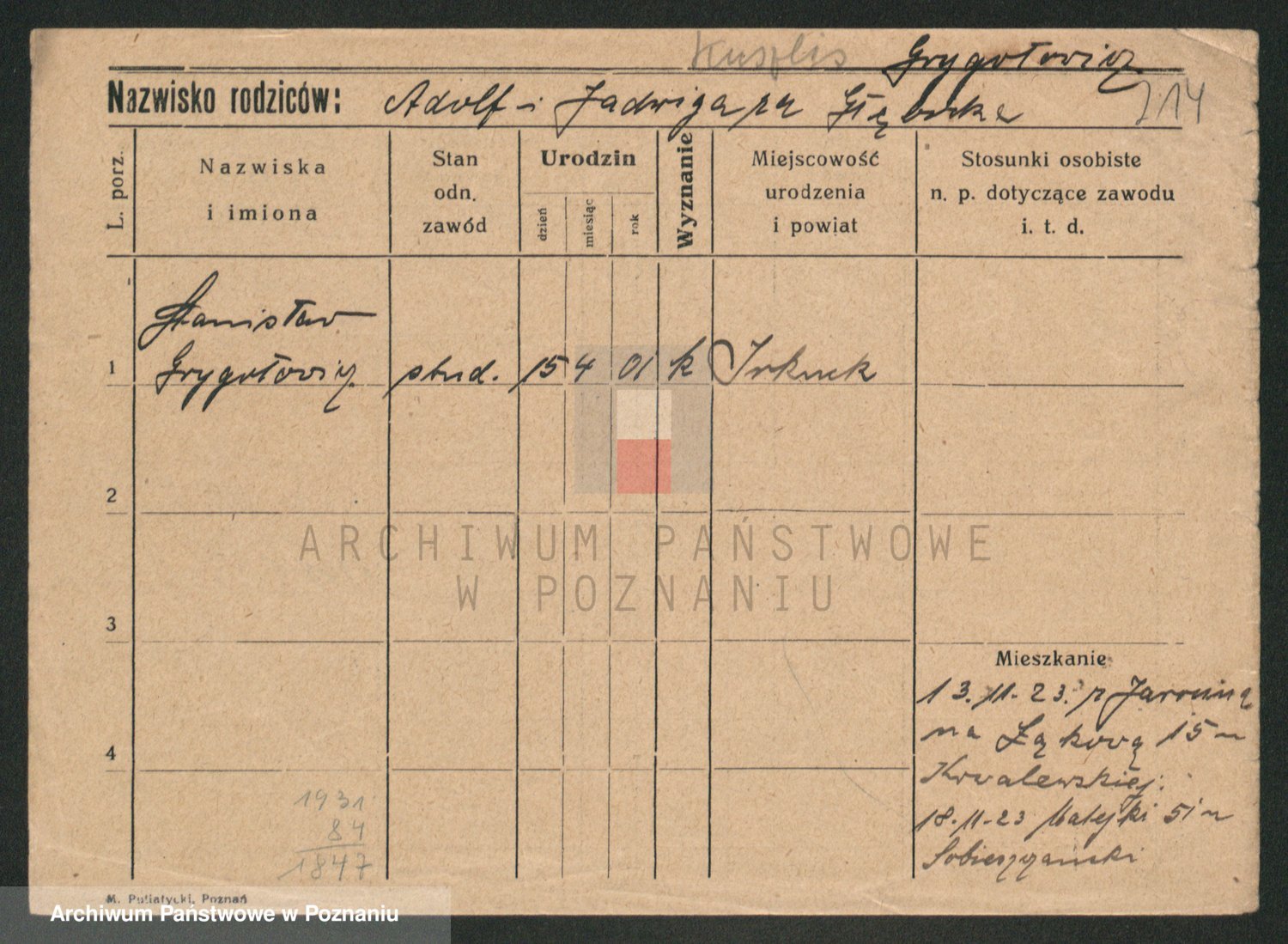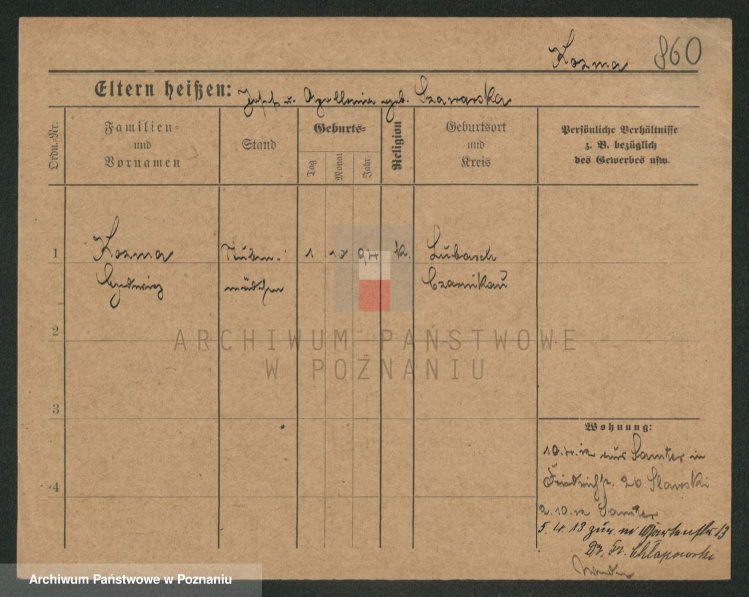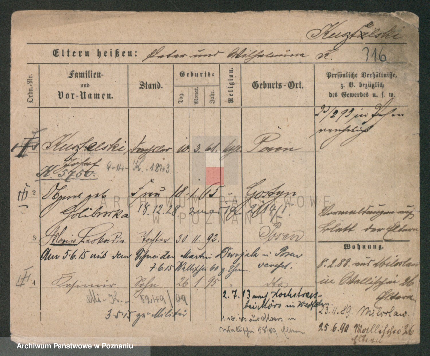Podgląd karty osobowej dostępny jest po kliknięciu na nazwisko lub ikonkę karty. Można dokonywać powiększenia (ikony na górze) lub przechodzić między kolejnymi skanami (strzałki po bokach).