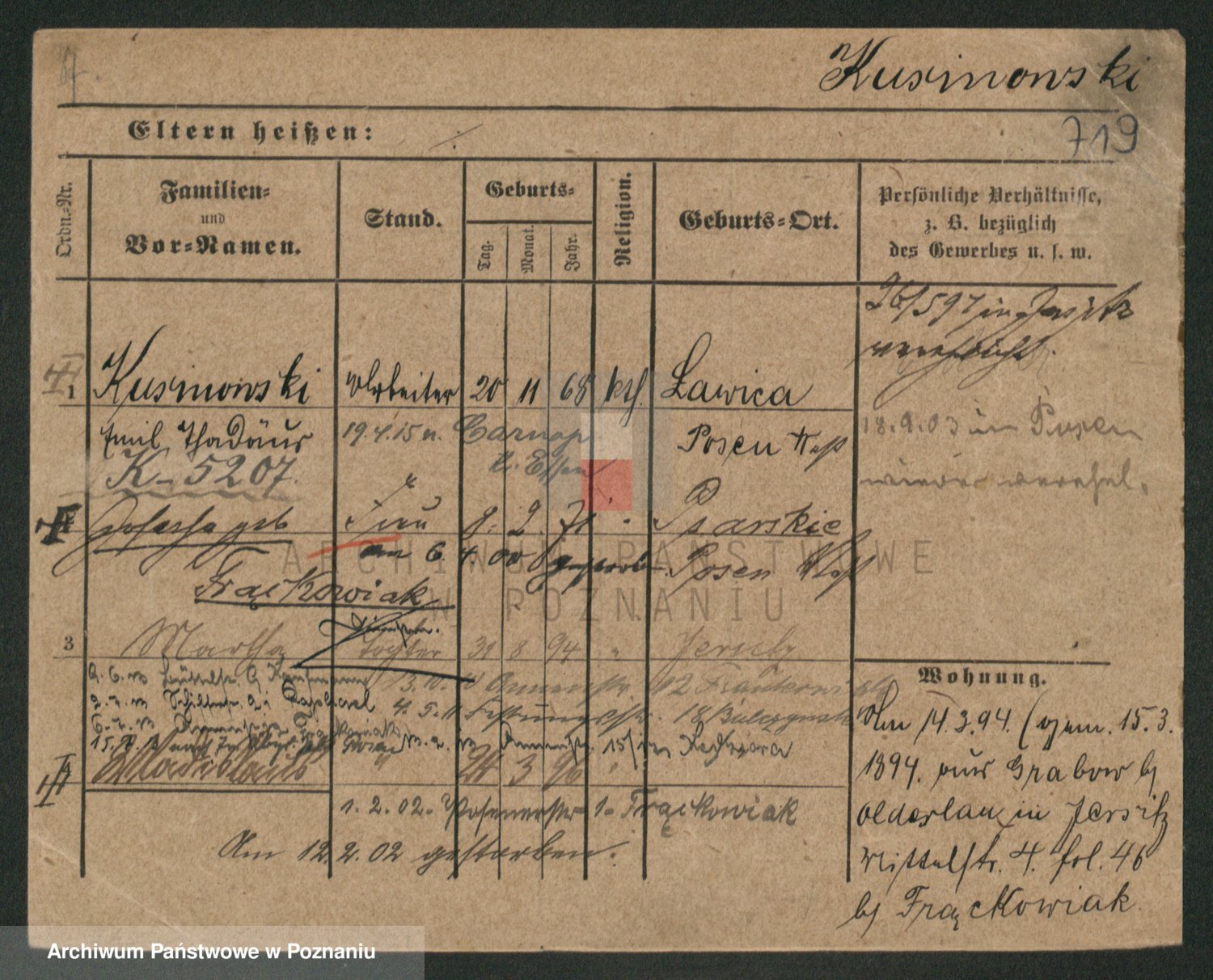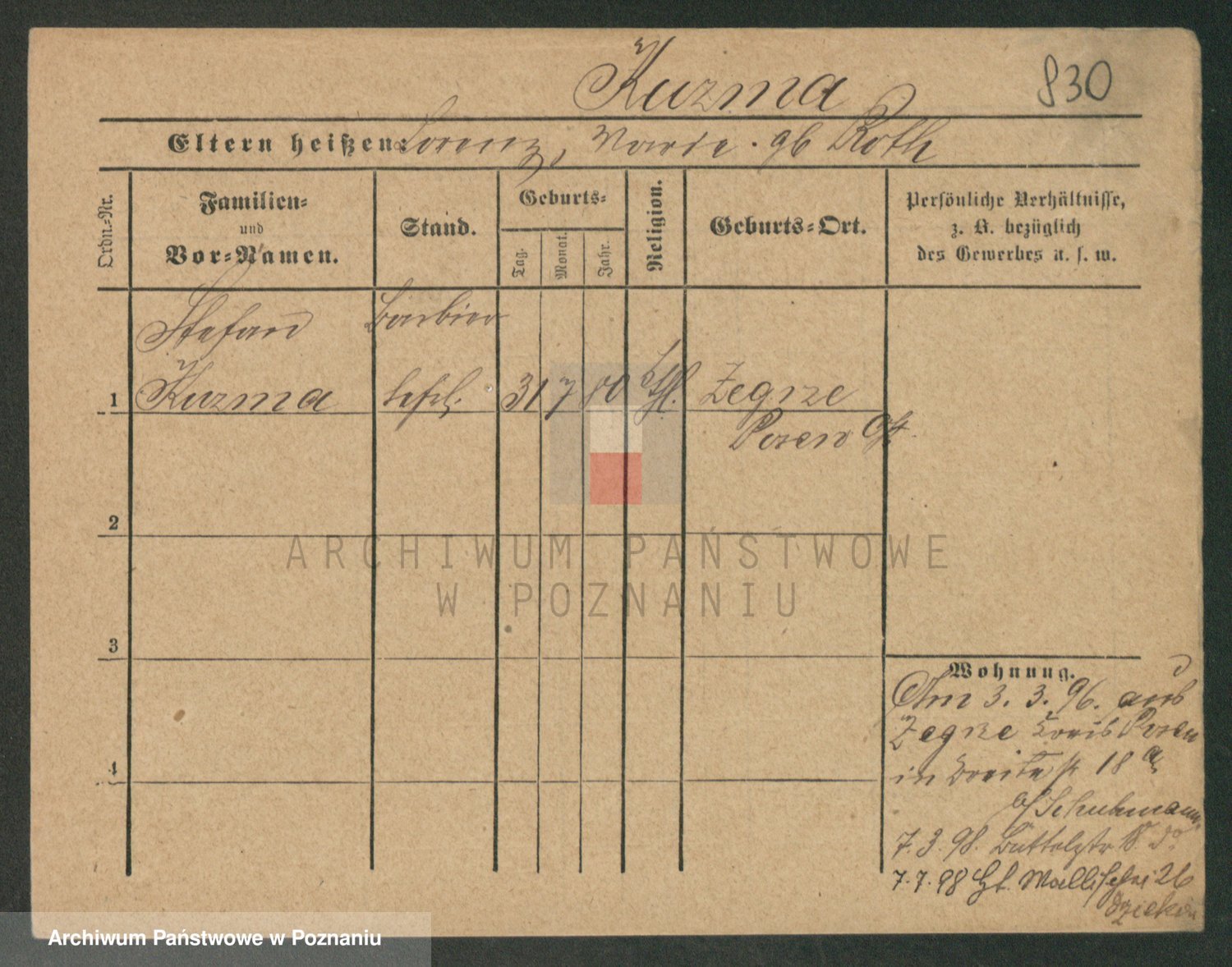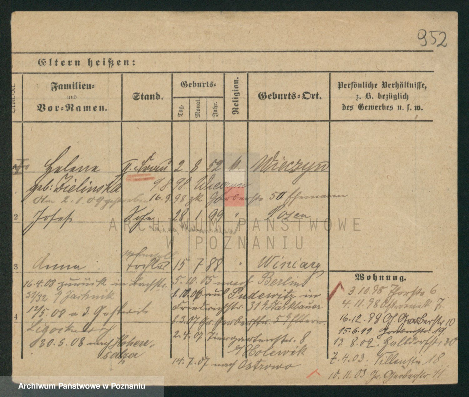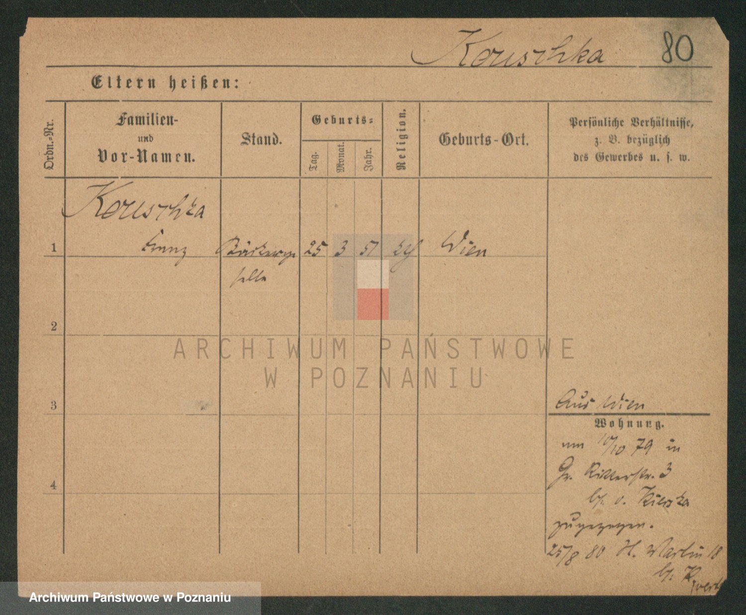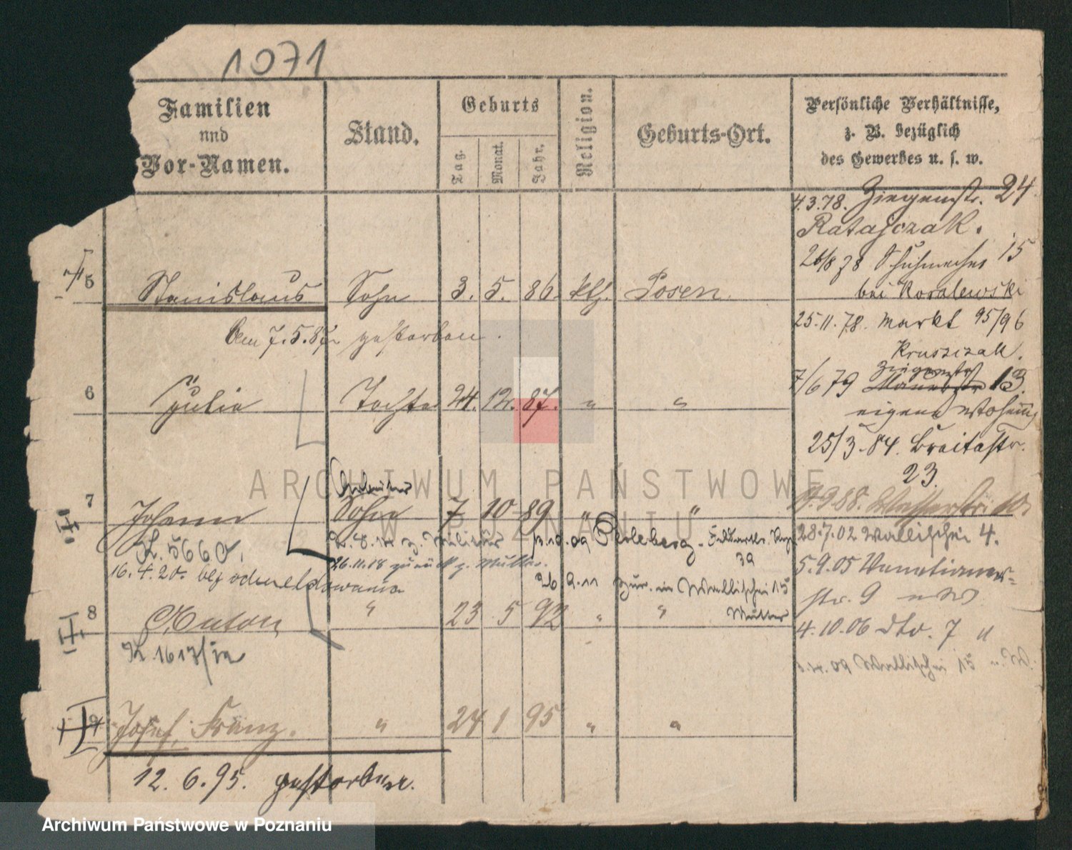 Podgląd karty osobowej dostępny jest po kliknięciu na nazwisko lub ikonkę karty. Można dokonywać powiększenia (ikony na górze) lub przechodzić między kolejnymi skanami (strzałki po bokach).