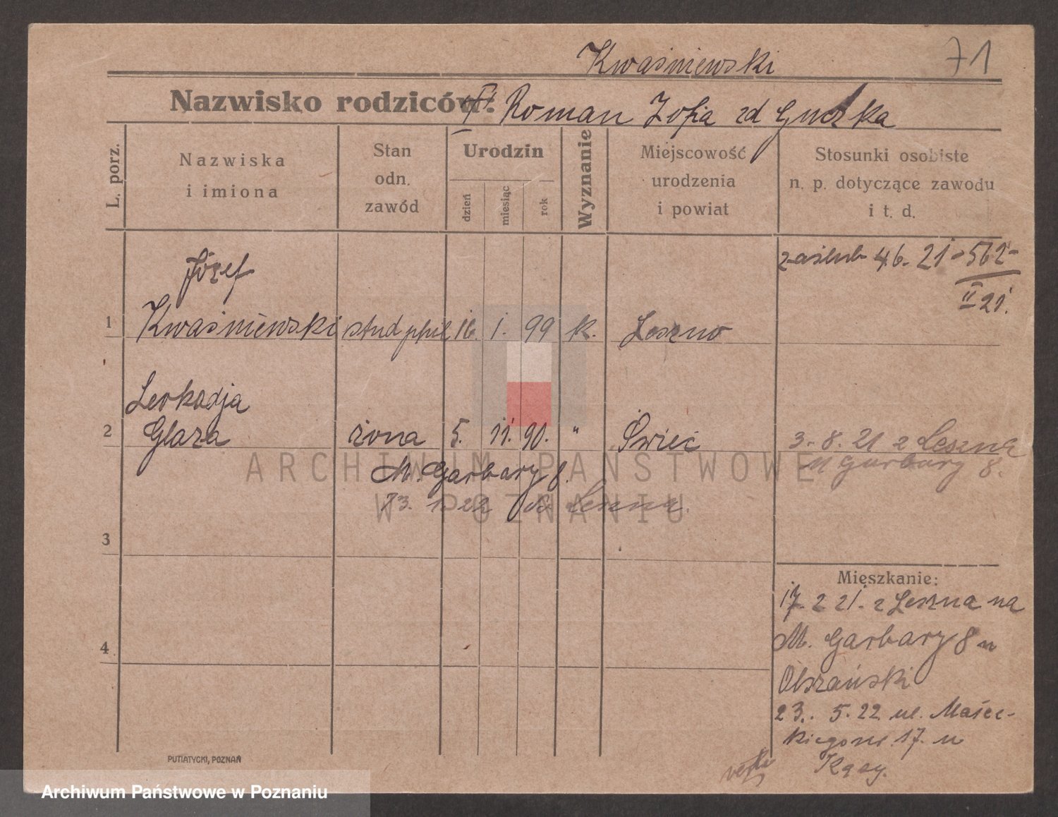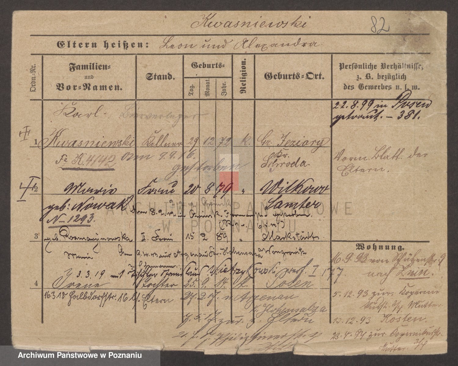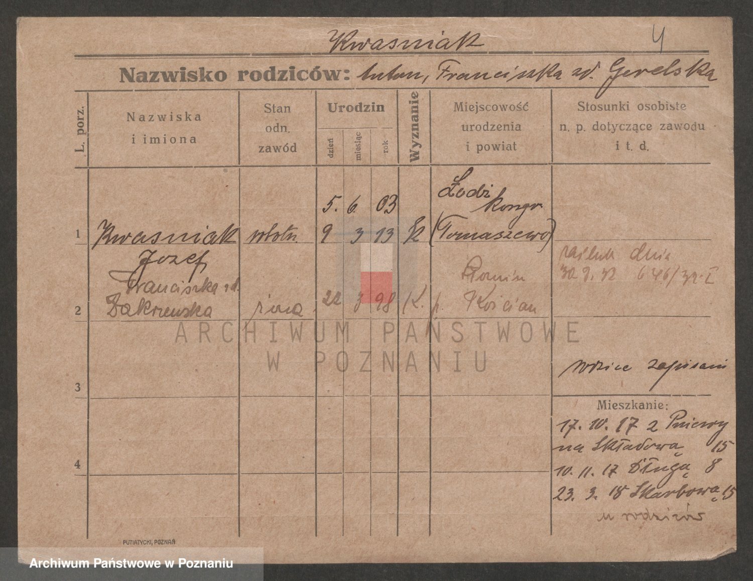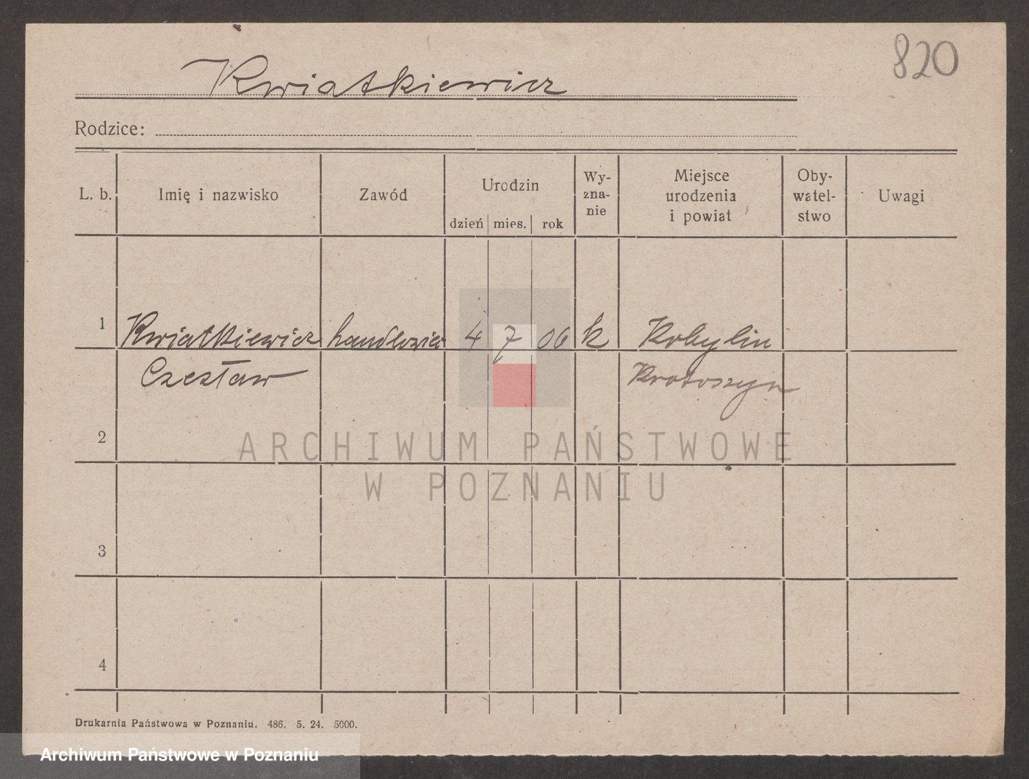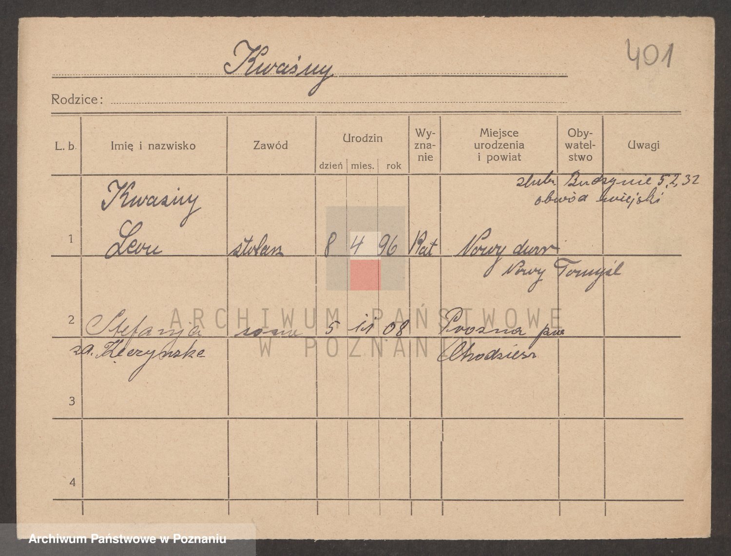 Podgląd karty osobowej dostępny jest po kliknięciu na nazwisko lub ikonkę karty. Można dokonywać powiększenia (ikony na górze) lub przechodzić między kolejnymi skanami (strzałki po bokach).