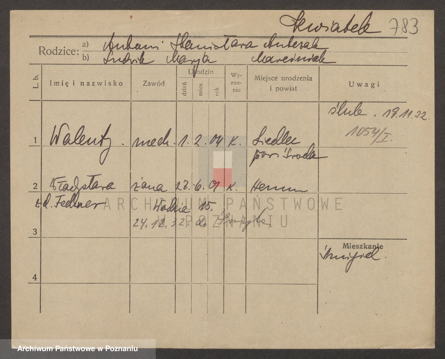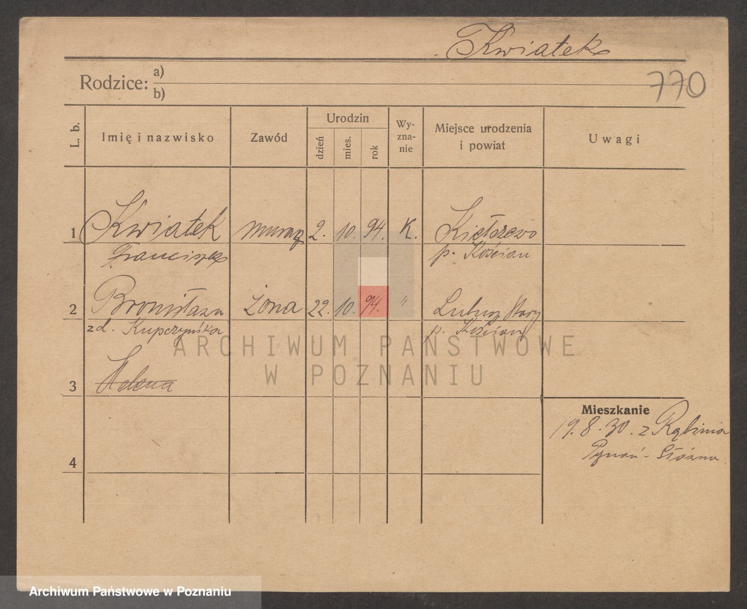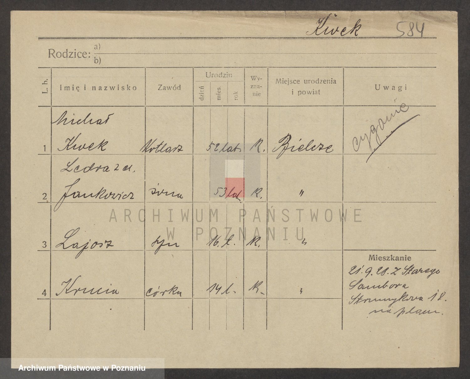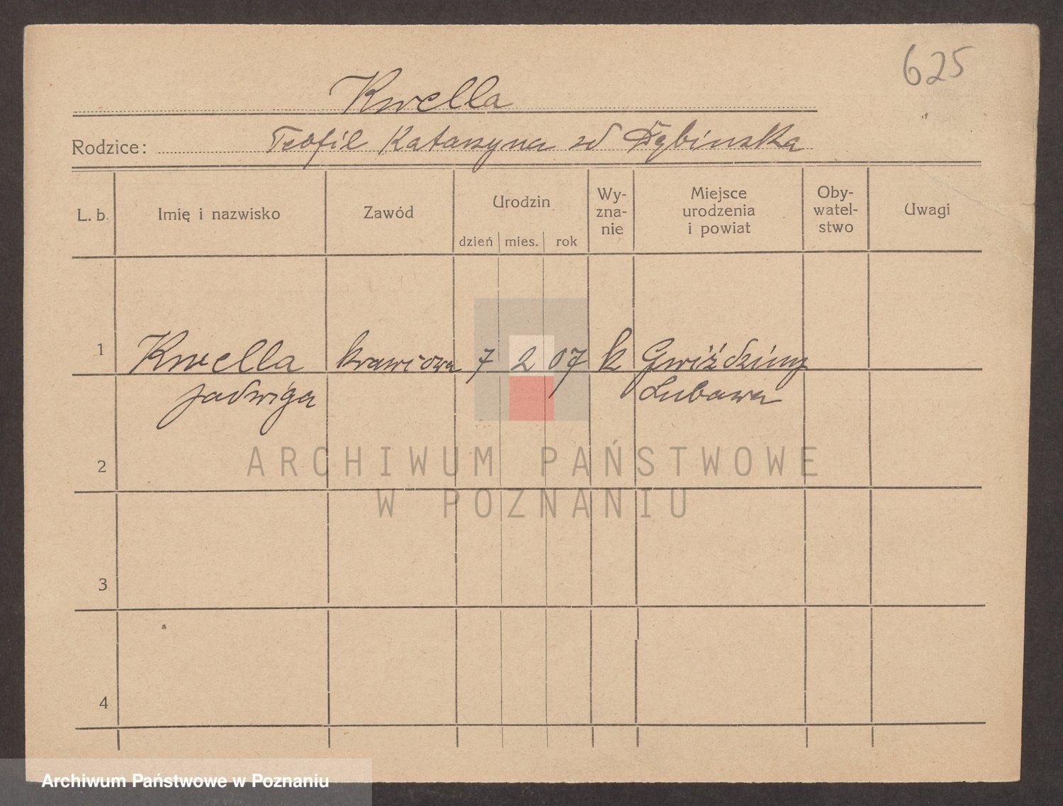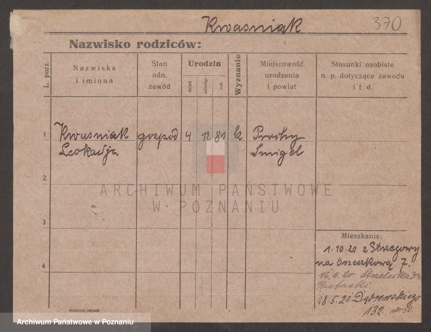Podgląd karty osobowej dostępny jest po kliknięciu na nazwisko lub ikonkę karty. Można dokonywać powiększenia (ikony na górze) lub przechodzić między kolejnymi skanami (strzałki po bokach).