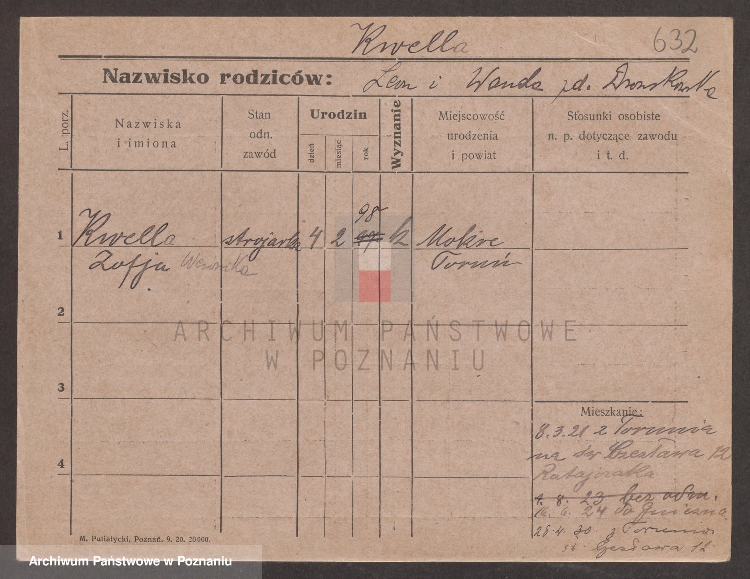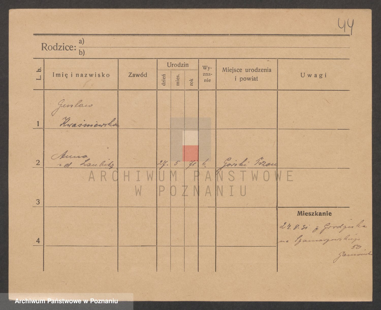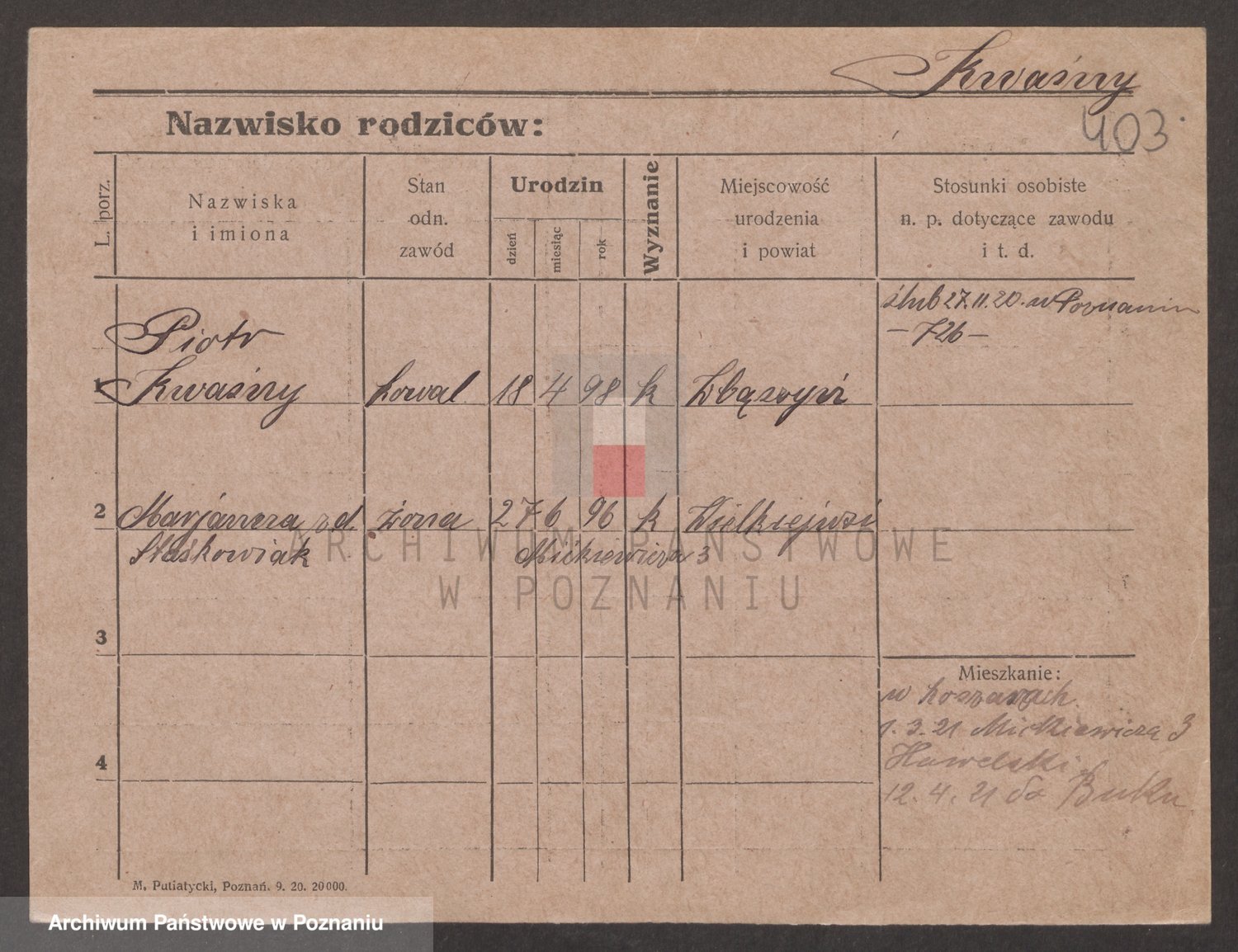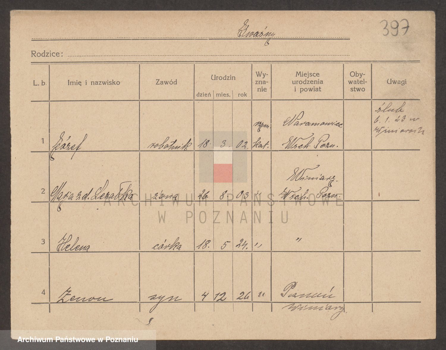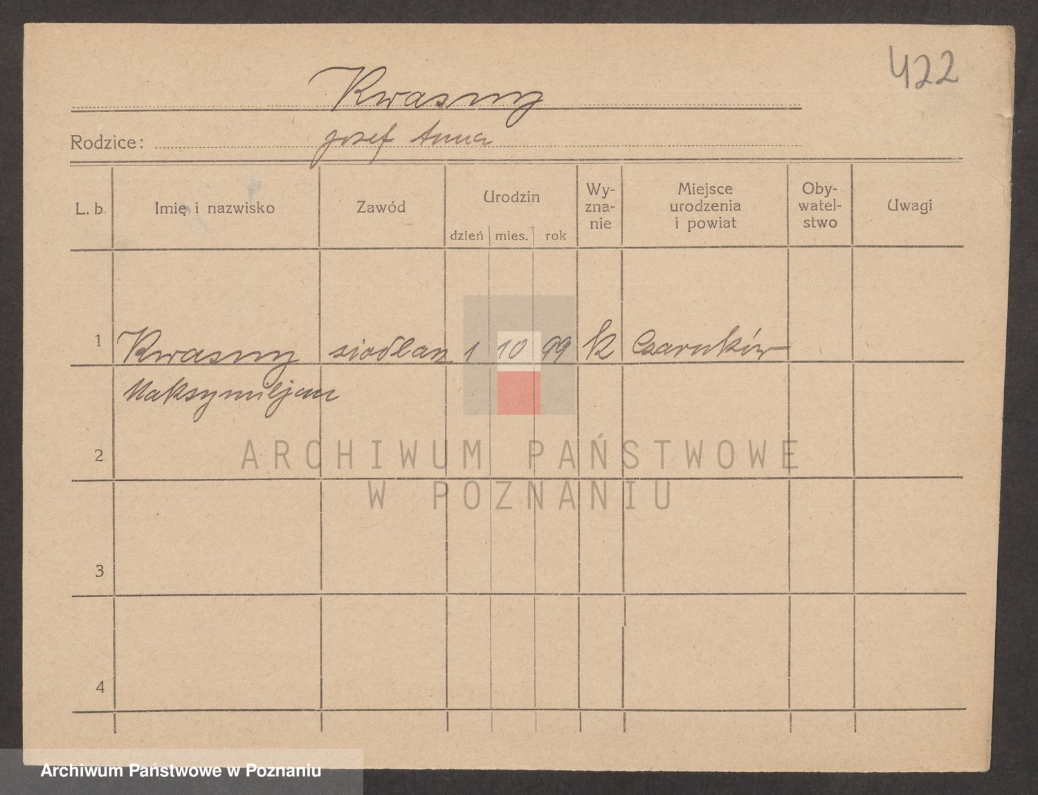 Podgląd karty osobowej dostępny jest po kliknięciu na nazwisko lub ikonkę karty. Można dokonywać powiększenia (ikony na górze) lub przechodzić między kolejnymi skanami (strzałki po bokach).
