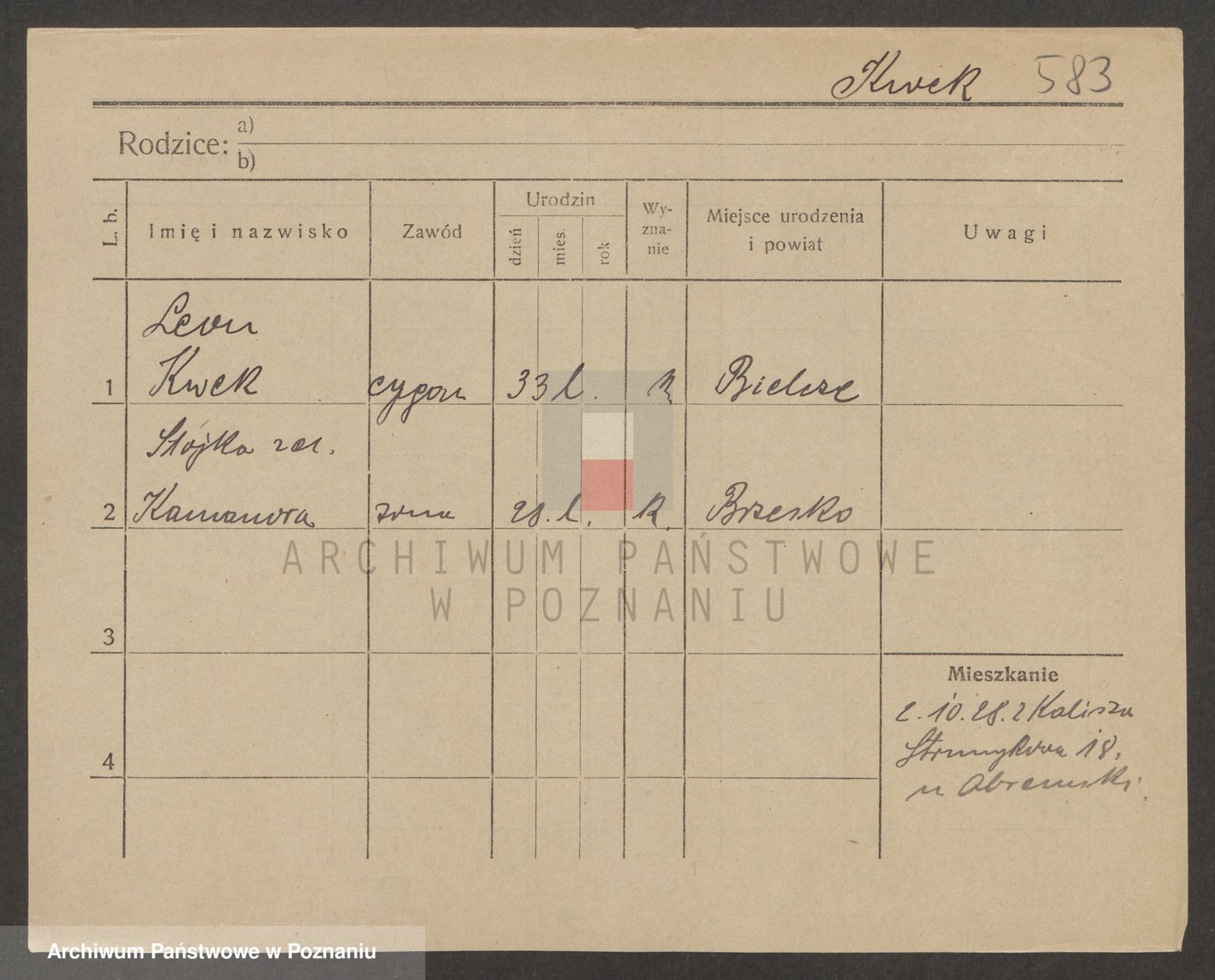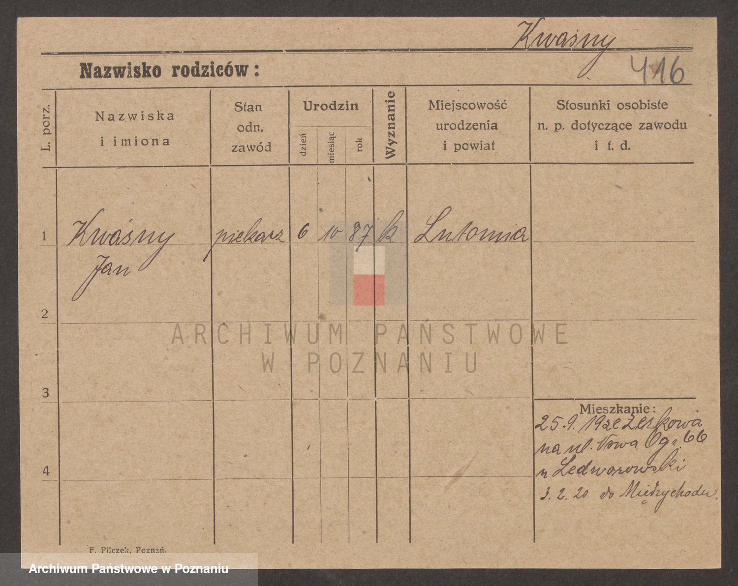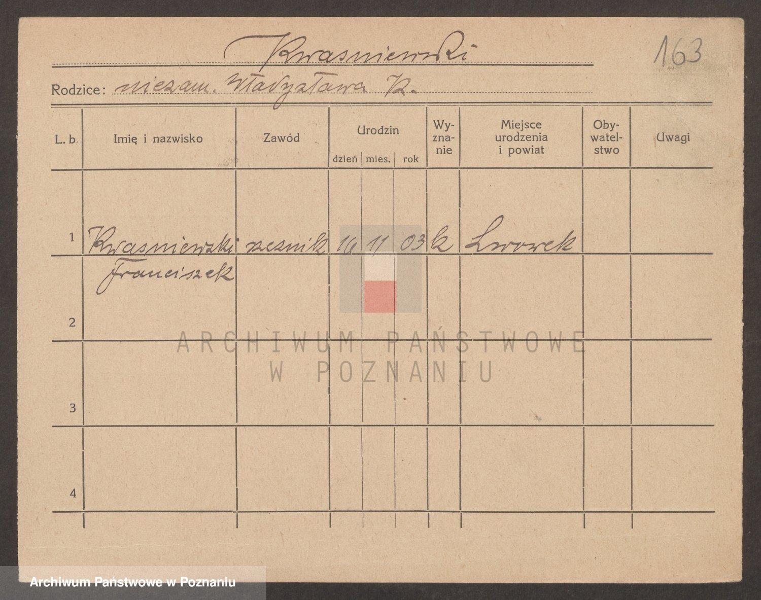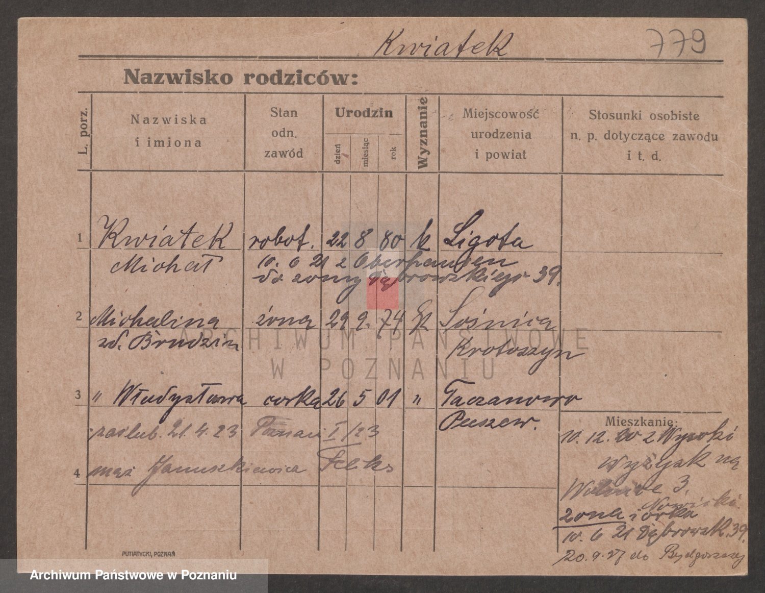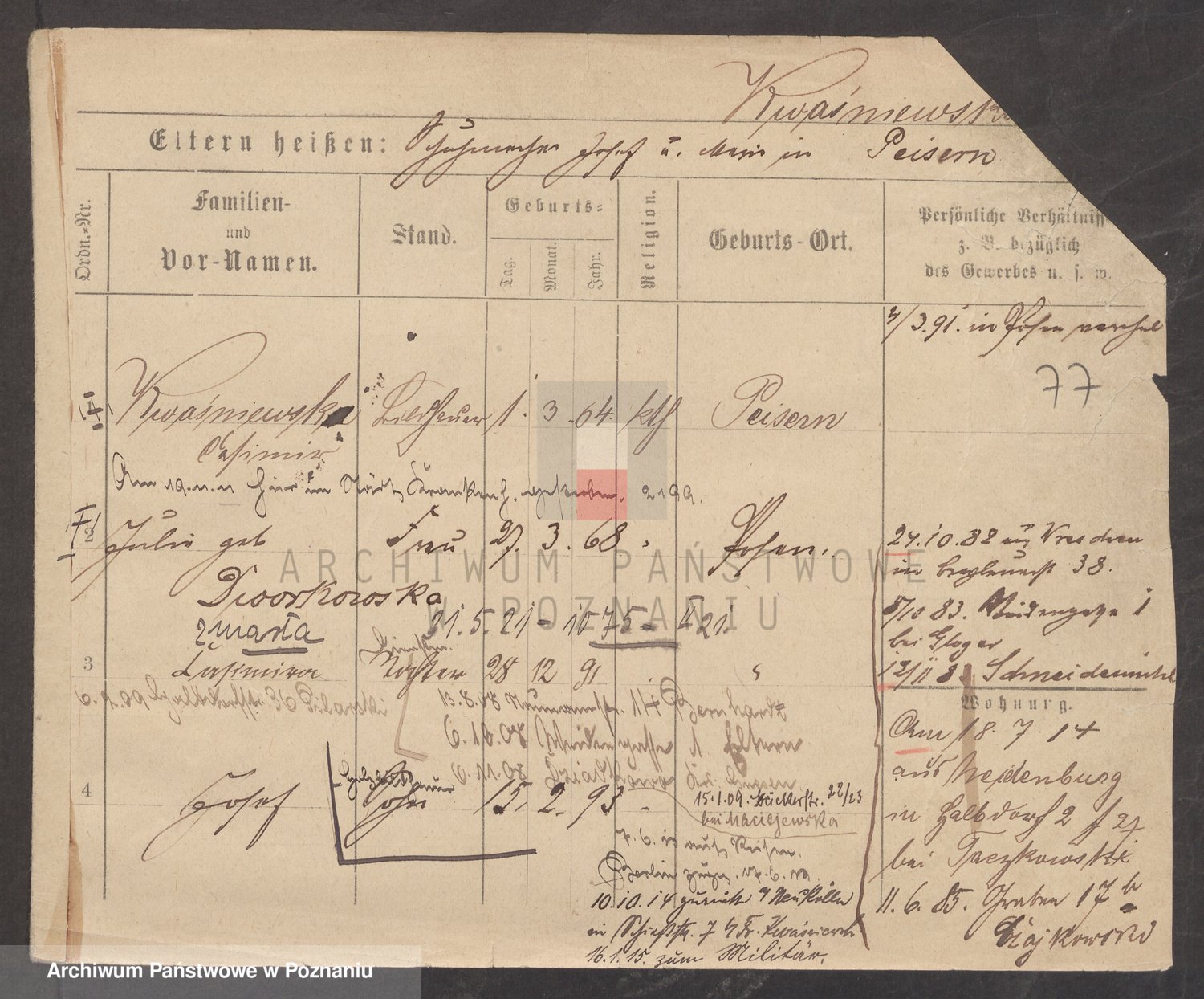 Podgląd karty osobowej dostępny jest po kliknięciu na nazwisko lub ikonkę karty. Można dokonywać powiększenia (ikony na górze) lub przechodzić między kolejnymi skanami (strzałki po bokach).