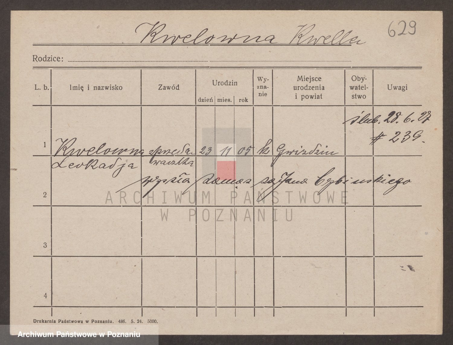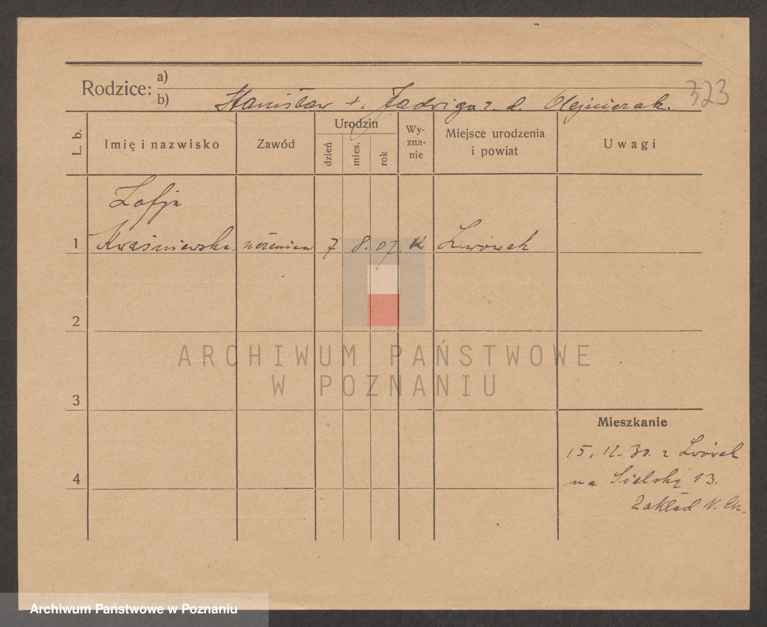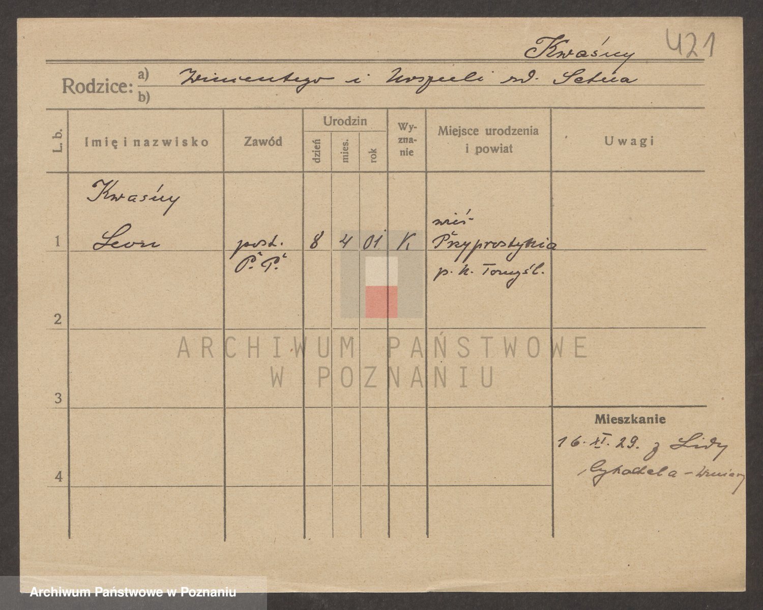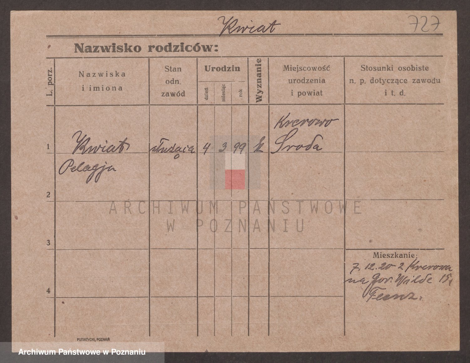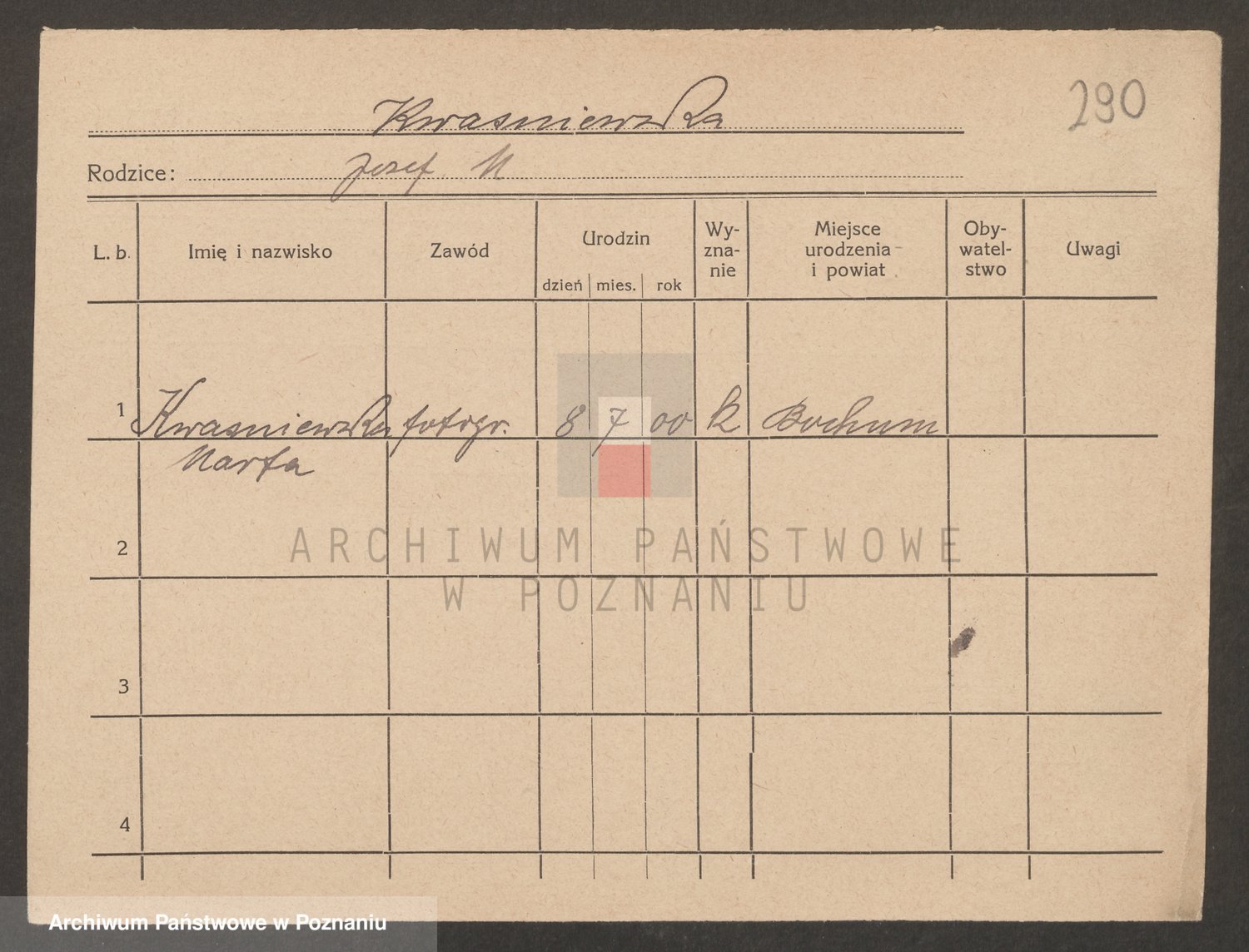 Podgląd karty osobowej dostępny jest po kliknięciu na nazwisko lub ikonkę karty. Można dokonywać powiększenia (ikony na górze) lub przechodzić między kolejnymi skanami (strzałki po bokach).