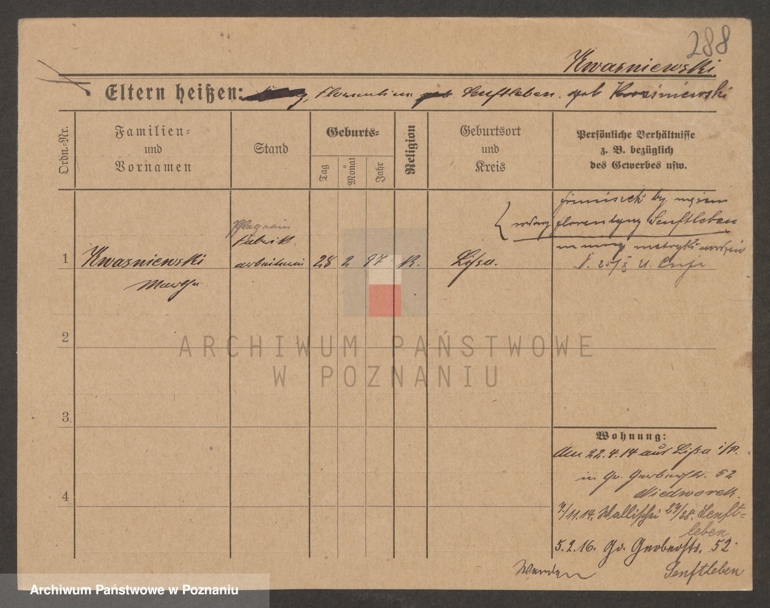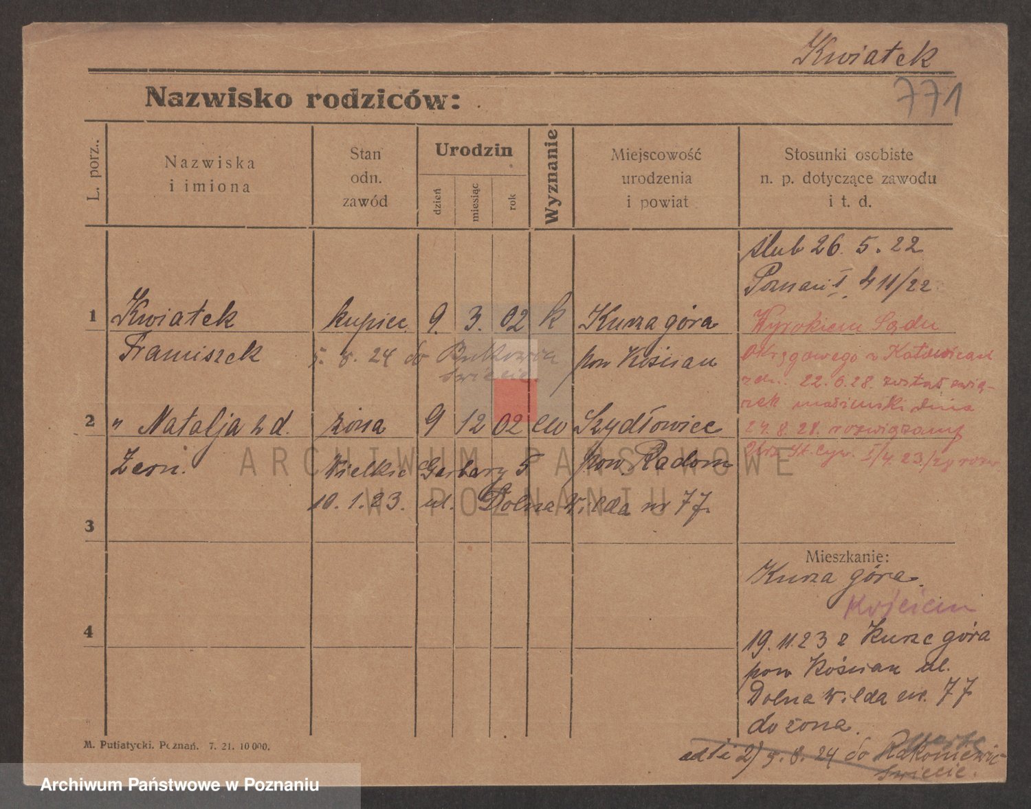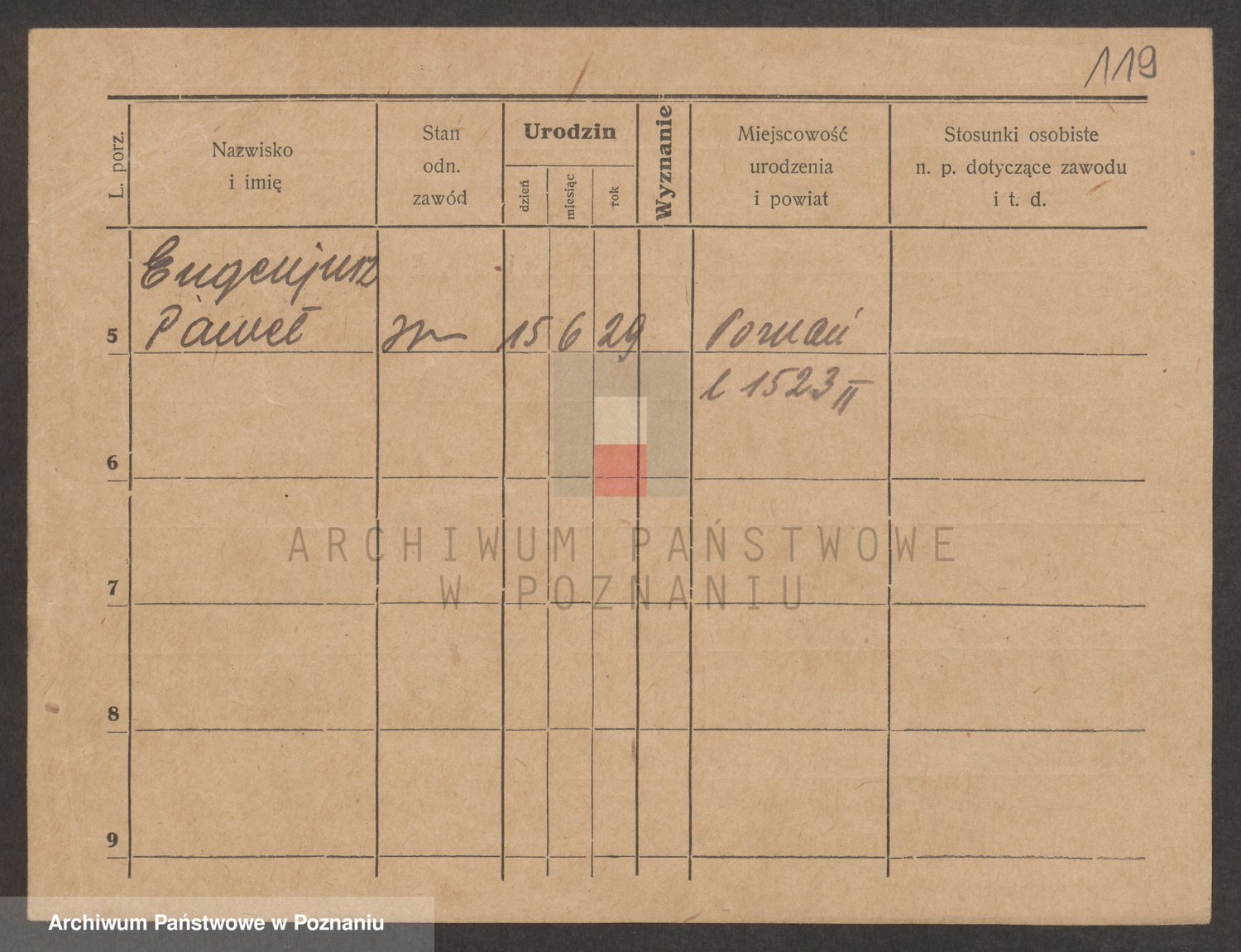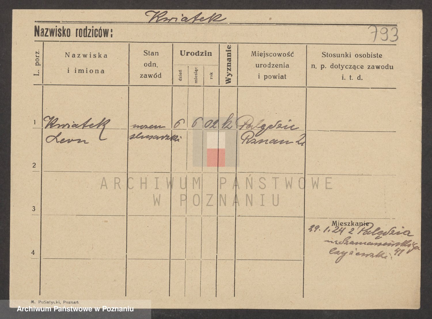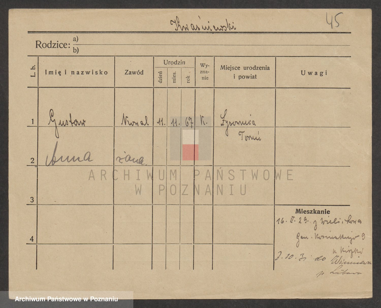 Podgląd karty osobowej dostępny jest po kliknięciu na nazwisko lub ikonkę karty. Można dokonywać powiększenia (ikony na górze) lub przechodzić między kolejnymi skanami (strzałki po bokach).