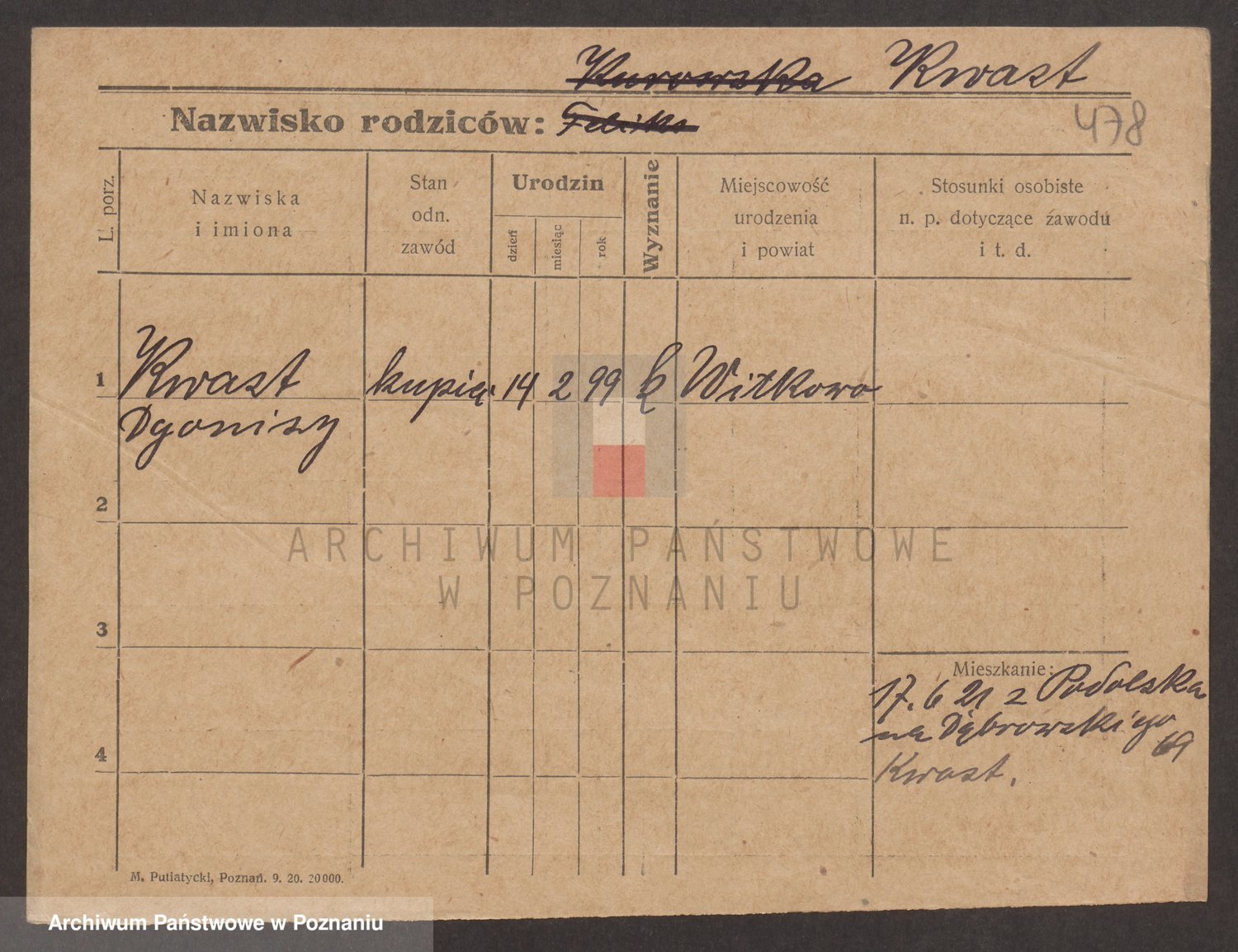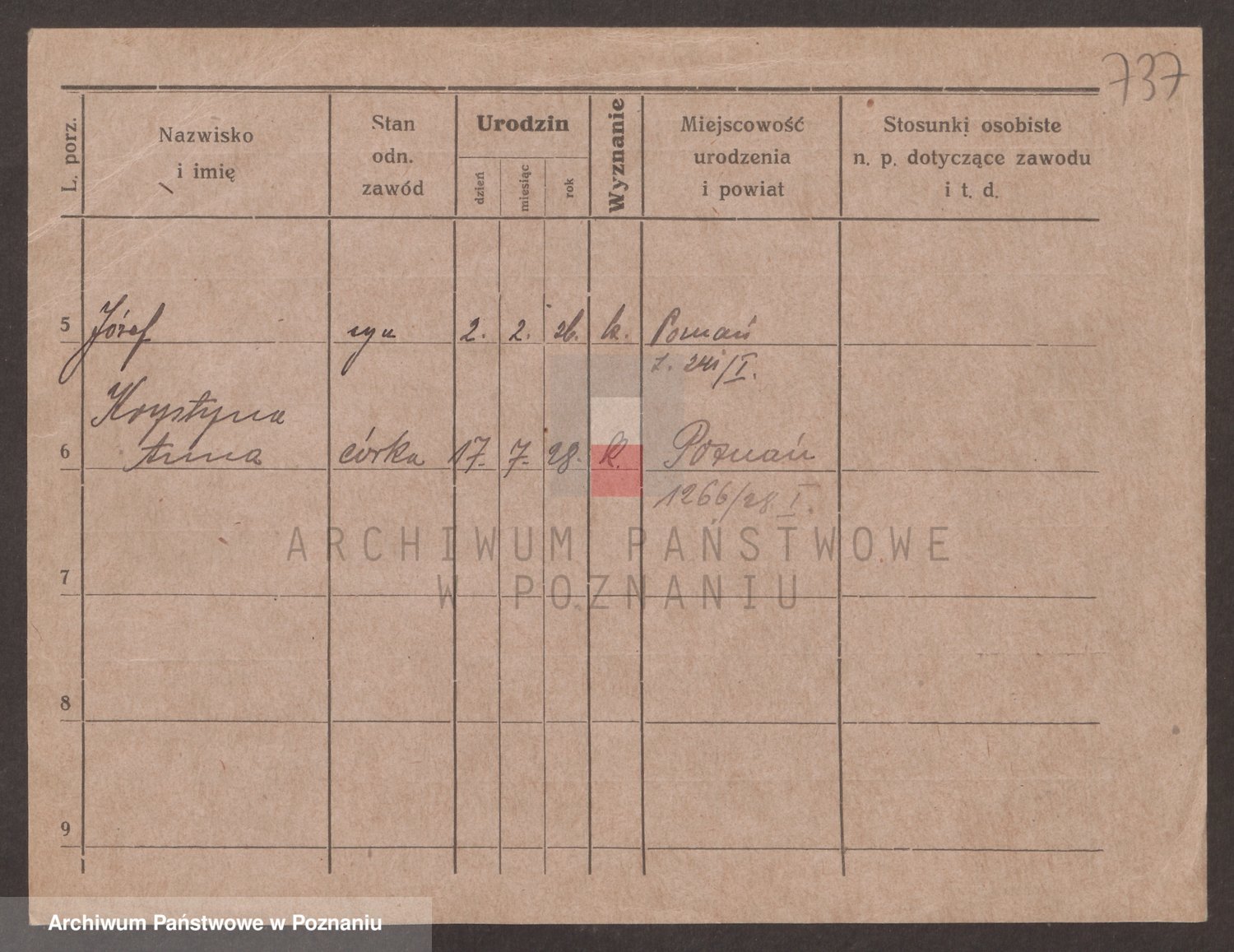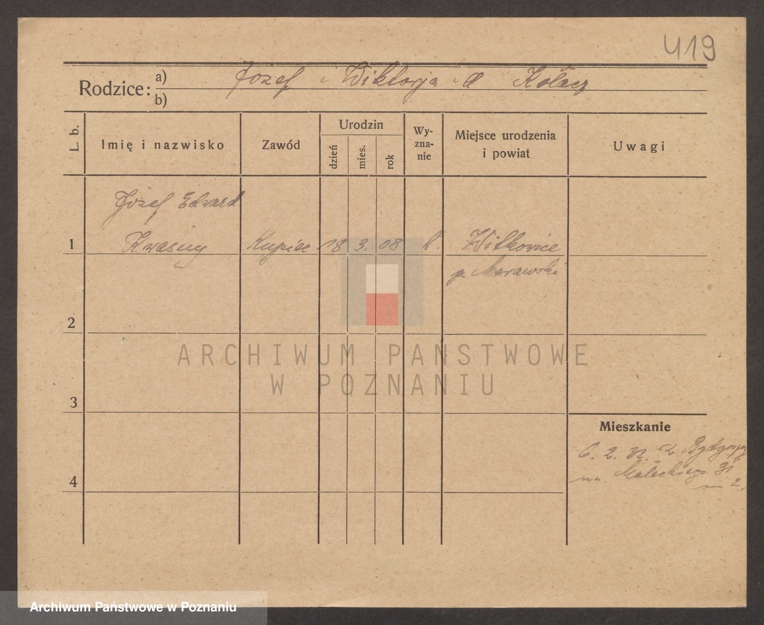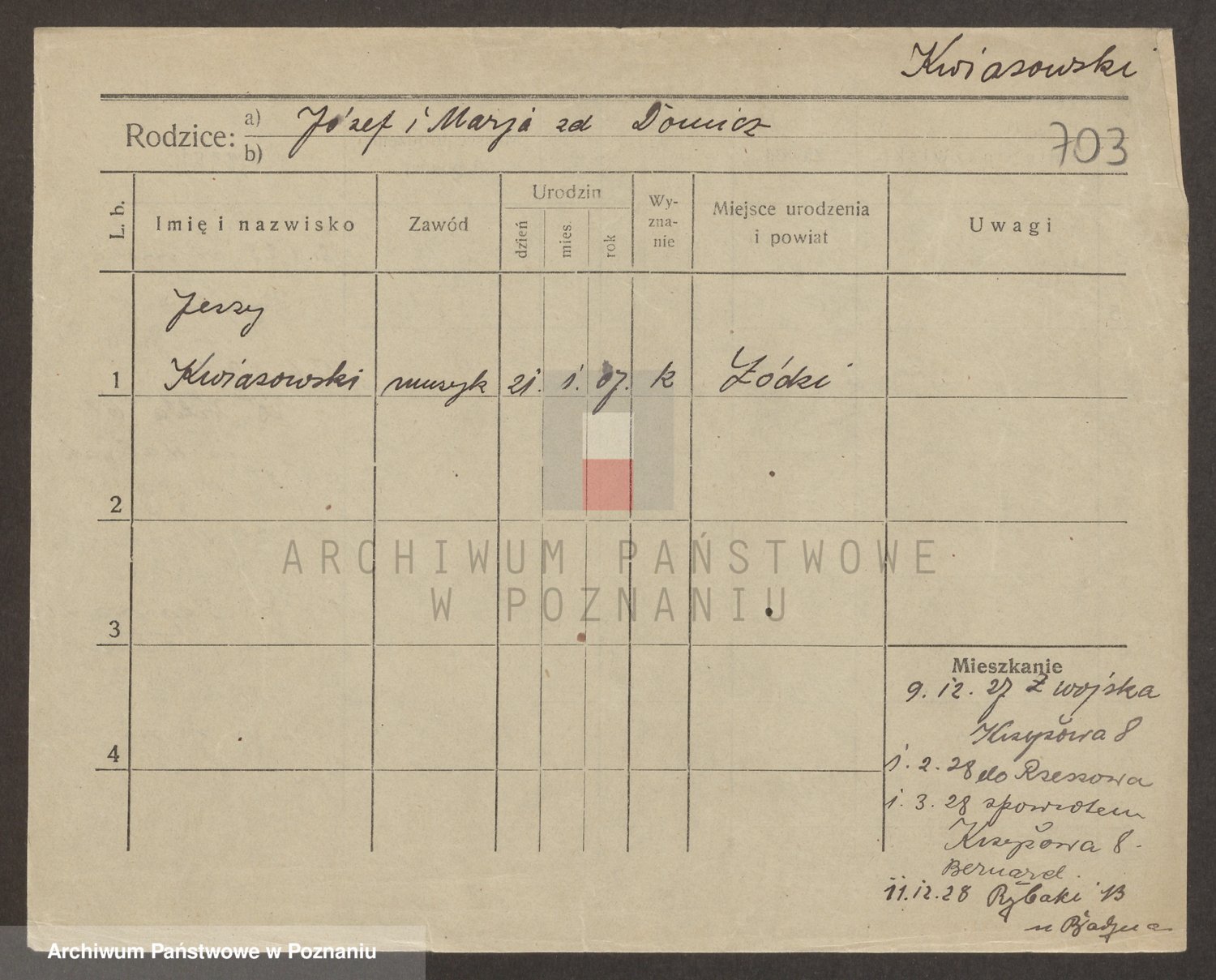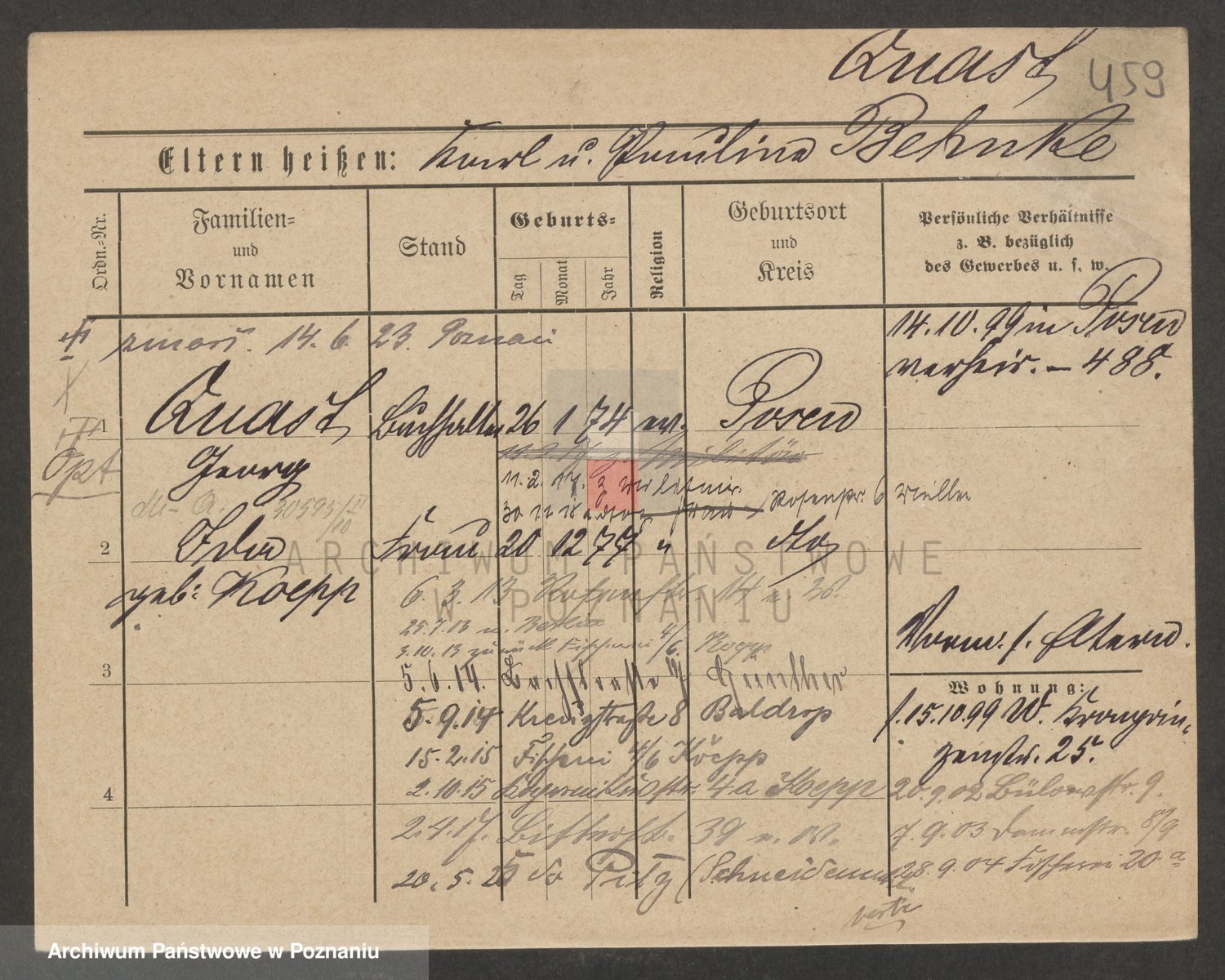 Podgląd karty osobowej dostępny jest po kliknięciu na nazwisko lub ikonkę karty. Można dokonywać powiększenia (ikony na górze) lub przechodzić między kolejnymi skanami (strzałki po bokach).