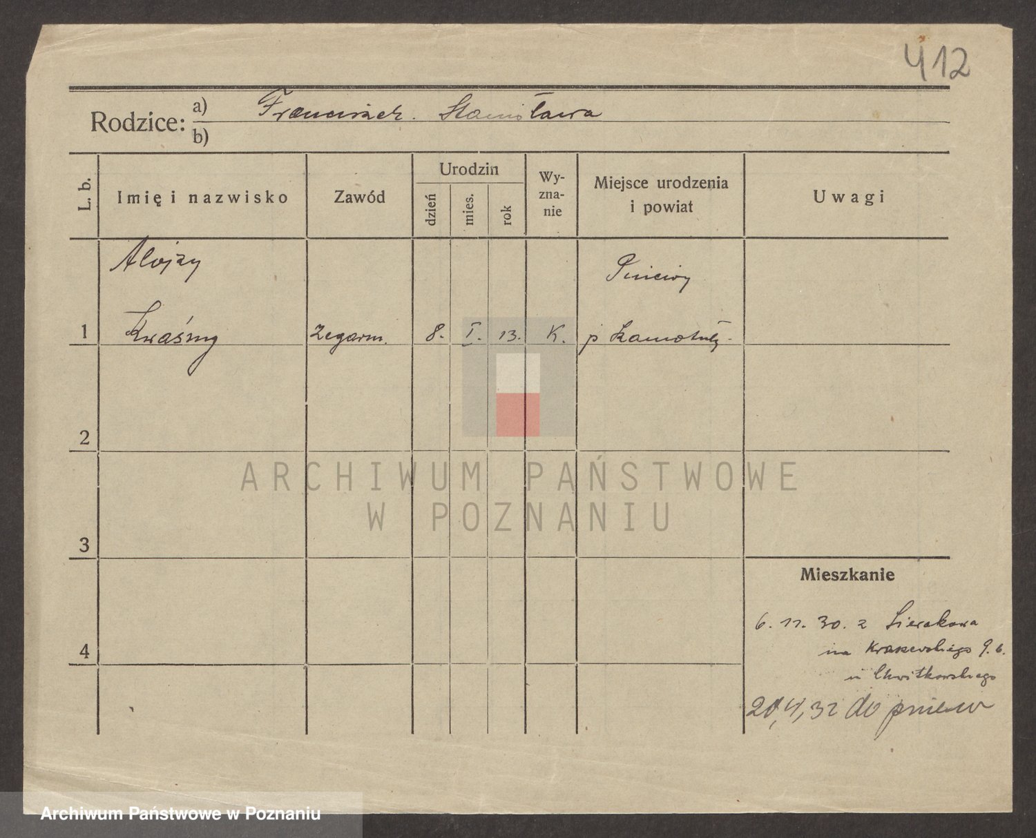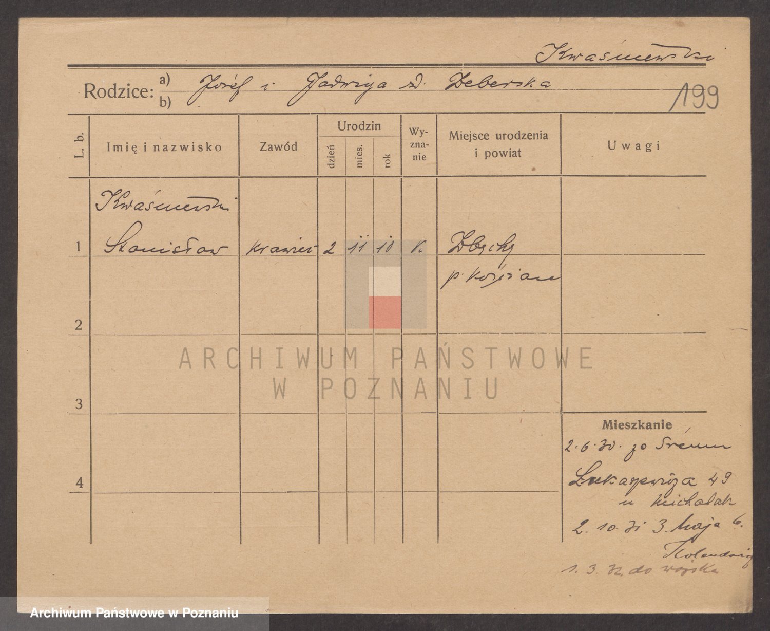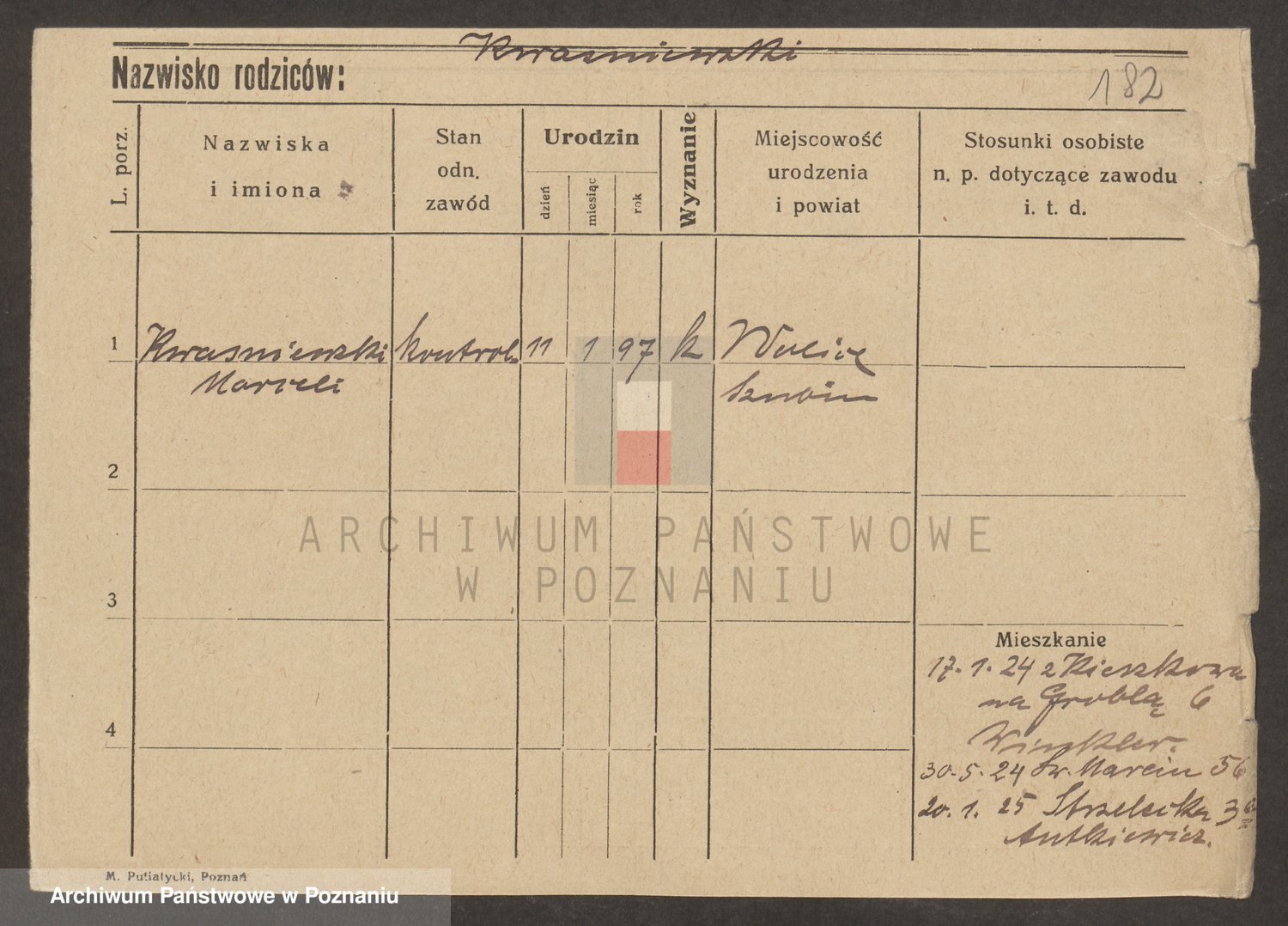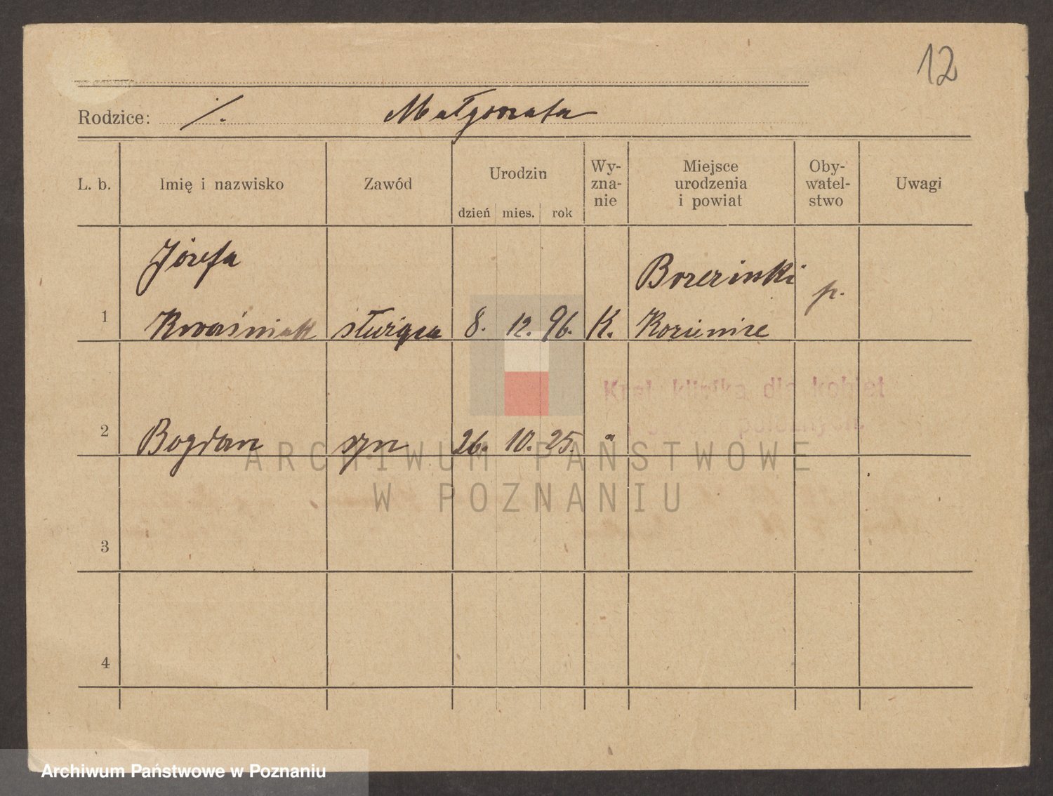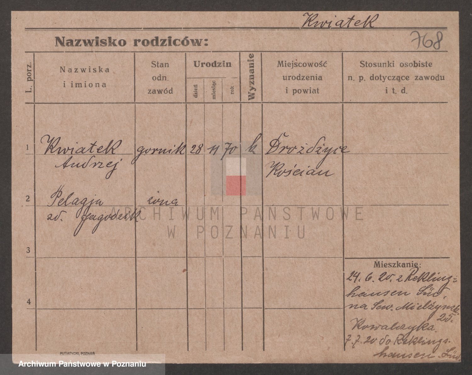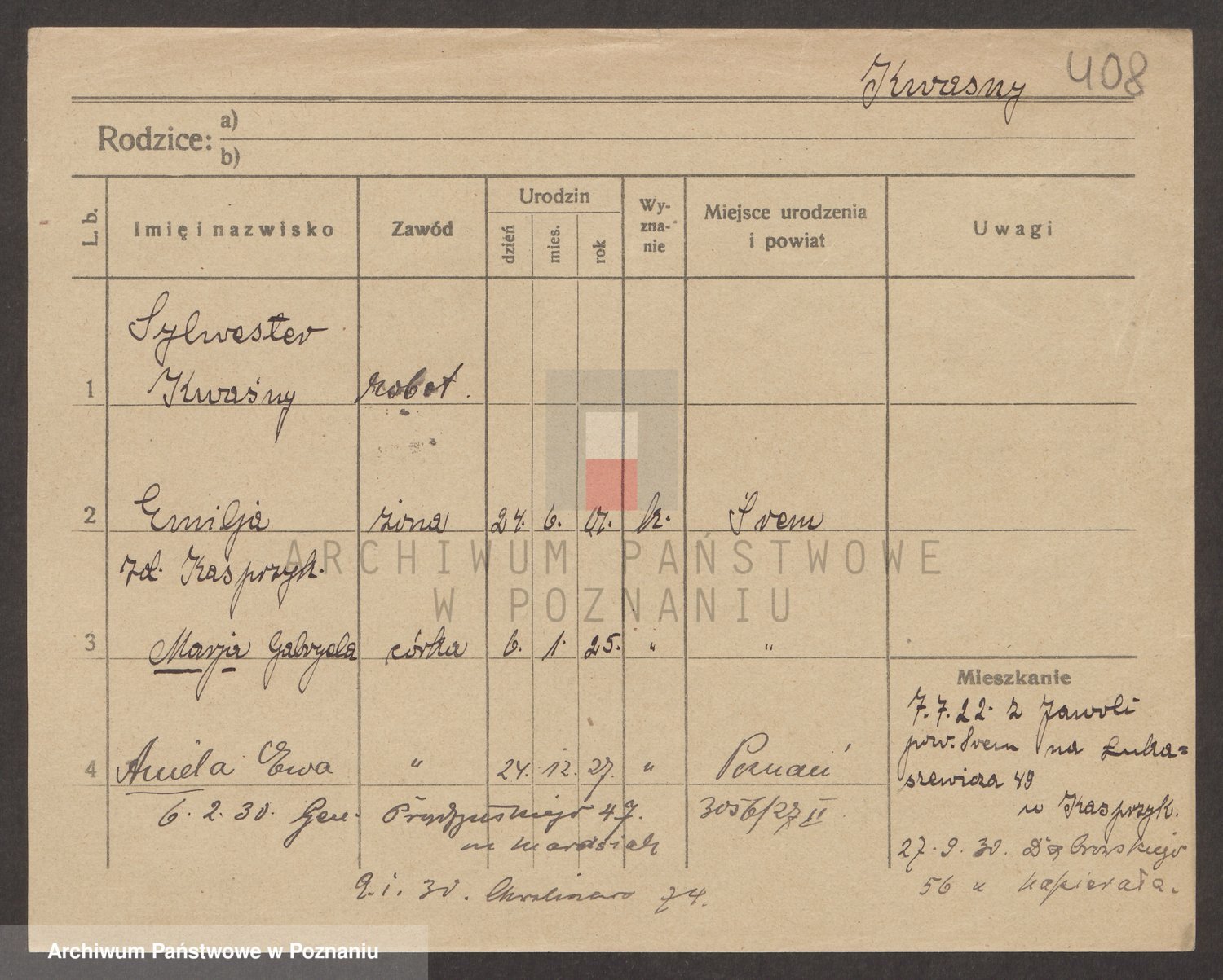 Podgląd karty osobowej dostępny jest po kliknięciu na nazwisko lub ikonkę karty. Można dokonywać powiększenia (ikony na górze) lub przechodzić między kolejnymi skanami (strzałki po bokach).