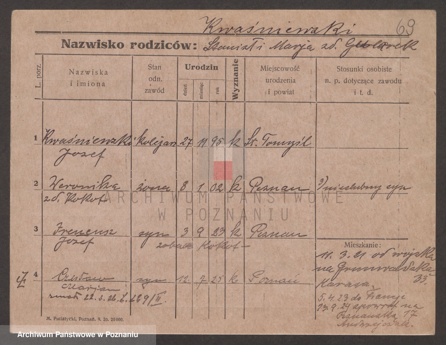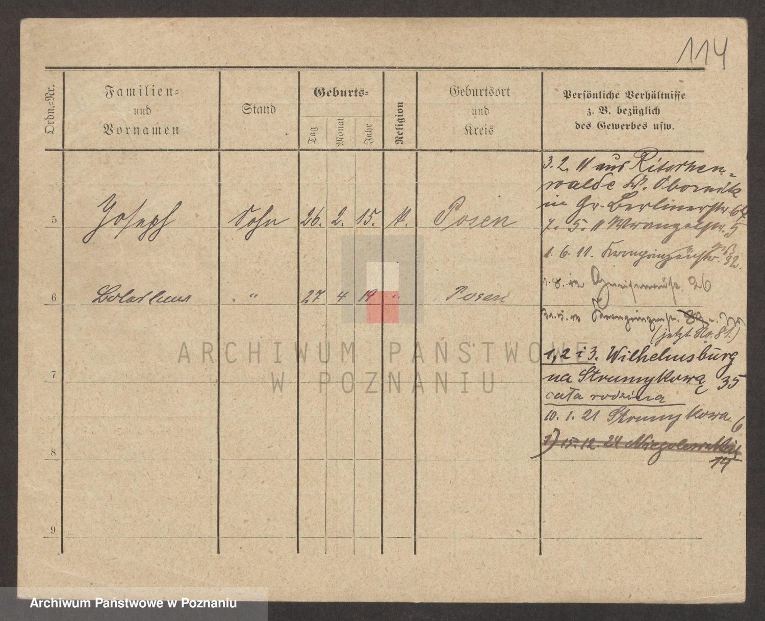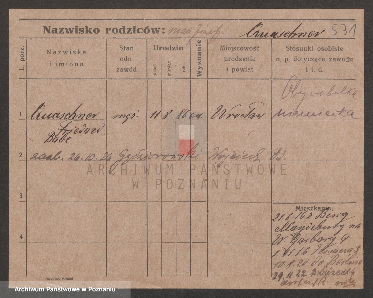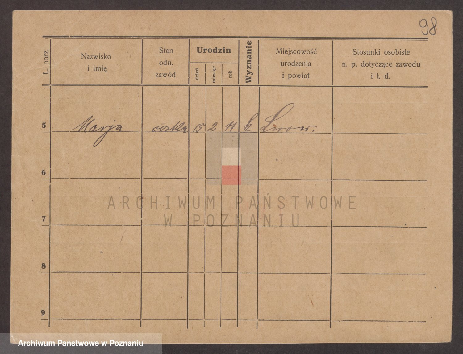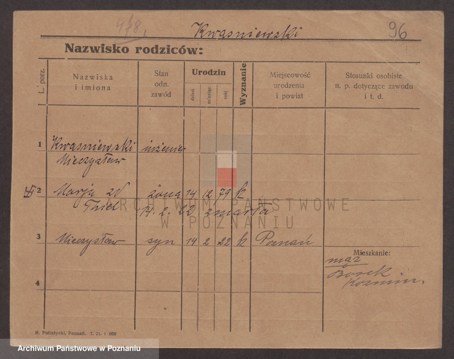 Podgląd karty osobowej dostępny jest po kliknięciu na nazwisko lub ikonkę karty. Można dokonywać powiększenia (ikony na górze) lub przechodzić między kolejnymi skanami (strzałki po bokach).