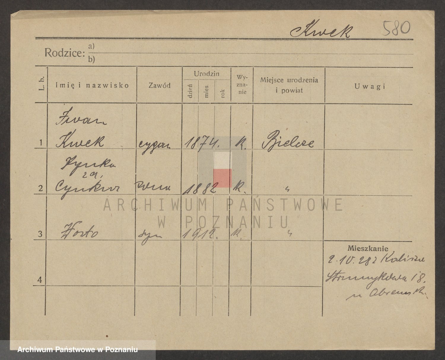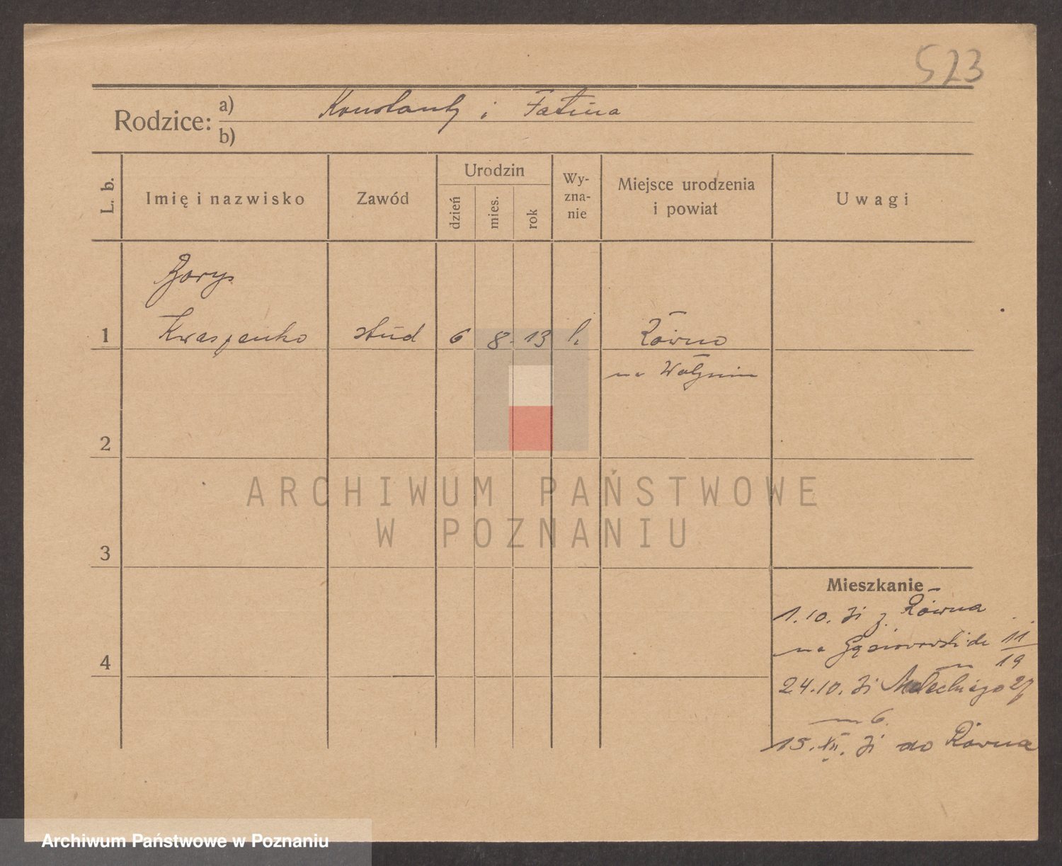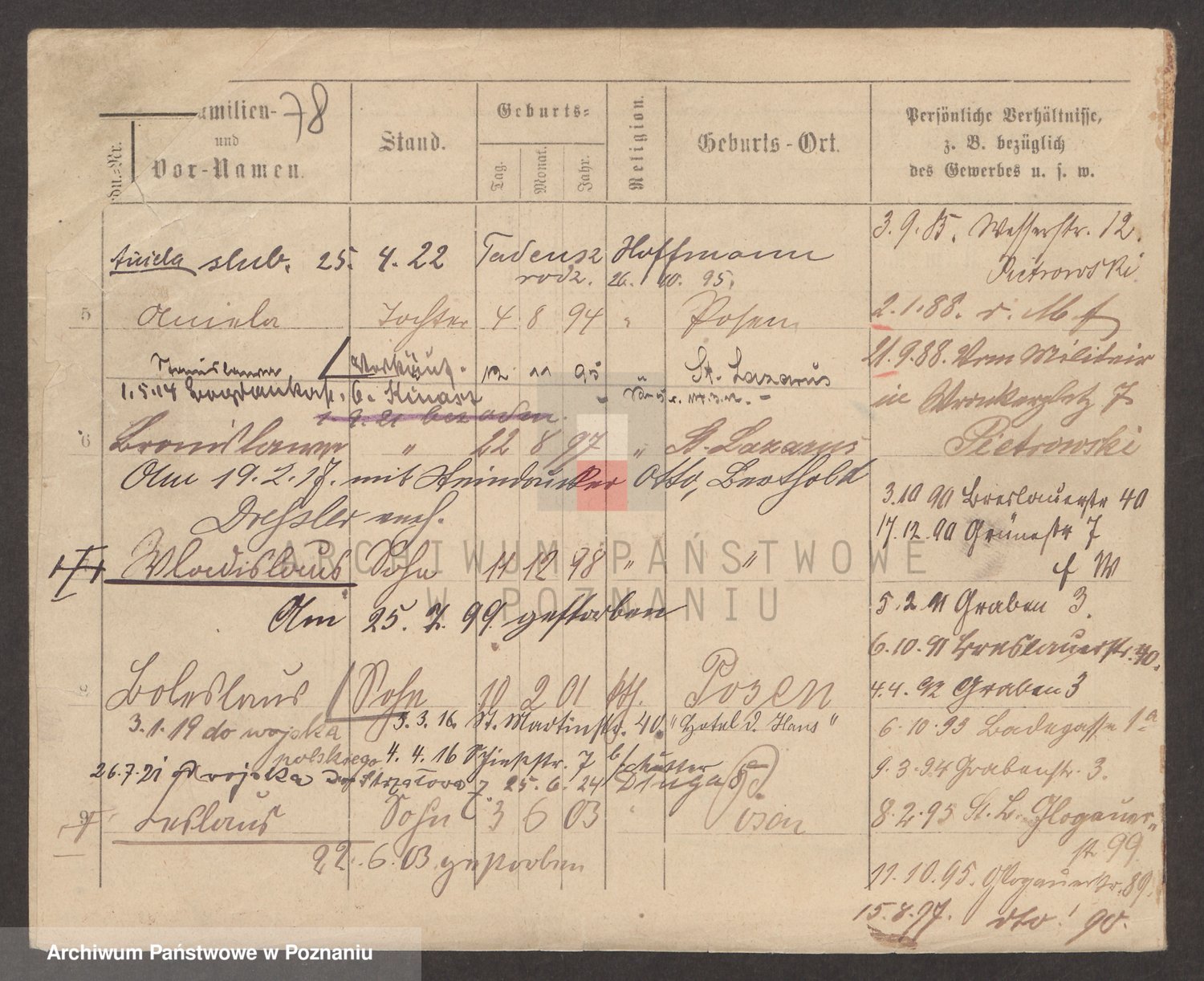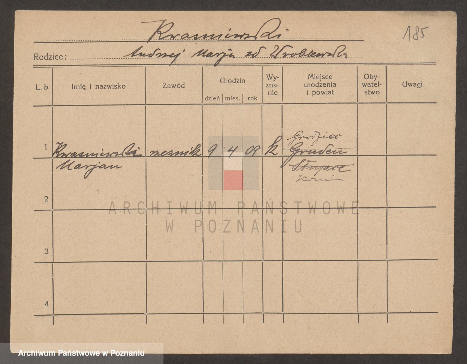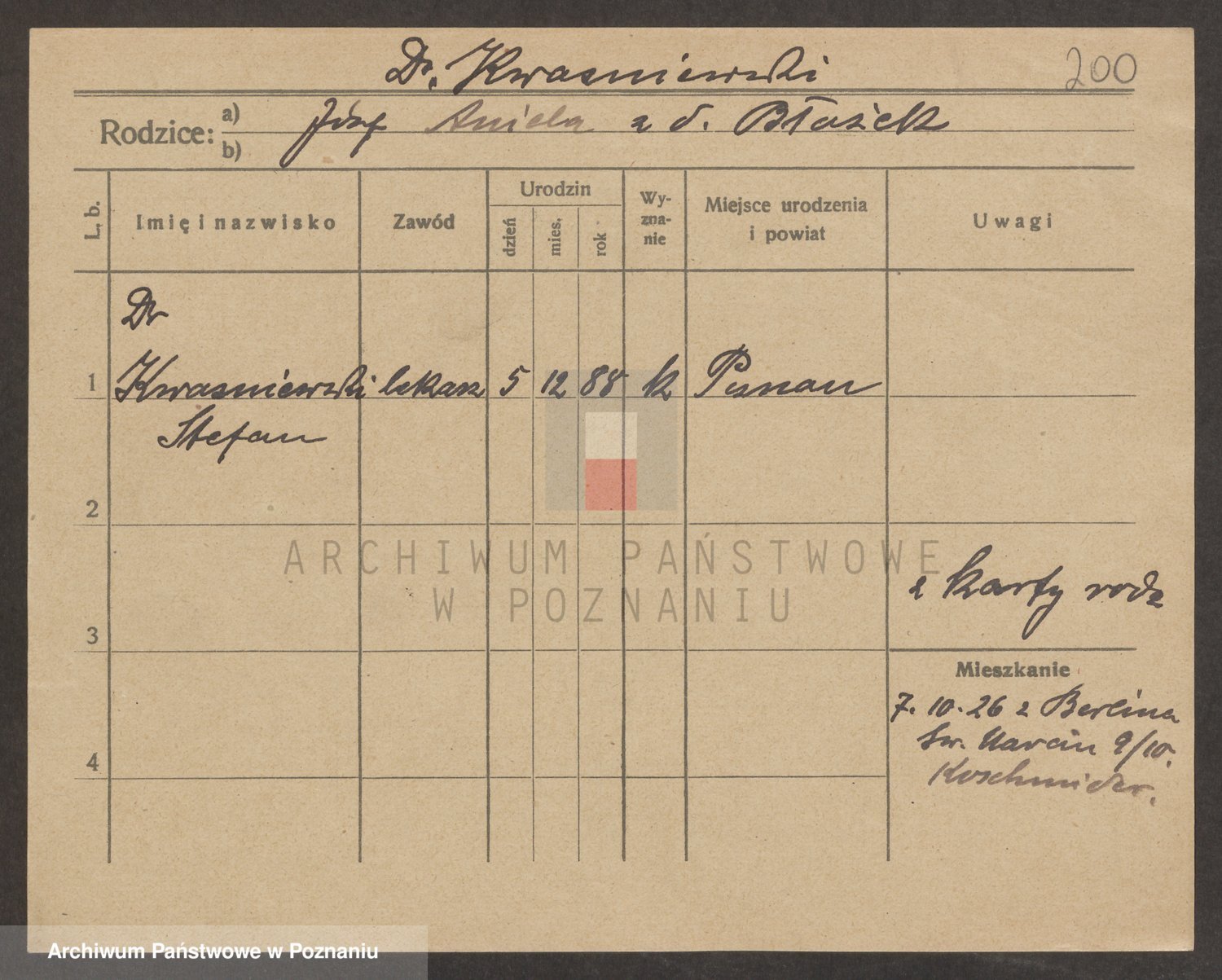 Podgląd karty osobowej dostępny jest po kliknięciu na nazwisko lub ikonkę karty. Można dokonywać powiększenia (ikony na górze) lub przechodzić między kolejnymi skanami (strzałki po bokach).